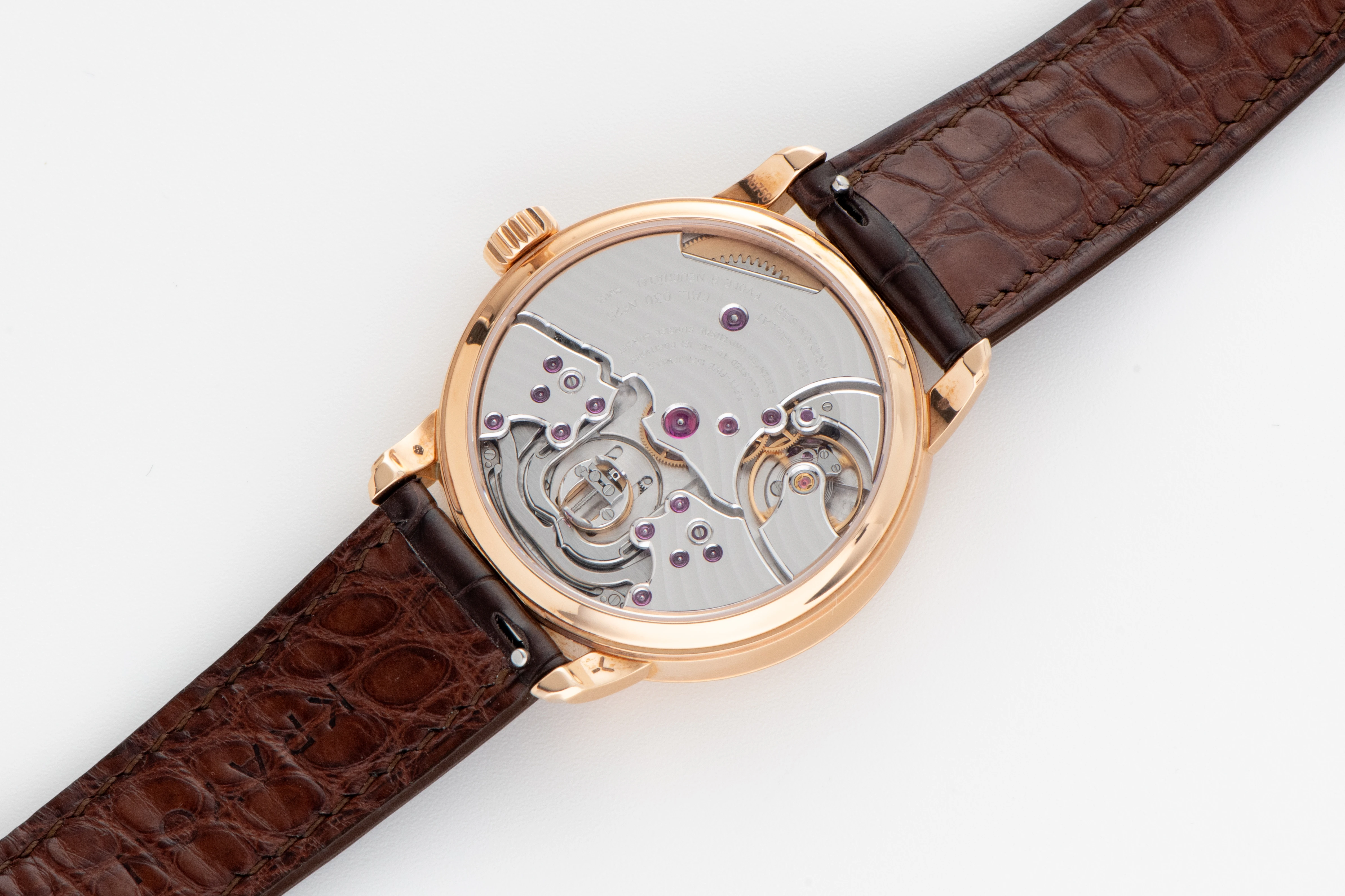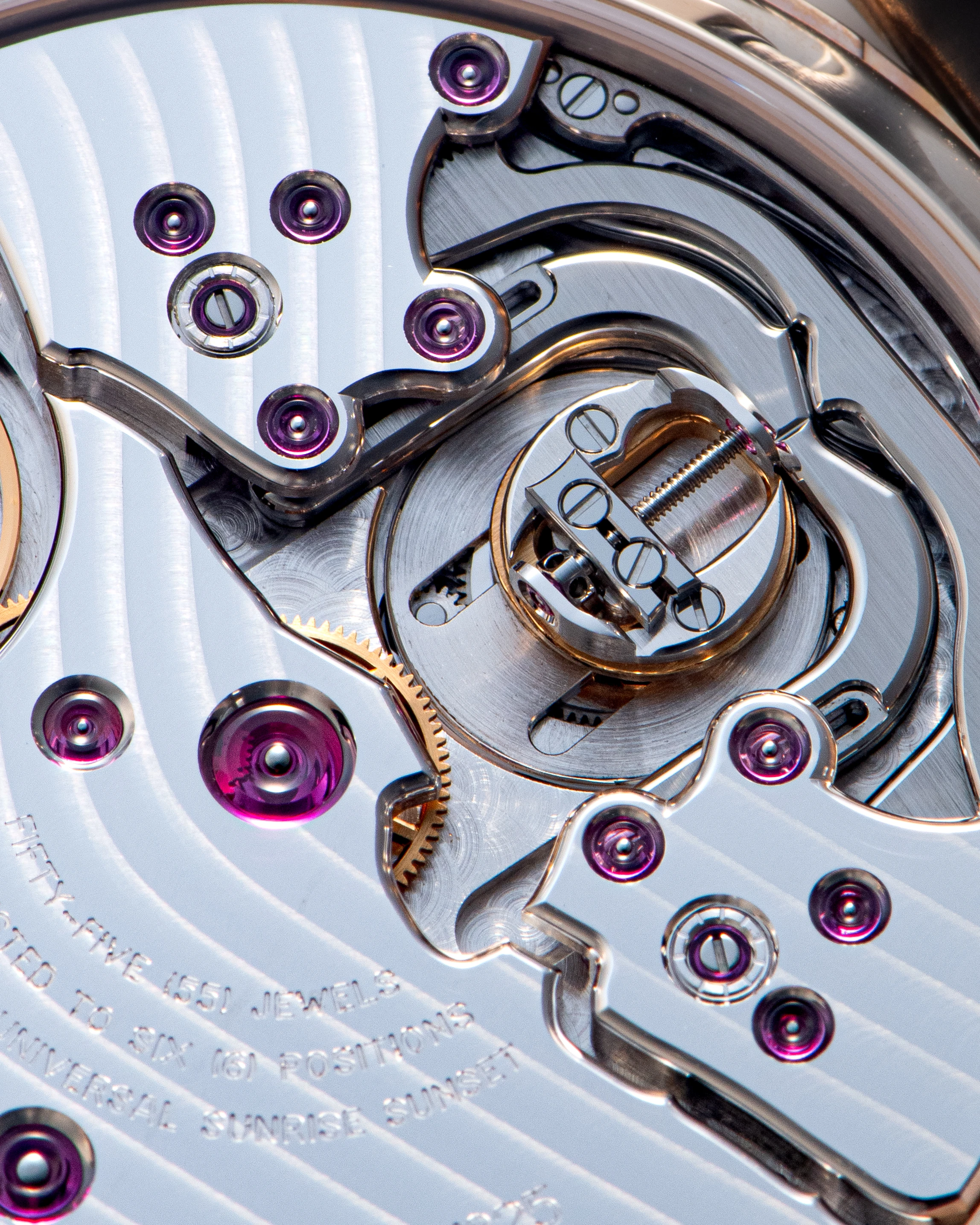 The hand-wound calibre C030, developed specifically for the Anywhere watch, offers a comfortable 72-hour power reserve. It combines a traditional hand-wound movement with classic finishing techniques and features an innovative, complex module that drives the rotating half-rings of the day/night indicator. The indicator mechanism is positioned at the bottom of the movement and displays a rigorous, symmetrical design reminiscent of the finest examples of watchmaking. The movement’s avant-garde character is further emphasised by an unusual array of finishing techniques, some created especially for this watch. For example, the classic Côtes de Genève is executed along a curved path, mirroring a graph of sunrise times in Neuchâtel throughout the year, while the polished chamfer with internal and external corners on the lower edge of the main gear bridge and barrel reproduces a section of the Lake Neuchâtel shoreline. The movement also includes many traditional details, such as the black-polished long straight winding click, the Geneva-style stud cap on the balance cock, and the black-polished cap for the escape wheel jewel, making inspection of the Anywhere movement a true pleasure.