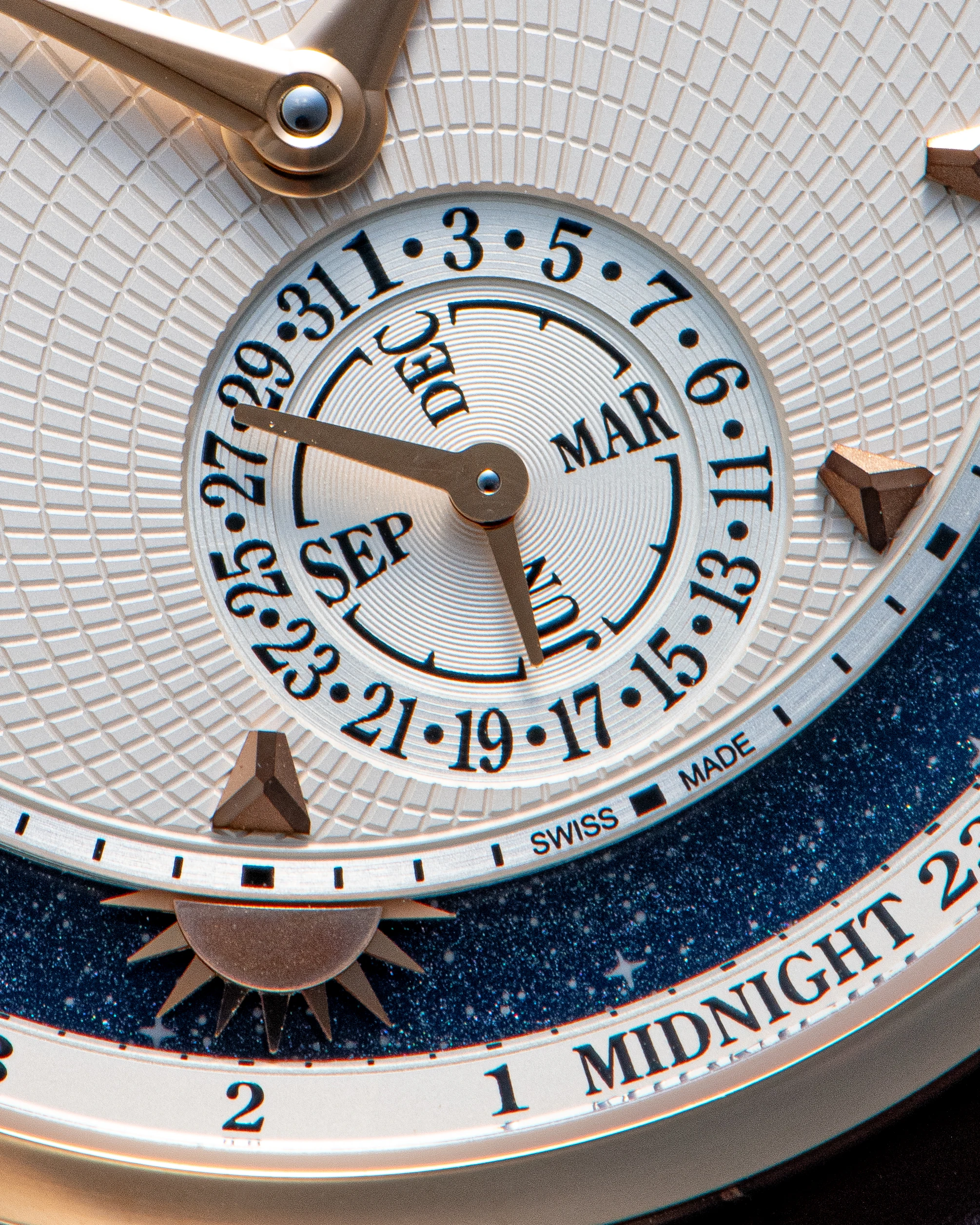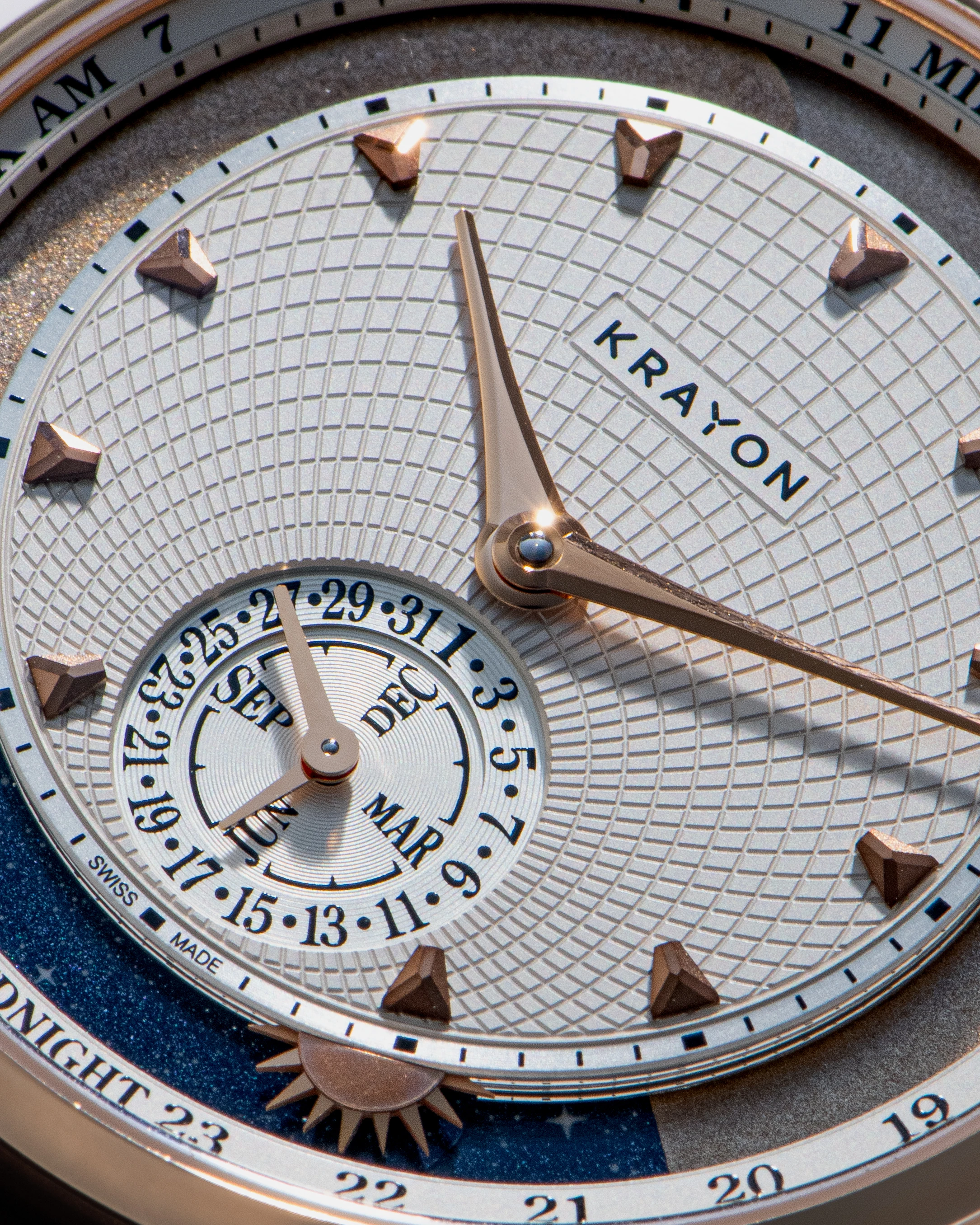 The Anywhere’s classic 39mm case, just 9mm thick despite its complex movement, appears elegant. Given the movement’s complexity, one might expect an intricate, ornate dial, but it is deliberately understated, featuring two sculpted, teardrop-shaped, tapering hour and minute hands, both entirely mirror-polished, a small date and month counter, and a peripheral sunrise/sunset ring. Even the sun figurine, with its mirror-polished triangular rays, maintains a minimalist appearance. The central part of the dial is adorned with a relief motif and applied 3D indexes with a special cut, creating facets that form the brand logo.