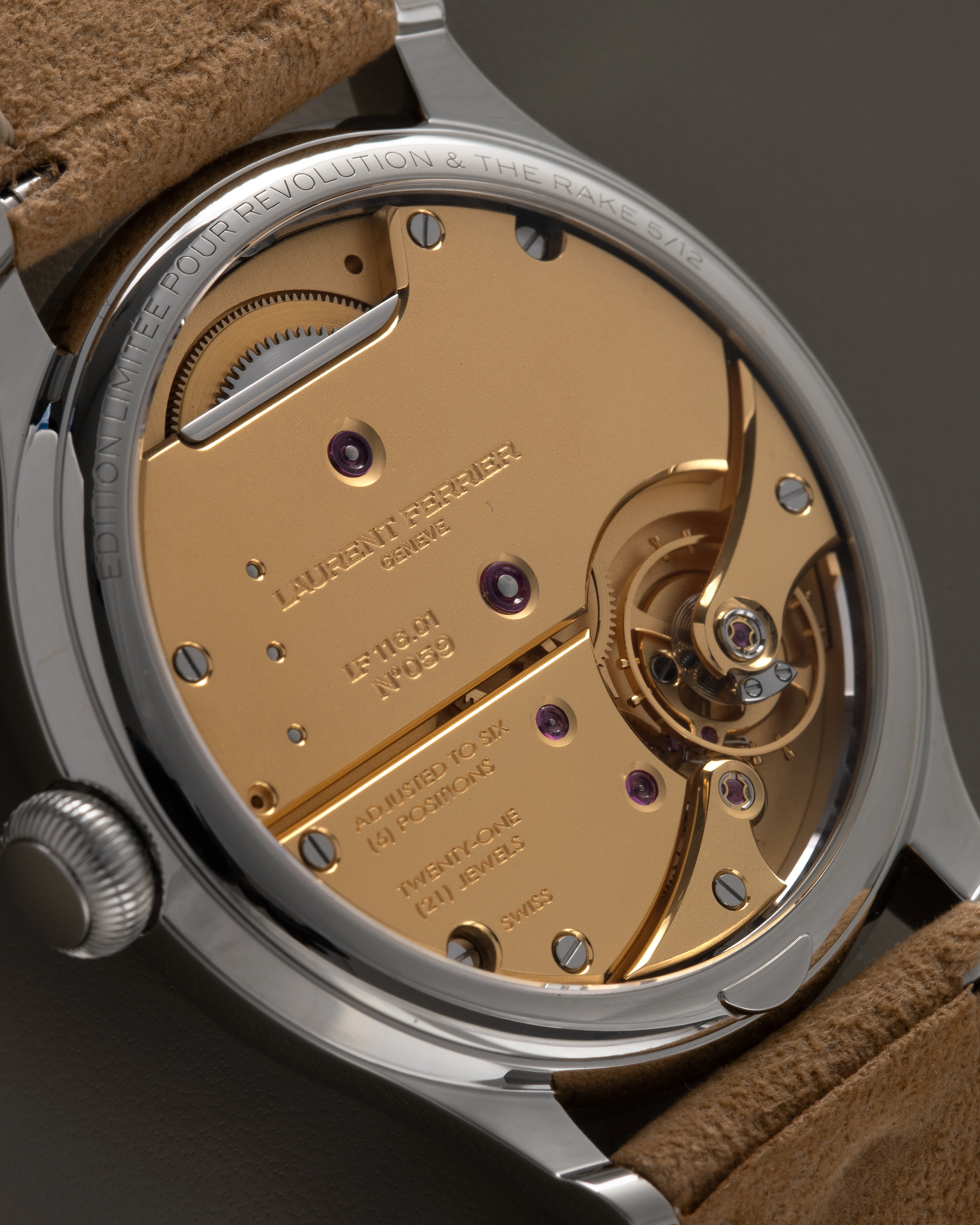 The caliber LF116.01 is finished according to the expectations of the haute horlogerie connoisseur and therefore makes a very pleasant impression. For this Classic Origin Edition Limitée pour Revolution & The Rake, the brand opted for an unusual finishing variant with a gold-plated mainplate and bridges textured by sandblasting, as already used for the special edition Montre École, instead of the black rhodium plating customary for watches in the Laurent Ferrier collection. Other finishes include hand-polished bevels with sharp inner and outer corners, engraved inscriptions, polished screw heads and the jewels set in beautiful, broadly beveled recesses.