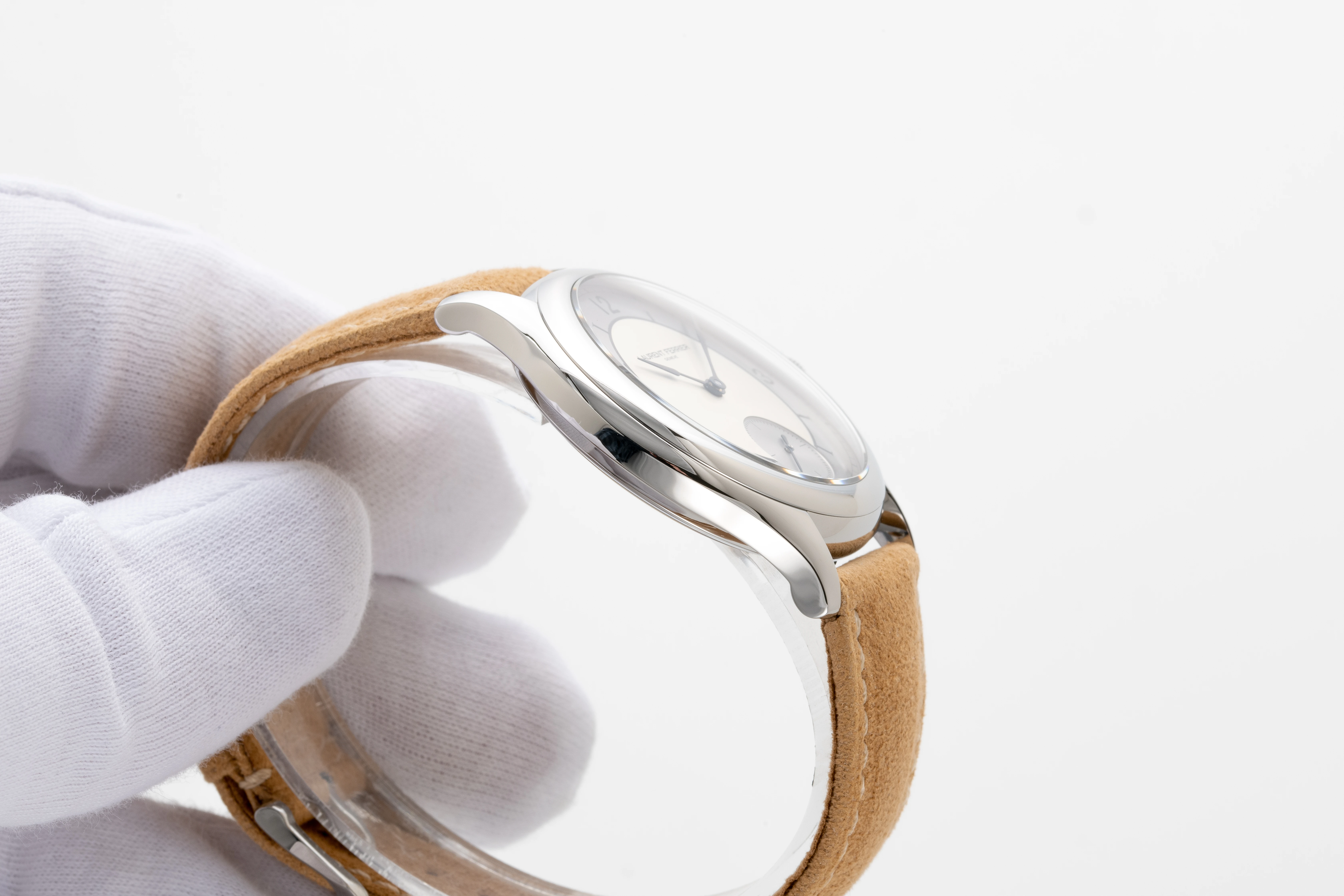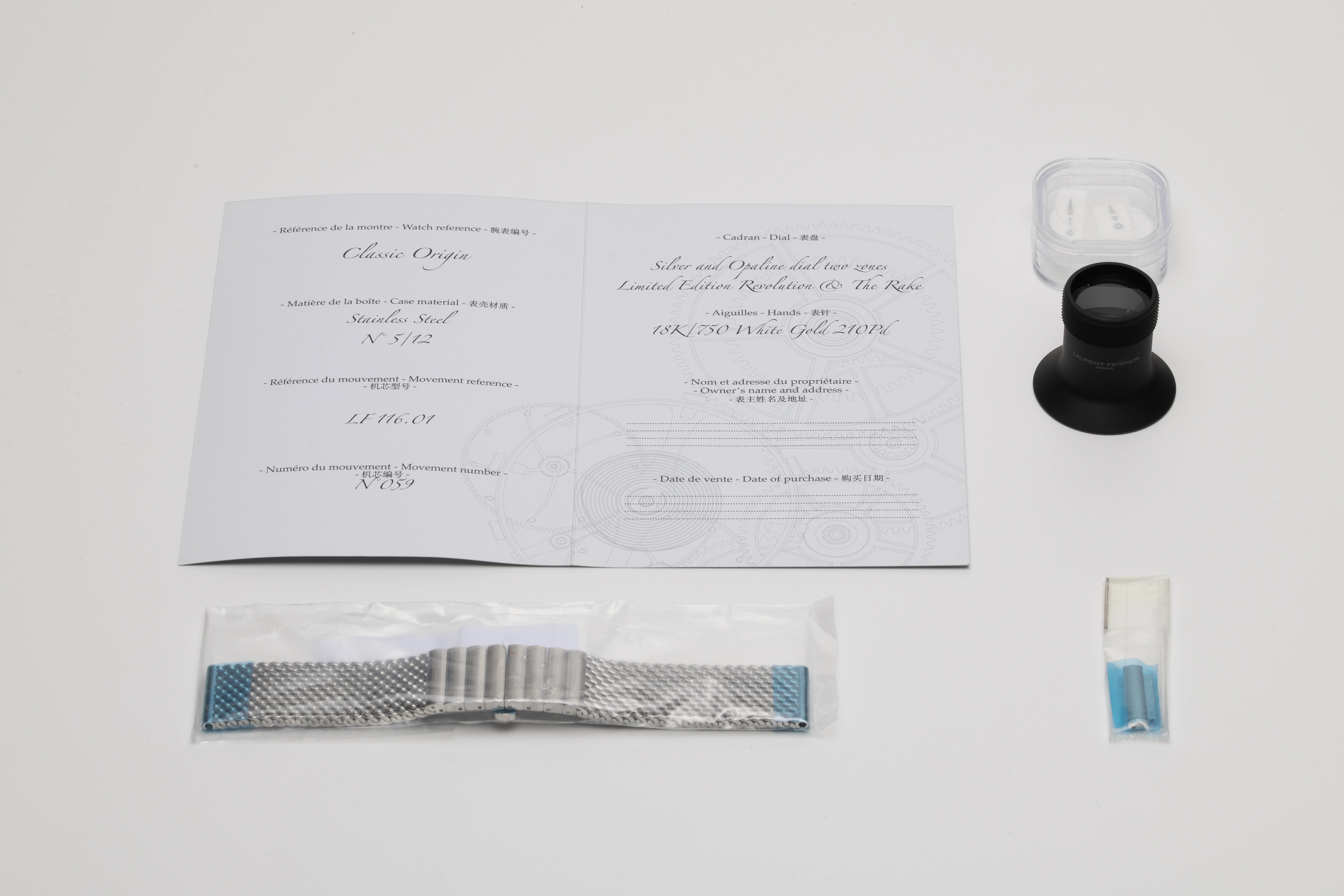 The watch originally came with a beige Alcantara strap with Laurent Ferrier pin buckle and a Milanese stainless steel bracelet made in Japan, with straight end links. These options are included with this watch.