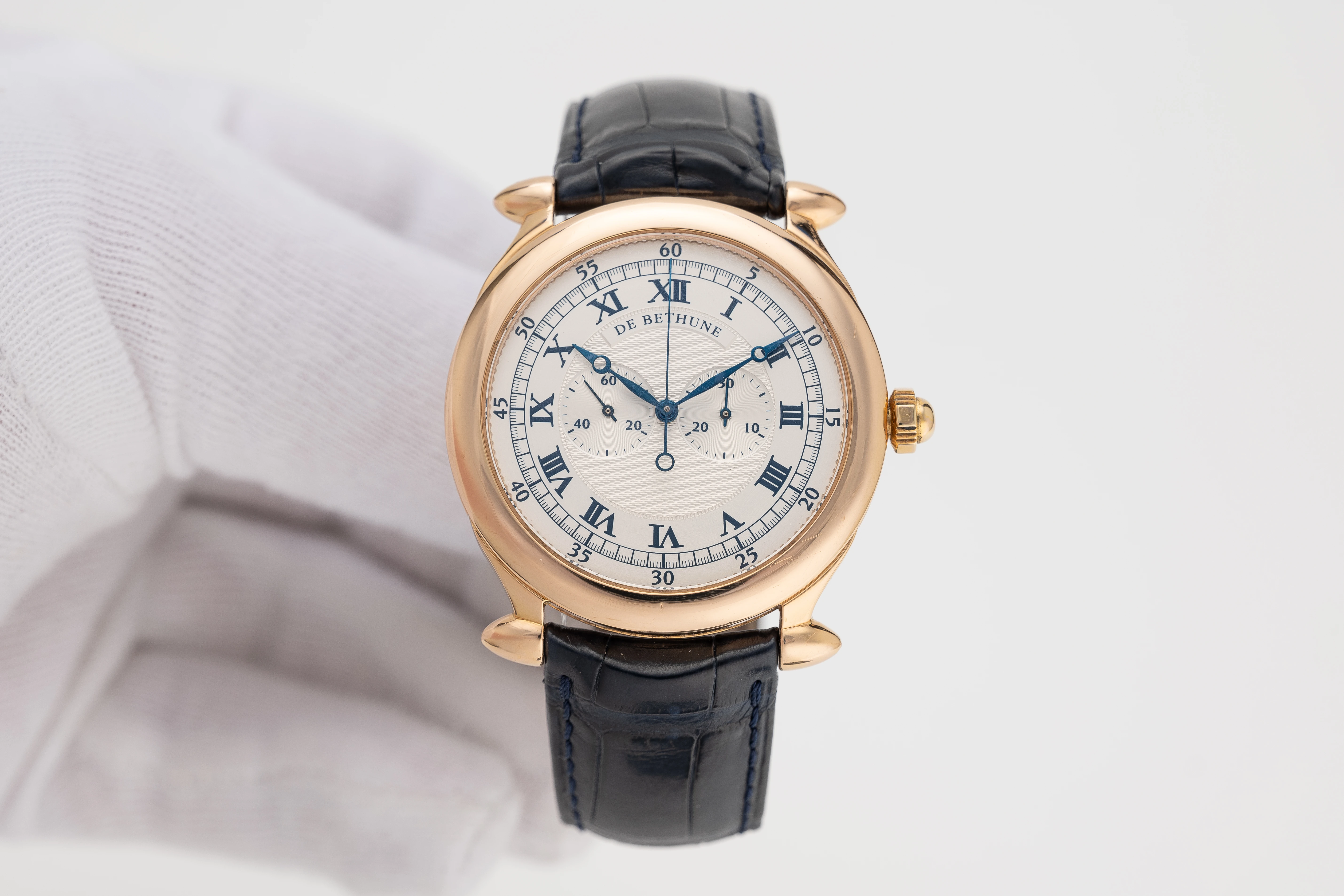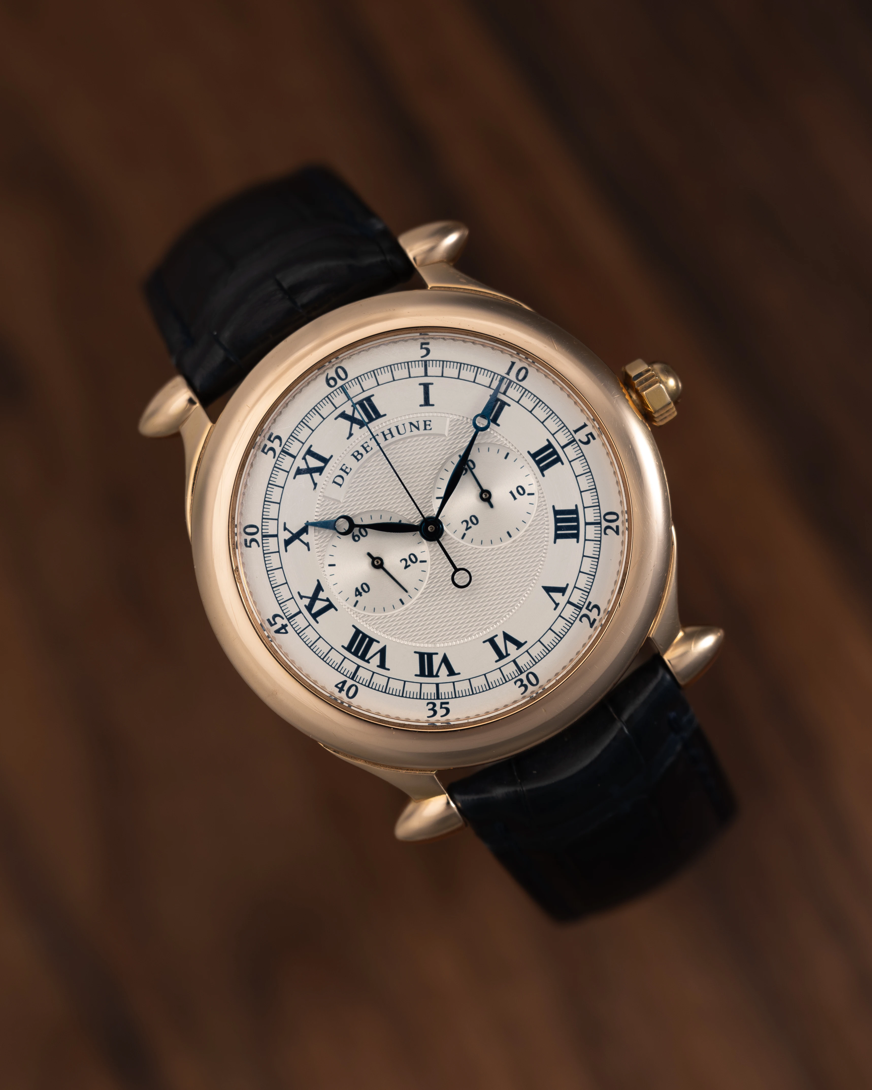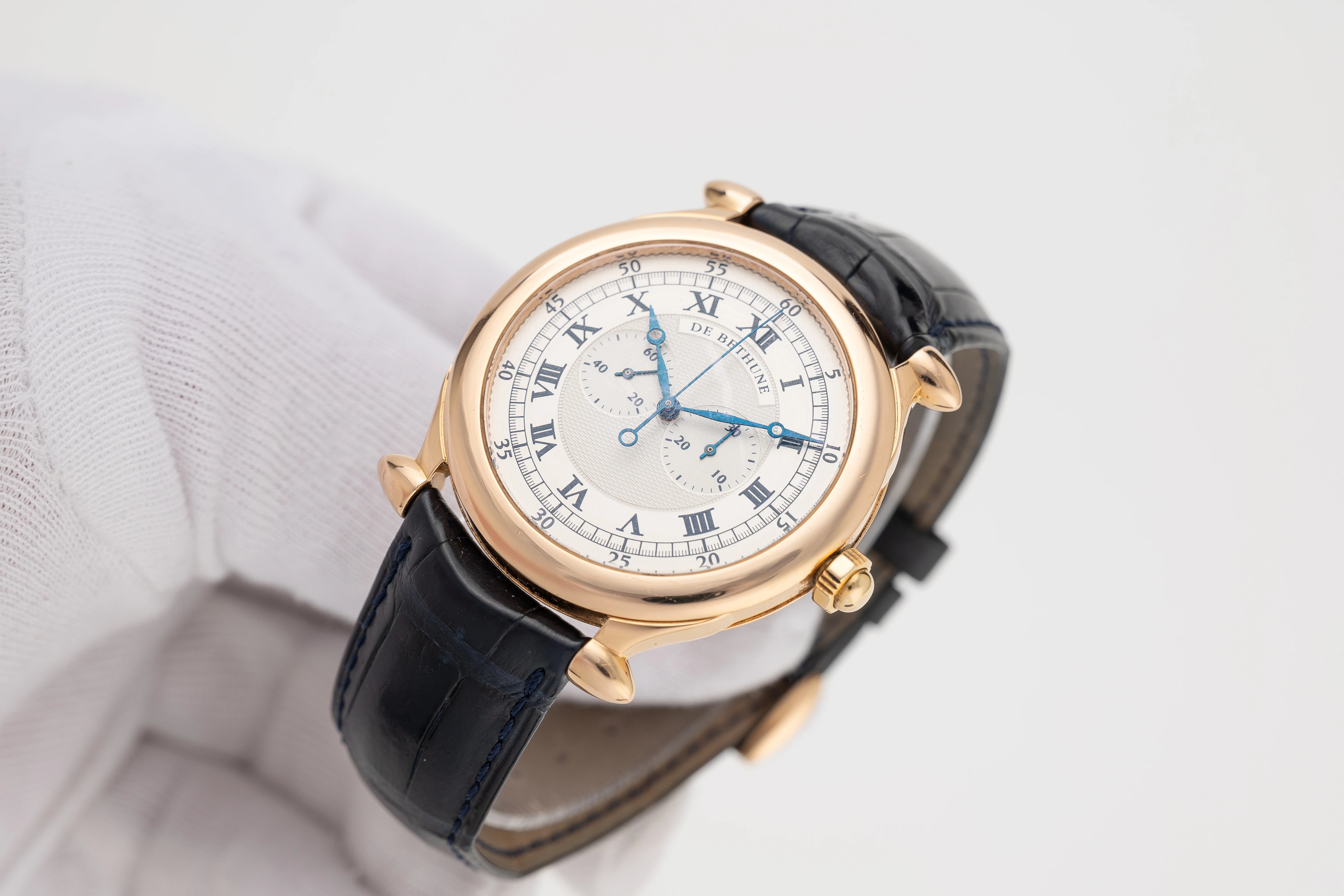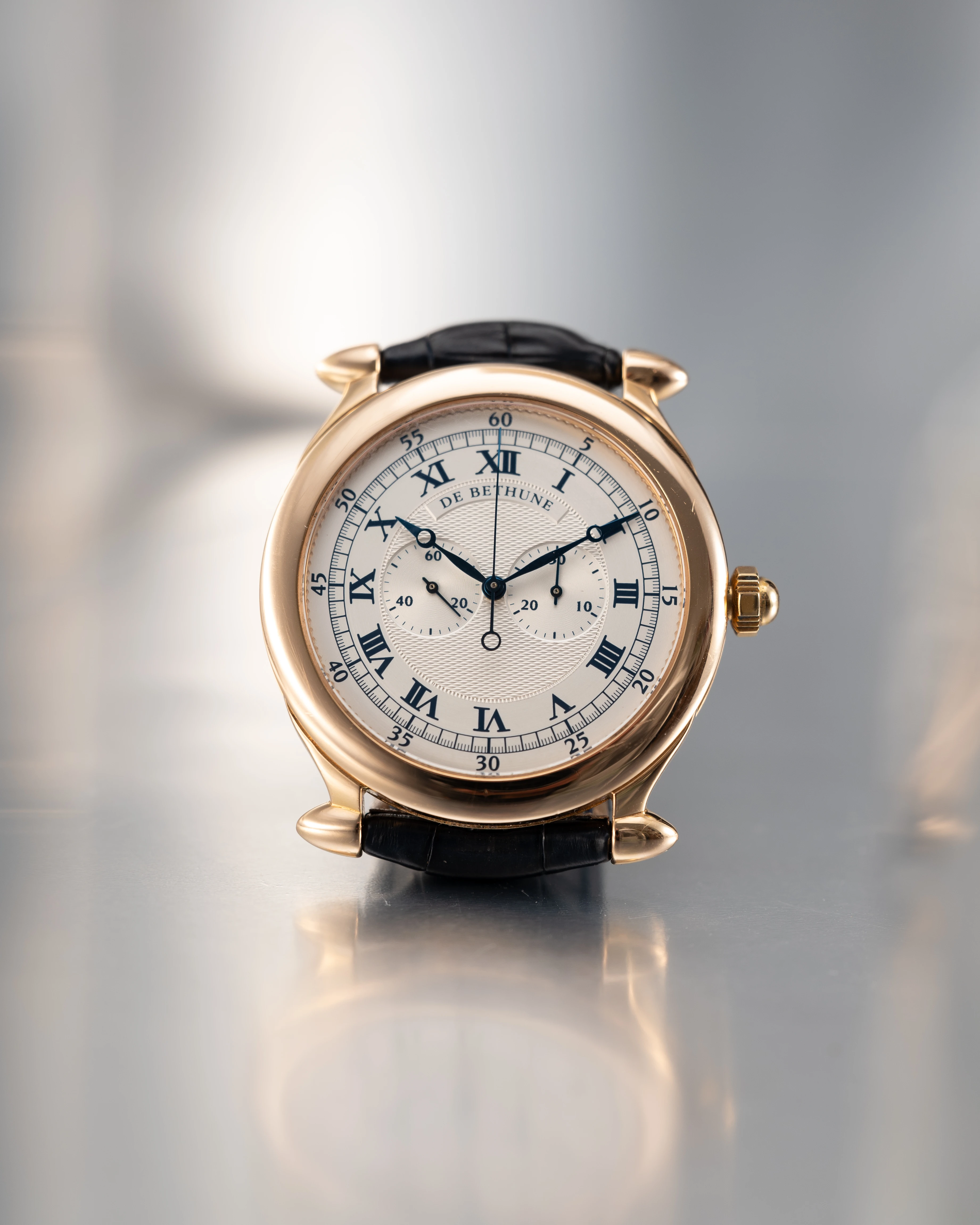 | Dial | Engine turned silvered dial, with black Roman numerals, railway minute track, chronograph minutes counter at 3 o'clock & small seconds 9 o'clock, blued Breguet hands, dial signed: "De Bethune" |