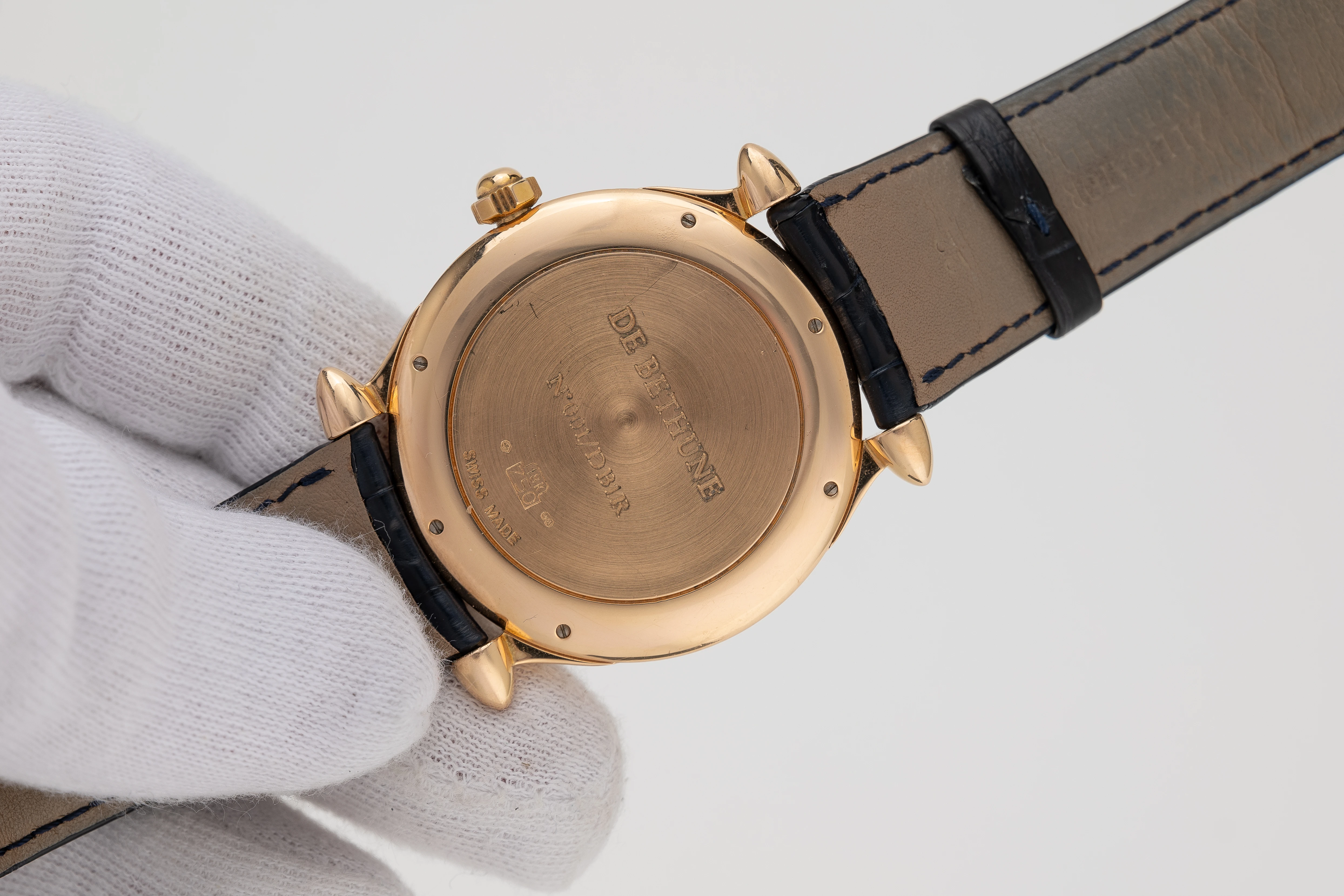The DB1 is the first reference ever produced by De Bethune. This DB1R watch is therefore a highly desirable acquisition for collectors and connoisseurs of De Bethune watchmaking. It offers the opportunity to acquire an extremely rare, collectible, charismatic and early mechanical timepiece from this famous independent watch brand, undoubtedly one of the market leaders in modern haute horlogerie. The present example dates from the first year of De Bethune’s activity and displays all the stylistic features characteristic of the brand’s early period, including a large, round and slender case with the characteristic ogival lugs and a matt silvered solid gold dial with blued steel “Pomme de Breguet” hands. This example with the proud number 001 on the caseback is the first in the DB1R series and one of the earliest examples of the De Bethune collection to ever leave the manufacture, which makes this rare and sought-after timepiece even more attractive.