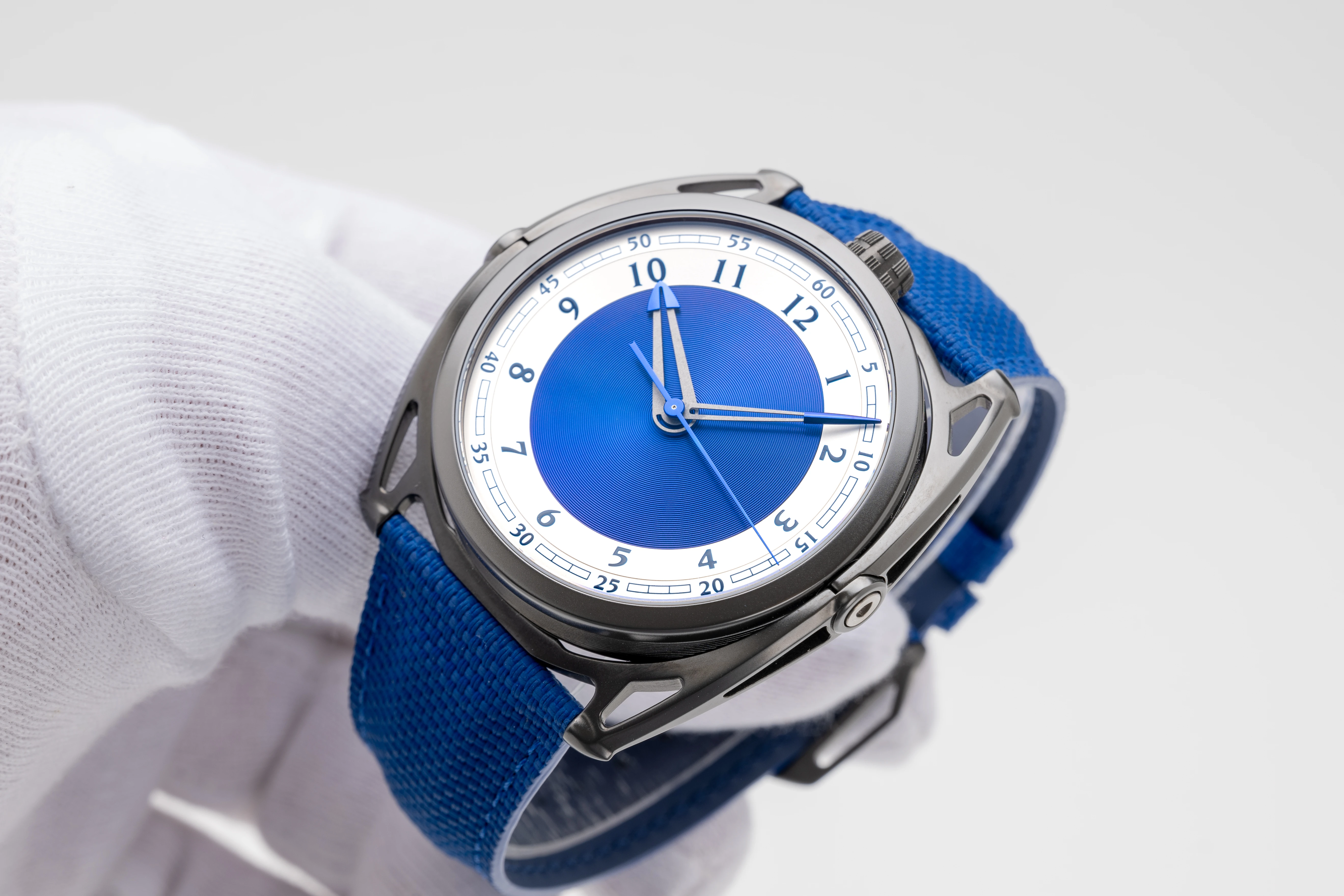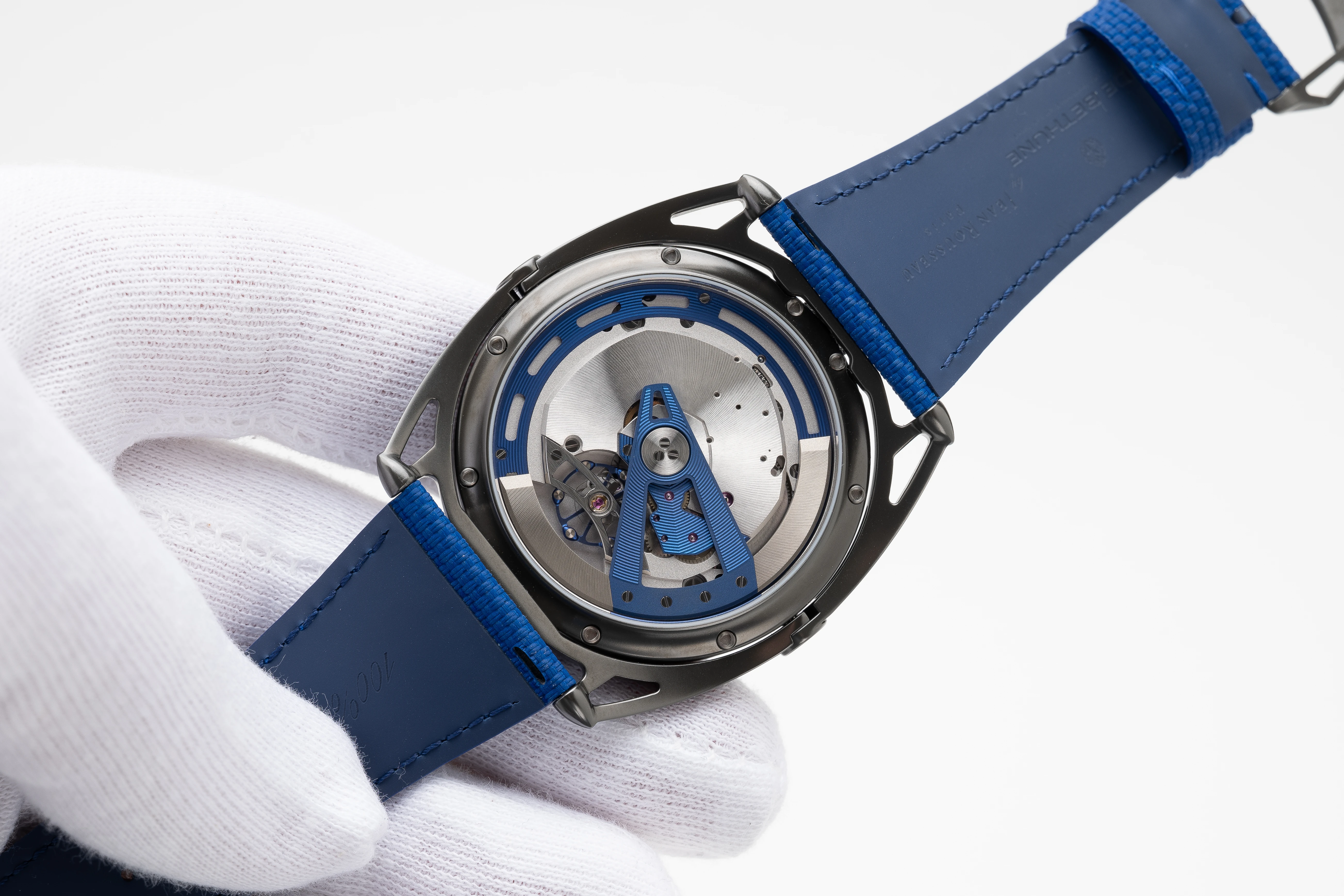 The DB27 Titan Hawk, which debuted in 2012, is now referred to as version 1 – V1, while the V2 version was introduced six years later, in 2018. The most noticeable upgrade is that the V1’s partially open caseback has been replaced by a fully transparent exhibition sapphire caseback, revealing the intricately crafted movement and its high-tech details. The new AutoV2 caliber, which replaces the previous S233, features a new titanium balance with white gold inserts, a grooved titanium anchor-shaped rotor, and a heavy tungsten alloy segment. All titanium parts of the caliber are blue-coated, a De Bethune specialty. De Bethune made a further change by removing the large central date hand and adding a central seconds hand. Both are useful on everyday watches, but generally the seconds hand is preferred on De Bethune watches, as in the vast majority of cases they are highly prized collectors' watches worn on special occasions. The dial of the basic design of the DB27 Titan Hawk V2 still bears a reference to the large date hand of the V1 version – a raised detail in the form of an extremely broad arrowhead, a typical motif of the De Bethune design code. This is a feature of the basic design of the DB27 Titan Hawk V2, while some extremely rare models have a simple dial without this relief decoration. This DB27 Titan Hawk V2 Qatar Edition 20 features this extremely rare version of the design with a stunningly attractive combination of a two-tone dial, the central part of which is made of blued titanium and decorated only with thin concentric grooves, and the silver chapter ring with Arabic numerals and a grained finish in a domed shape – very much in the spirit of De Bethune. What is unusual and rare and adds spice to this rare design is the complete absence of the De Bethune logo, but this does not prevent this watch from remaining absolutely recognizable. This watch was released in 2024in a limited edition of just 20 pieces to celebrate De Bethune’s 12-year partnership with Blue Salon, one of Qatar’s leading luxury stores.