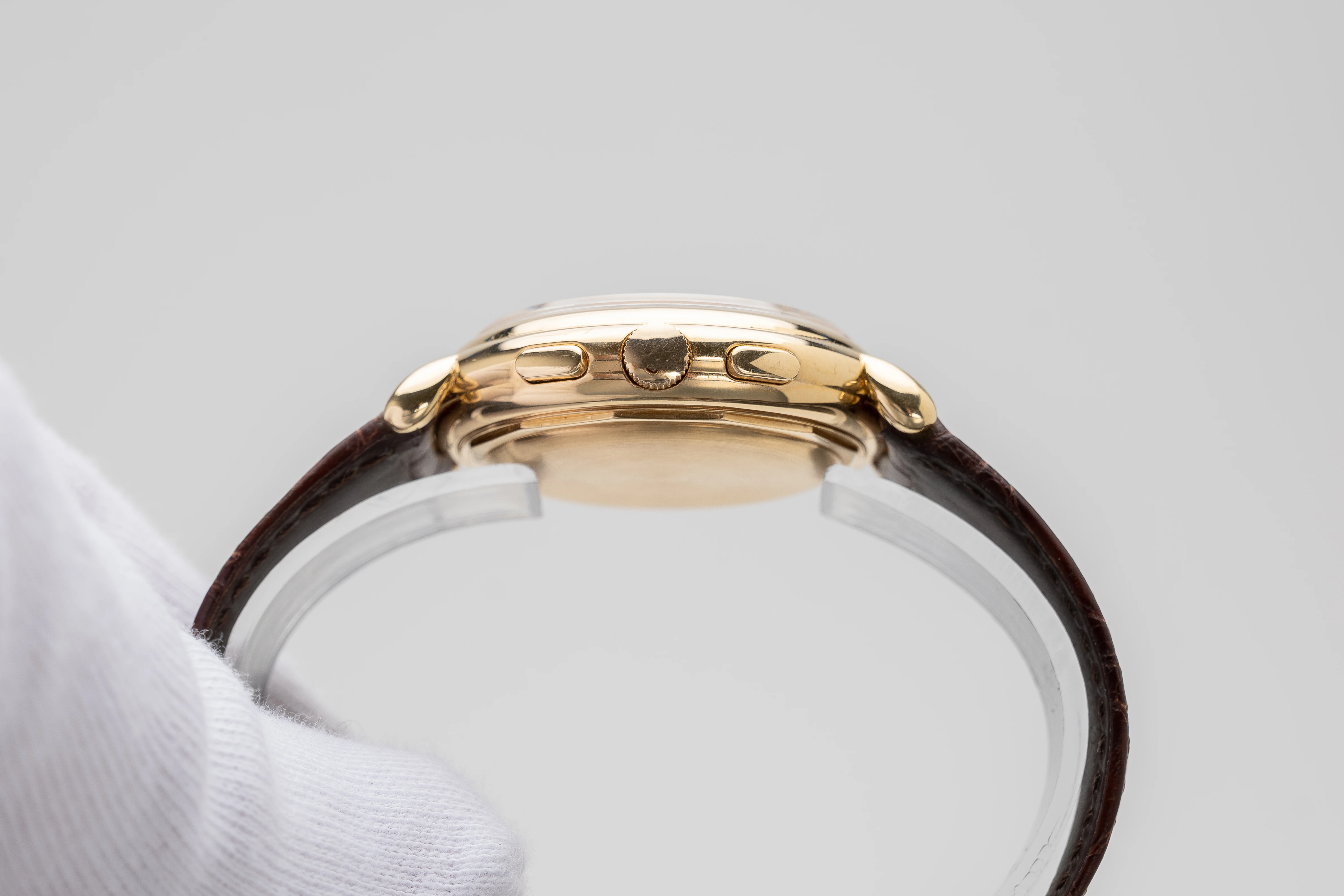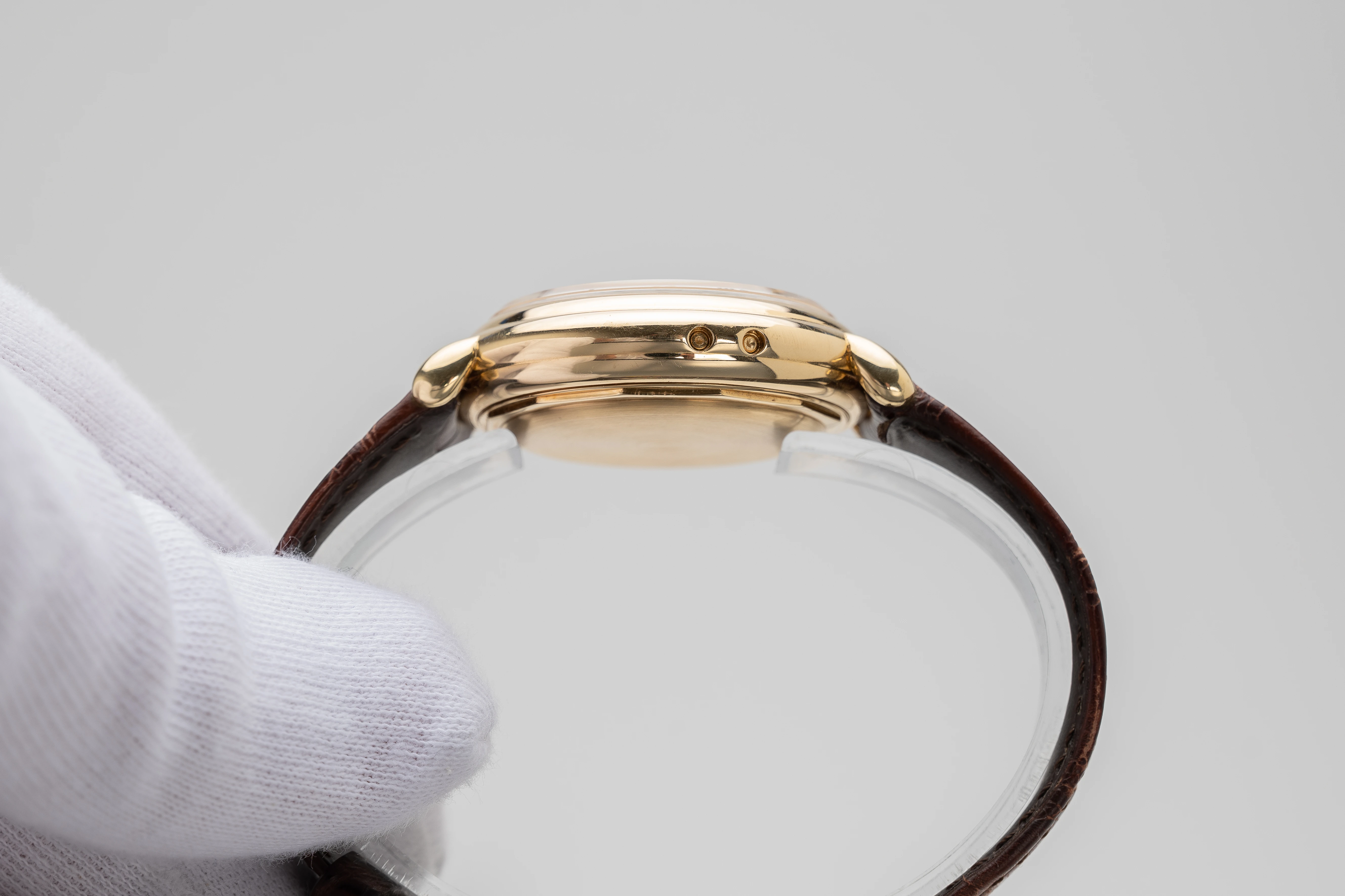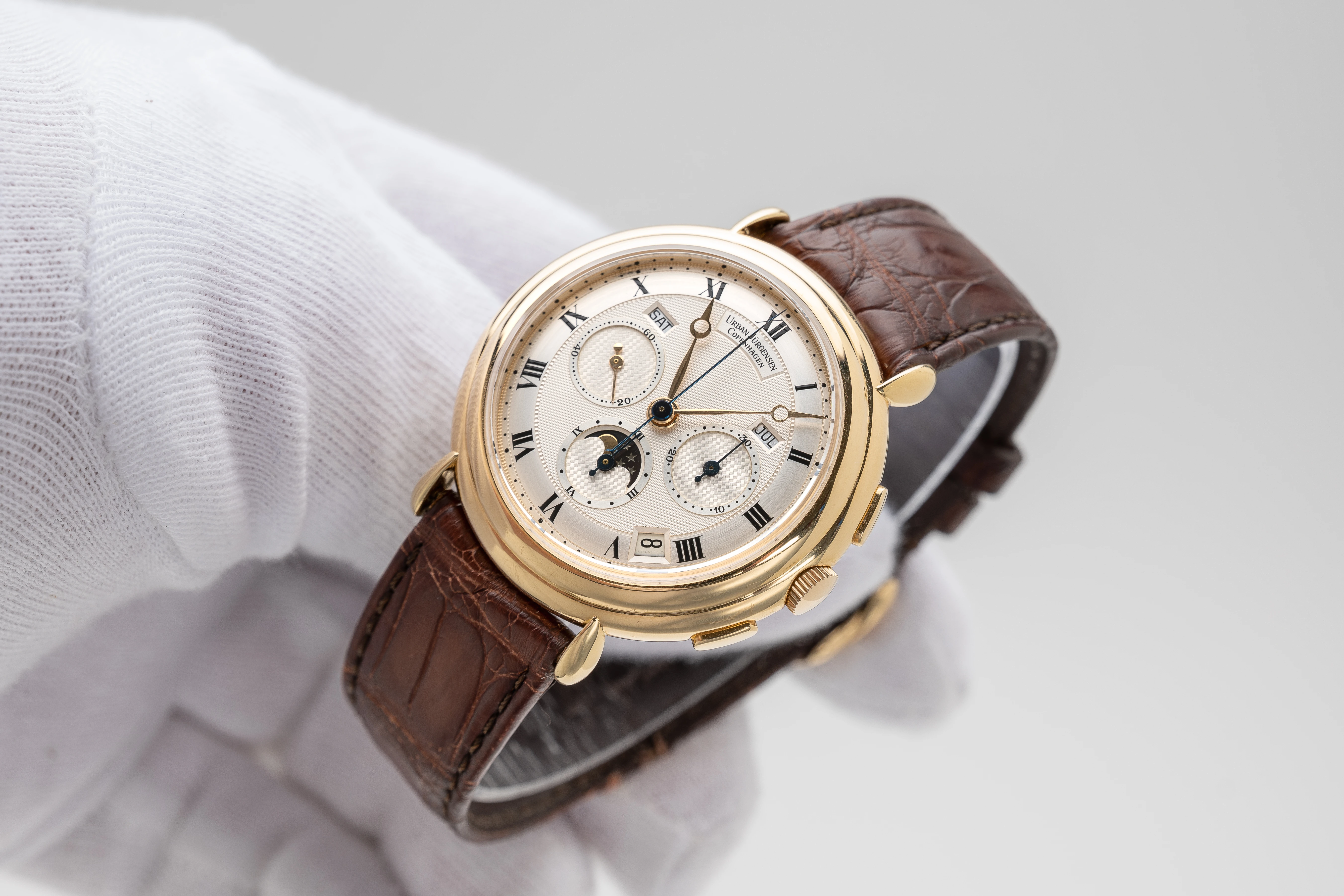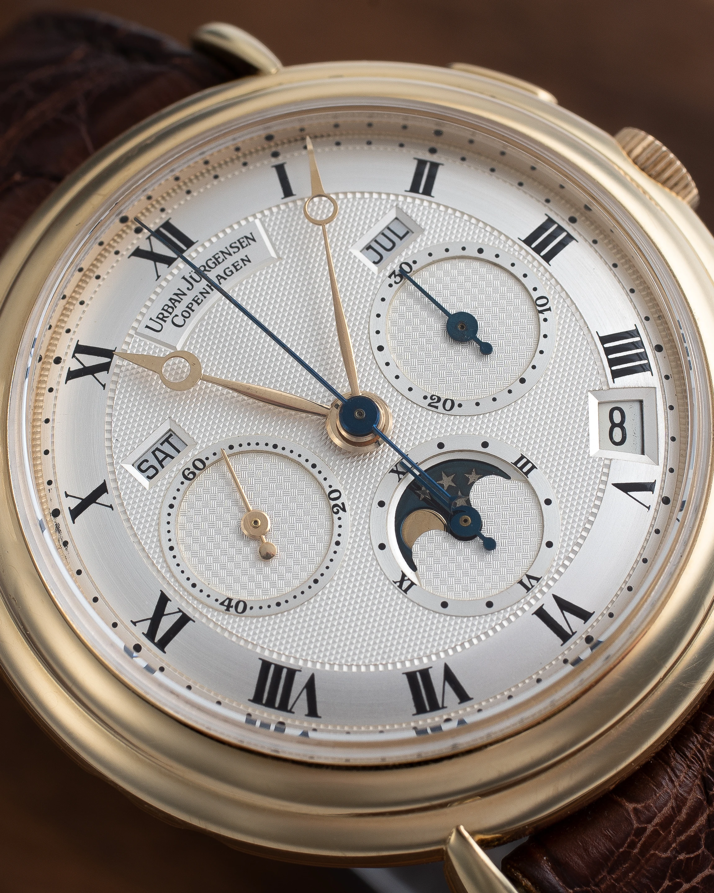 The dial is also an outstanding example of traditional craftsmanship, an aspect of Reference 1 that the brand, like all other early Urban Jürgensen releases, owes to its master watchmaker Derek Pratt, a protagonist of old traditional decorative techniques. In particular, it is known that many early Urban Jürgensen watches, and most likely this example as well, were made by Derek Pratt himself, including the guilloché work, the results of which can be enjoyed when looking at the dial of this watch. The guilloché work on the Reference 1 dial consists of three different styles: a ‘lozenge’ guilloché in the center, a ‘ vieux panier’ (basket weave) guilloché for the sub-dials of small seconds, the 30-minute and 12-hour counters, the latter combined with moonphase, and a filet sauté guilloché in the outlines. All the decorations on the dial were made by hand on a rose machine, most likely by Derek Pratt himself – he is known to have been an outstanding master of this finishing technique.
