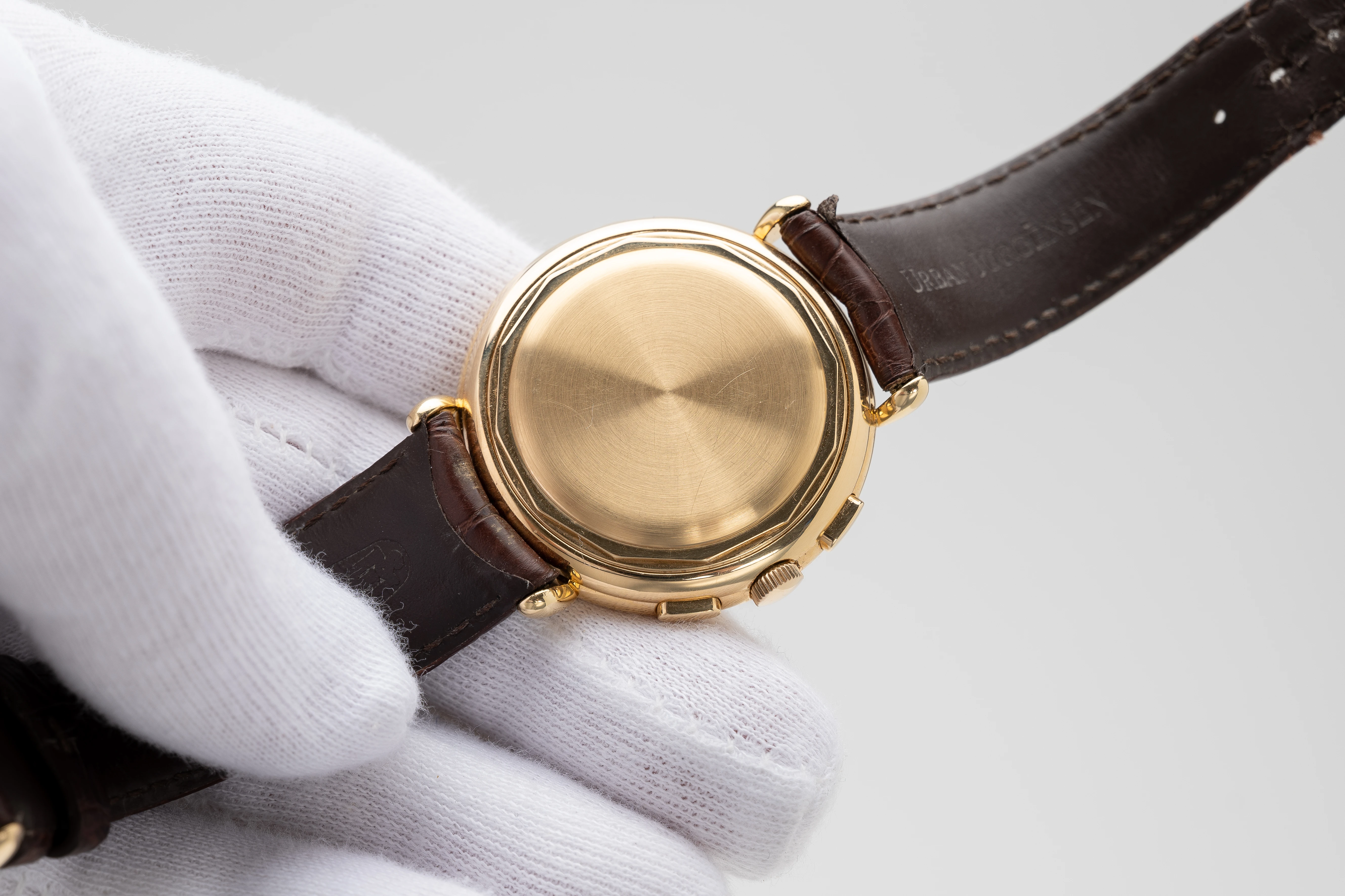 The second remarkable circumstance is the fact that Urban Jürgensen equipped the Reference 1 with a closed caseback that prevents the watch owner from seeing the movement – this was a standard option for Urban Jürgensen at the time. However, Urban Jürgensen felt it necessary to make the rotor much more openworked than was originally done by Zenith in order to make the beautiful chronograph movement more open, even if it is not visible under the closed caseback. There is a slightly more mundane version in which the corresponding part of the rotor has been milled to remove the engraved Zenith lettering.