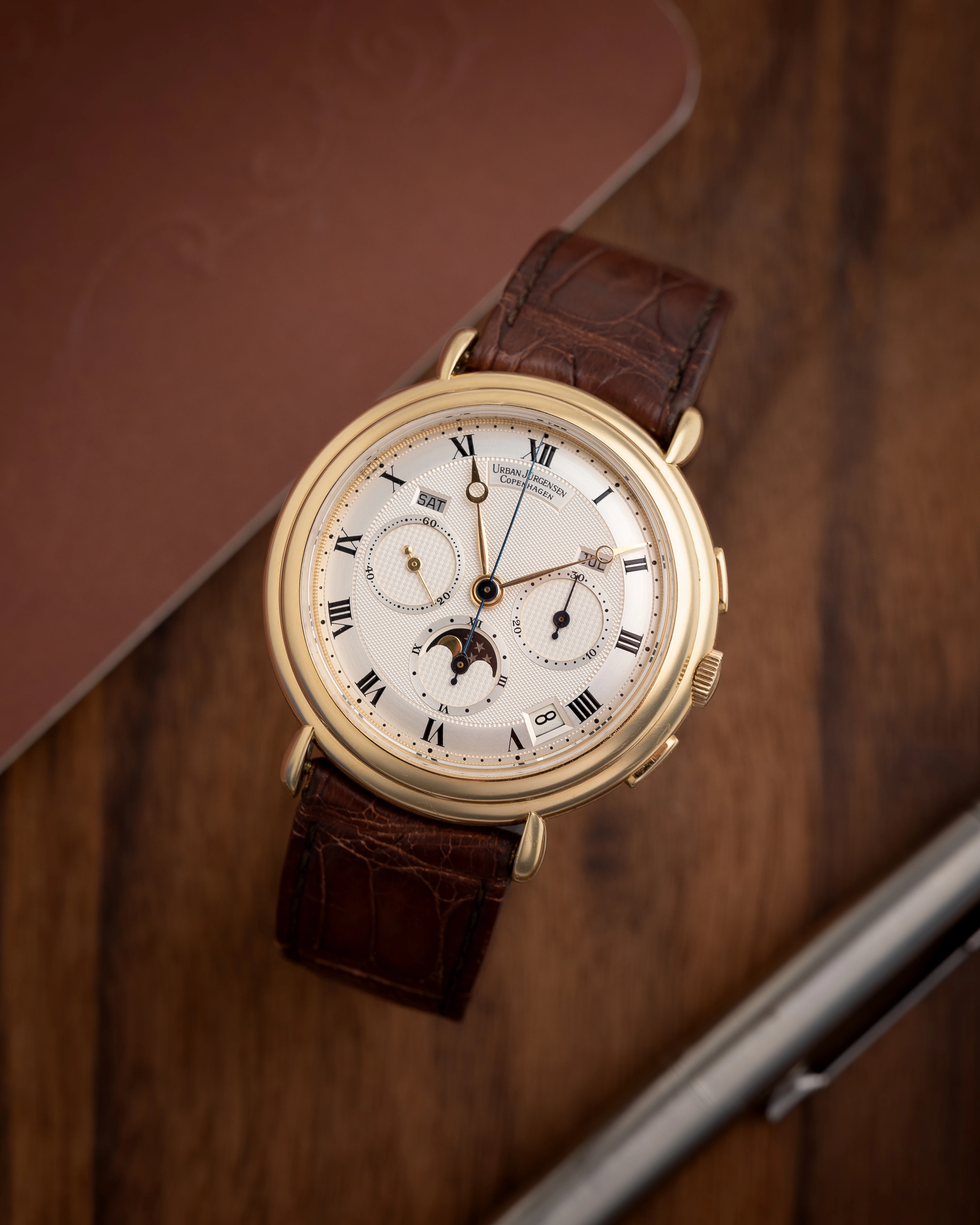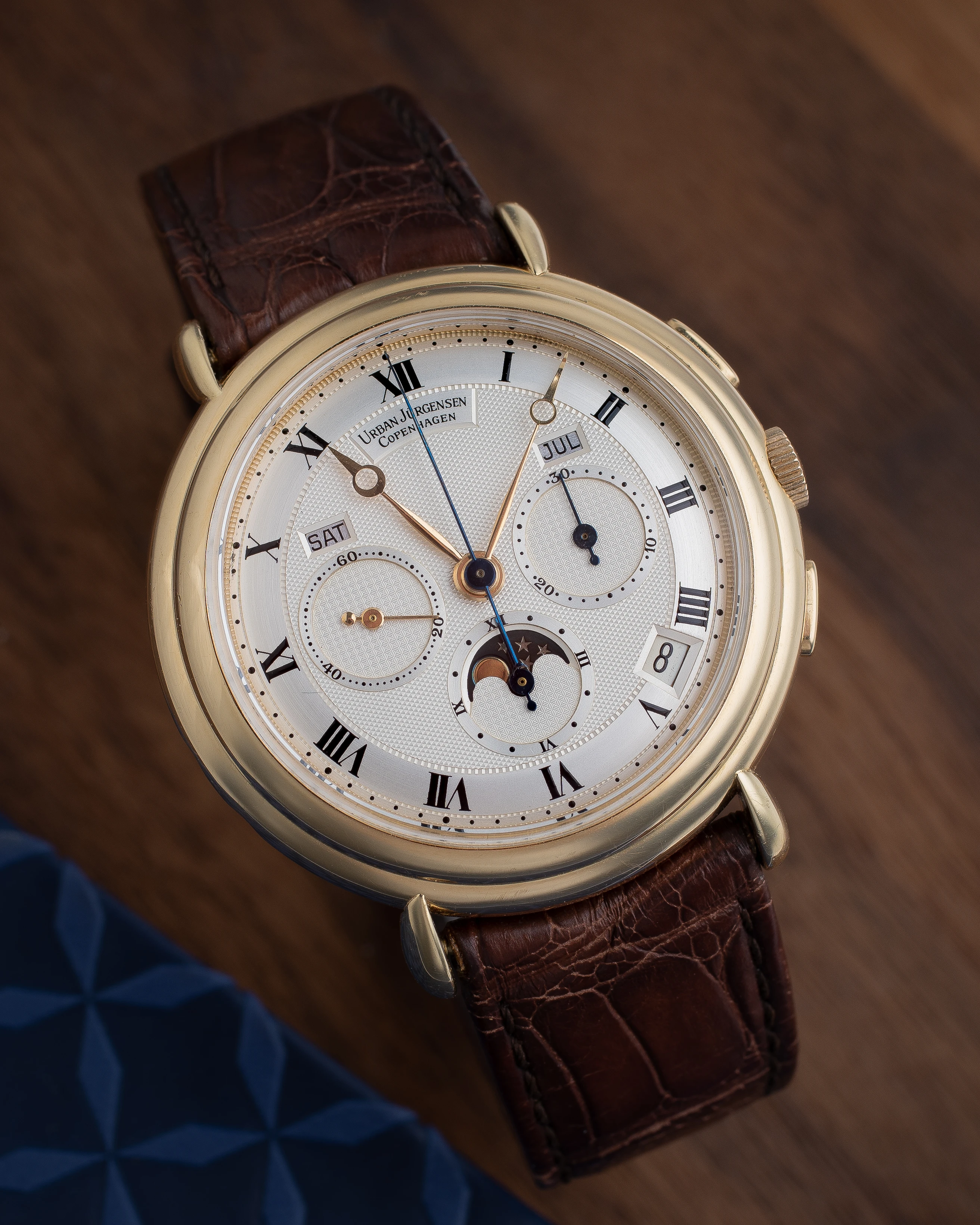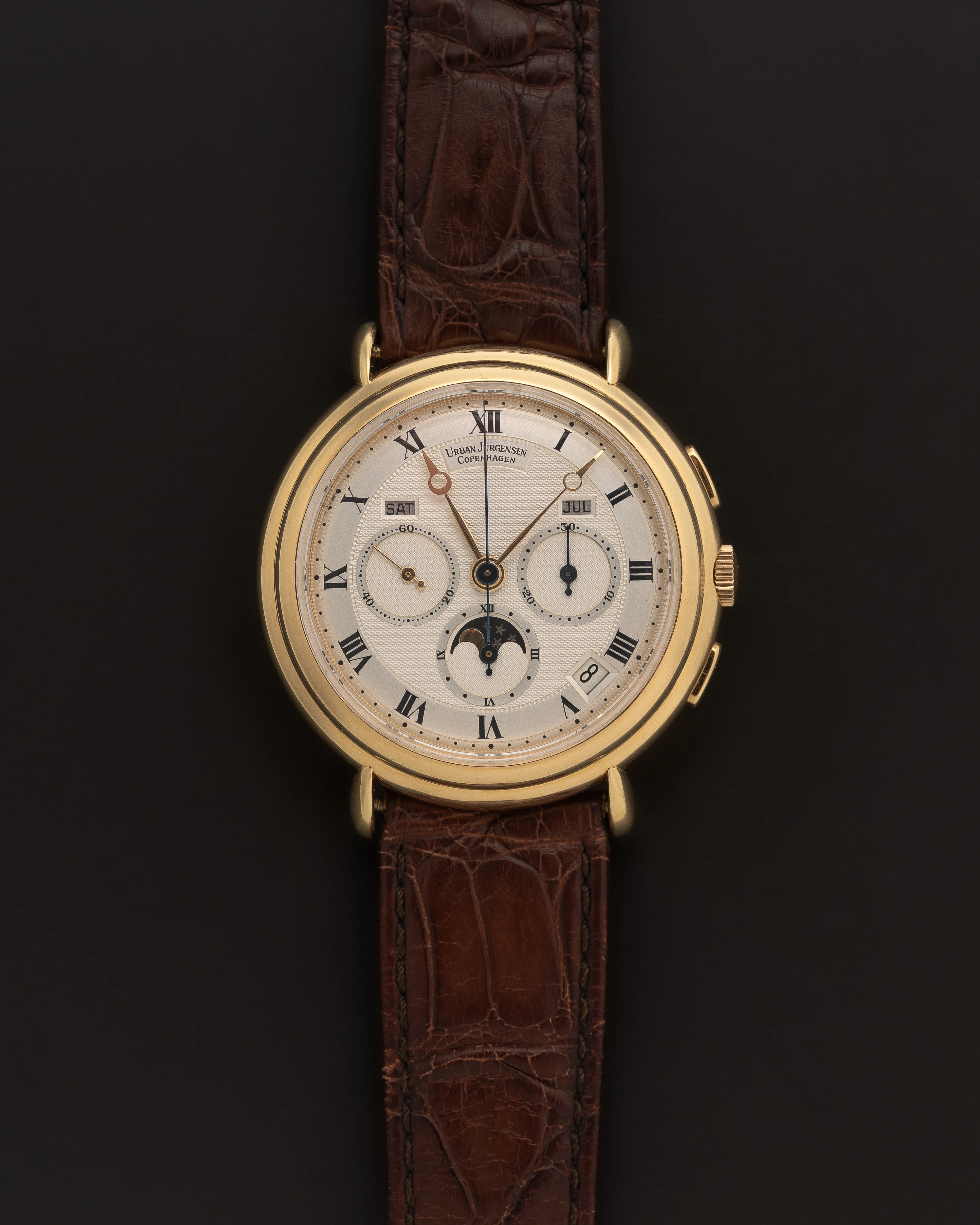 This Reference 1 watch is the earliest release of the brand. It was produced from 1982 under the direction of Peter Baumberger and with the active involvement of Derek Pratt himself in the manufacture of the watches, which is a good part of the appeal of the early collection, even though the brand was not officially founded until 1985. At the heart of this model was the Zenith caliber 3019PHF, better known as El Primero, a calendar clone of the caliber 3019PHC, the first automatic chronograph with an integral construction and a high-frequency balance operating at 36,000 vibrations per hour or 5 Hz. However, this choice seems quite reasonable as it was the only commercially available high-end self-winding chronograph movement at the time, i.e. without plastic parts and other technical compromises and with a traditional column wheel and lateral clutch scheme. Several things are noteworthy about the use of this movement in the Urban Jürgensen Reference 1.