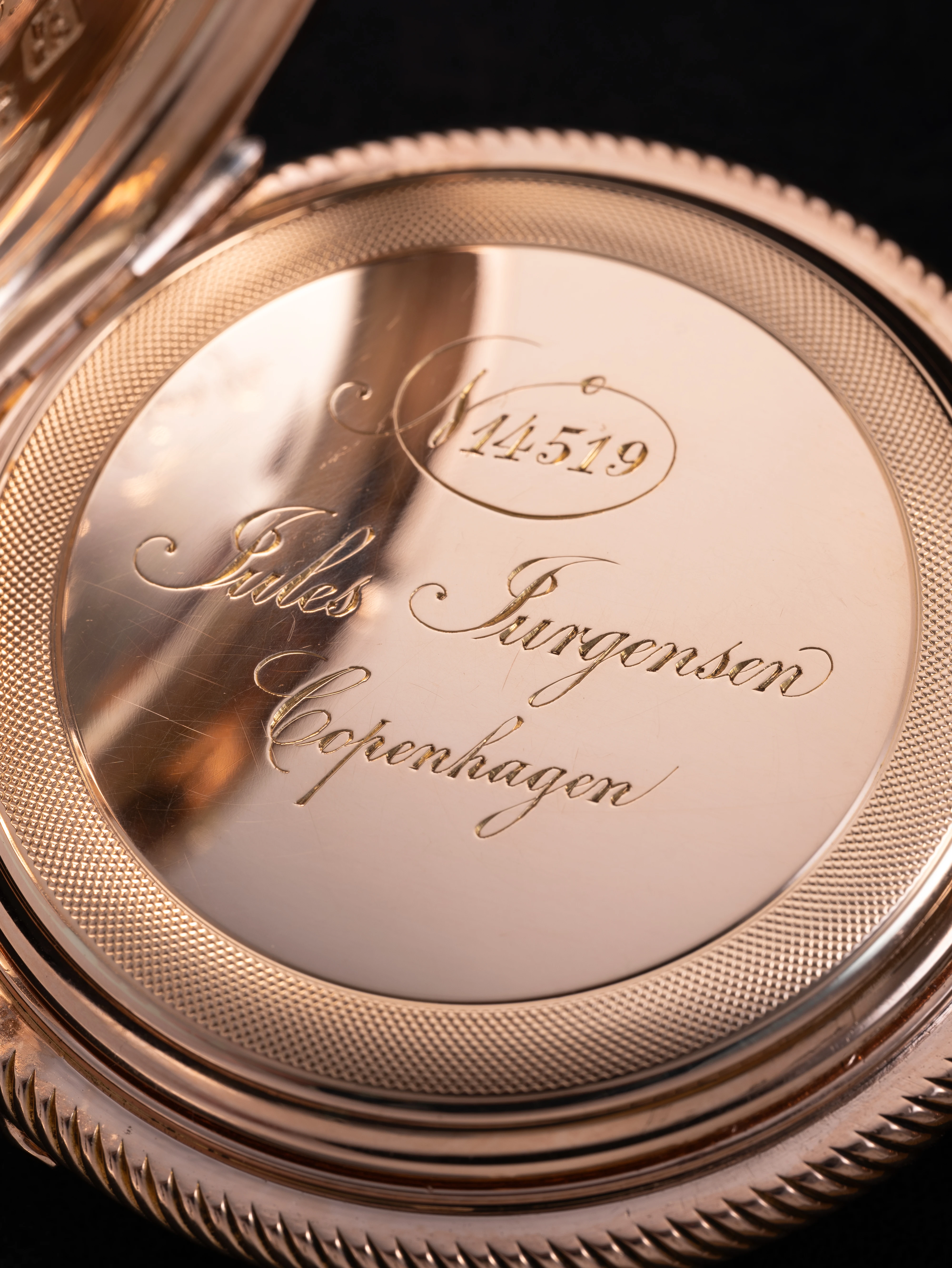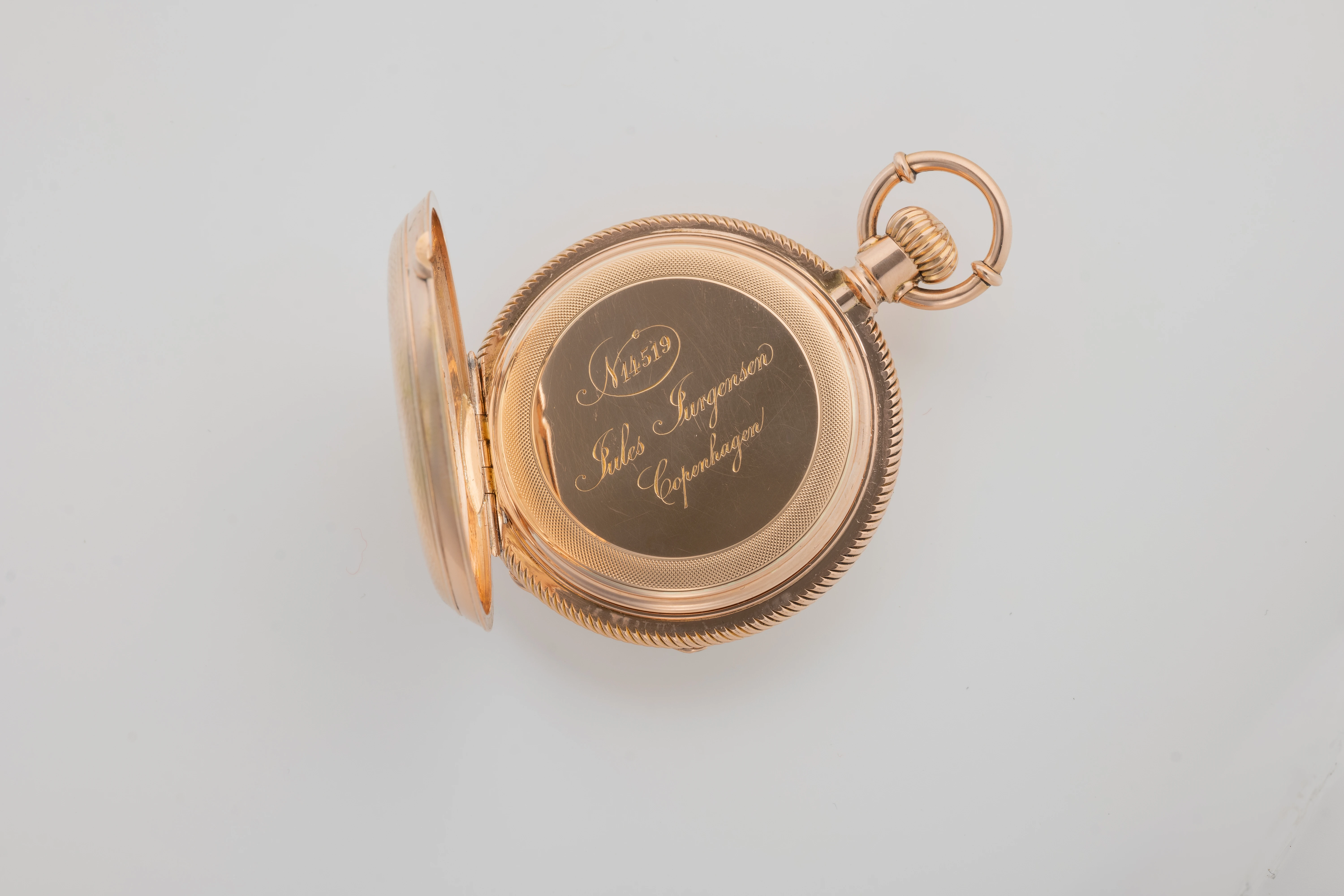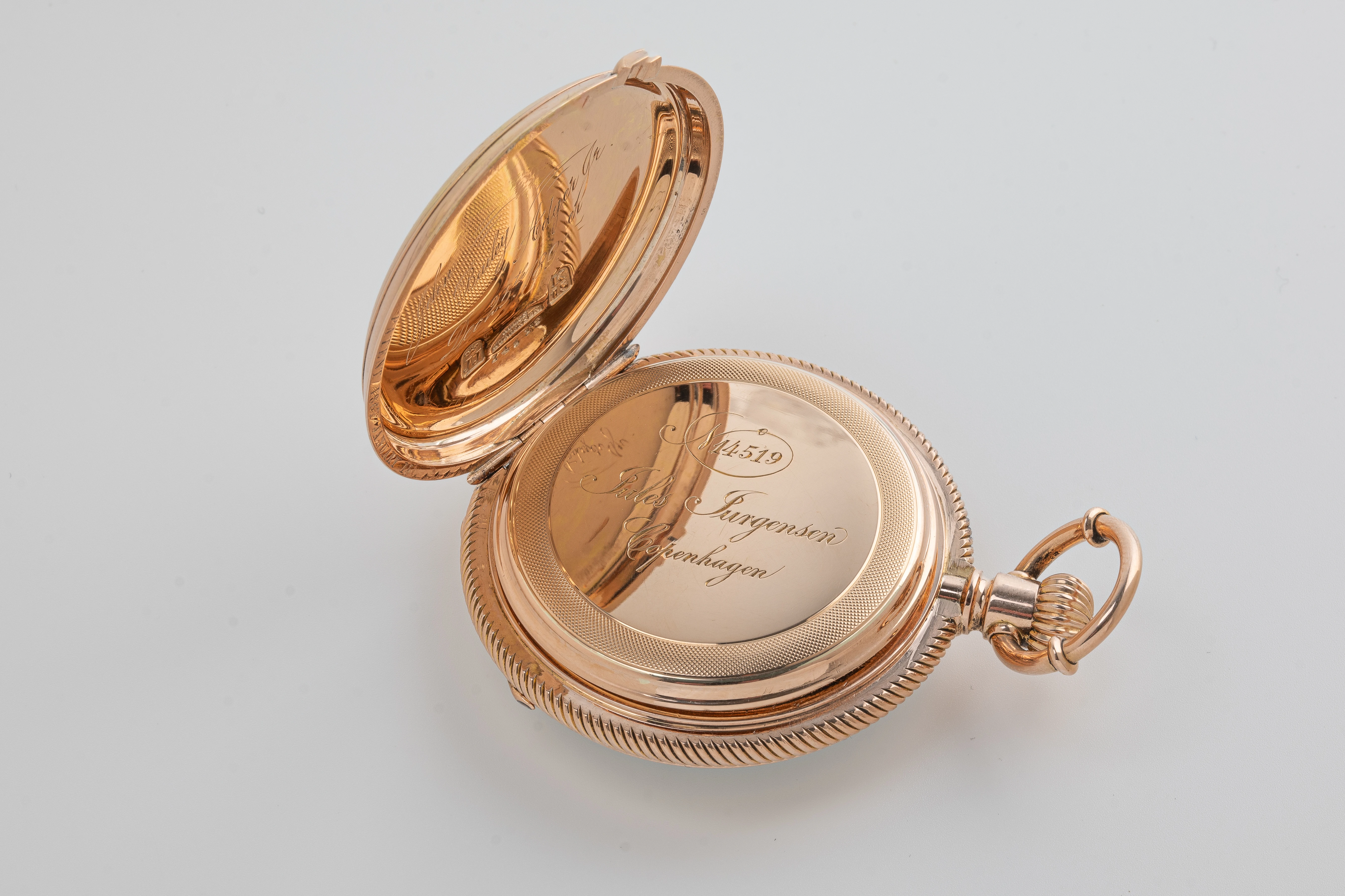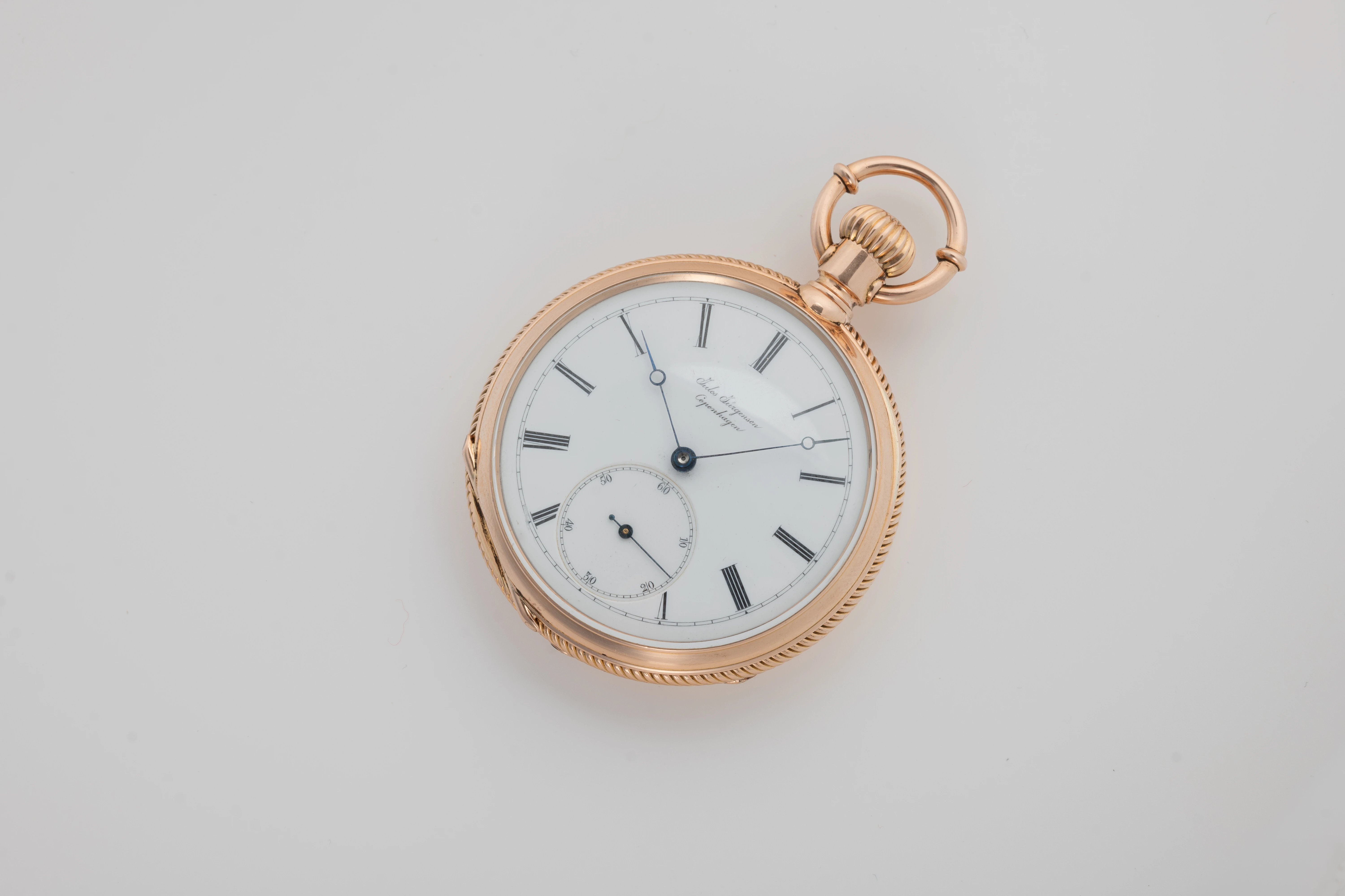 This clock looks like a typical example of the watchmaking art of Jules Jürgensen Copenhagen. It is made of 18-carat gold in the classic Empire style, has an open-face case (Lepine type), a two-part white enamel dial with narrow black Roman numerals and a railway-style minute track as well as delicate “Pomme de Breguet” hands made of blued steel. The case back of the watch is engraved with a commemorative inscription indicating the year 1891. Based on the serial number of the watch and the caliber (14519), we can assume that this watch was manufactured in the 1880s. This period coincides with the time when the Jules Jürgensen company was managed by Jules Frederik Urban Jürgensen (1837-1894), the son of Jules Frederik Jürgensen, the founder of the brand.