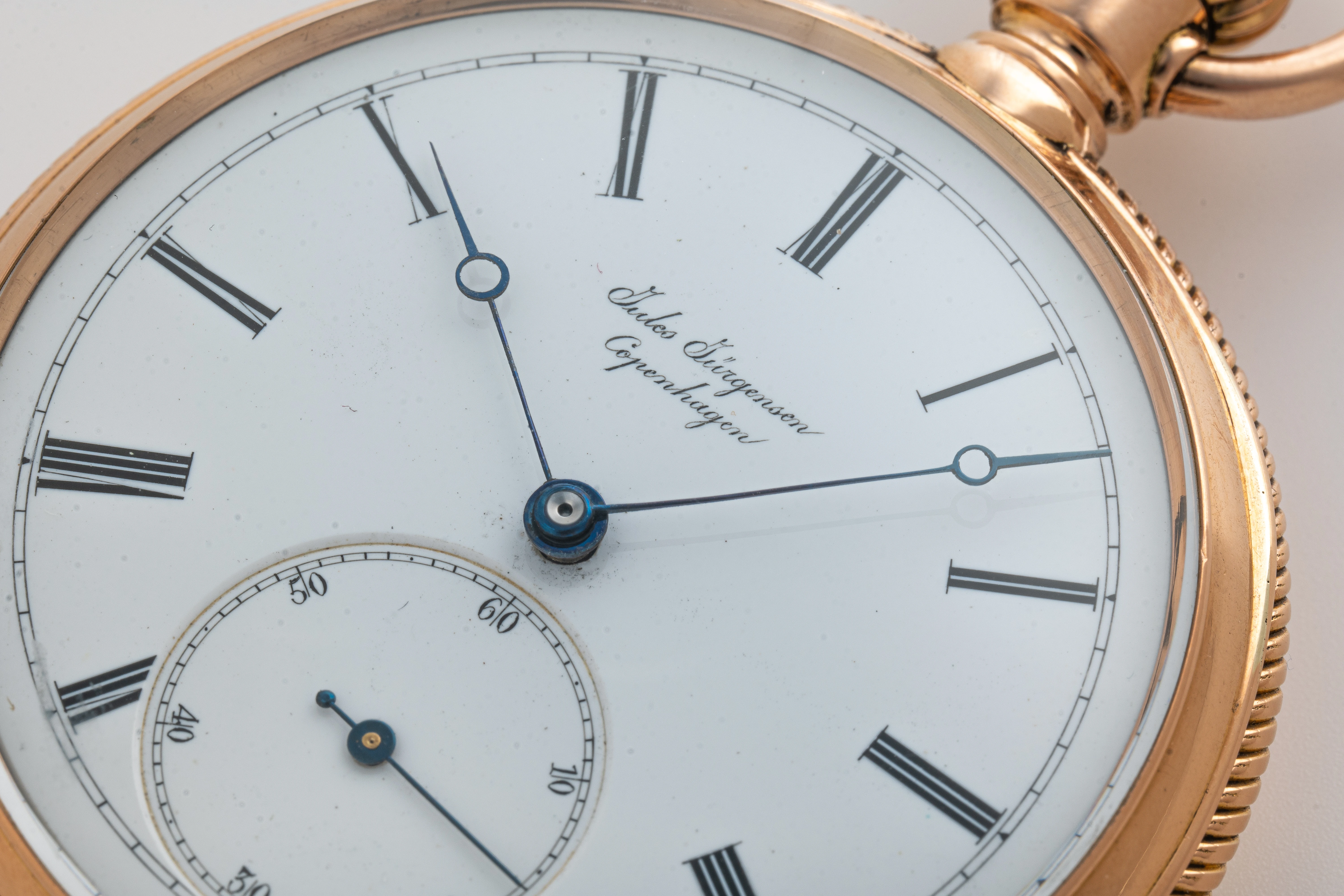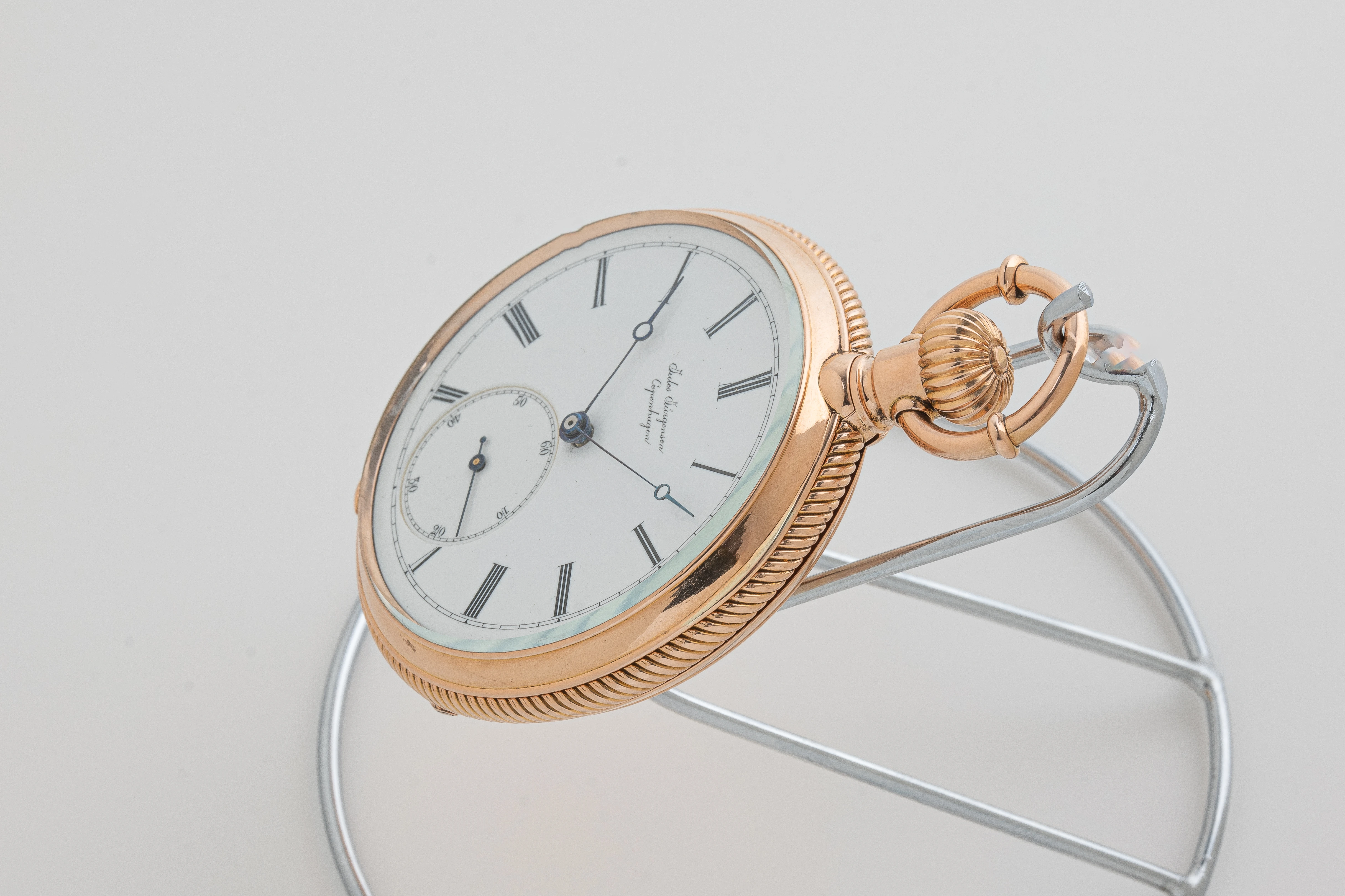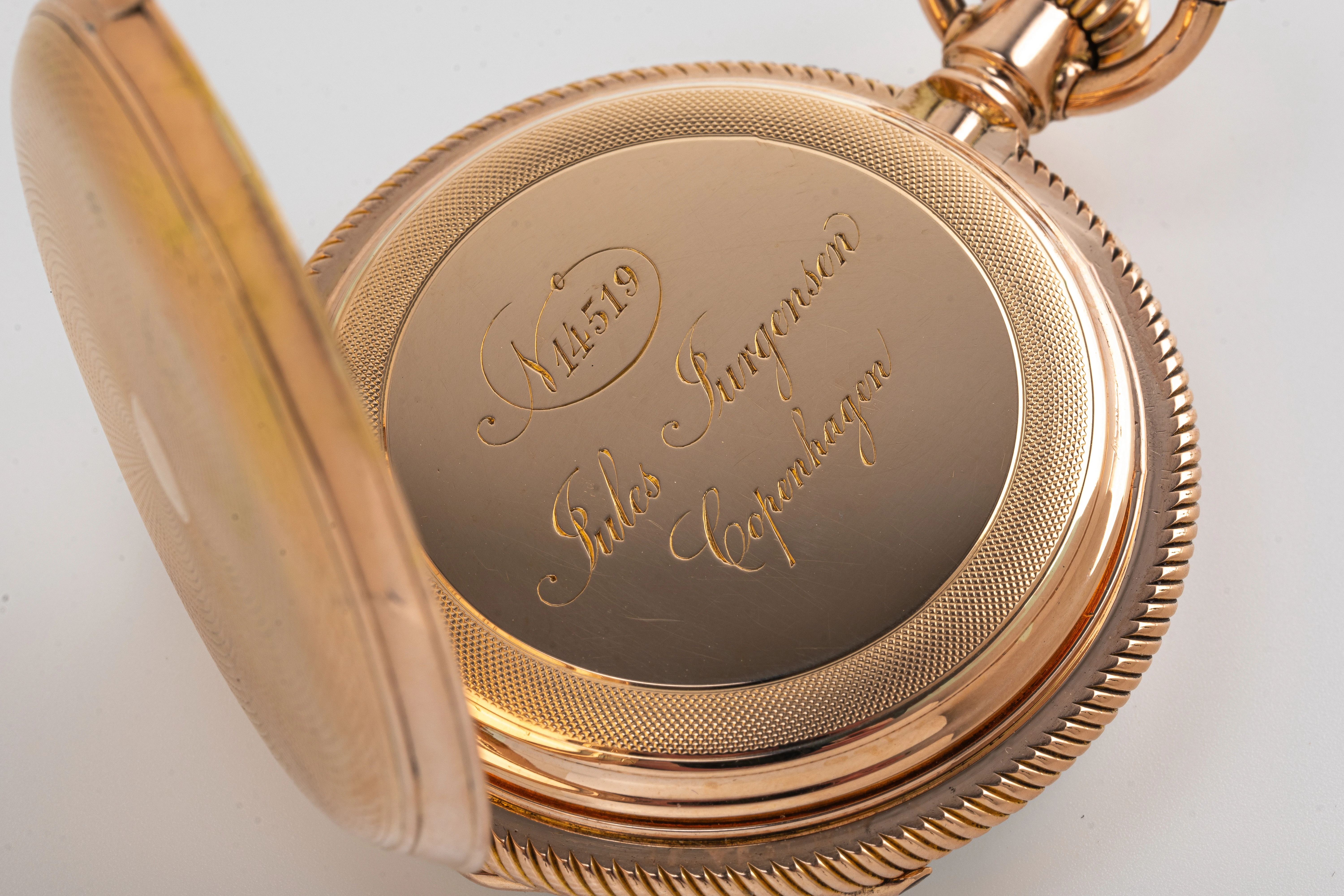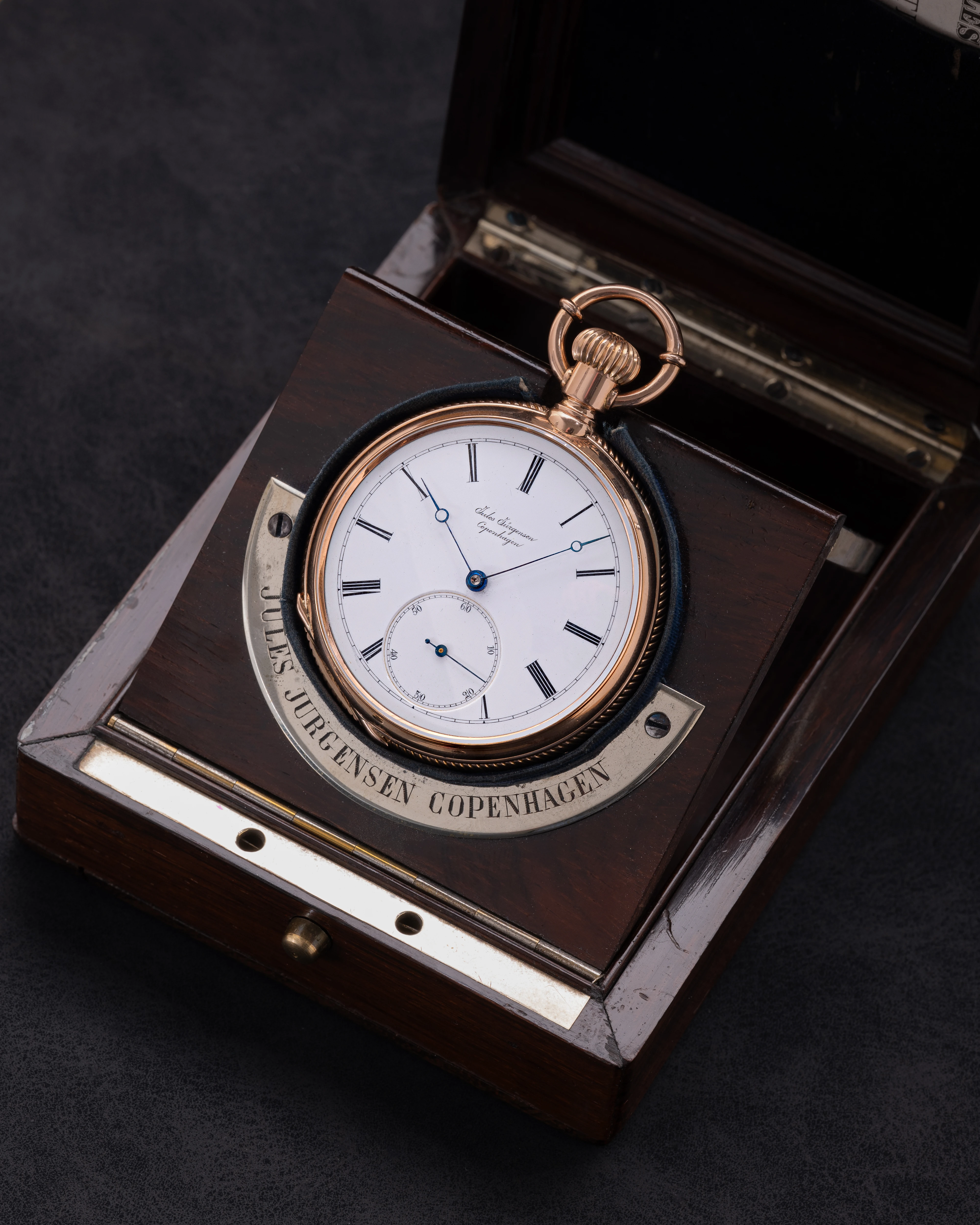 This clock looks like a typical example of the watchmaking art of Jules Jürgensen Copenhagen. It is made of 18-carat gold in the classic Empire style, has an open-face case (Lepine type), a two-part white enamel dial with narrow black Roman numerals and a railway-style minute track as well as delicate “Pomme de Breguet” hands made of blued steel. The case back of the watch is engraved with a commemorative inscription indicating the year 1891. Based on the serial number of the watch and the caliber (14519), we can assume that this watch was manufactured in the 1880s. This period coincides with the time when the Jules Jürgensen company was managed by Jules Frederik Urban Jürgensen (1837-1894), the son of Jules Frederik Jürgensen, the founder of the brand.