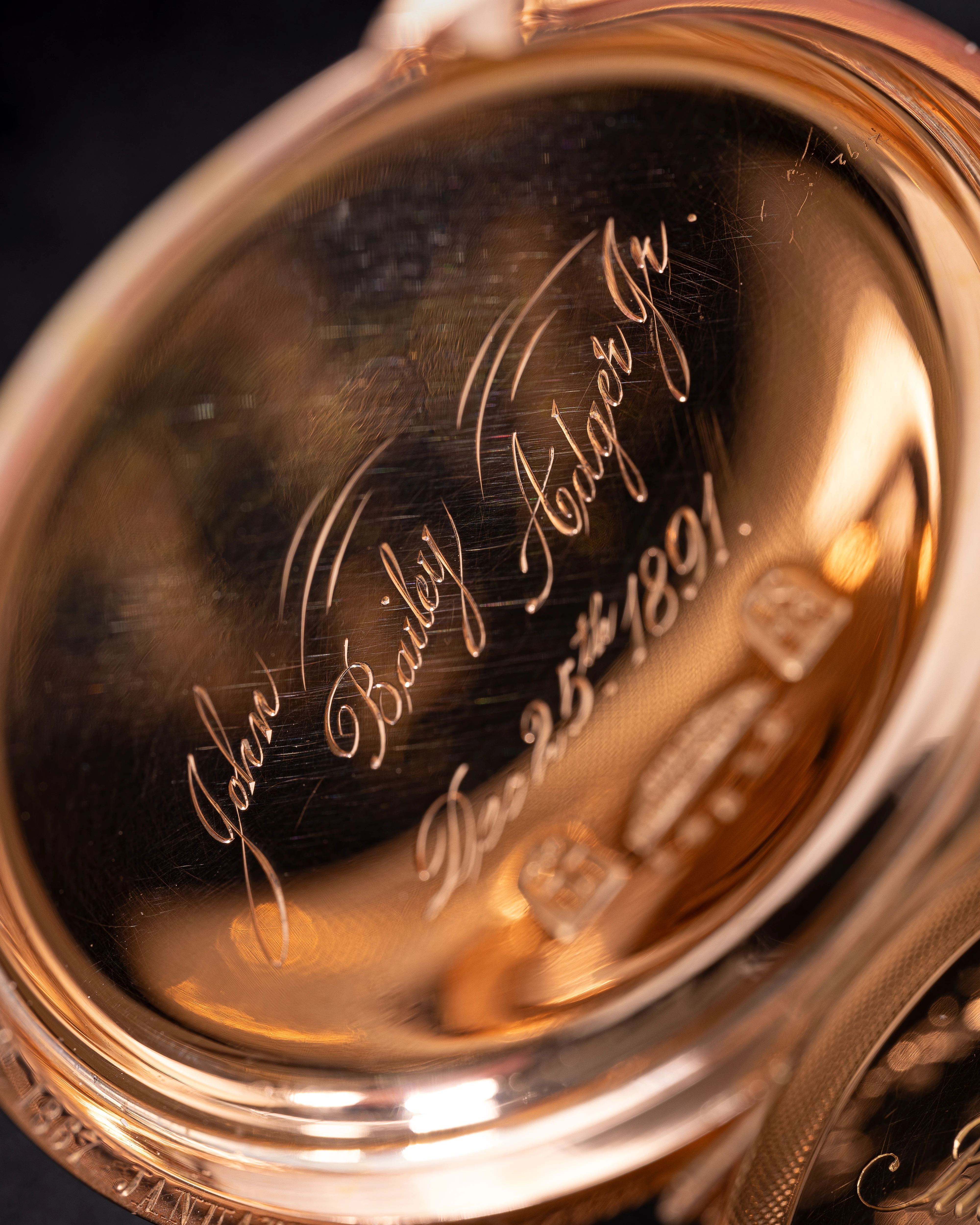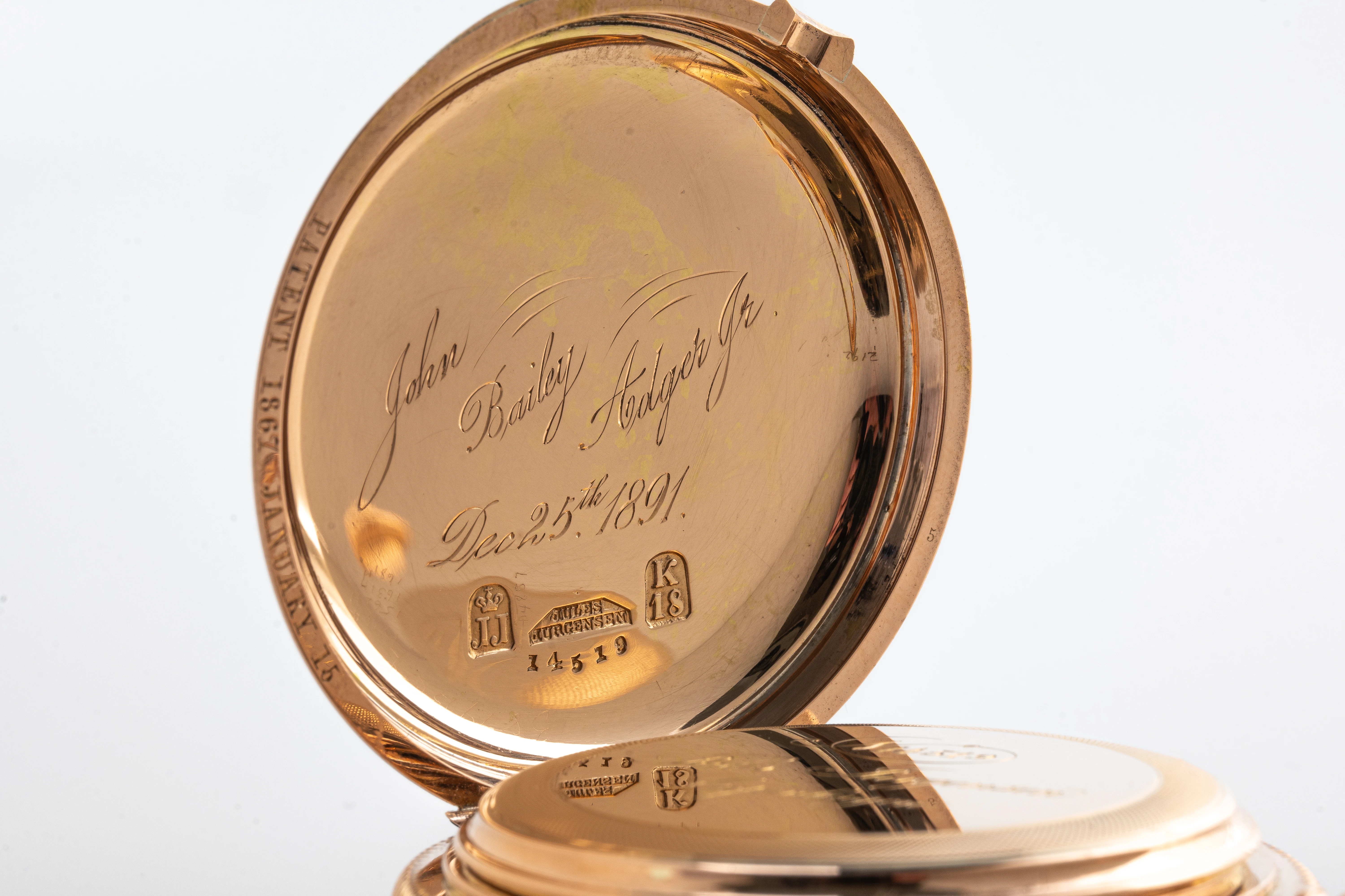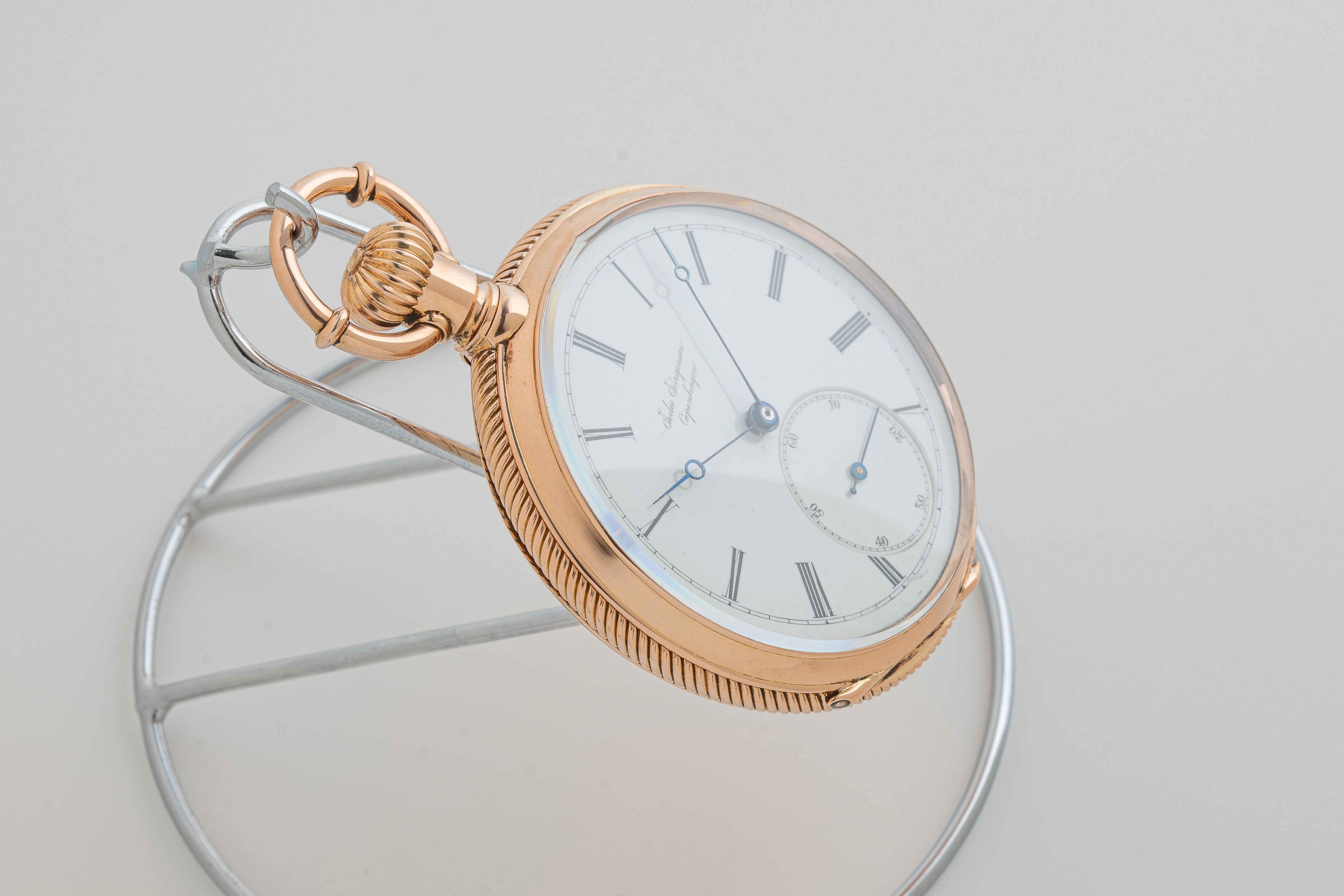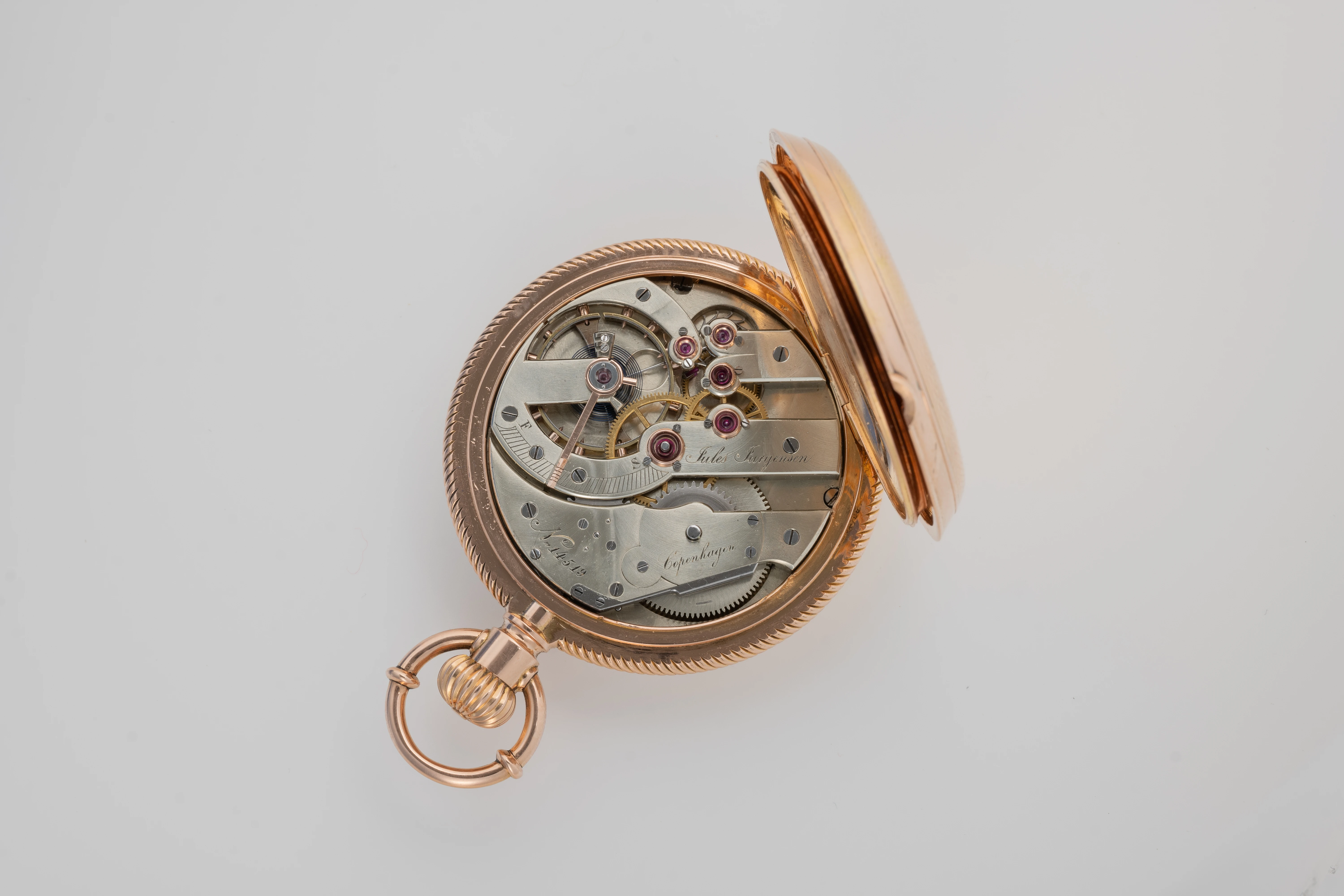 This clock looks like a typical example of the watchmaking art of Jules Jürgensen Copenhagen. It is made of 18-carat gold in the classic Empire style, has an open-face case (Lepine type), a two-part white enamel dial with narrow black Roman numerals and a railway-style minute track as well as delicate “Pomme de Breguet” hands made of blued steel. The case back of the watch is engraved with a commemorative inscription indicating the year 1891. Based on the serial number of the watch and the caliber (14519), we can assume that this watch was manufactured in the 1880s. This period coincides with the time when the Jules Jürgensen company was managed by Jules Frederik Urban Jürgensen (1837-1894), the son of Jules Frederik Jürgensen, the founder of the brand.