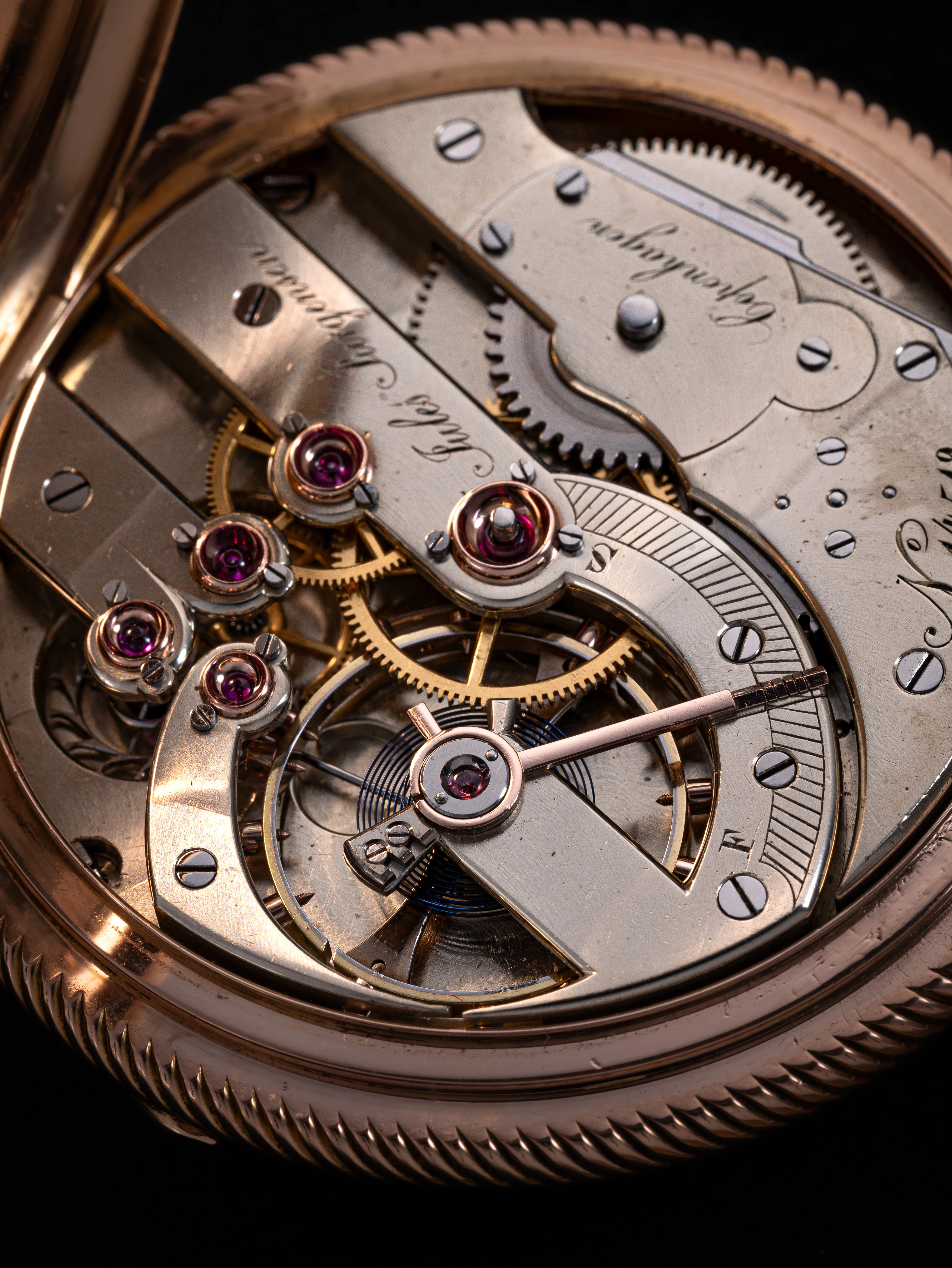 Due to the popularity of the Jürgensen caliber, which seems to have been strongly associated with the image of prestigious pocket watches with a precise and reliable movement in the second half of the 19th century, the design was adopted by many other brands, including H. Moser & Cie, Guinand Frères, James Nardin, to name but a few, with the exact technical specifications varying considerably, including the shape of the barrel bridge, the construction of the escapement fork, the presence of a Breguet hairspring and several other details. Many sources doubt that the Jürgensen caliber was the result of a technical development that was at least in some way related to Jules Jürgensen, but only became popular because it was regularly used by this renowned brand. It is also claimed that ébauches of this caliber were supplied by various factories besides Louis-Benjamin Audemars, including Piguet Frères, Aubert Frères, Reinbold, Louis Ami Capt, Meylan & Guignard Frères and others, which is confirmed by the corresponding markings on some of the caliber’s components.