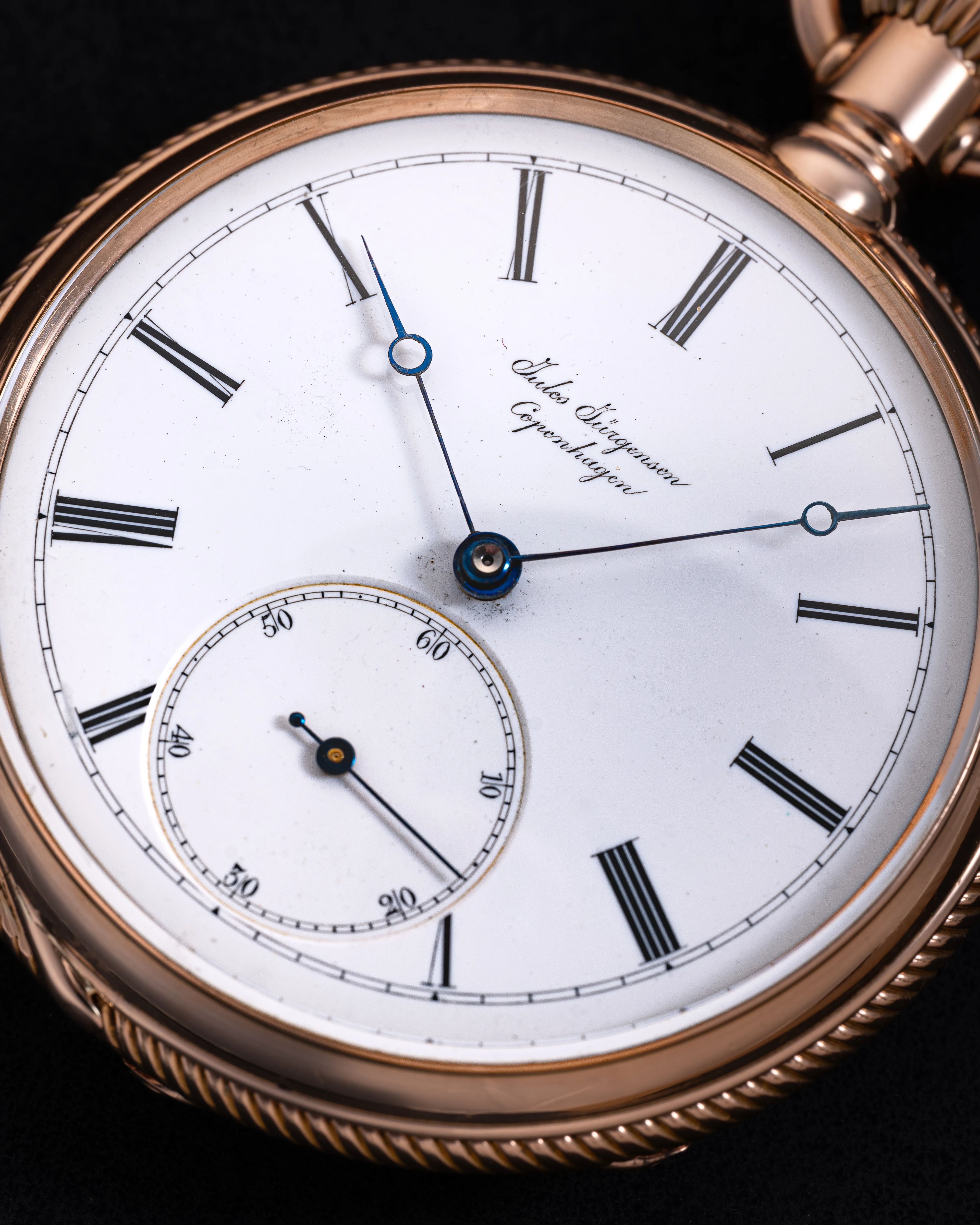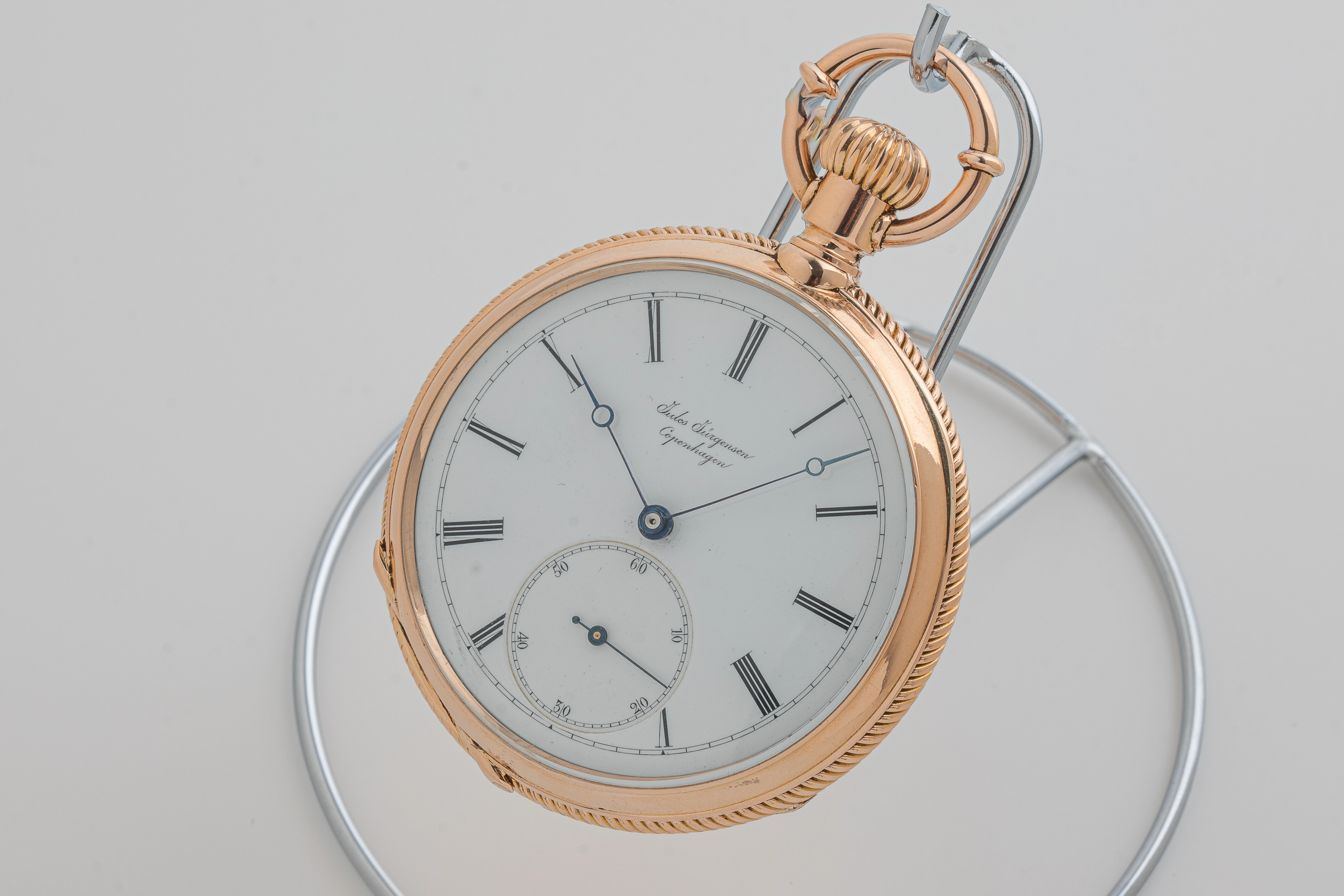 One of the most impressive "hidden" features of this watch is the Jürgensen bow incorporating hand-setting mechanism, patented in 1867, which can only be found in Jules Jürgensen pocket watches and in some pocket watches of other brands associated with the Jürgensen dynasty.