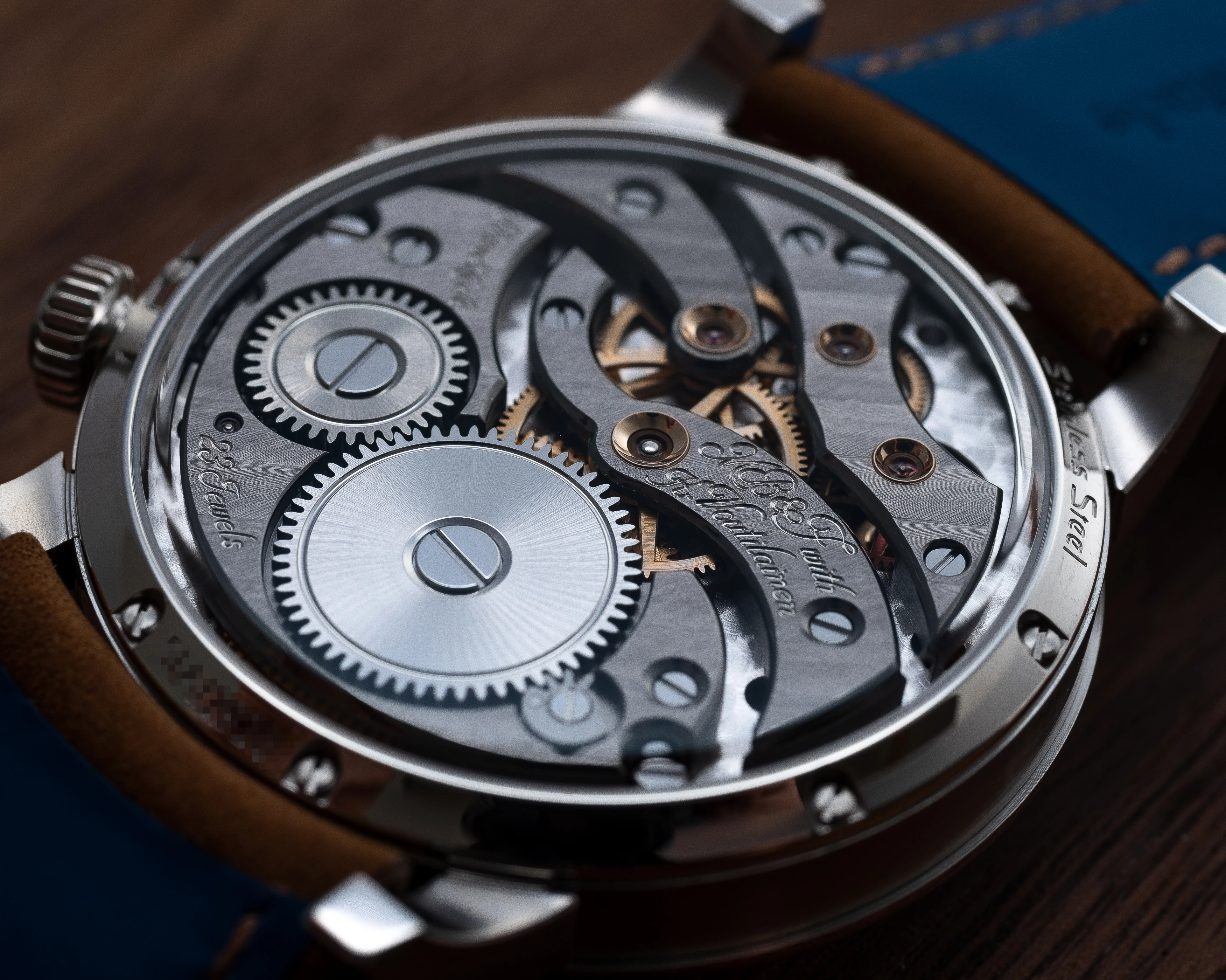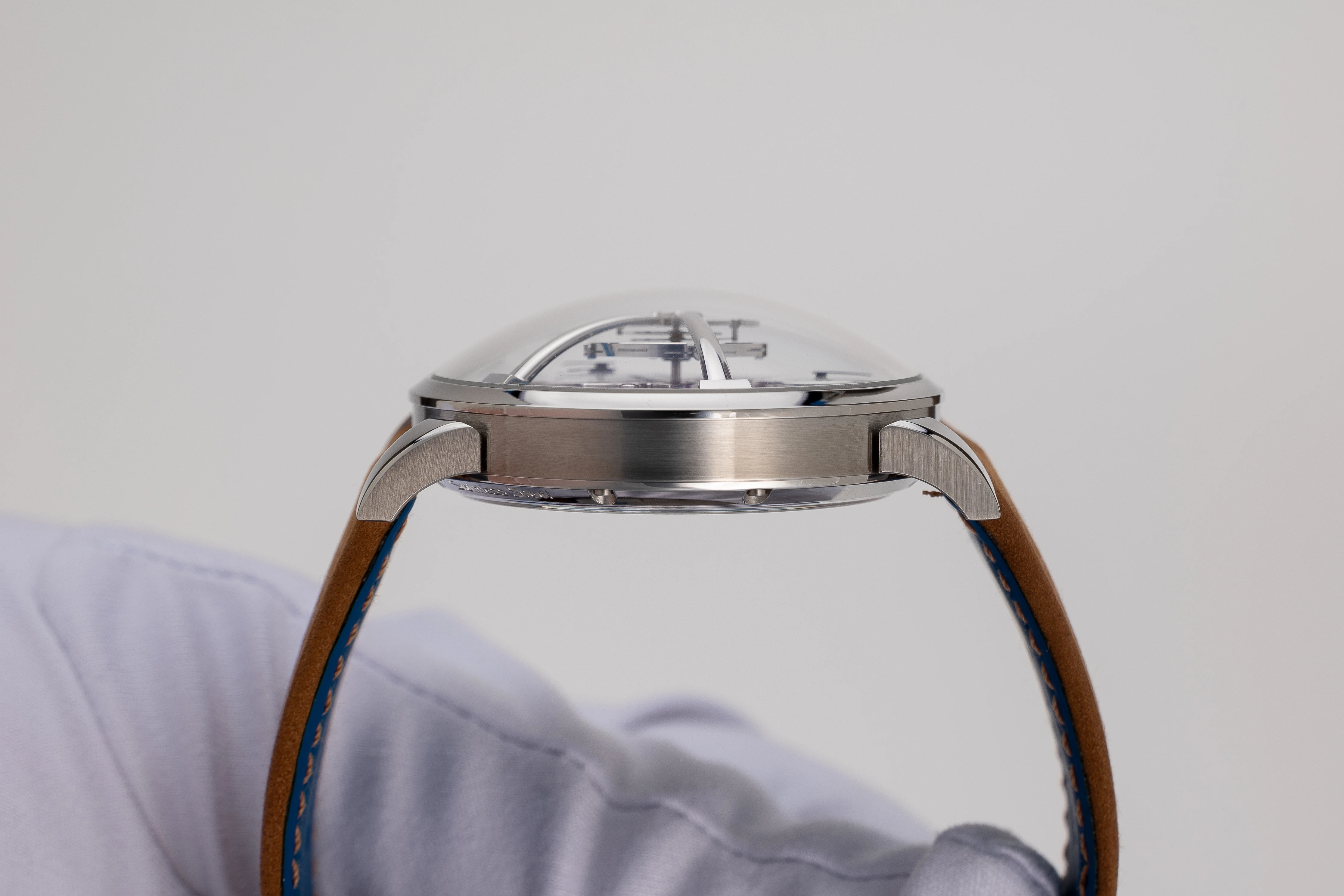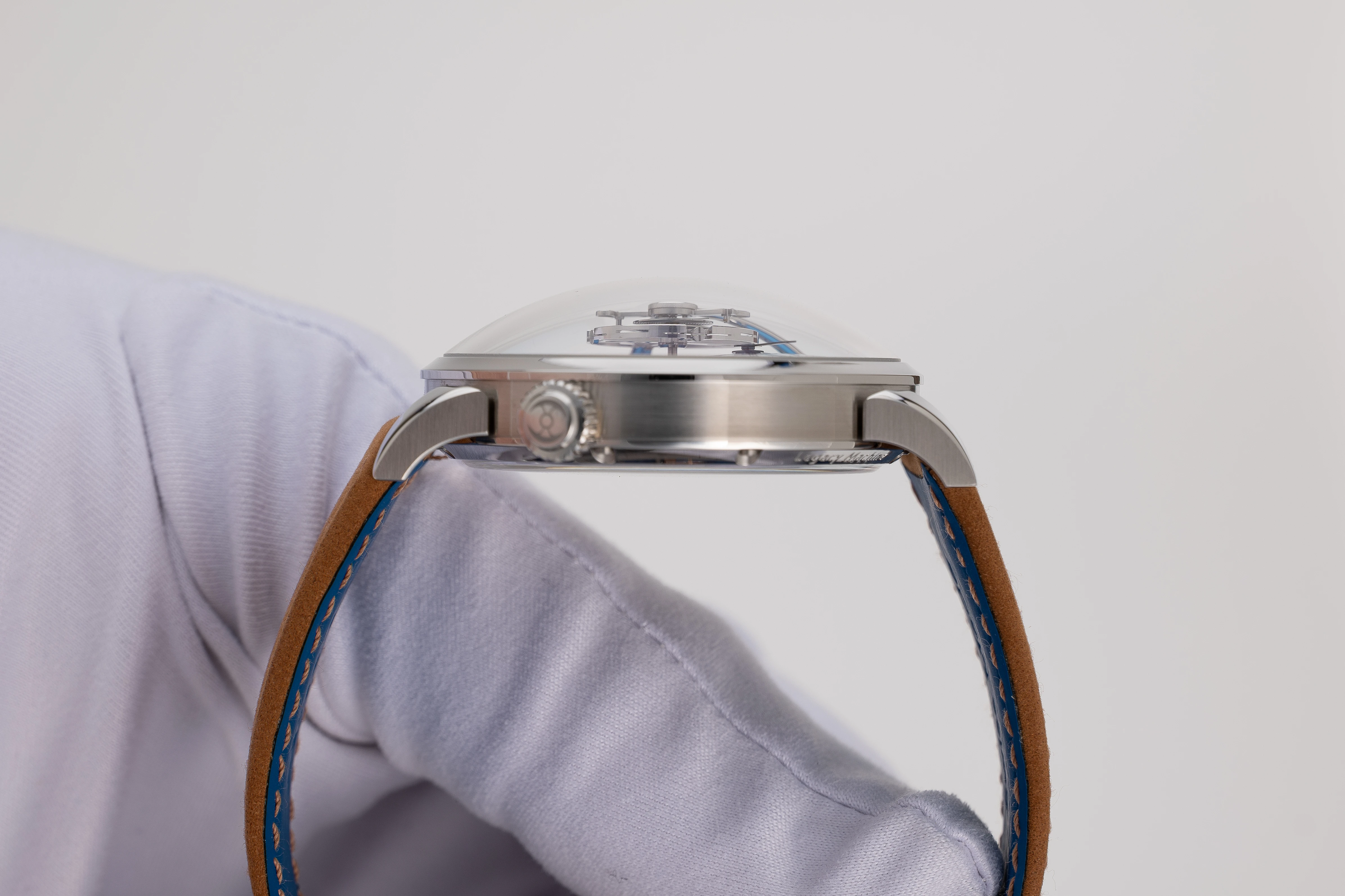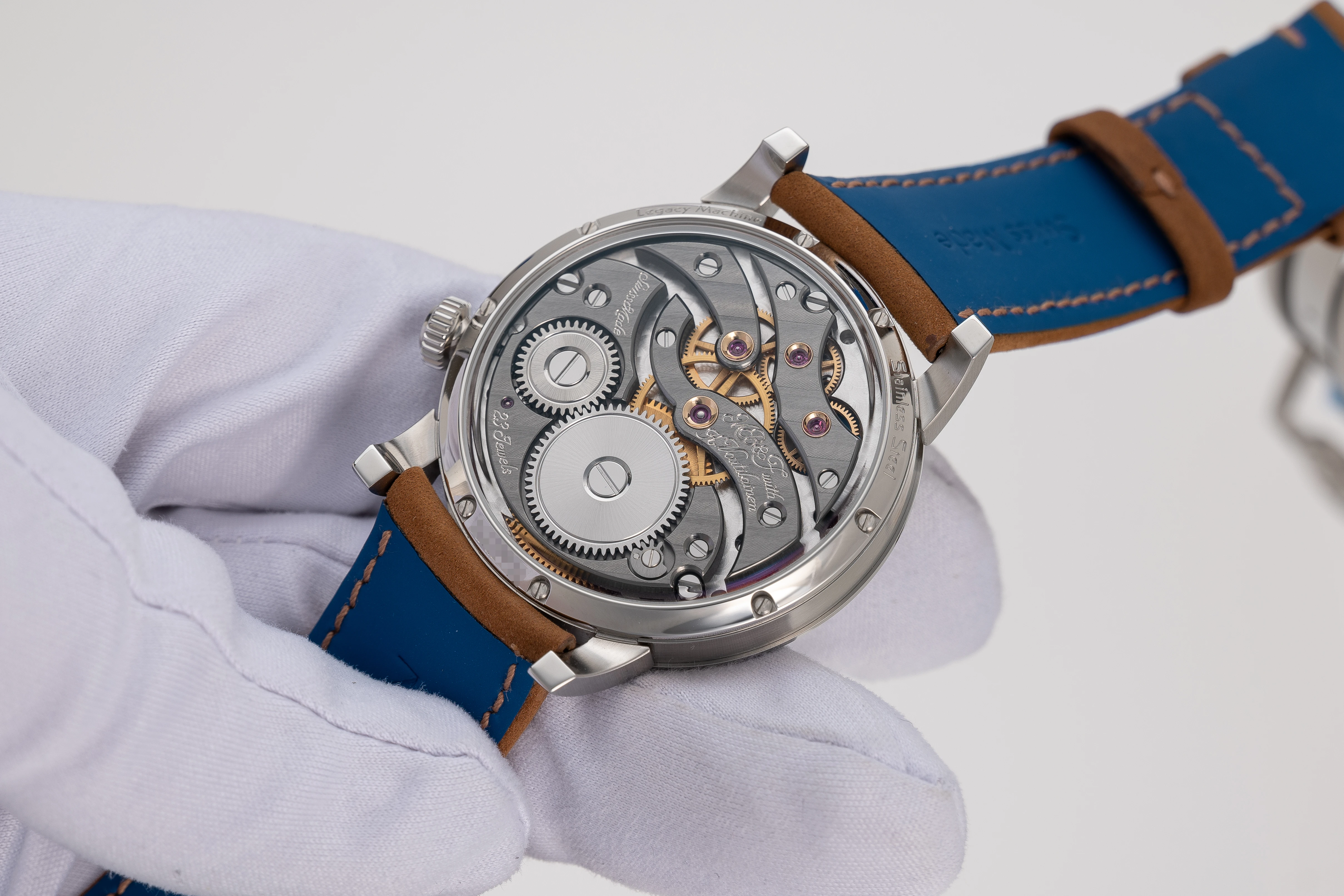The LM101 is one of the most popular among the Legacy Machines and perhaps in the entire MB&F collection, although Maximilian Büsser recalled that initially, when this watch came out, no one wanted to buy it and it was their worst selling machine for many years. The situation changed when the brand released a version in palladium with a greenish-grey dial, which sold out almost immediately. And after this release, the LM101 became a highly sought-after design. This is reflected in the number of versions that have been released since 2014: 14 editions in total, nine of which are limited editions. Originally, in 2014, the Legacy Machine 101 was available in 18k white gold with a black sunburst dial (the present example) or in 18k rose gold with a silver-grey dial. In 2015, two frosted editions were released in 18k rose gold (33 pieces) and 18k yellow gold (18 pieces) as well as the LM101 Limited Edition for Hodinkee in stainless steel with a brown sunburst dial (10 pieces), which was supplemented a year later, in 2016, by a version in platinum 950 with a blue dial (33 pieces). The famous palladium version with a greenish-grey dial (18 pieces) was introduced in 2019. In 2020, the line continued in collaboration with H. Moser & Cie.: 4 limited editions LM101 MB&F x H. Moser of 15 pieces each in stainless steel were released with fumé dials in Funky Blue, Red, Cosmic Green and an Aqua Blue edition exclusively for Ahmed Seddiqi & Sons. These editions are characterized by a 'concept' design without dial markings and a fumé dial - both typical of H. Moser & Cie. and a Straumann double hairspring produced by the same brand. In 2021, the series was expanded with three new editions: in 18k white gold with a purple dial, in 18k rose gold with a dark blue dial and in stainless steel with a light blue dial, all with a Straumann double hairspring.
