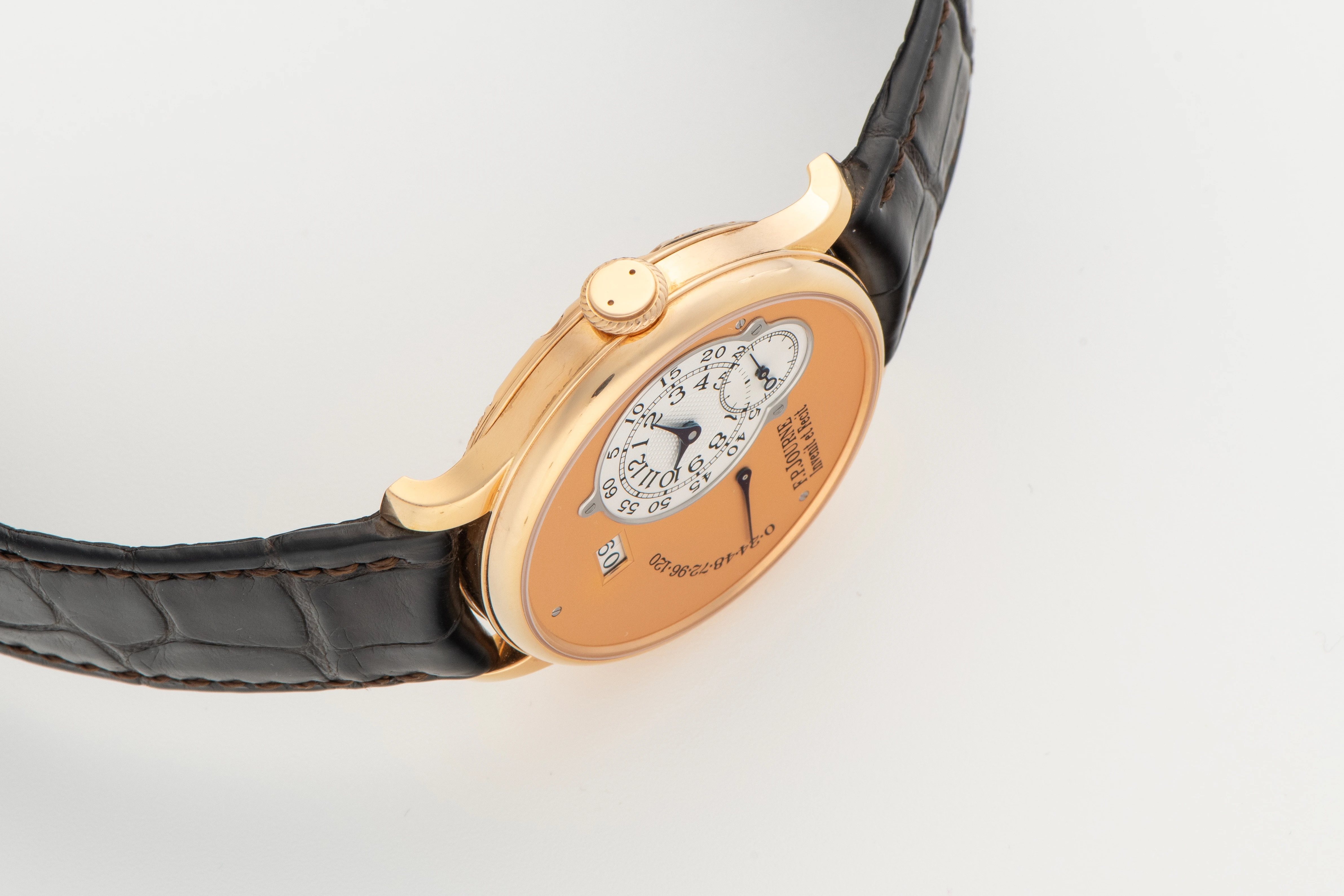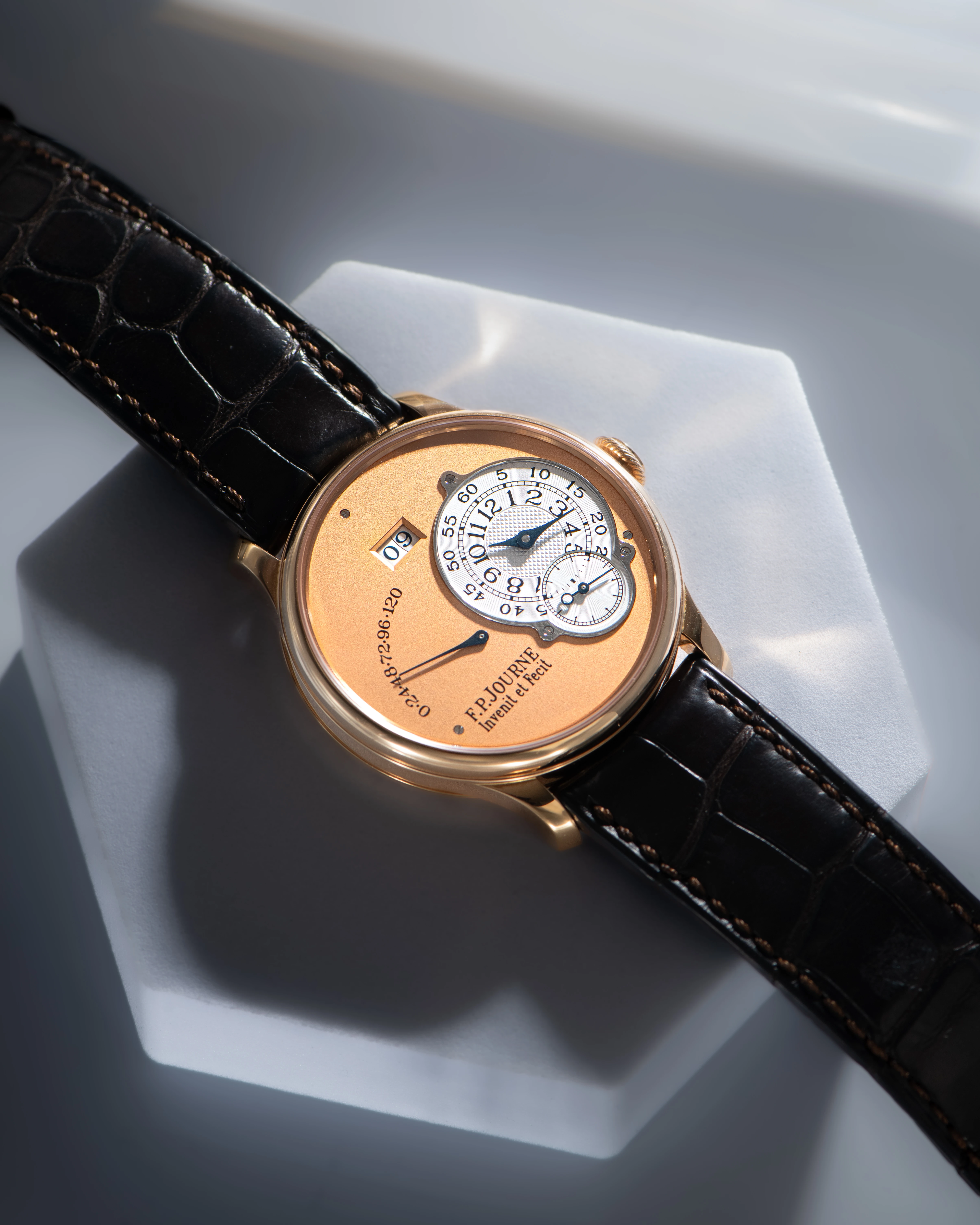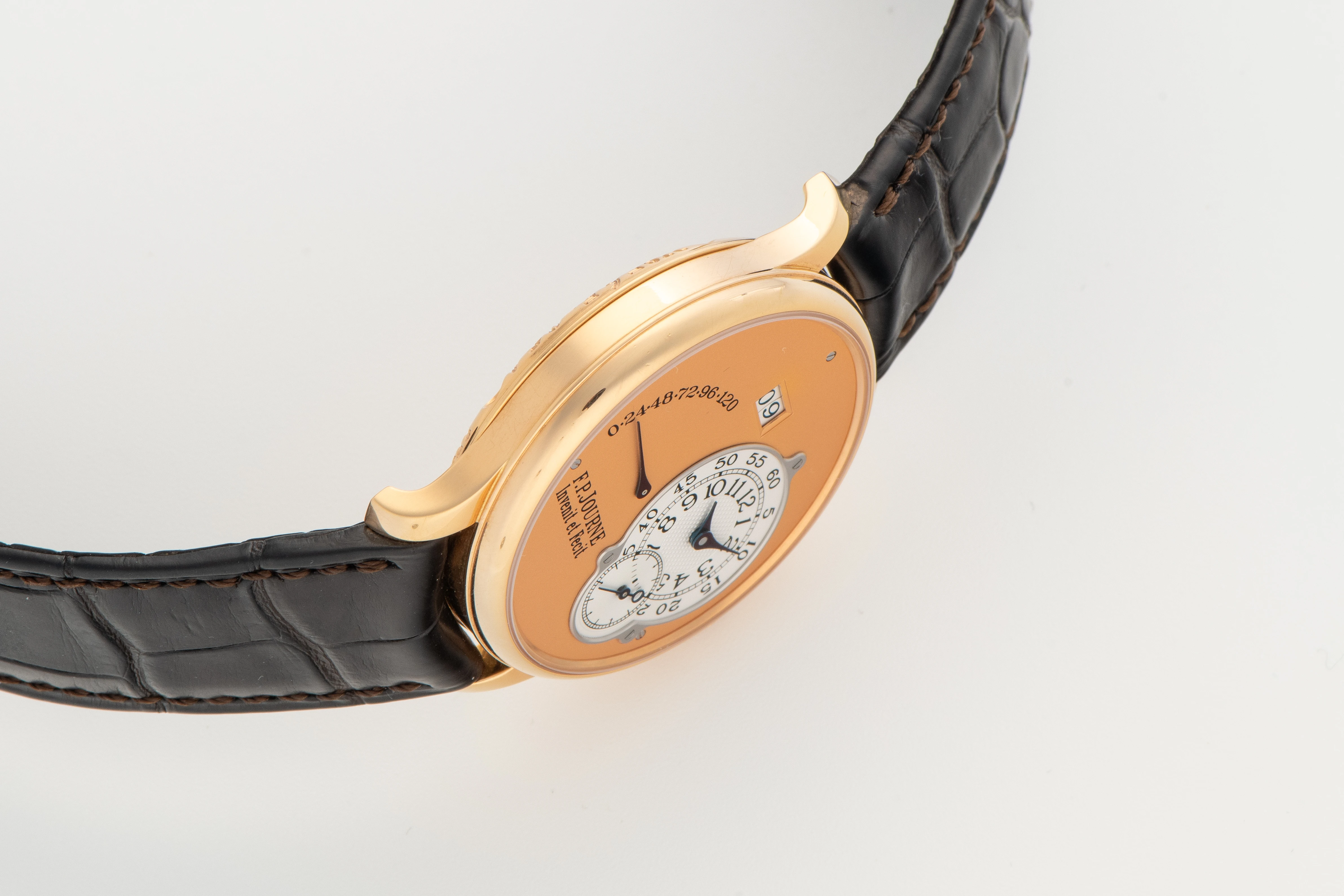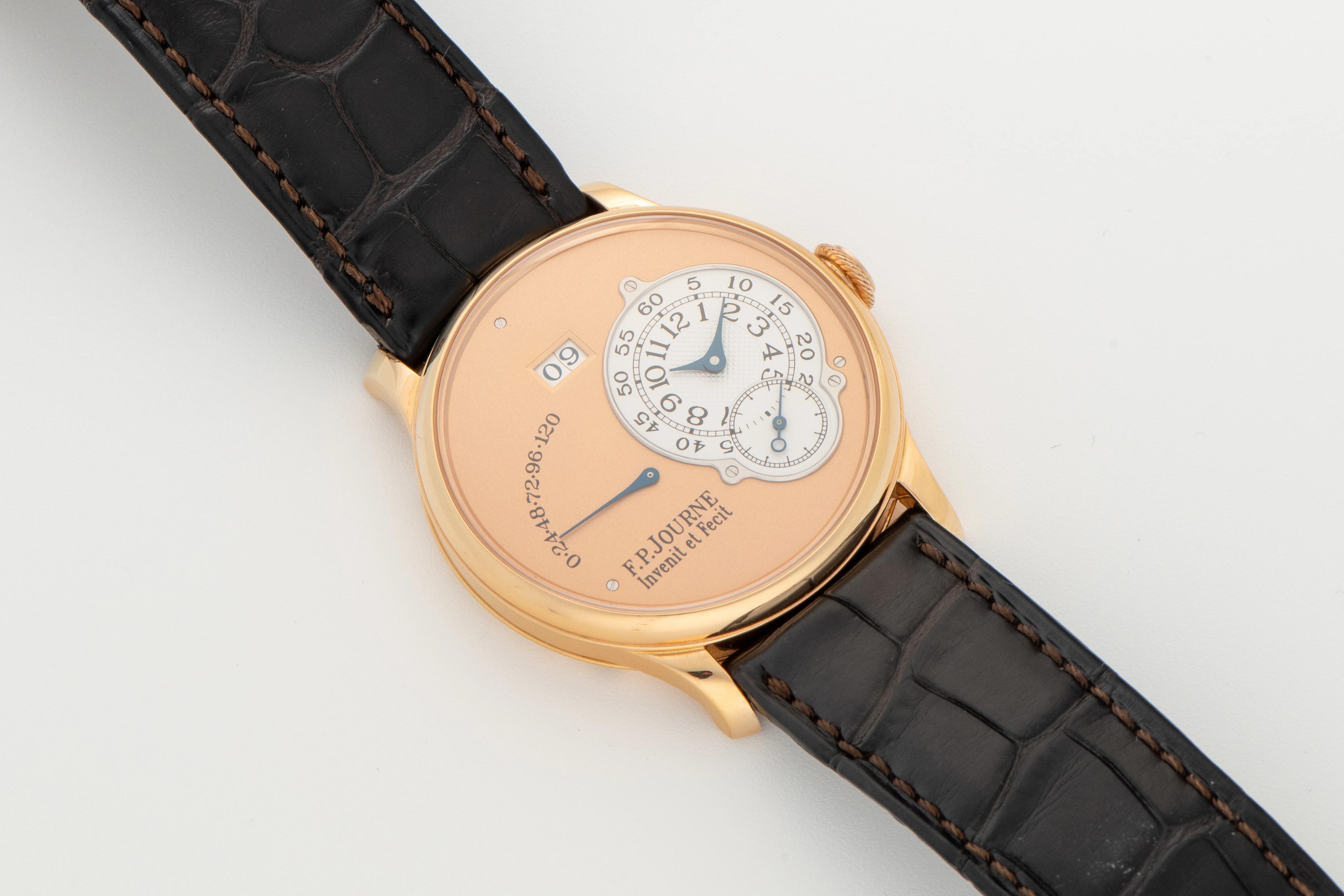 The combination of rose gold case and rose gold dial on this watch from 2005 is quite unusual. It is one of the rarest combinations in François-Paul Journe's collection, as he usually favored high-contrast combinations.