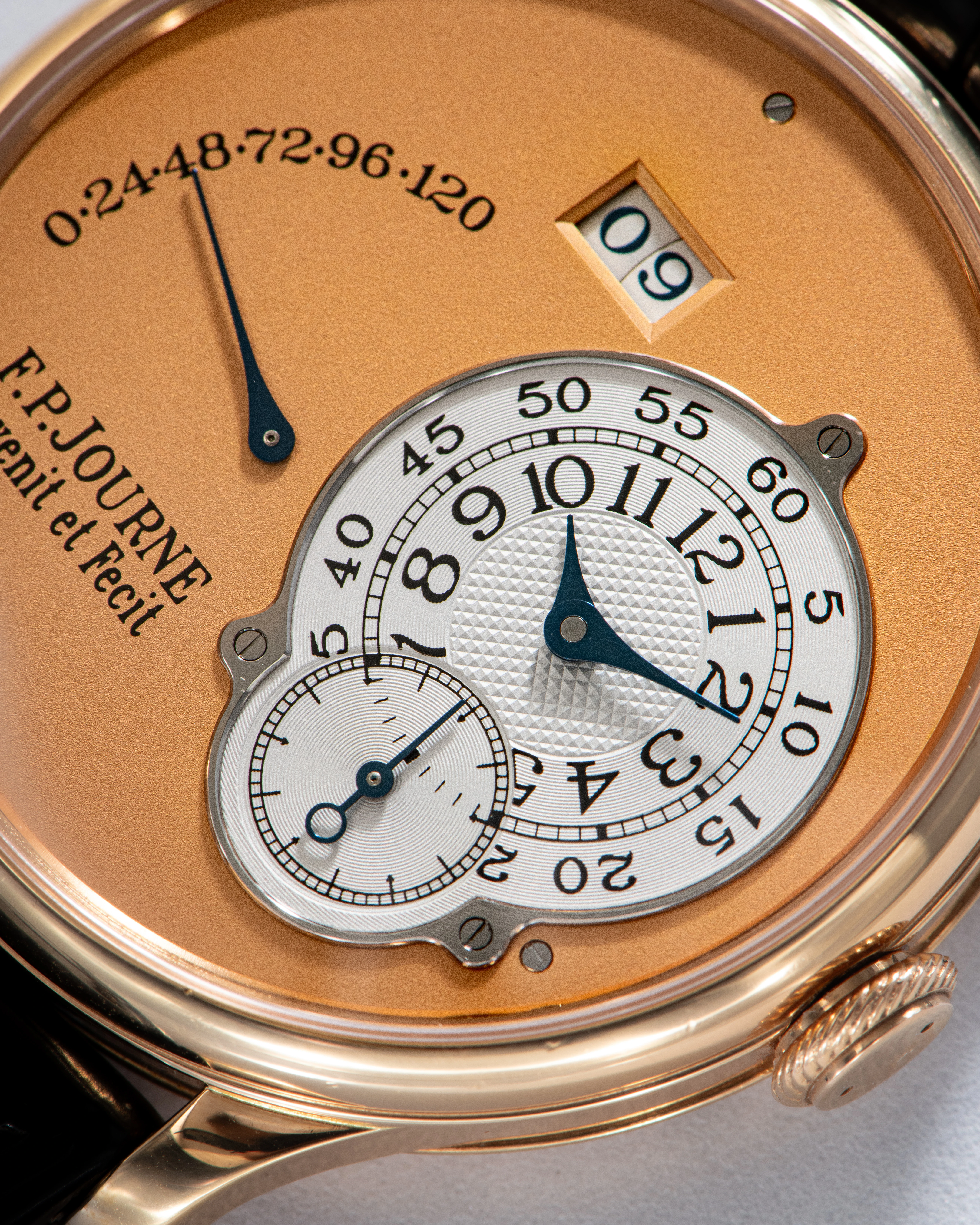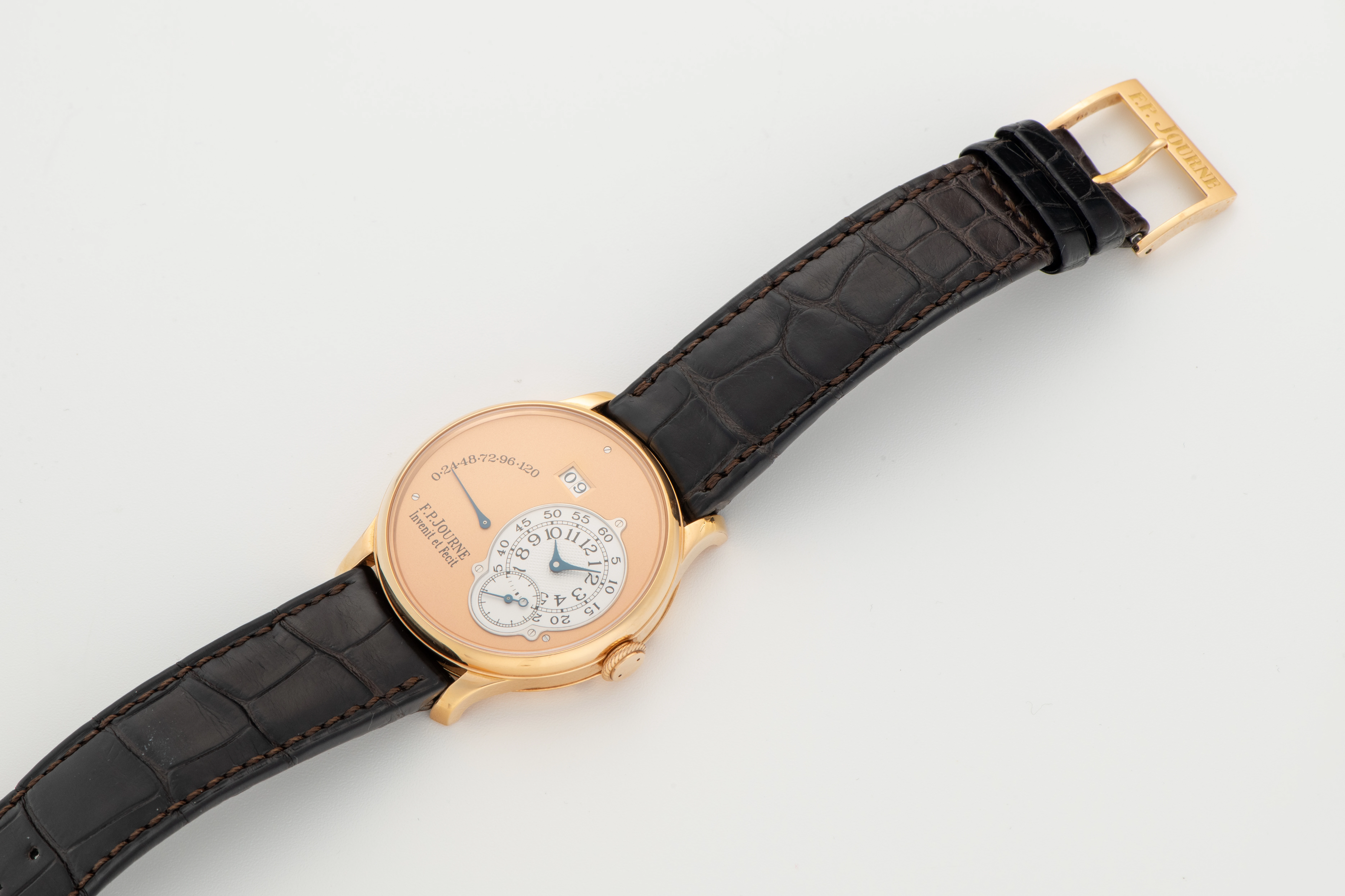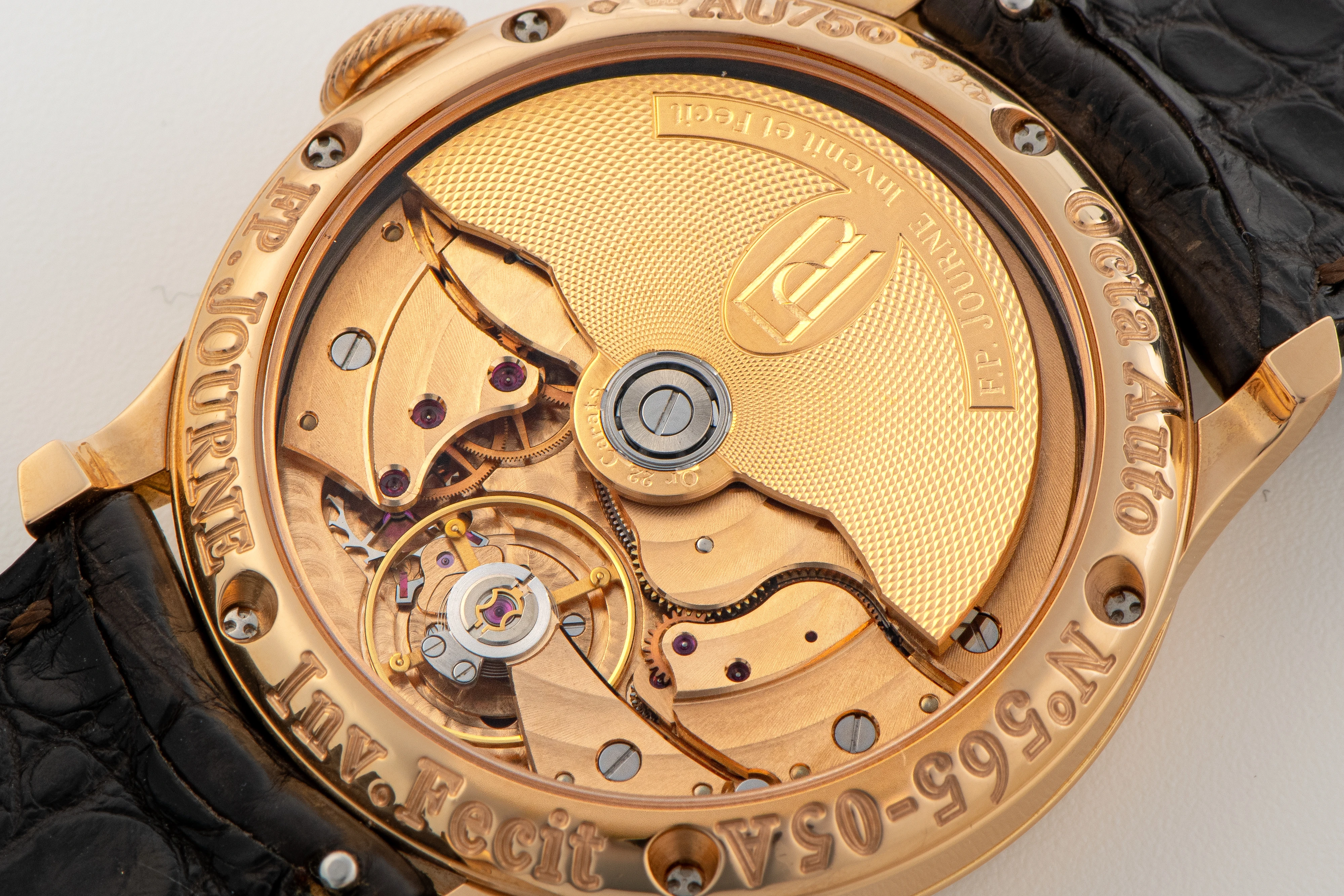 The combination of rose gold case and rose gold dial on this watch from 2005 is quite unusual. It is one of the rarest combinations in François-Paul Journe's collection, as he usually favored high-contrast combinations.