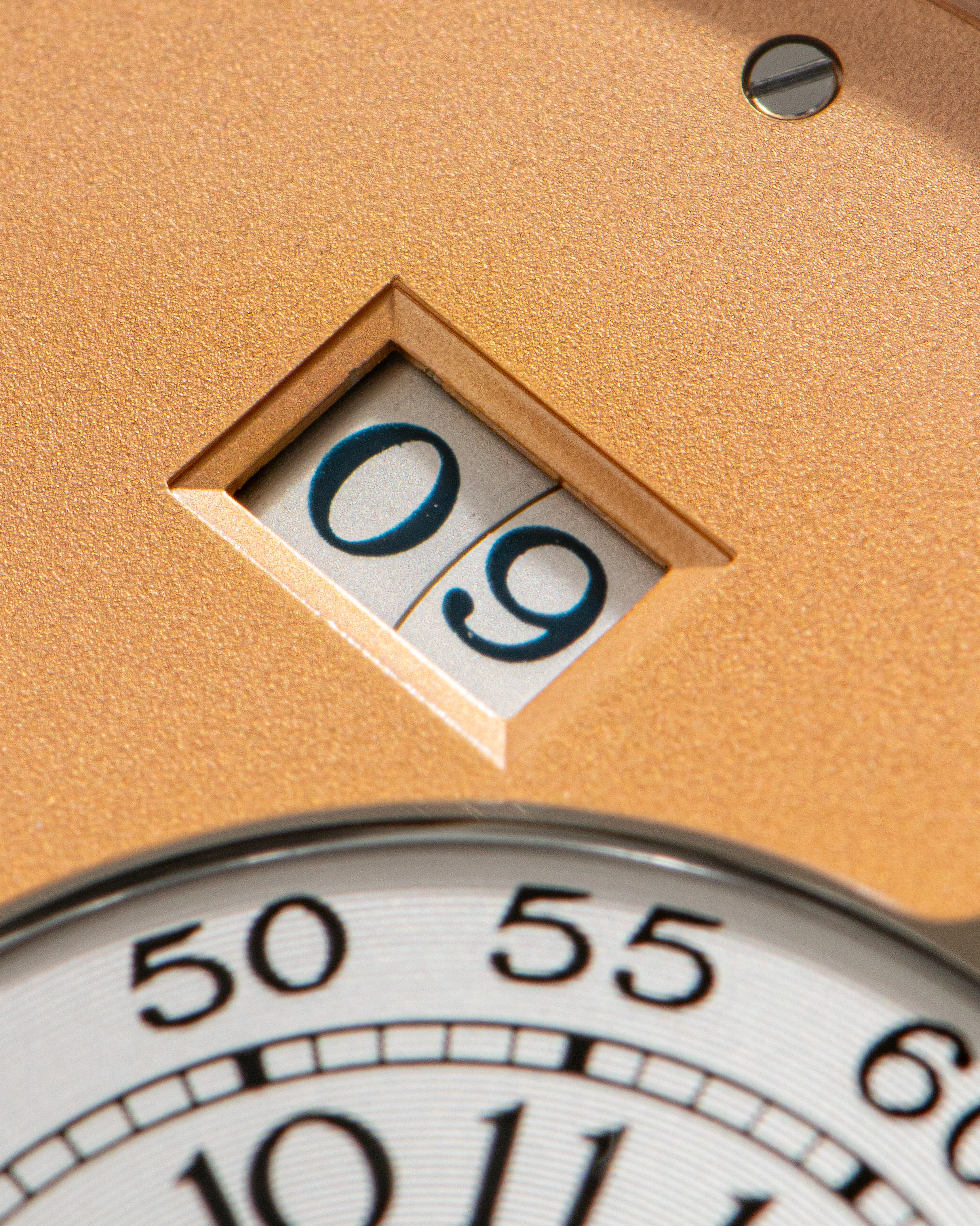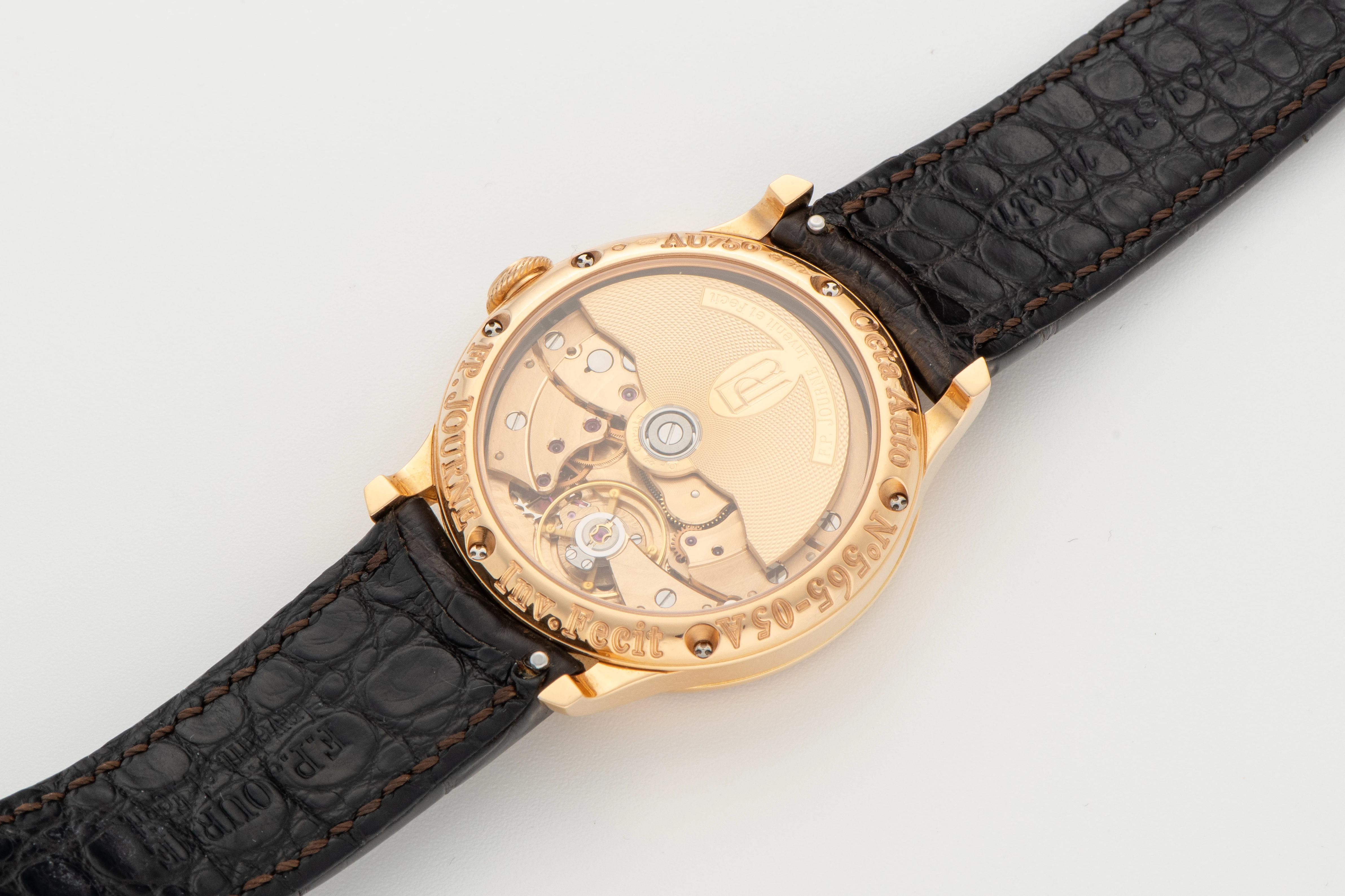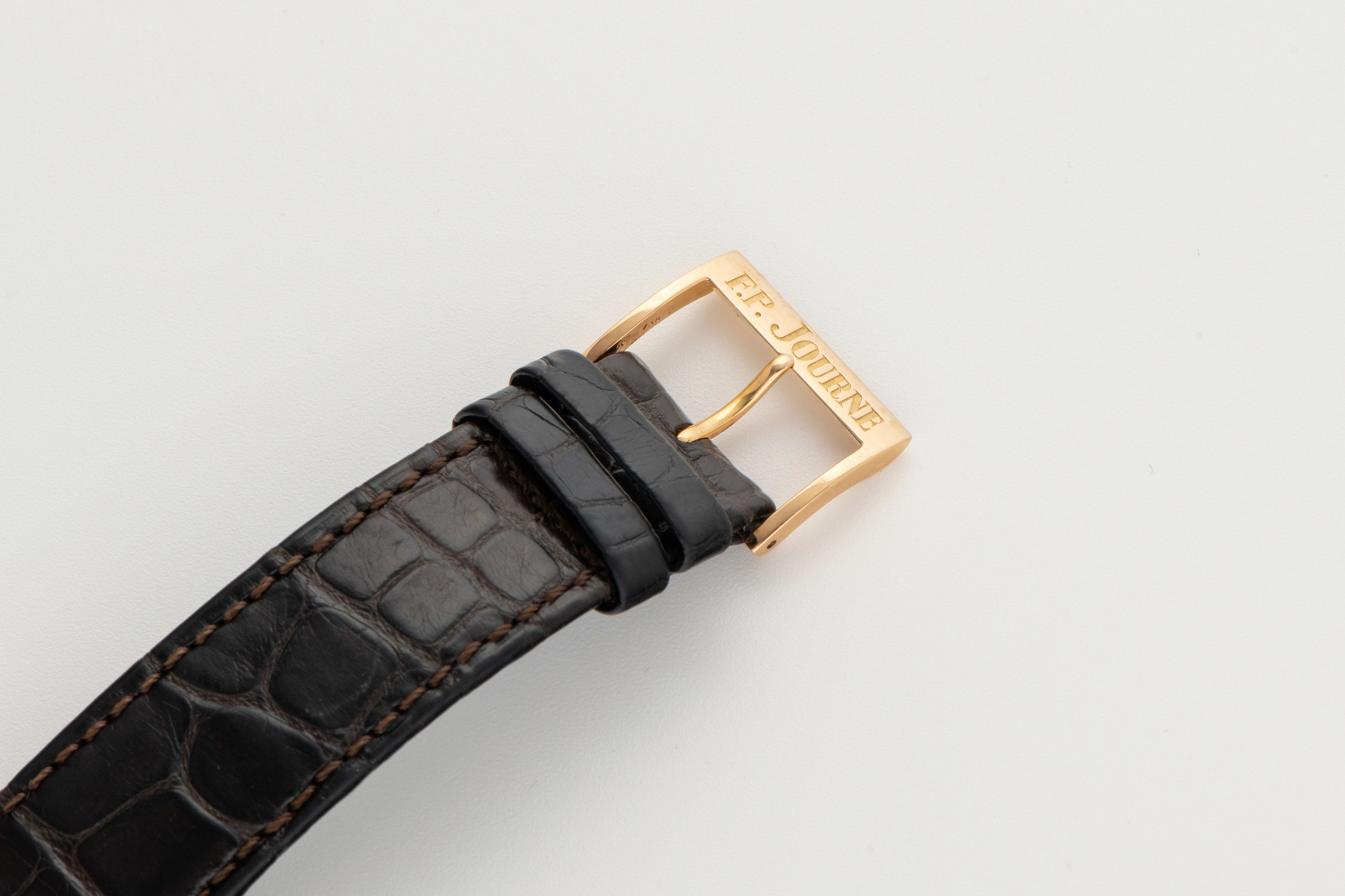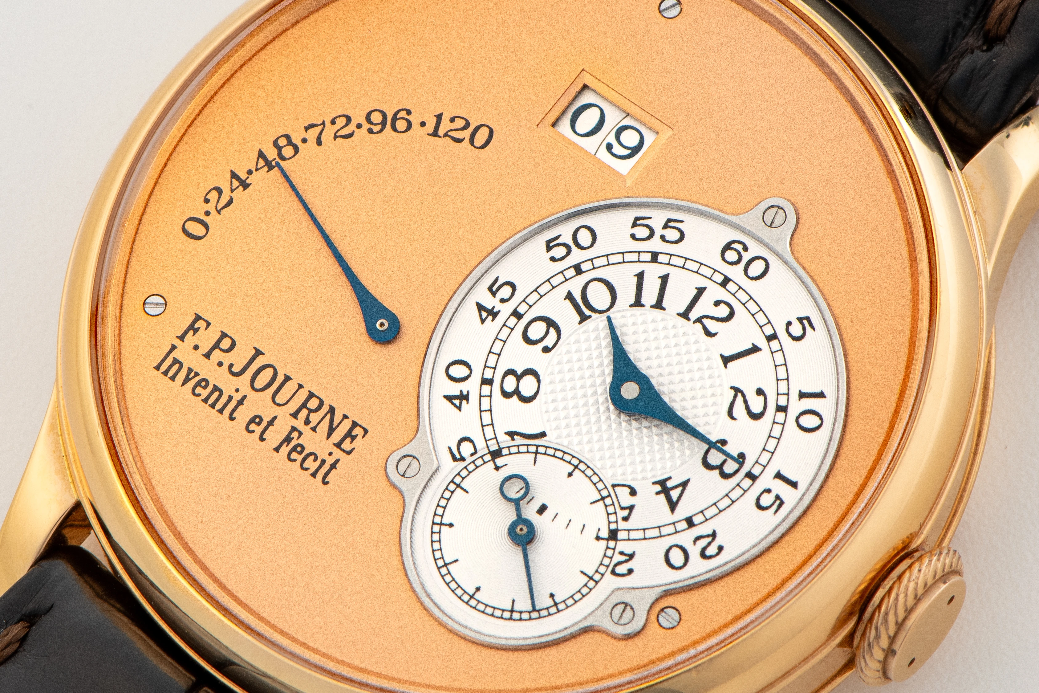 The combination of rose gold case and rose gold dial on this watch from 2005 is quite unusual. It is one of the rarest combinations in François-Paul Journe's collection, as he usually favored high-contrast combinations.