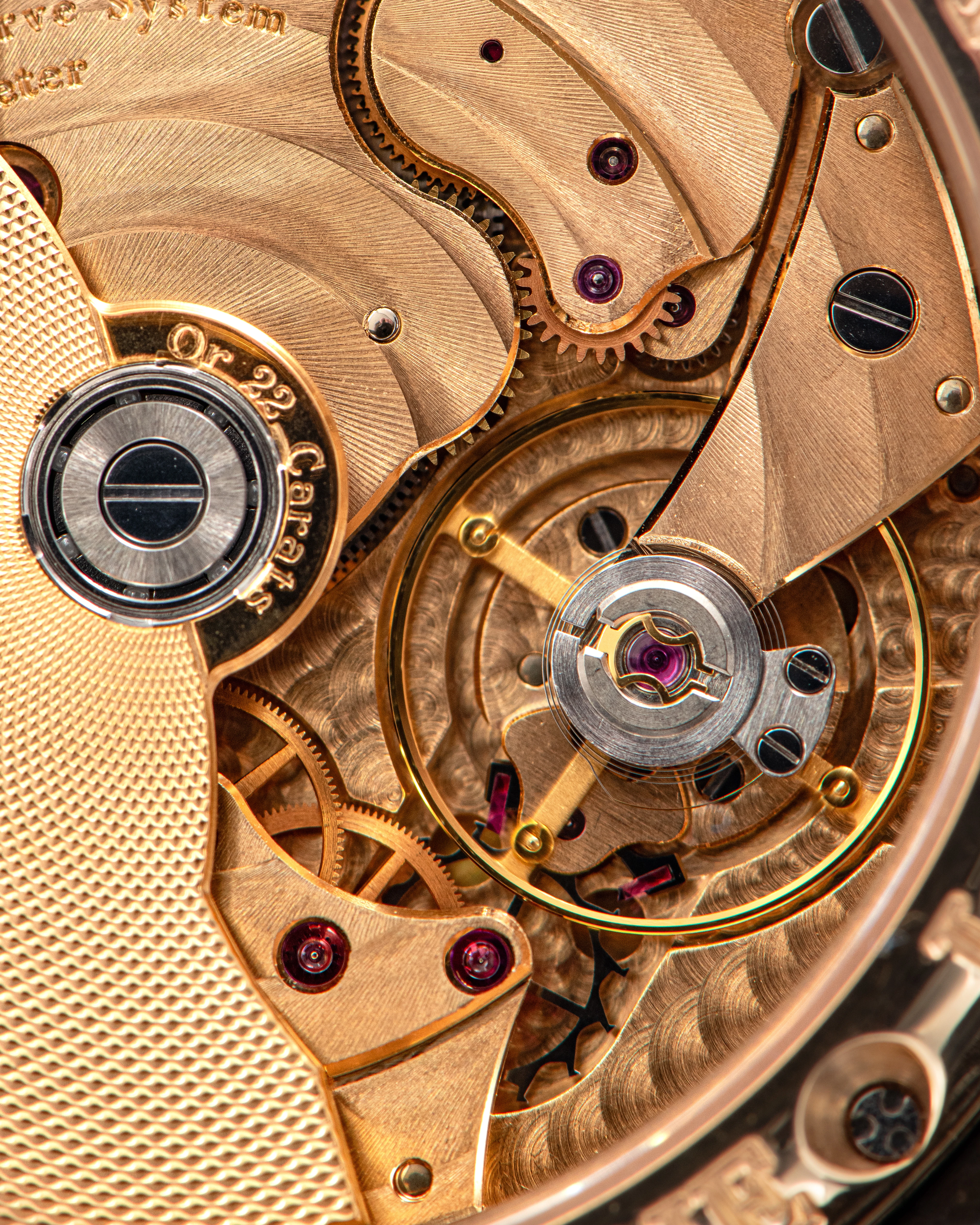 The second-generation Octa Réserve de Marche was available in 38 mm and 40 mm sizes, with dials in white, rose and yellow gold, paired with cases in platinum or rose gold. The asymmetrical design of the dial was a clear sign of the watchmaker’s unmistakable style when the watch was launched and gave not only this watch but also the other models in the Octa collection a unique character. Elaborate dial finishes such as the frosted, textured solid rose gold dial plate, the applied solid silver sub-dial engraved with a guilloché Clous de Paris pattern and fine grooves, the teardrop-shaped Journe hands in blued steel and the Arabic numerals designed by François-Paul Journe himself undoubtedly enhance the appeal of this watch. The rose gold case and the pin buckle contribute to an almost monochrome image that emphasizes the museum-like character typical of F. P. Journe watches.