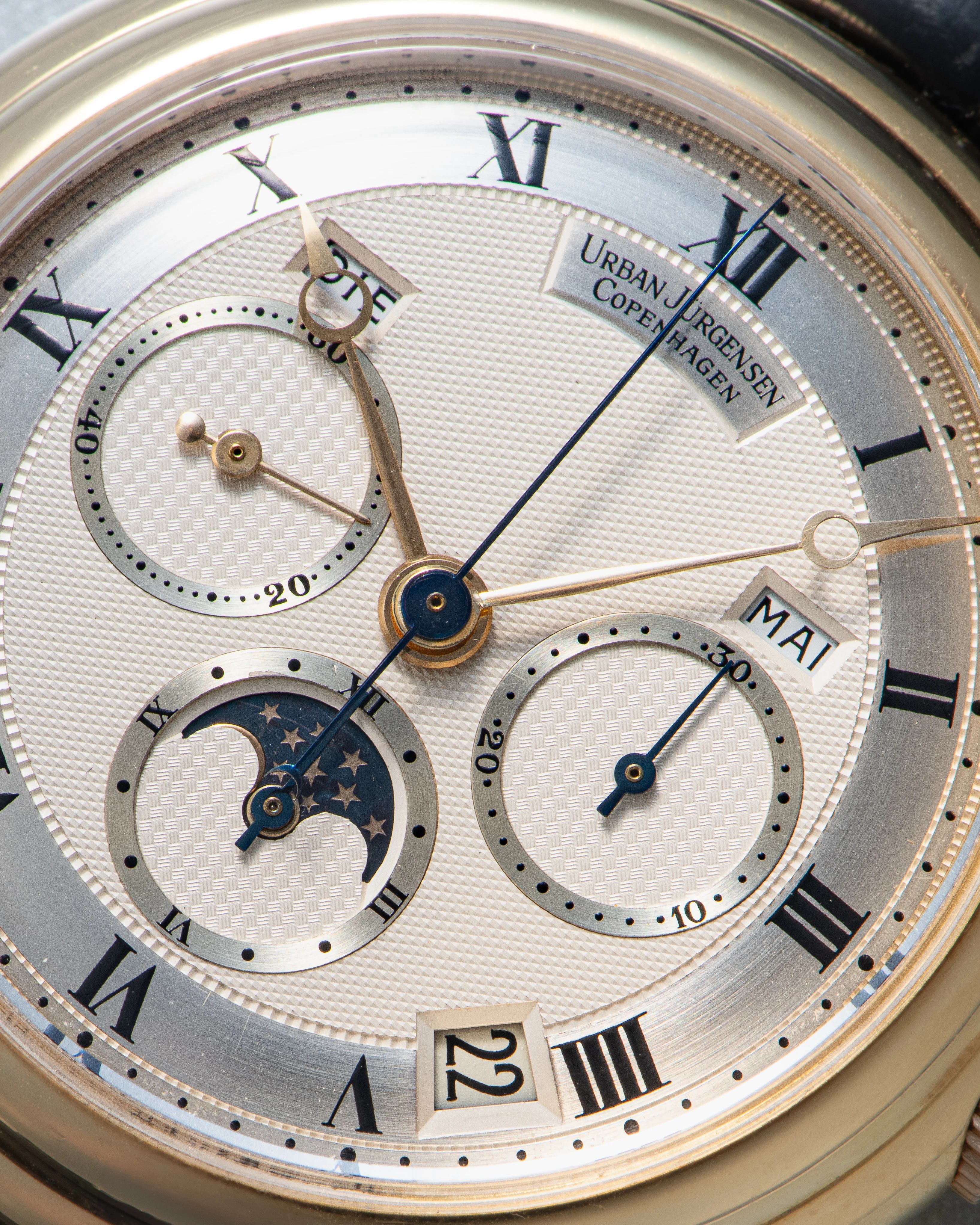 | Movement | Silvered dial, hand engine-turned guilloche motif, signed Urban Jürgensen Copenhagen, blued steel Breguet hour and minute hands, blued steel counter hands, circularly brushed chapter ring and outlines of counters, black Roman numerals, small seconds at 9 o’clock, 30-minute counter at 3 o’clock, 12-hour counter and moonphase at 6 o’clock, date aperture between 4 and 5 o’clock, month aperture at 2 o’clock, day of the week aperture at 10 o’clock |