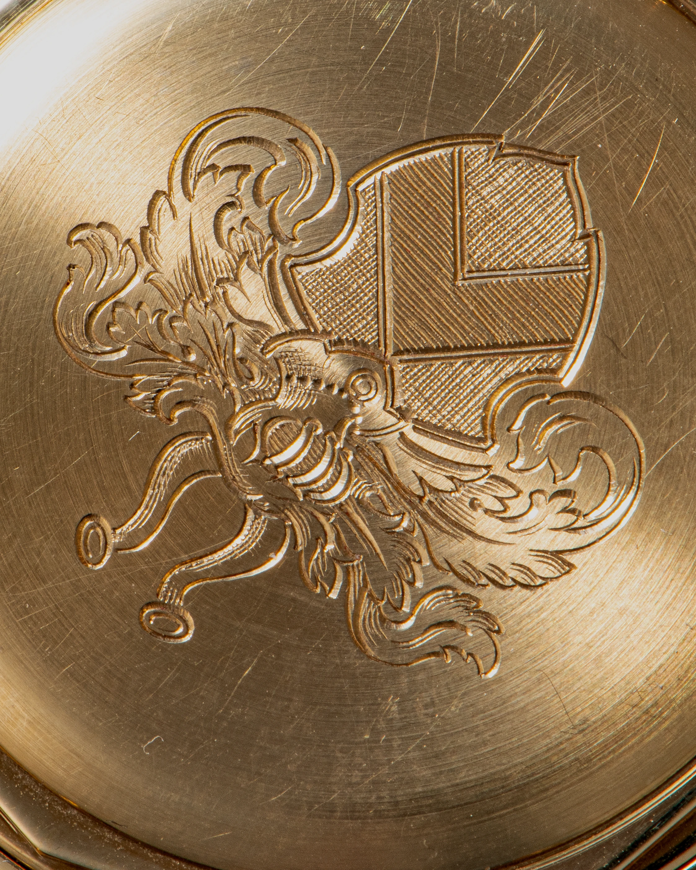 The caseback warrants special attention, featuring meticulous hand-engraving that depicts the family coat of arms in an antique style. This is presumably the original version of the coat of arms of the ancient noble families von Metzsch, originally from Saxon-Meissen-Vogtland, and von Pölnitz, originally from Saxon-Vogtland. These families have been mentioned since the 13th century and share a common origin and, therefore, common heraldic symbols. The coat of arms is described as a silver shield with an azure chevron, a helmet, and an azure and silver mantle, surmounted by azure and silver buffalo horns.