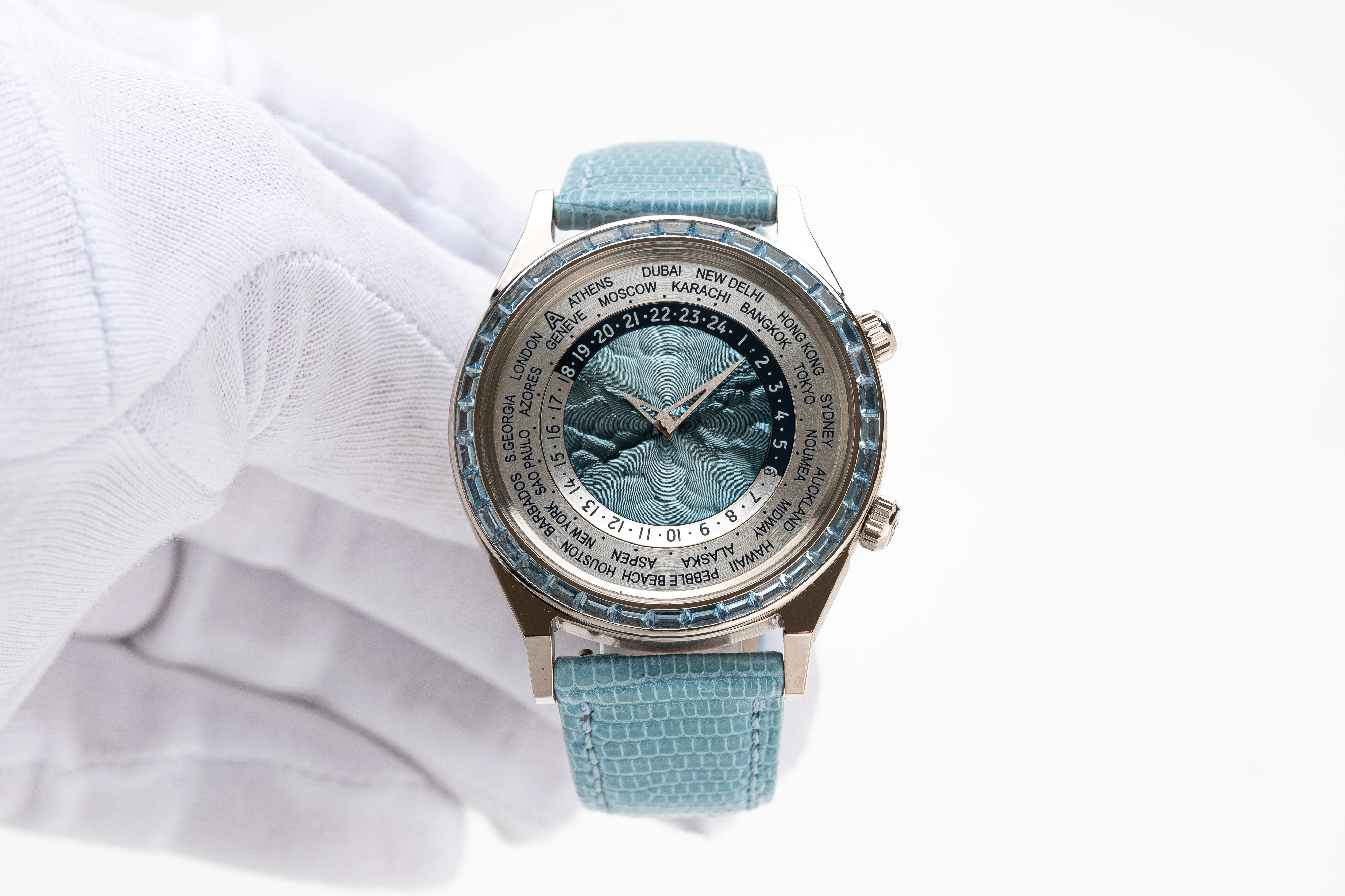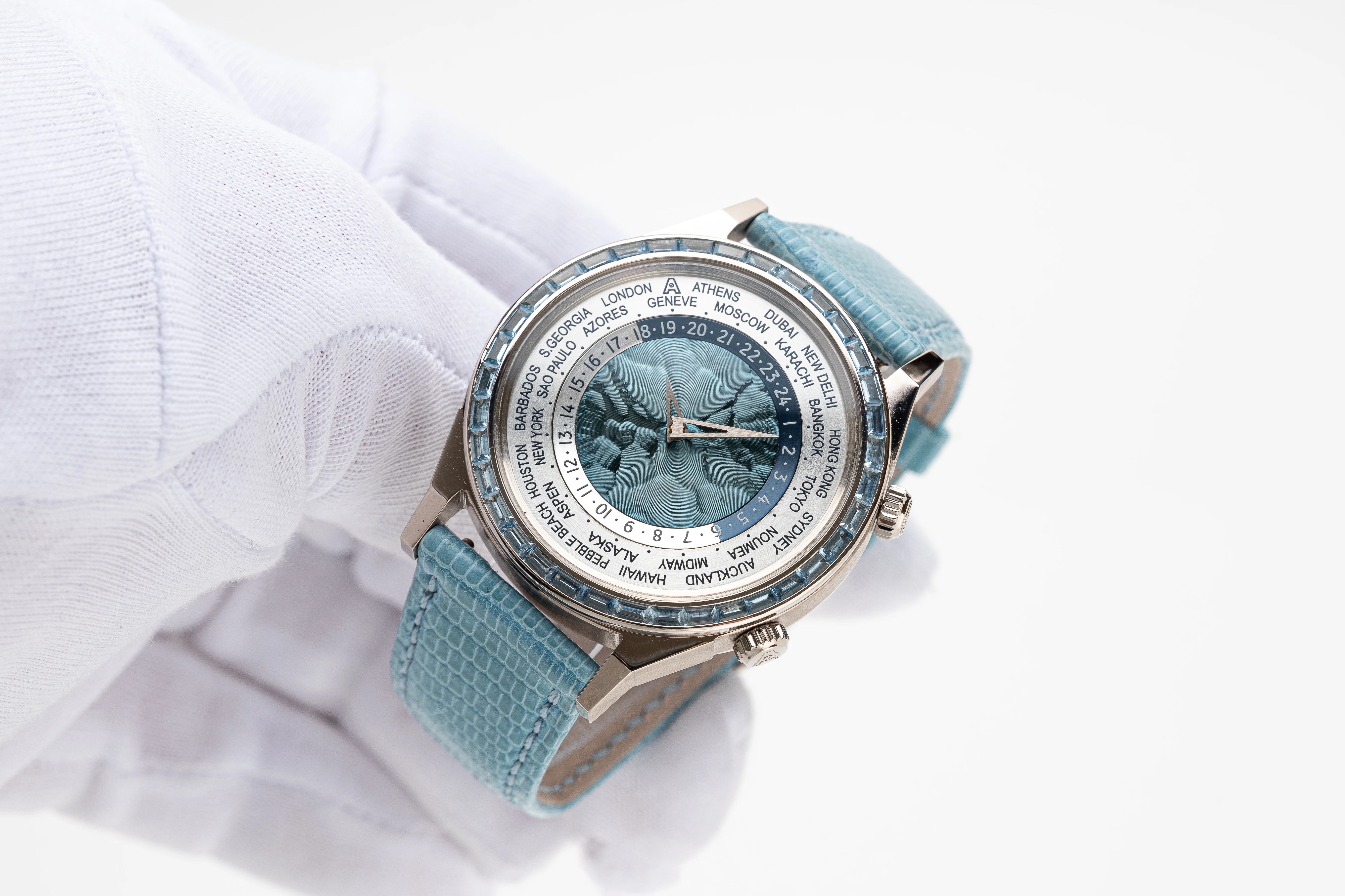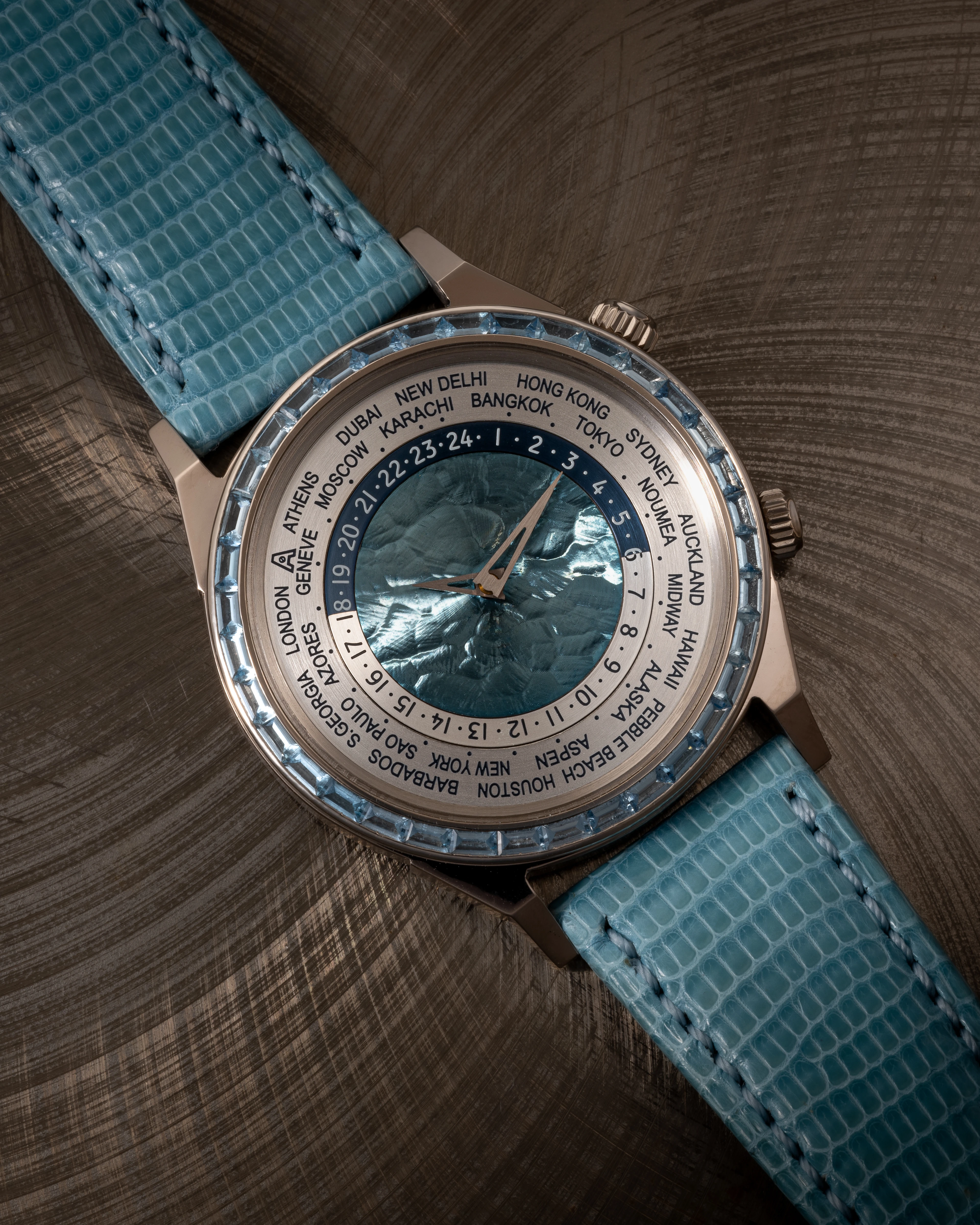 This Tempus Terrae Worldtime Baguettes Aquamarines in white gold was introduced in 2022, while the Tempus Terrae series was originally launched in 2015, for which Svend Andersen developed a new version of the world time watch with two crowns: The crown at 9 o’clock is used to set the world time/home time zone city function, while the crown at 3 o’clock is traditionally used to wind and set the time. The 21-carat blue gold, patented in 1988 by Geneva jeweler Ludwig Müller and used exclusively by Andersen Genève, makes a significant appearance in this watch. It is located in the center of the dial, where it is decorated with a “cloud tapestry “ relief motif, another Andersen Genève exclusive. The self-winding rotor of the automatic watch was produced using the same technique, which creates a play of light very similar to that of the dark blue mother-of-pearl.