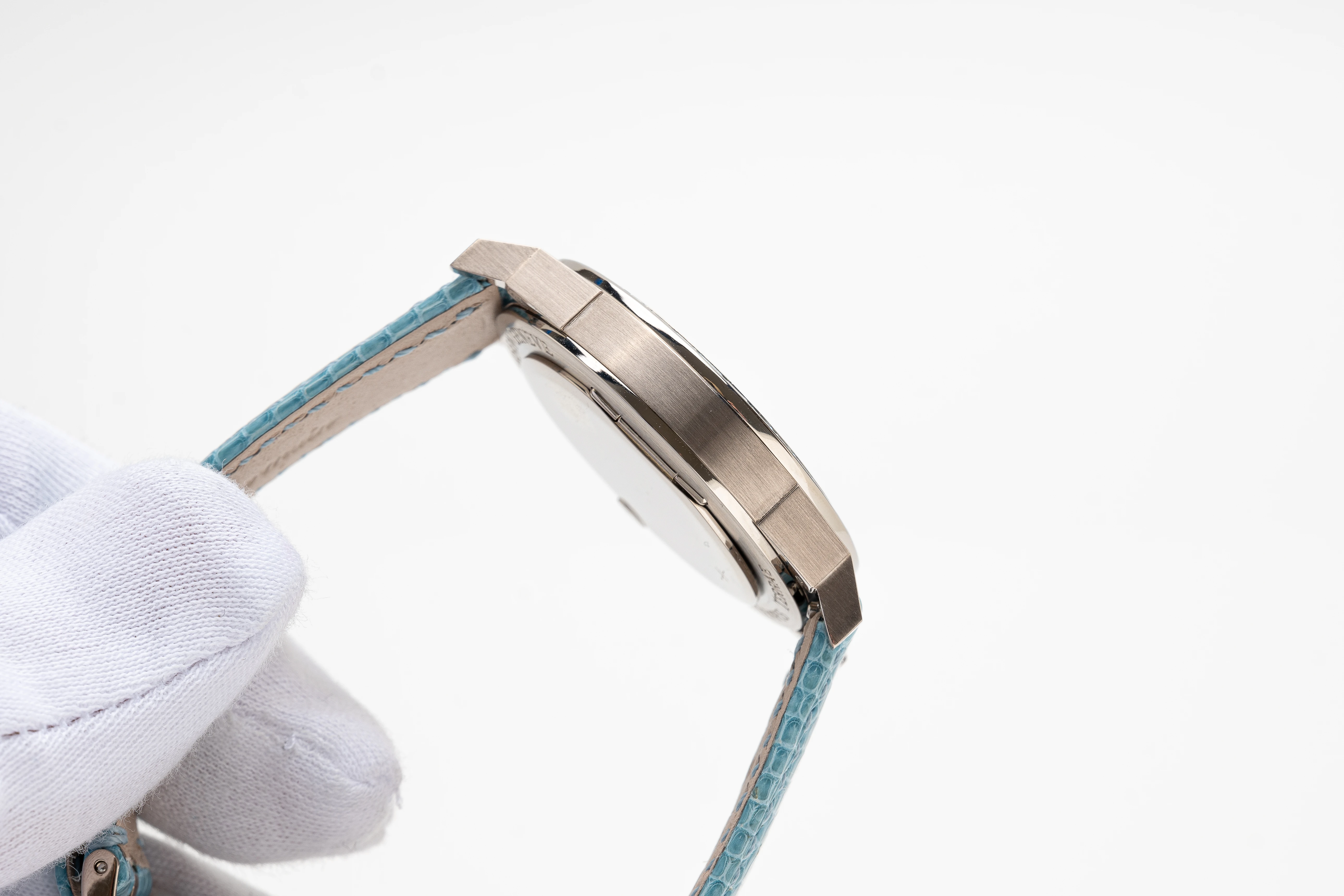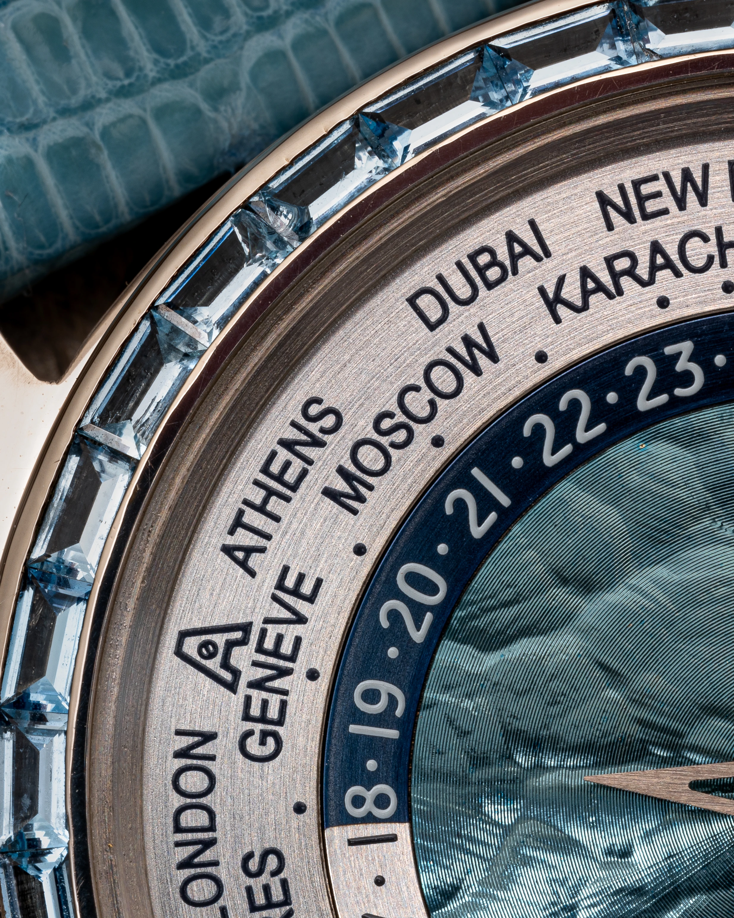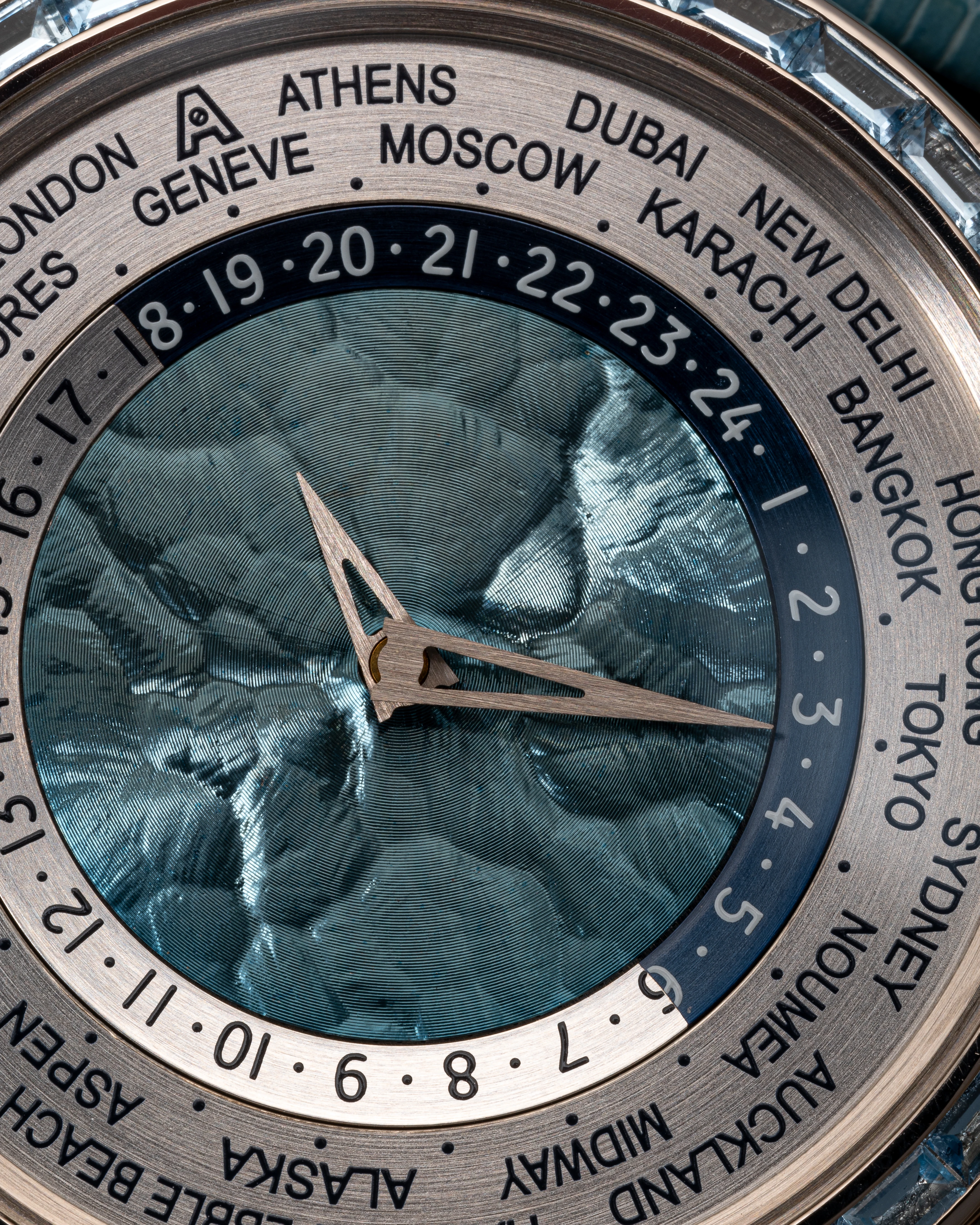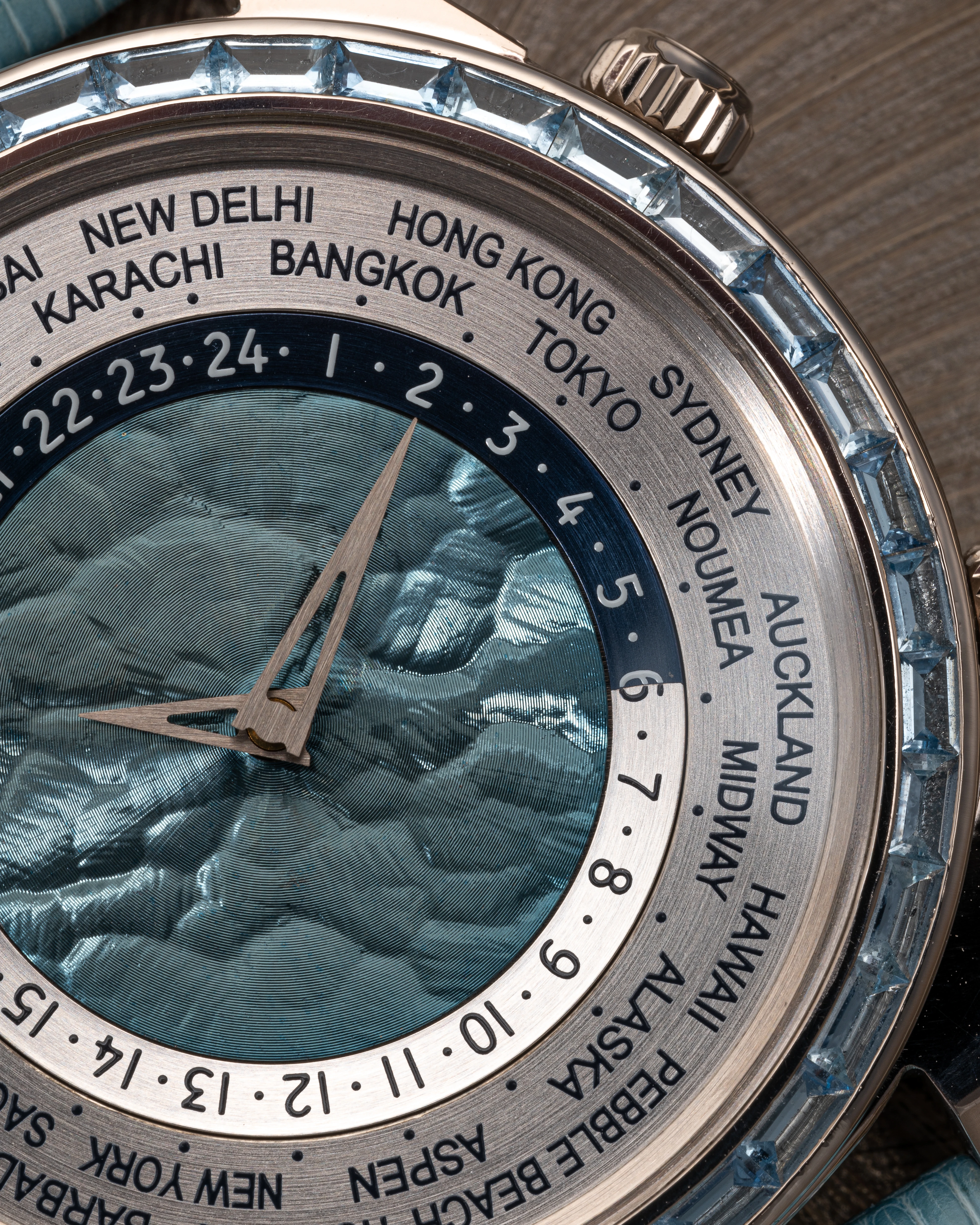 This Tempus Terrae Worldtime Baguettes Aquamarines in white gold was introduced in 2022, while the Tempus Terrae series was originally launched in 2015, for which Svend Andersen developed a new version of the world time watch with two crowns: The crown at 9 o’clock is used to set the world time/home time zone city function, while the crown at 3 o’clock is traditionally used to wind and set the time. The 21-carat blue gold, patented in 1988 by Geneva jeweler Ludwig Müller and used exclusively by Andersen Genève, makes a significant appearance in this watch. It is located in the center of the dial, where it is decorated with a “cloud tapestry “ relief motif, another Andersen Genève exclusive. The self-winding rotor of the automatic watch was produced using the same technique, which creates a play of light very similar to that of the dark blue mother-of-pearl.