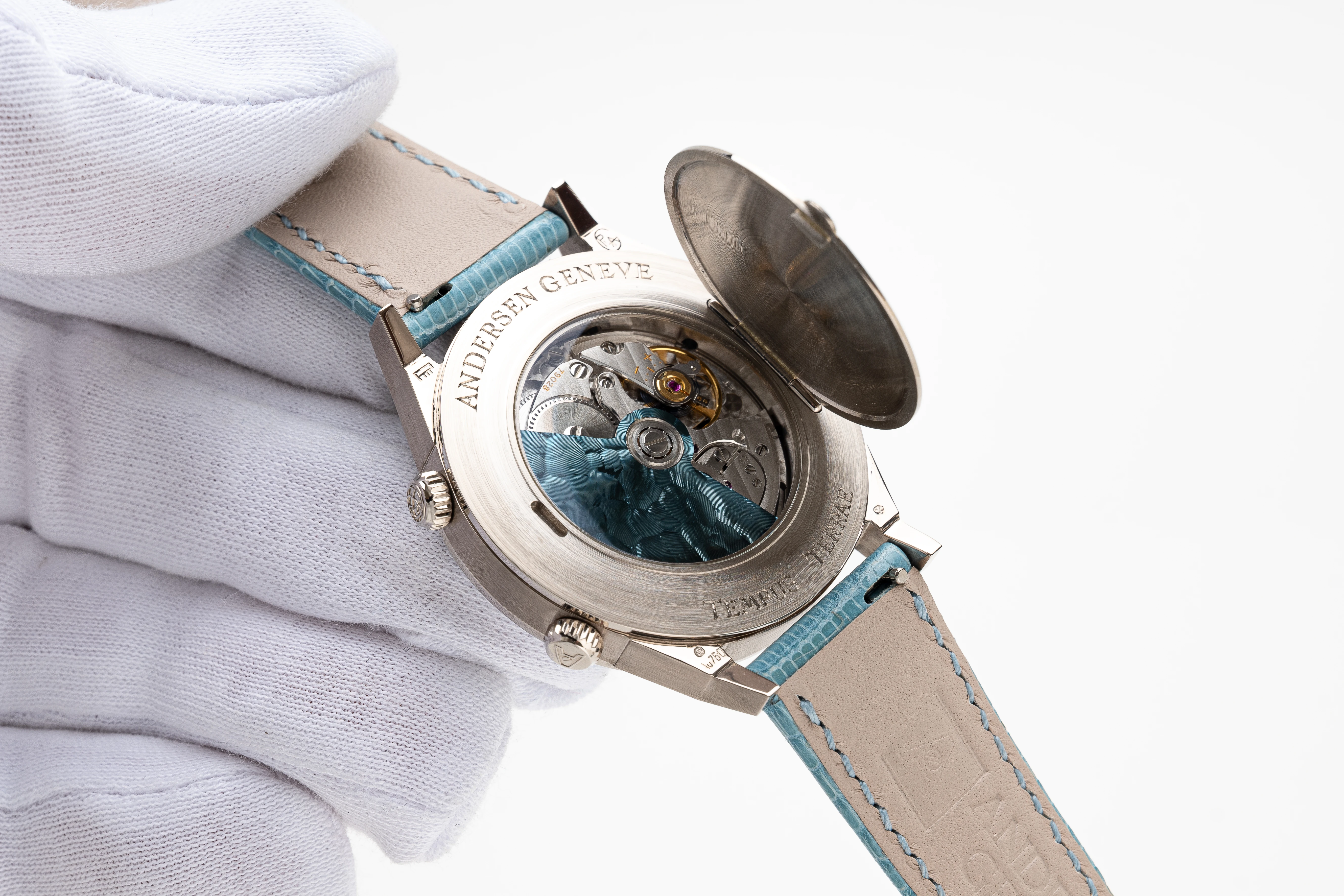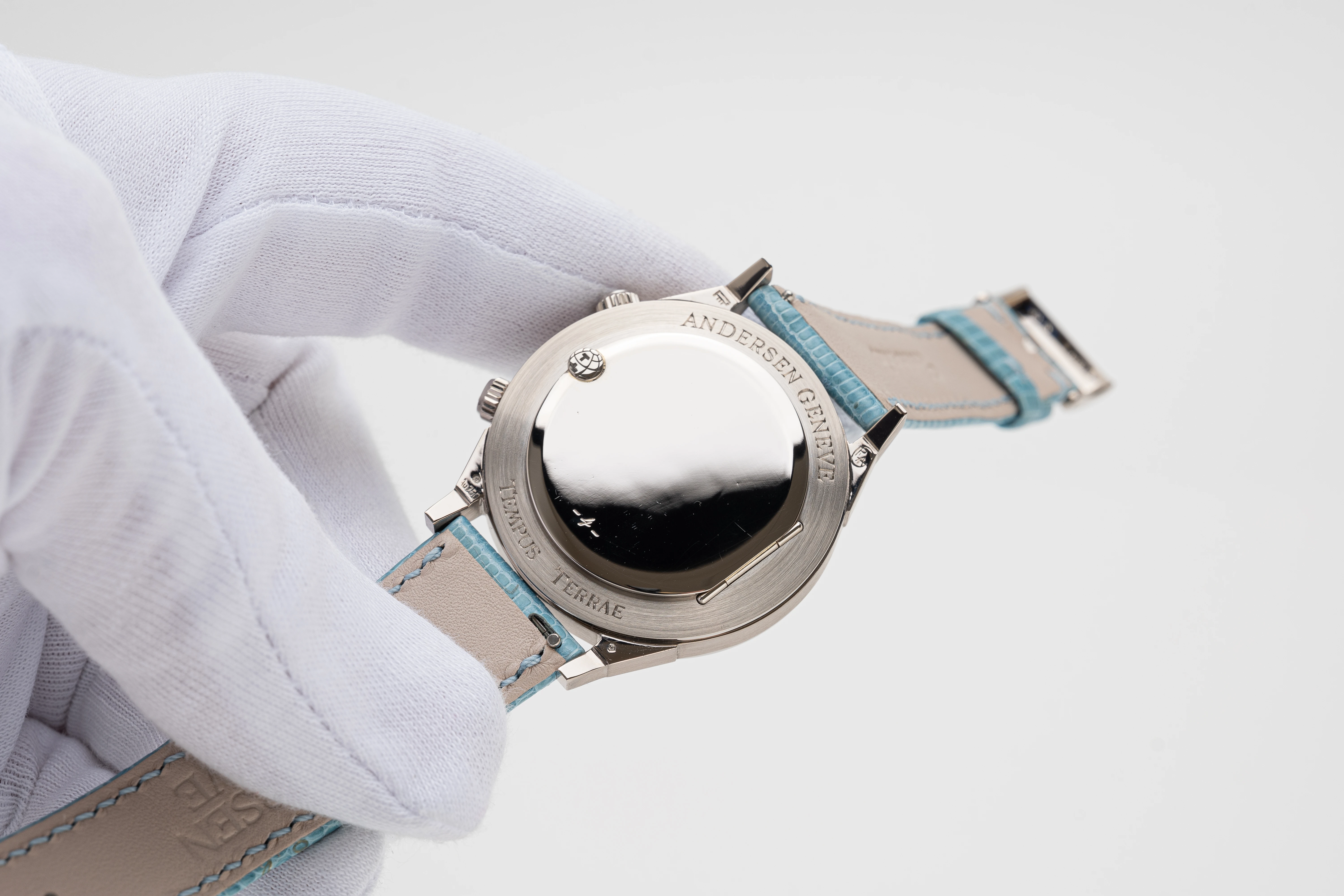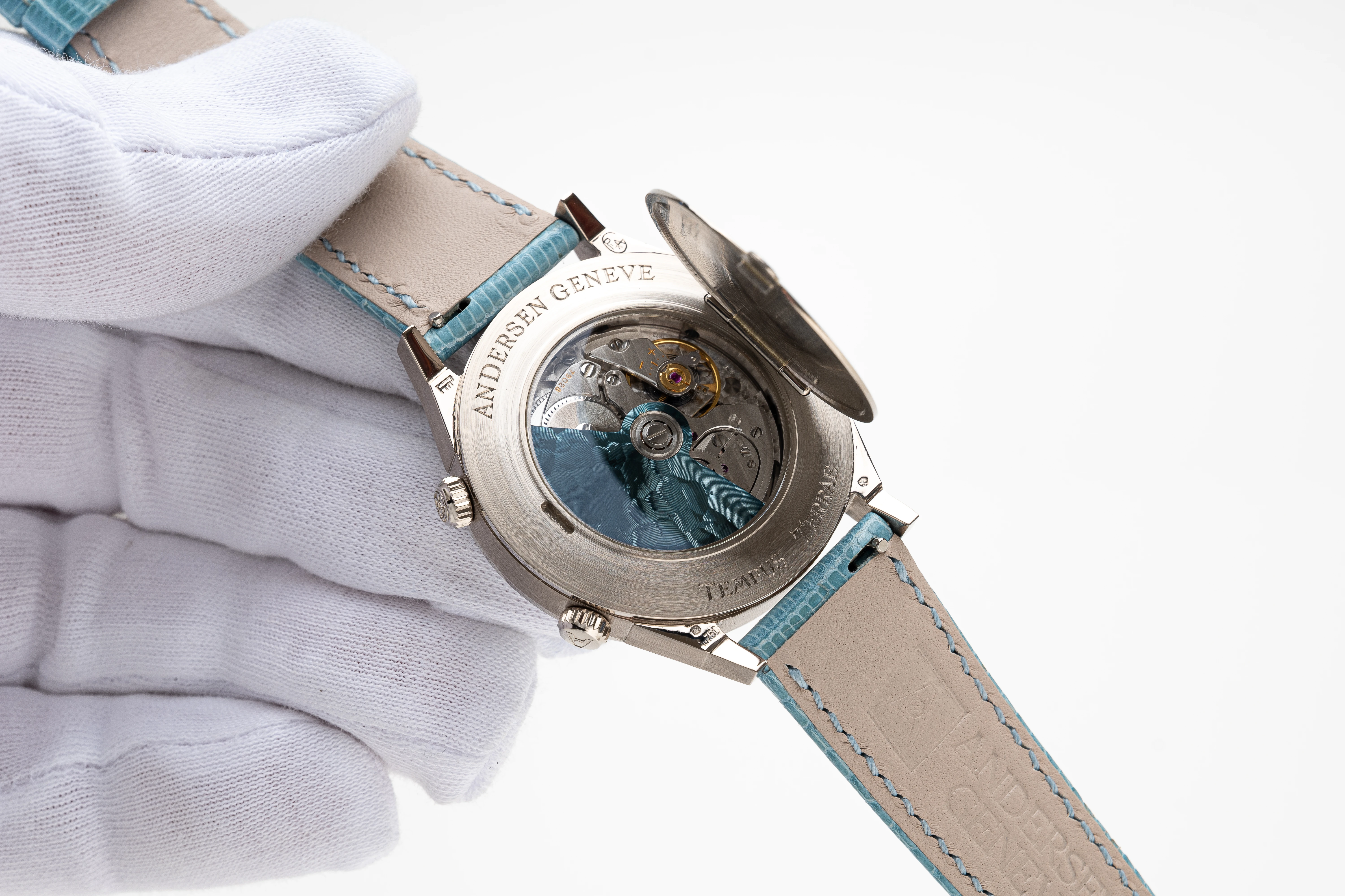 This Andersen Genève Tempus Terrae Worldtime Aquamarines Baguettes in white gold is undoubtedly an extremely rare piece from the Tempus Terrae series, launched in 2022. The series is currently no longer in production, which increases its appeal to collectors. Of all the watches with the Worldtime complication that Svend Andersen has created since 1985, the Tempus Terrea stands out for its particularly valuable design details. These include the 21-carat blue gold dial and automatic rotor, which in this watch is decorated with the “cloud tapestry” relief motif, a unique technique found only on Andersen Genève watches, and the “officer” case back. In addition, the bezel of this watch is set with baguette aquamarines that perfectly complement the blue gold dial – a unique and charismatic combination.