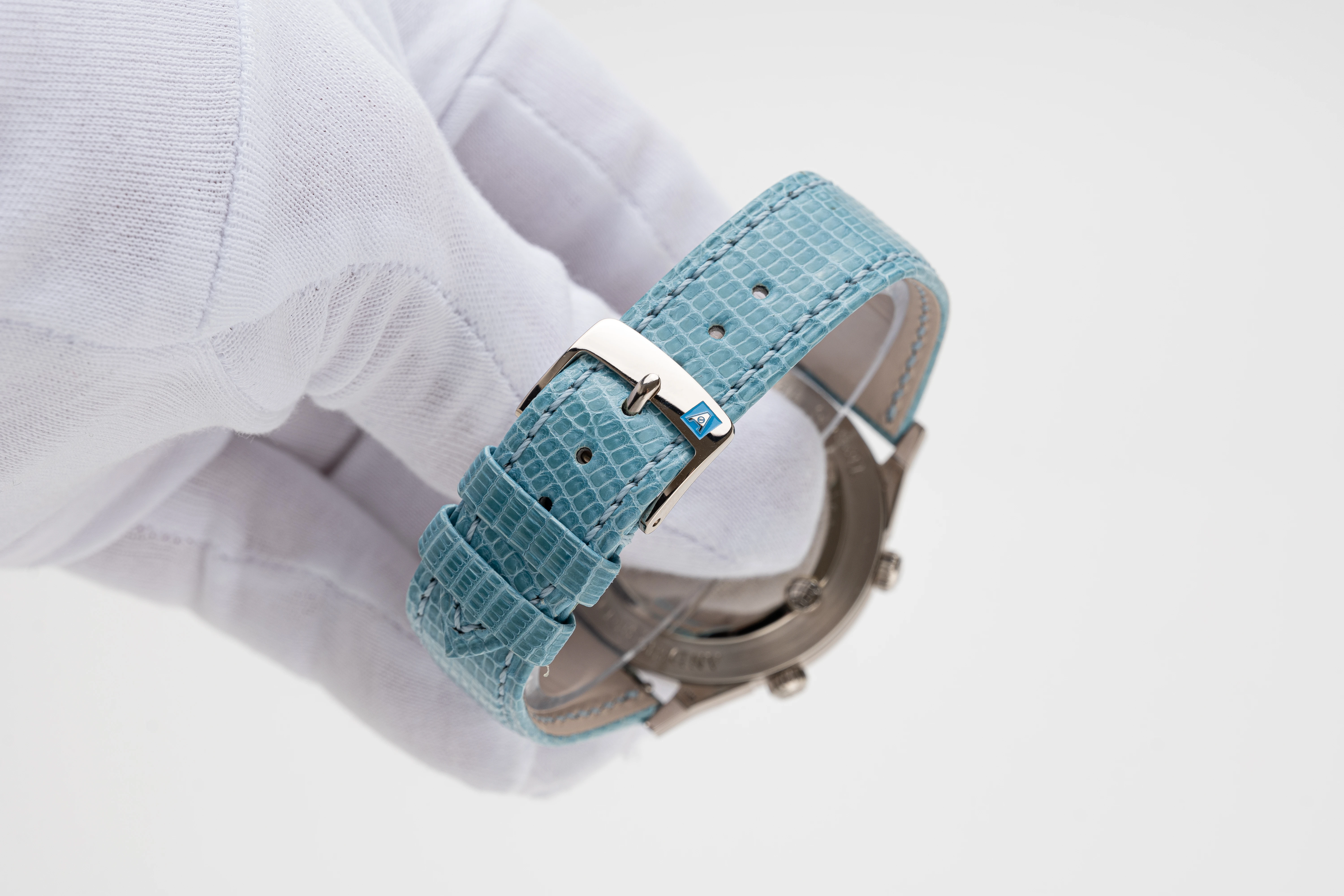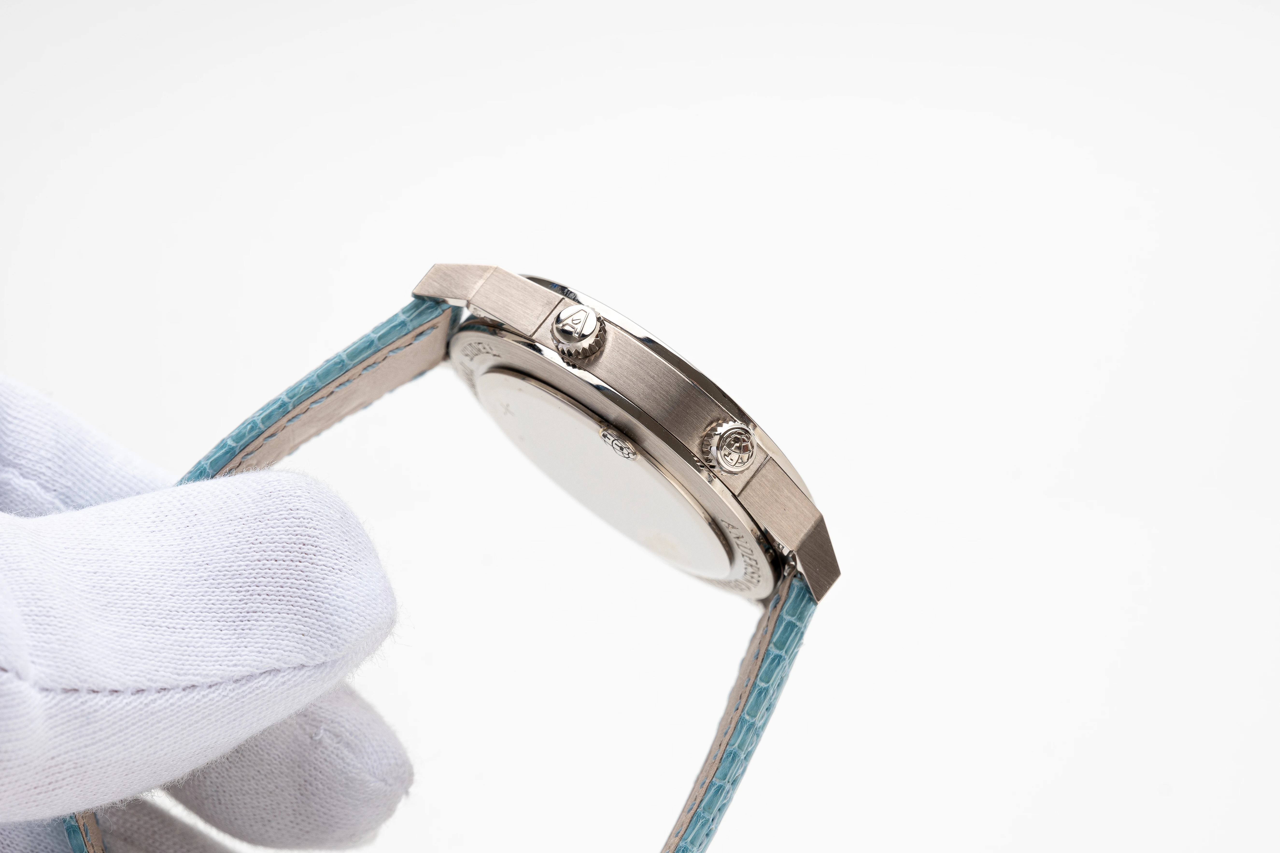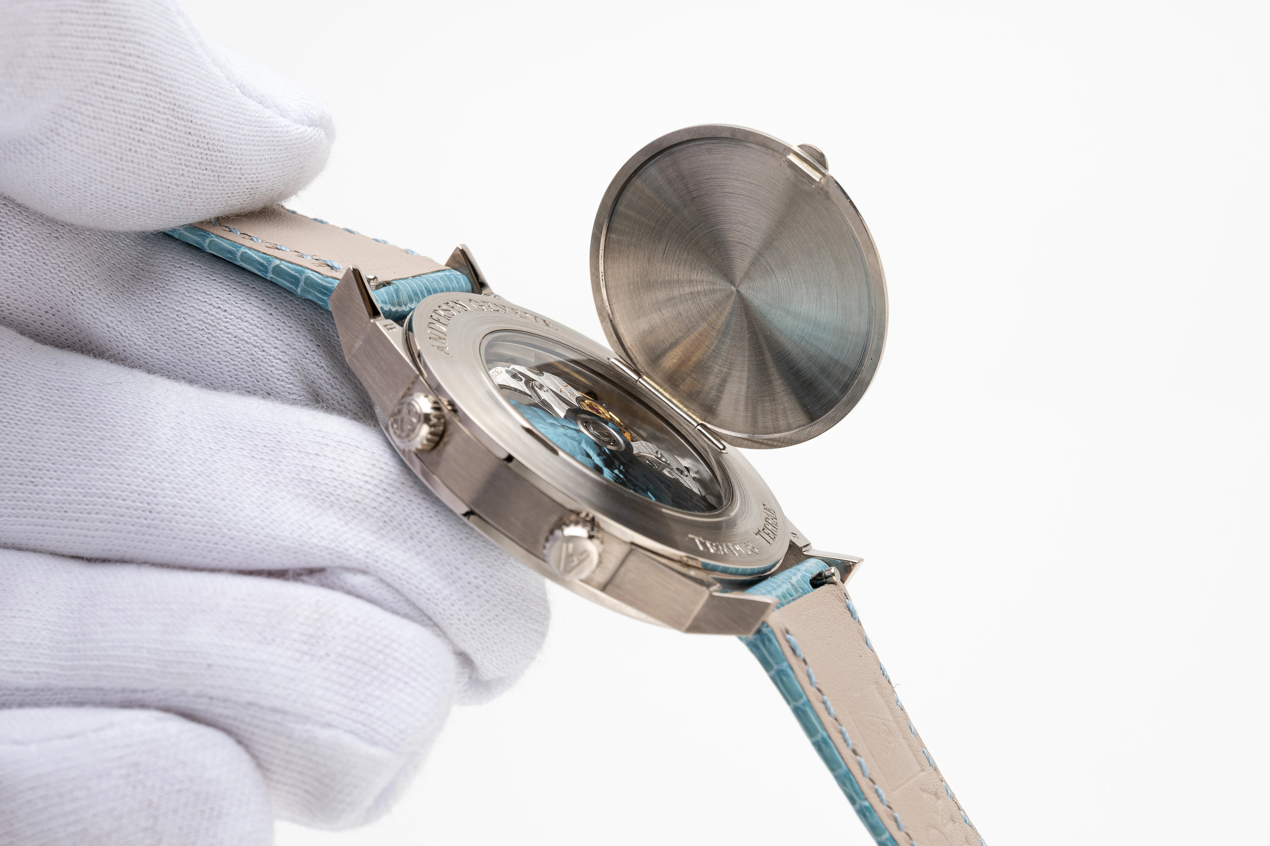 This Andersen Genève Tempus Terrae Worldtime Aquamarines Baguettes in white gold is undoubtedly an extremely rare piece from the Tempus Terrae series, launched in 2022. The series is currently no longer in production, which increases its appeal to collectors. Of all the watches with the Worldtime complication that Svend Andersen has created since 1985, the Tempus Terrea stands out for its particularly valuable design details. These include the 21-carat blue gold dial and automatic rotor, which in this watch is decorated with the “cloud tapestry” relief motif, a unique technique found only on Andersen Genève watches, and the “officer” case back. In addition, the bezel of this watch is set with baguette aquamarines that perfectly complement the blue gold dial – a unique and charismatic combination.