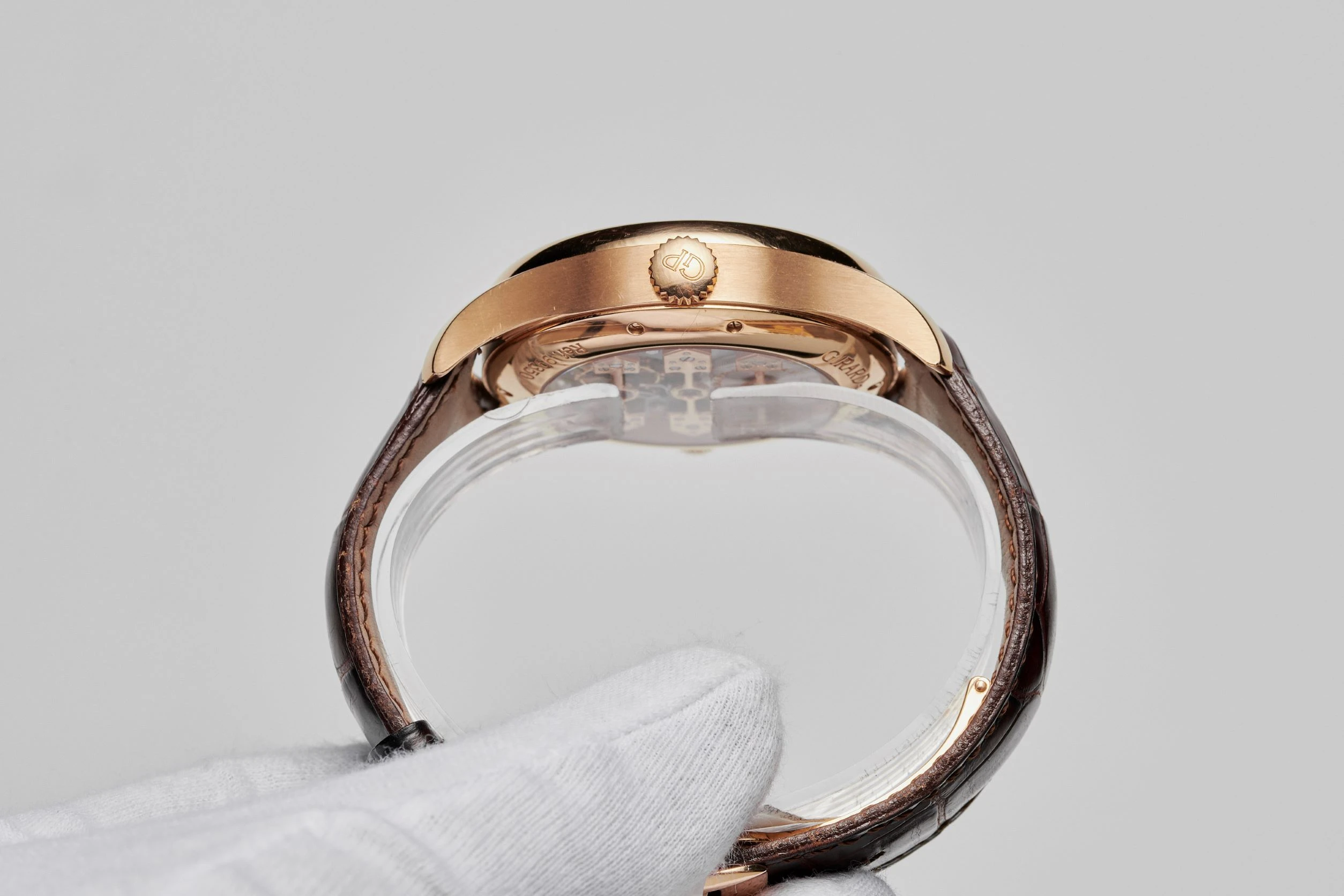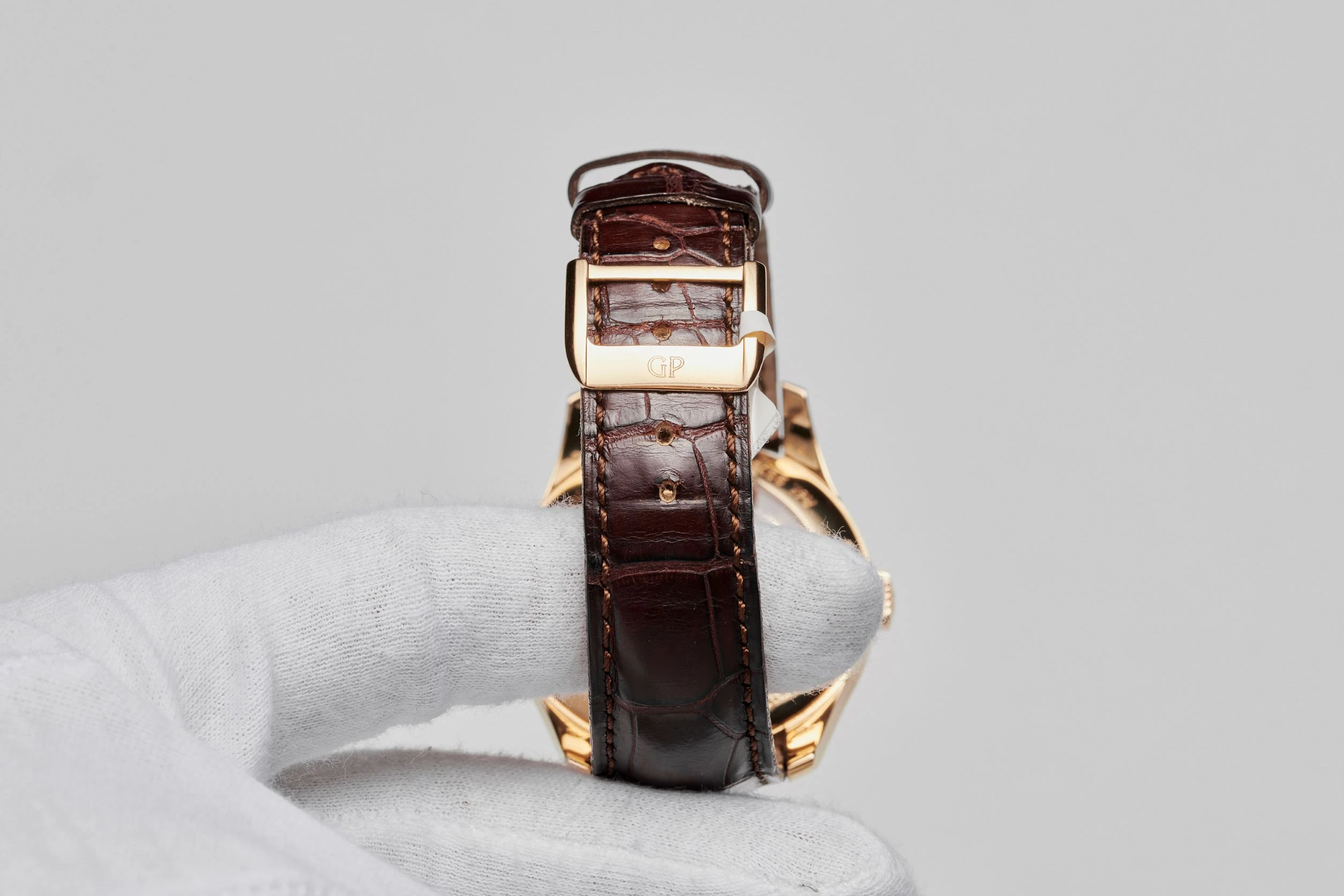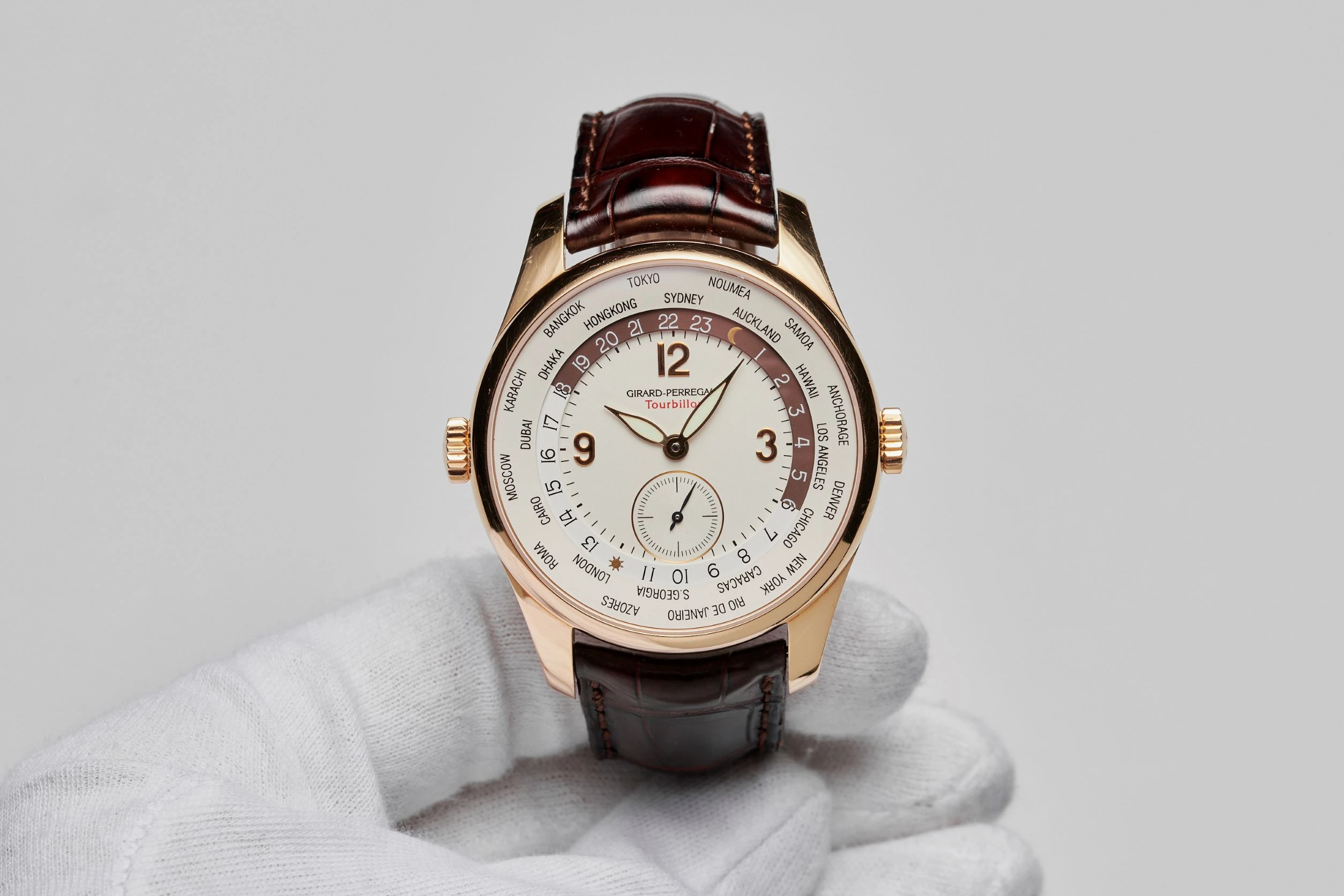 An extremely attractive, complicated yet modest and rare complicated mechanical wristwatch of the famous Swiss watch brand Girard-Perregaux, founded in 1791. Estimated production period: 2005–2010. Case in 18k rose gold, diameter 43mm, thickness 13.15mm, light cream dial, hour and minute feuille hands in rose gold, luminous, sapphire caseback. Caliber GP 098G0, hand wound, with three rose gold bridges from the reverse side, power reserve up to 75 hours. Functions – indication of time in hours and minutes, small seconds hand, world time with day/night indication, tourbillon. Screw-down correction crown at 9 o’clock rotates the city disc, the winding crown at 3 o’clock is intended for setting the time and adjusting the night/day 24-hour scale. Dark brown crocodile strap with 18k rose gold Girard-Perregaux double folding clasp.