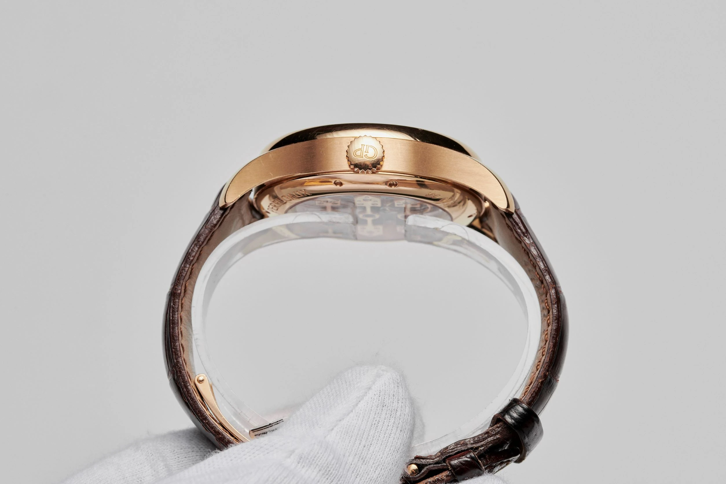 Reference 99350 is a very rare variation of a branded design with three signature gold bridges of a baroque shape on the reverse side, together with a laconic dial featuring a world time complication. Production of Ref. 99350 started in 2005 and continued to around 2010 in very limited numbers, most likely no more than a few pieces per year. The Ref. 99350 was offered in 18k rose gold with a light cream dial, as in the present lot, or in 18k white gold with a black or light cream dial. The present lot is only number 10 in the series of rose-gold models.