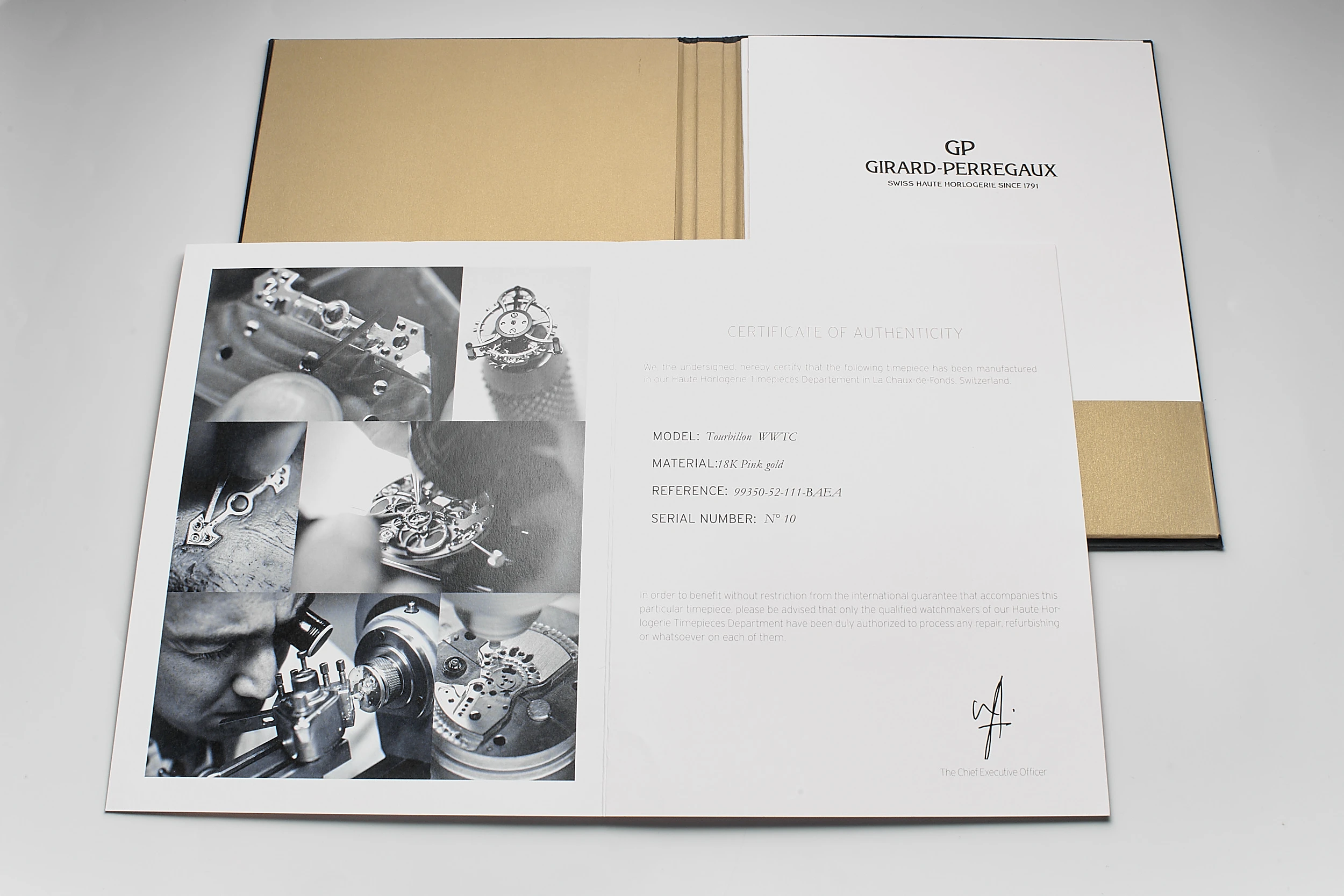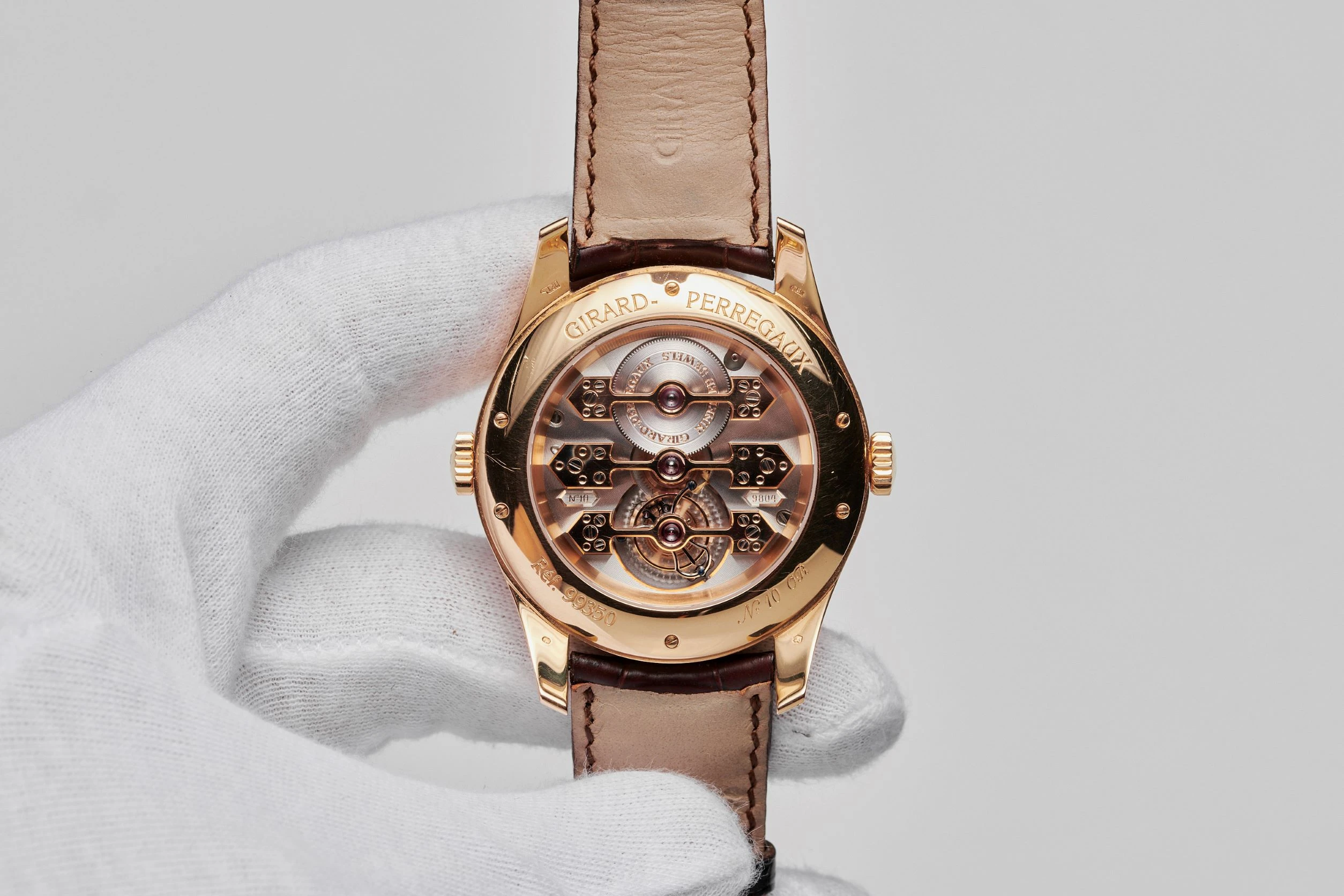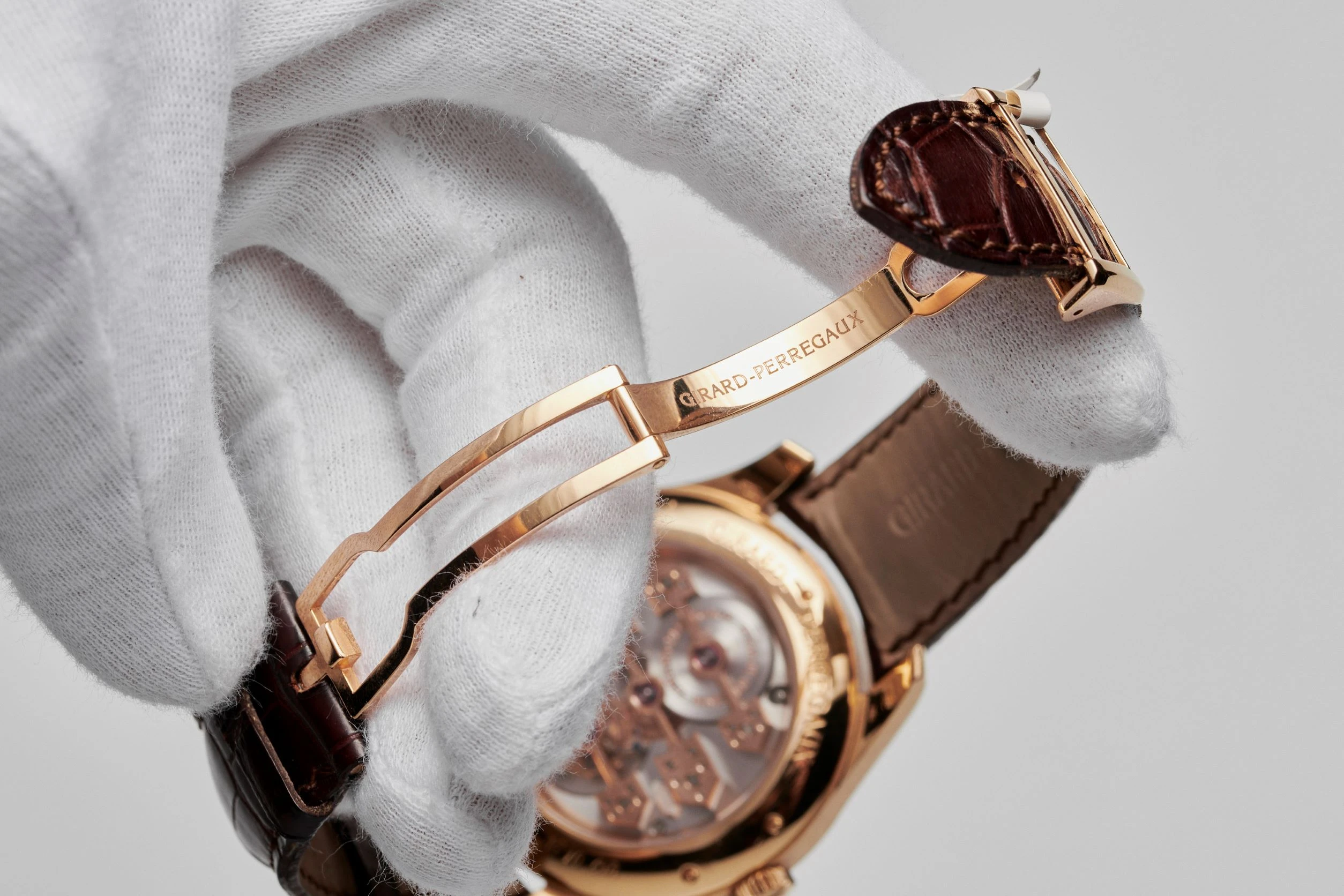 The characteristic feature of the present example and its caliber is its unique design with three gold bridges, opened from the reverse side, compared with the majority of Girard-Perregaux’s three gold bridges tourbillon wristwatches featuring a design with gold bridges on the dial side. We should note in the classic version of the original pocket watch movement, invented in 1867 by Constant Girard, one of the founding fathers of the brand, three gold bridges were installed in accordance with tradition, not on the dial side of the movement but on the reverse side. The design of the movement was patented by Constant Girard in the USA in 1884 (design patent No. 14919), and in 1889 the luxurious Esmeralda pocket watch with a tourbillon and three gold bridges was awarded a gold medal at the Paris Universal Exhibition. In 1981, in honour of the 190th anniversary of the brand, Girard-Perregaux launched a 20-piece series of tourbillon pocket watches with three gold bridges. In 1986, on the eve of its 200th anniversary, the brand started the development of commemorative wristwatches again with a tourbillon and three gold bridges, which was completed with the release of the first Tourbillon sous trois Ponts d’Or wristwatches in 1991.