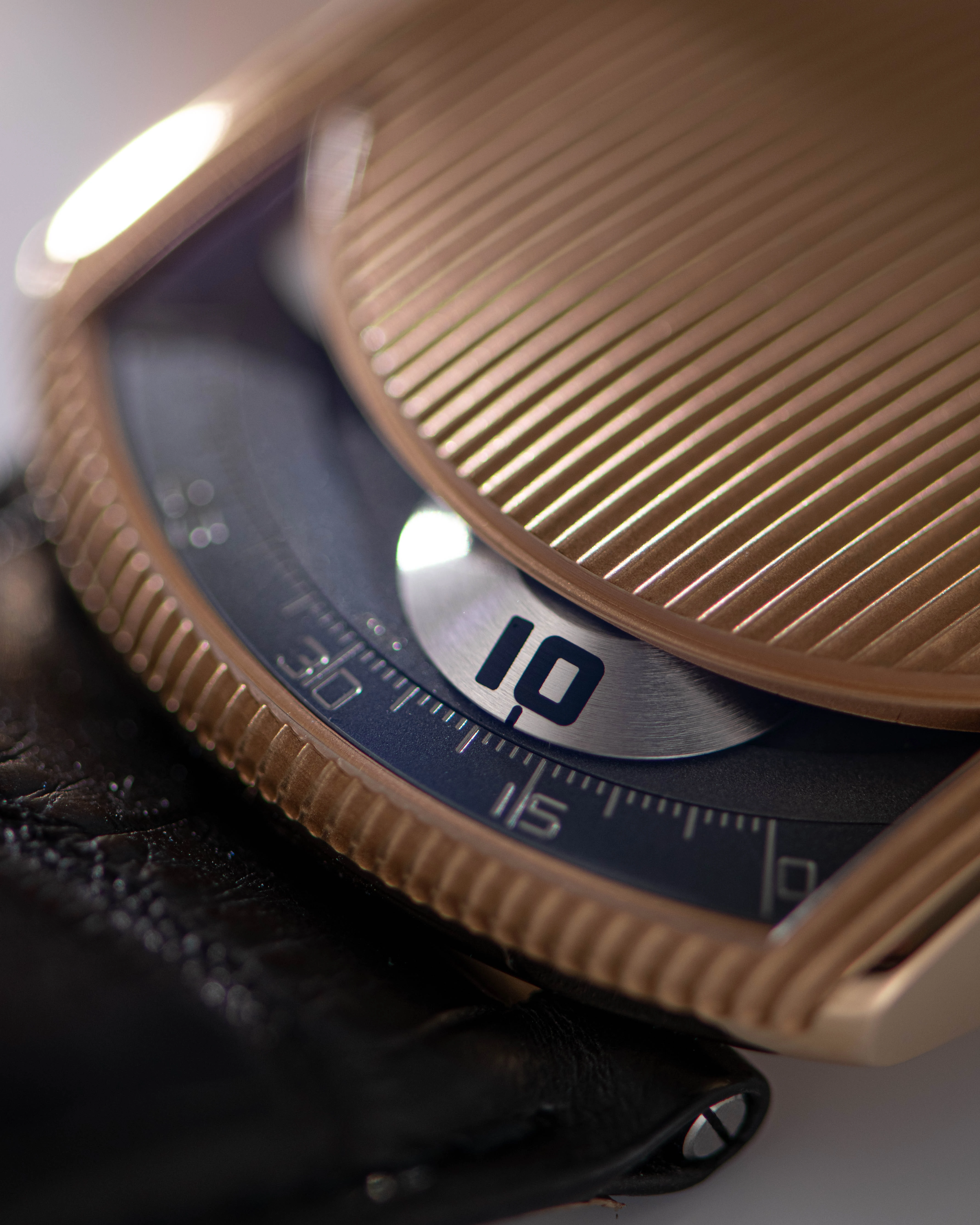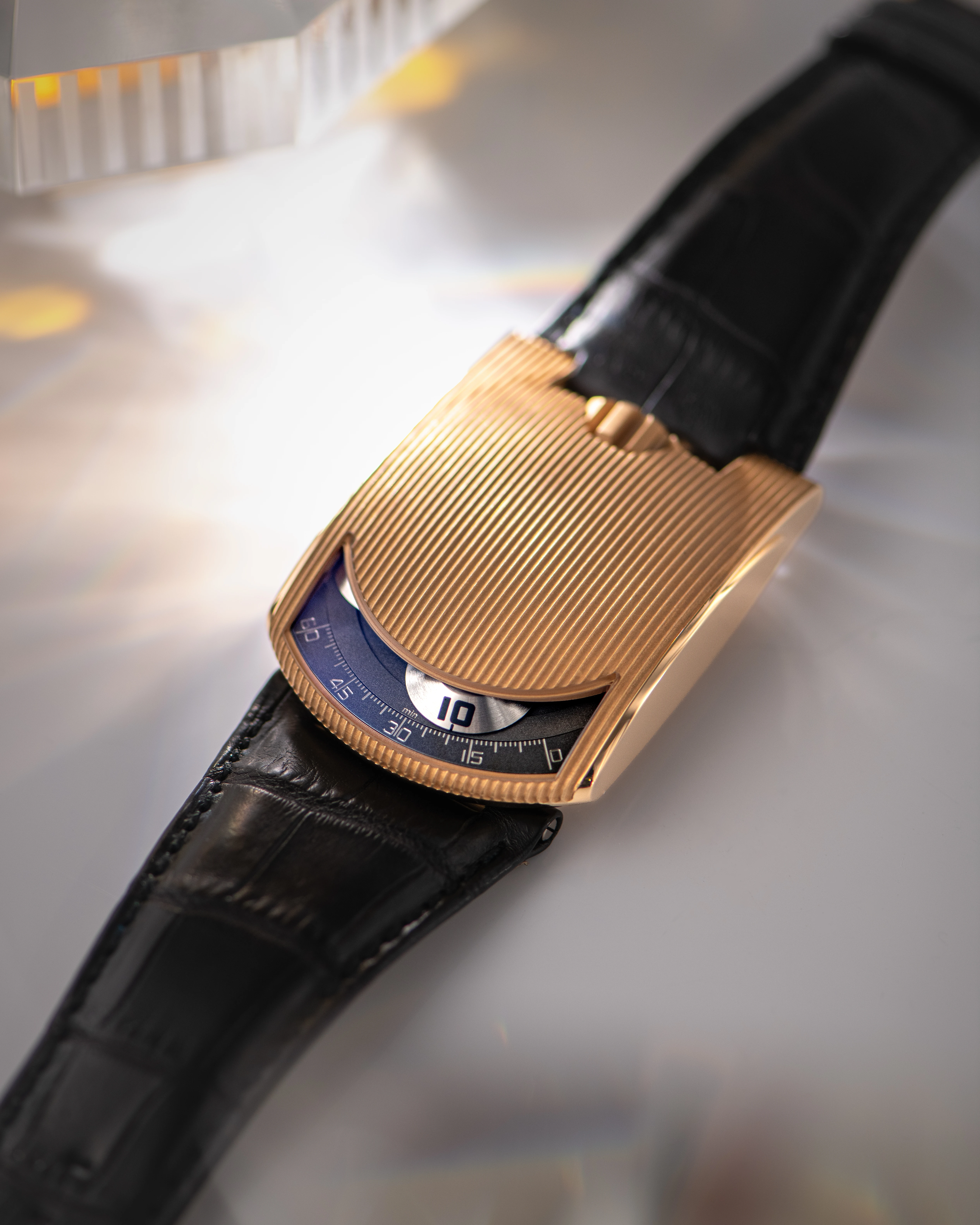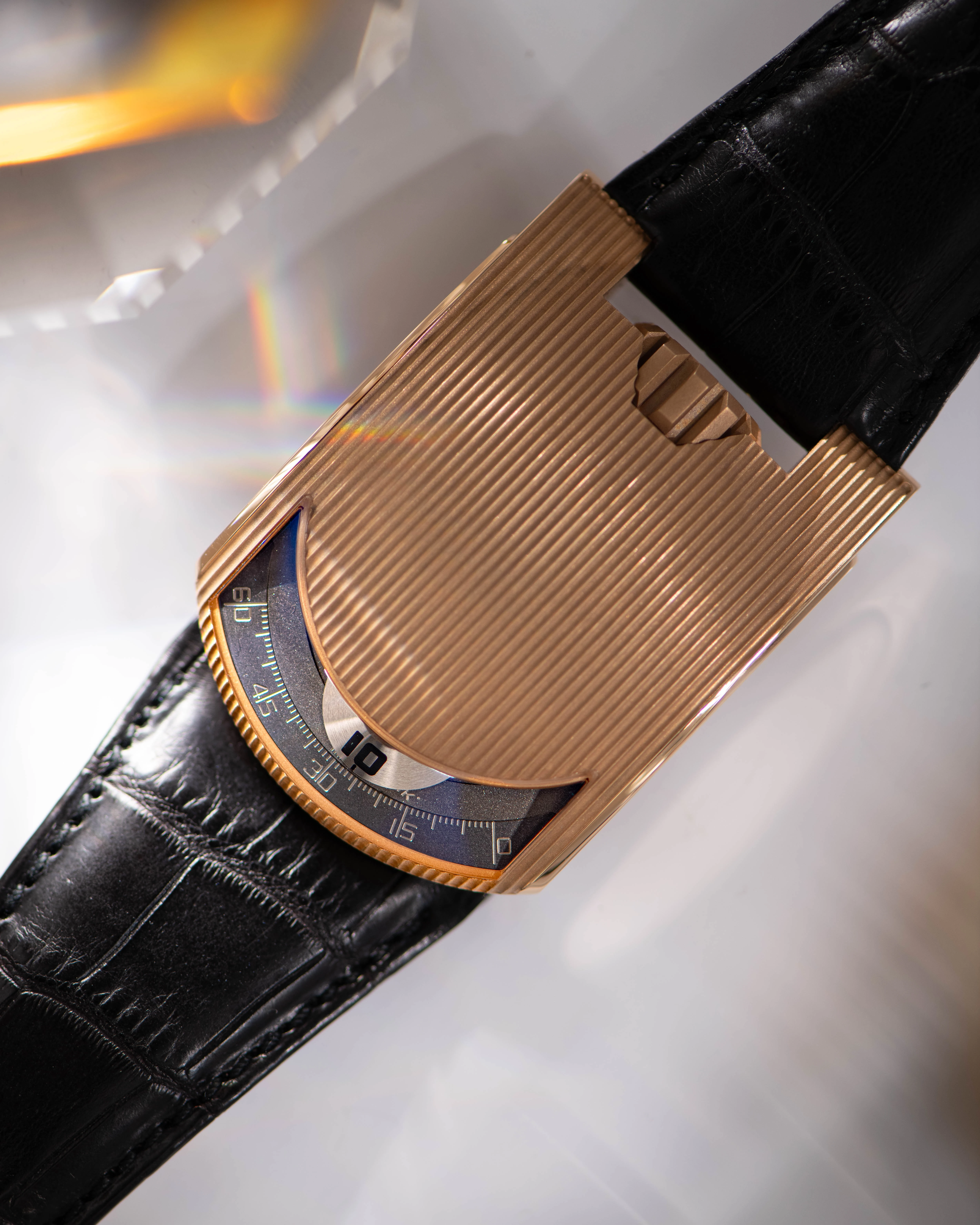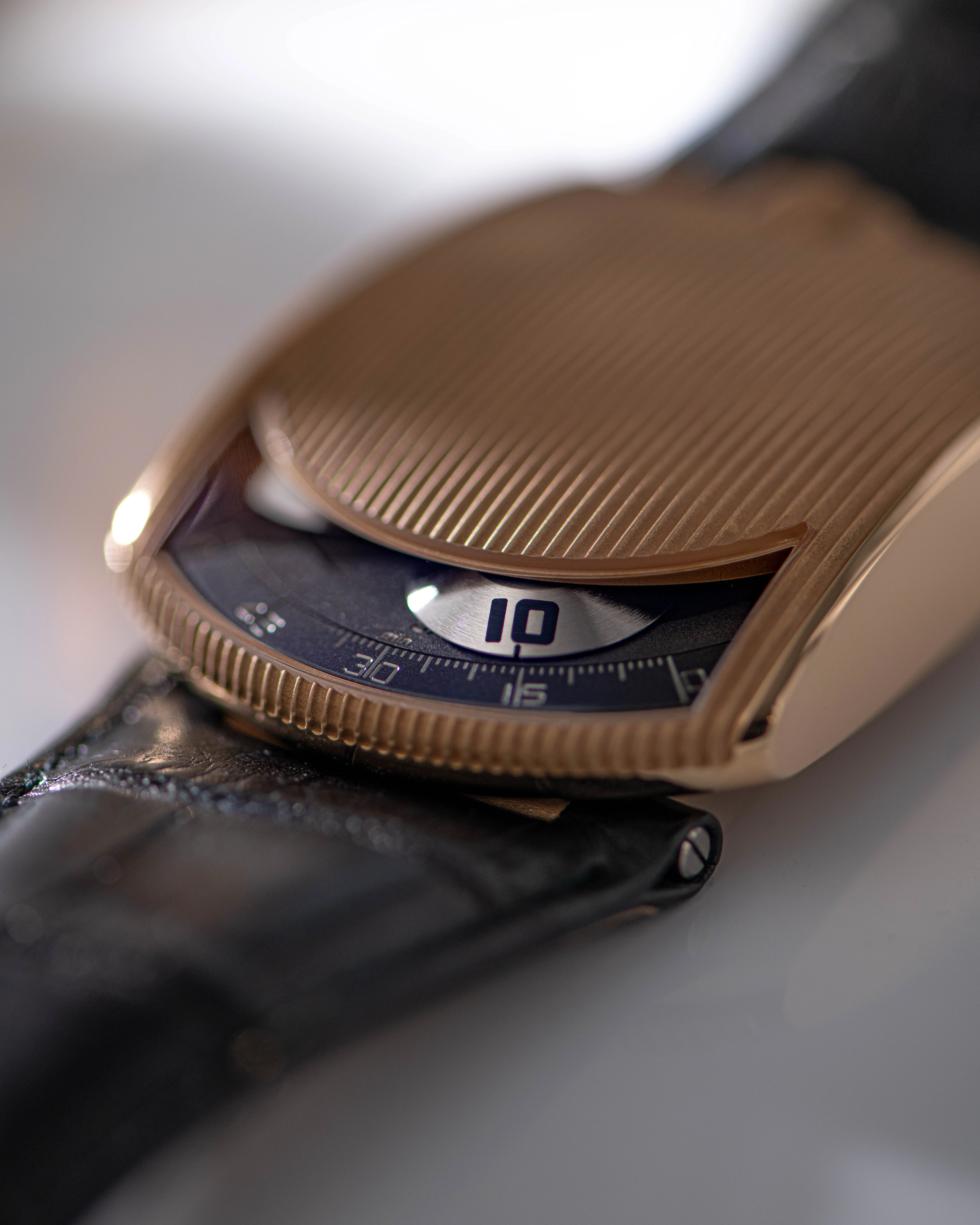 The Urwerk watches from the early days of the brand are appreciated for their powerful aura, which is expressed in a laconic design that is now considered iconic. The basis of the design is a rectangular, lenticular profile with a rounded side that houses the time display. The domed window occupies a small part of the upper surface of the case, while the rest of the domed cover and the strong, wide lugs are covered with embossed stripes over the entire surface. A large winding crown on the opposite side of the time display window provides balance. The large, massive 46x36 mm case in 18k rose gold, considered a challenge to early 2000s tastes, fits the modern mood perfectly.