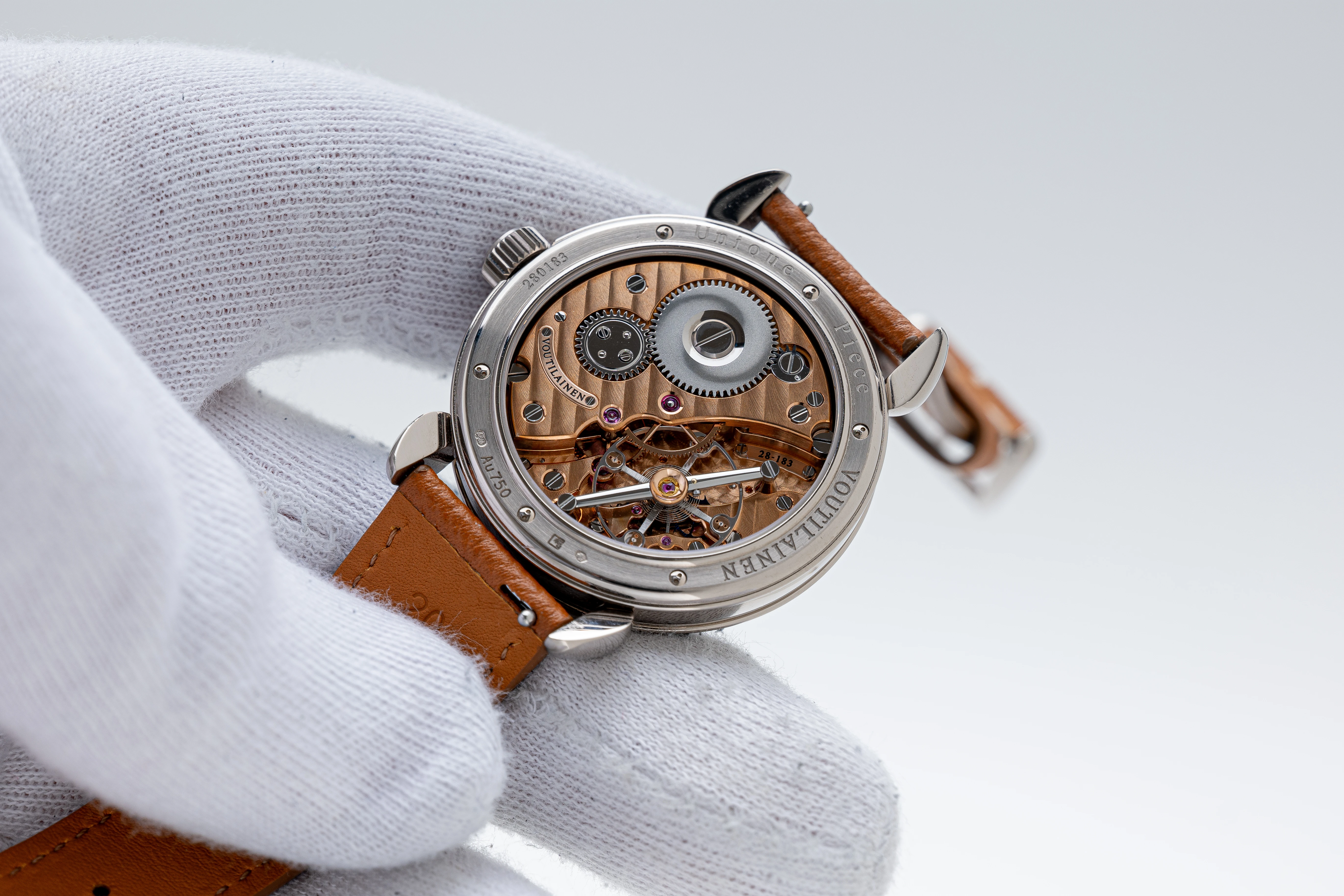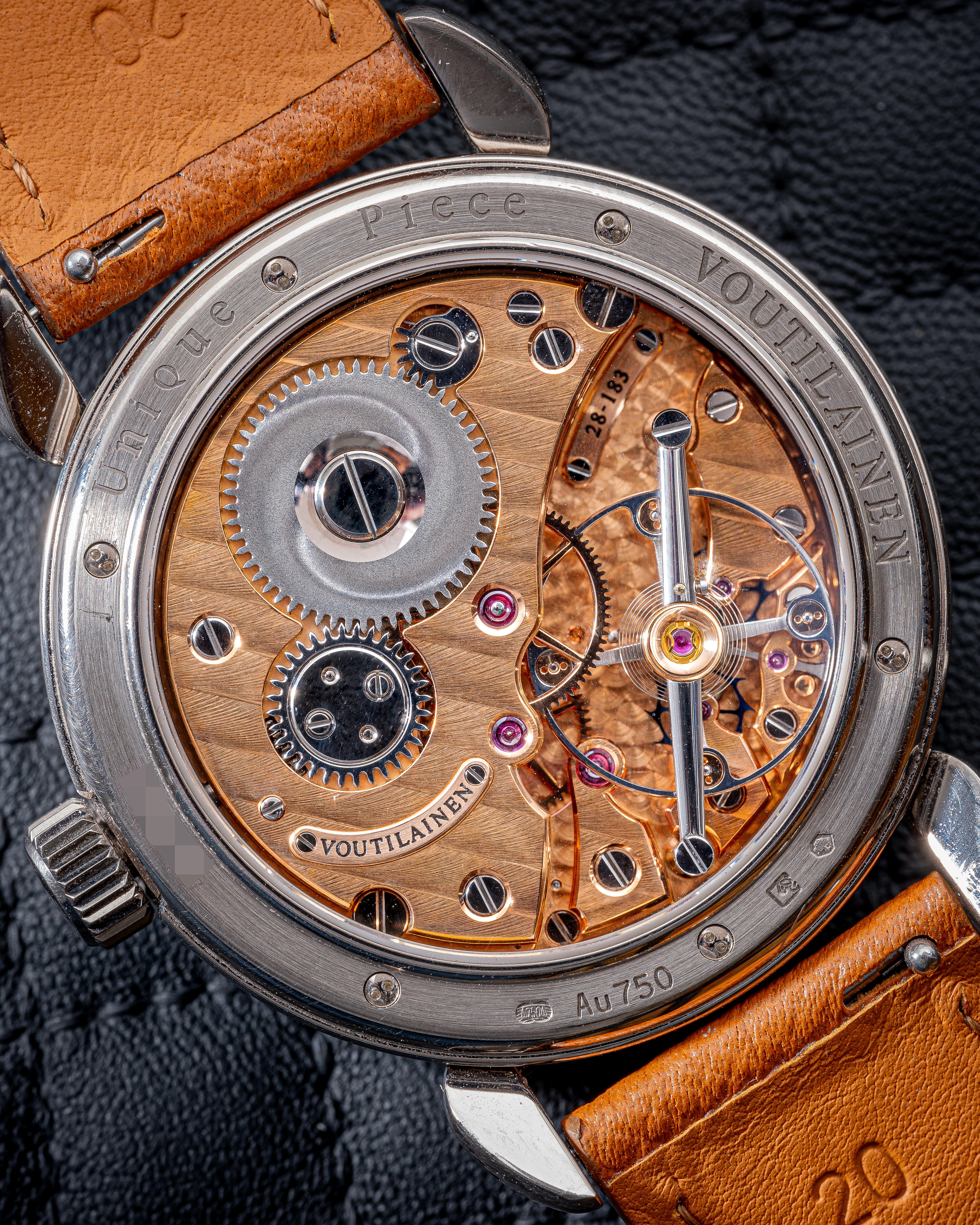 What makes this Vingt-8 Unique Piece watch even more attractive is its version of caliber 28, which has been given an extremely rare finish for Vingt-8 watches with the combination of Côtes de Genève, perlage and rose gold plating. The connoisseur of fine watchmaking will certainly notice that Mr. Voutilainen maintains very high polishing standards in the movements he produces, which is reflected in the polished bevels of the bridges and winding wheels, the recesses around the jewels and screws, the screw heads, the bevels of the wheels, the balance wheel and its chaton and – most importantly – the balance bridge, which resembles the tourbillon bridge with its fine conical polish. All this represents an extremely high level of finishing and decoration of the movement, which has the simplest function of indicating the time with three hands.