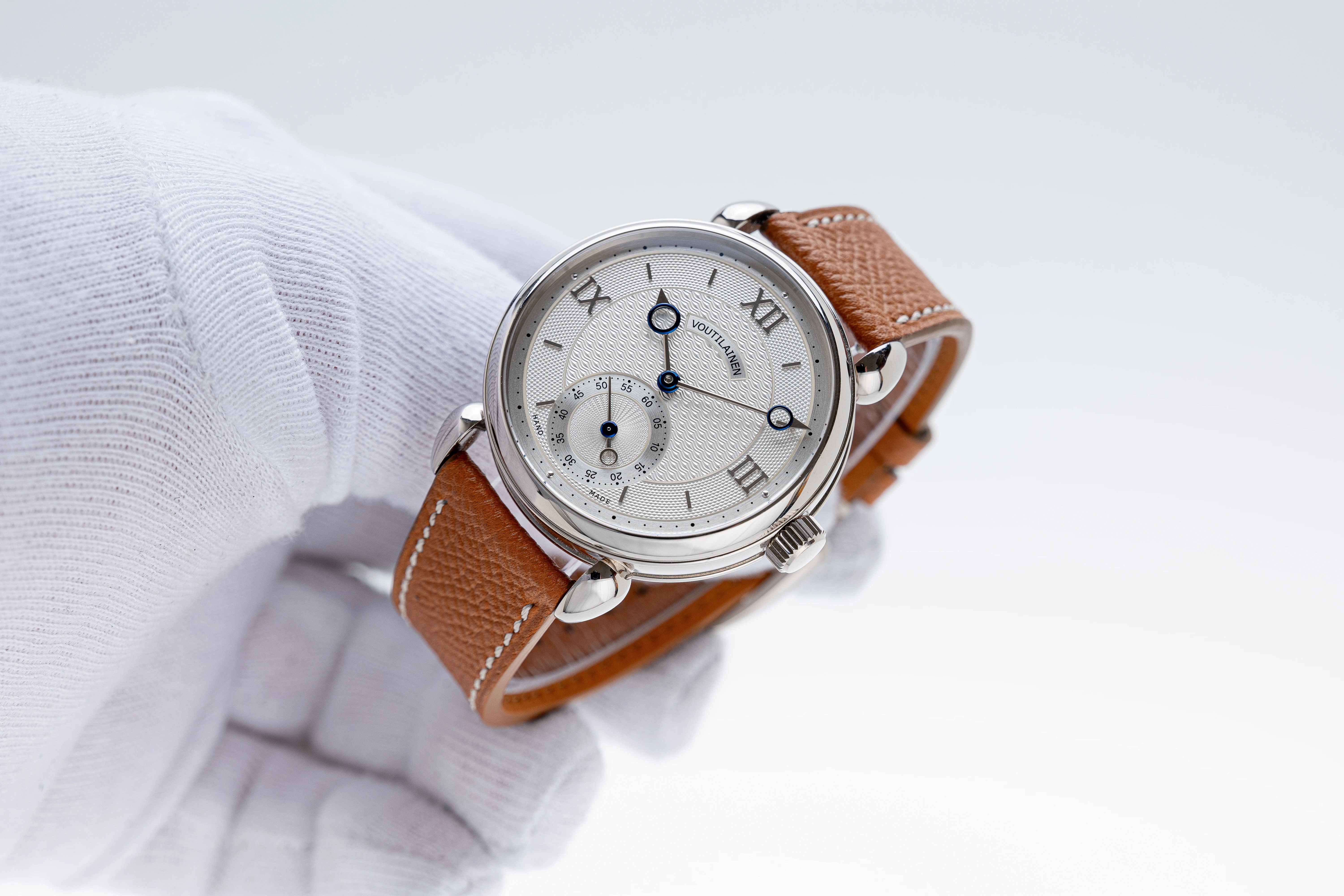The hallmark of Mr. Voutilainen’s style is of course the high-quality hands, a modernist version of the “Pomme de Breguet” hands, in the elaborated design version, i.e. with a counterweight ring for the small seconds hand. Of course, all the hands are a combination of white gold and blued steel, a design that Mr. Voutilainen adopted at the beginning of his career as an independent watchmaker.