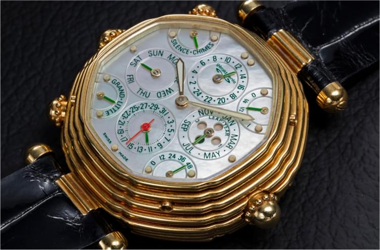 Almost all the complex watches from Gérald Genta’s classic period, i.e. from the mid-1970s to 1996, were developed by the renowned watchmaker Pierre-Michel Golay and most of them were assembled by him or under his direct supervision. He worked for Gérald Genta from 1973 to the mid-1990s and then until recently for Franck Muller, where he also specialized in the development of complex and ultra-complex watches. The collaboration between Mr. Genta and Pierre-Michel Golay gave the brand a unique expertise, something that many other Swiss brands lacked, especially in the late 1970s and 1980s.