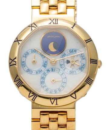 His work with the company began with the development of a slim perpetual calendar module with the characteristic arrangement of sub-dials typical of Gérald Genta’s perpetual calendars: the date at 6 o’clock, the day of the week at 9 o’clock, the month and leap year at 3 o’clock and the moon phase at 12 o’clock. This module was created in 1974 and was accompanied by the development of simplified versions with simpler calendar functions, from a complete calendar with moonphase to the simplest version with date and moon phase.