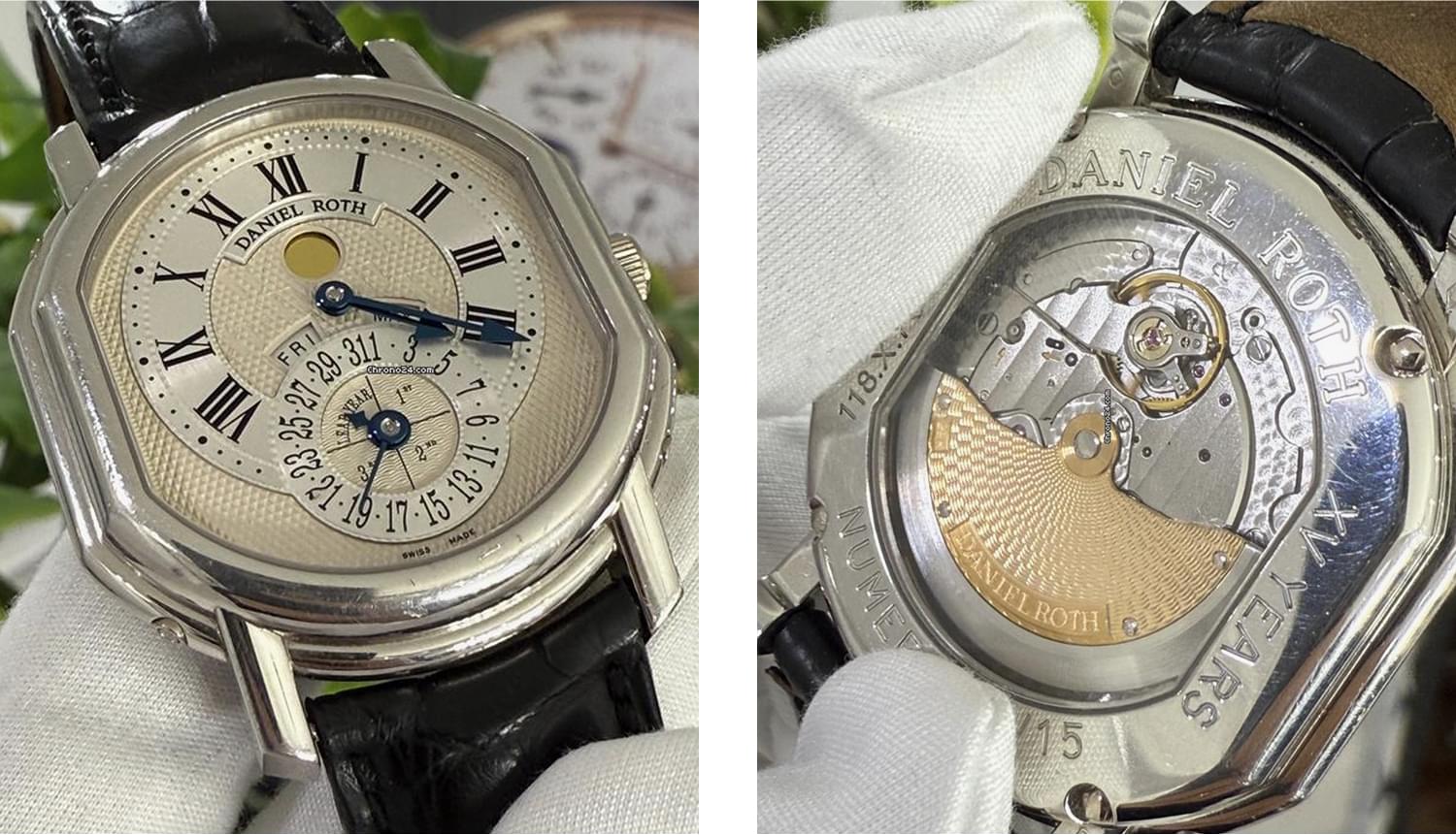 Let’s take a look at the scenario for the introduction of other complications when the Daniel Roth collection was founded and in the early years of the brand. In the case of the tourbillon, Mr. Roth reported that he shared the cost of developing the tourbillon caliber with Breguet. He developed the movement jointly with Lémania, so that the different versions of the same movement were used both at Breguet in the Ref. 3350 (initially) and later in several other references, as well as in the Daniel Roth Ref. 2187/2186 Tourbillons. Mr. Roth did the same when he created the Daniel Roth Ref. 2147 Chronograph with the Lémania caliber 2320, which was also the basis for the Breguet Ref. 3230 Chronograph he had previously developed. In a seemingly completely analog situation, the launch of his Daniel Roth Ref. 2117 Perpetual Calendar was a absolutely different scenario. Mr. Roth decided not to use the early Breguet design. That is, he eschewed the traditional layout with the sub-dials at 12, 3, 6 and 9 o’clock forming a cross-shaped structure and the use of the basic Frédéric Piguet 71 automatic caliber, opting instead for the Lémania 8810 automatic caliber. He did not use the perpetual calendar module he had developed for the Breguet Ref. 3050, nor did he develop a new module in its footsteps. Instead, he opted for the Eta/Gérald Genta perpetual calendar module and commissioned Philippe Dufour, then an up-and-coming independent watchmaker, to adapt and modify it. In an interview with acollectedman.com, Mr. Roth explains: “Dufour was not the mythical watchmaker he is now. He needed some work, so I developed the perpetual calendar with him using the Gérald Genta perpetual calendar as a base movement, which I knew well.”