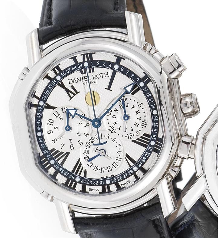This watch has a combination of a perpetual calendar and a chronograph, which is extremely rare for Daniel Roth. In this context, it is unclear why the brand, which caters primarily to the collector community, did not use the classic high-end hand-wound Lémania 2320 chronograph as a base, which was previously used in the Ref. 2147, and instead opted for the Frédéric Piguet 11.85 automatic column-wheel chronograph with vertical clutch. The only reason for this seems to be to offer the everyday wearer a practical wristwatch with a perpetual calendar that does not have to be wound by hand. This movement formed the basis for the Daniel Roth perpetual calendar chronograph Ref. 377.X, launched in 2002, and its automatic caliber DR207, which used an Eta/Gérald Genta calendar module with the original specifications, i.e. with a leap year on the sub-dial of the month and with moonphase. The module was most likely adapted for the Frédéric Piguet 11.85. The placement of the leap year indication on the month sub-dial is the main difference between this module and the modified versions for references 2117, 119 and 118, where the leap year indication is on the date sub-dial. The use of the Eta/Gérald Genta calendar module with its original display arrangement distinguishes the Ref. 377.X from the perpetual calendars and chronographs of other brands that are based on the Frédéric Piguet 11.85. The Ref. 377.X was offered in two limited editions of 15 pieces: Ref. 377.X.40 in 18k yellow gold and Ref. 377.X.60 in 18k white gold with a guilloché dial with a lozenge motif and guilloché vieux panier on the recessed counters. The dial features applied Breguet Arabic numerals, which are rarely found on Daniel Roth dials.