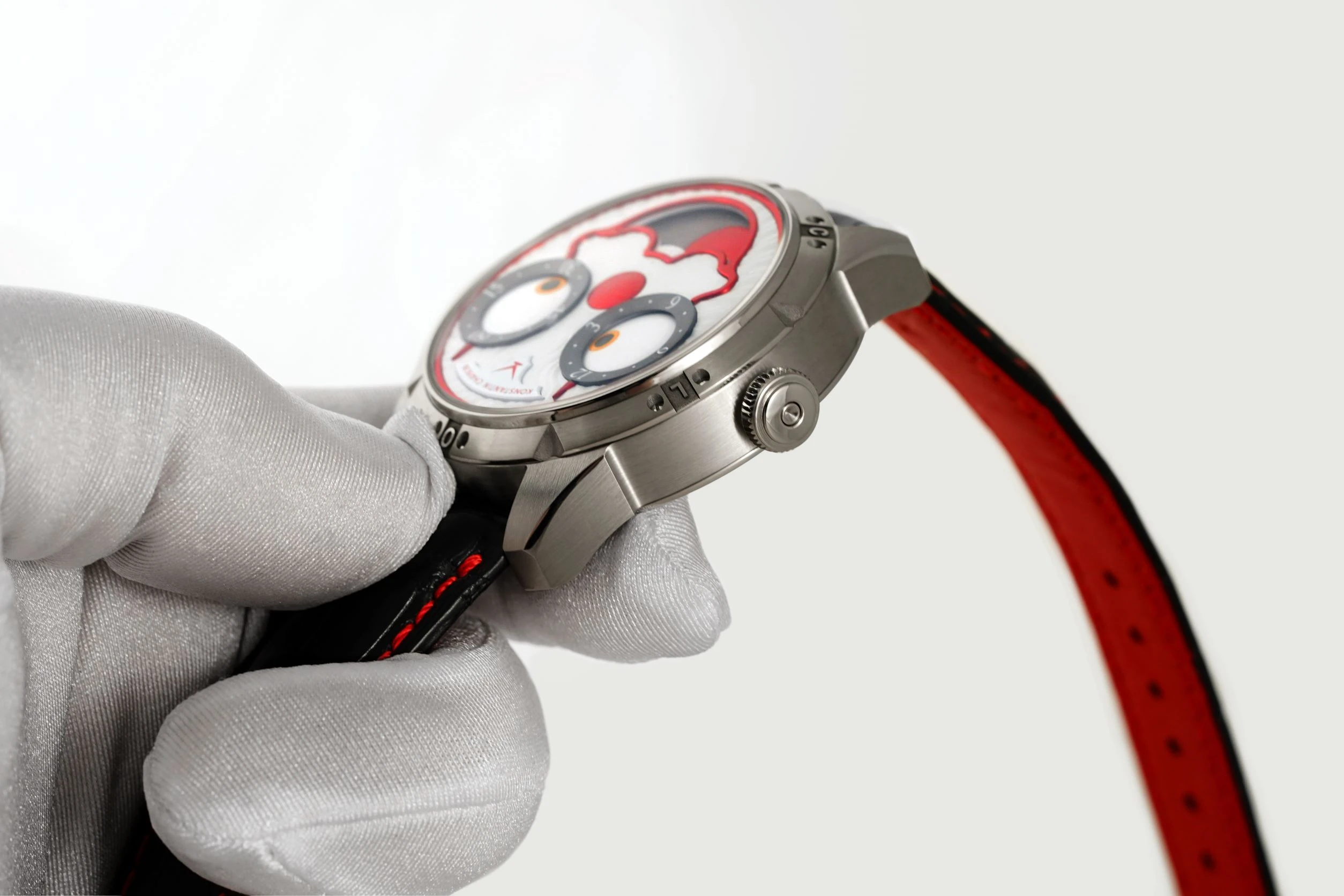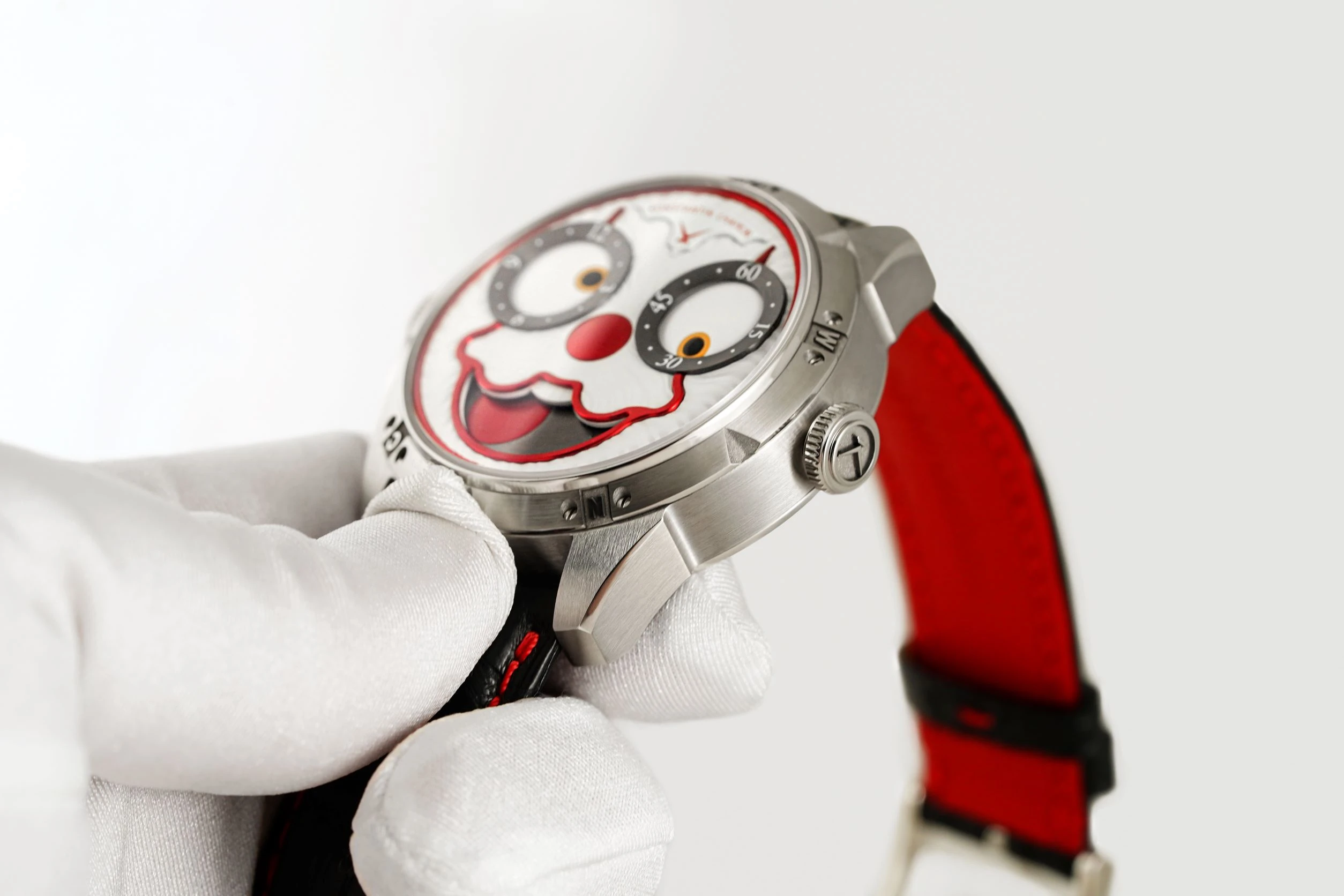 When it comes to the Clown watch, its features show a hint of mockery and irony. The dial is white and resembles a circus makeup.