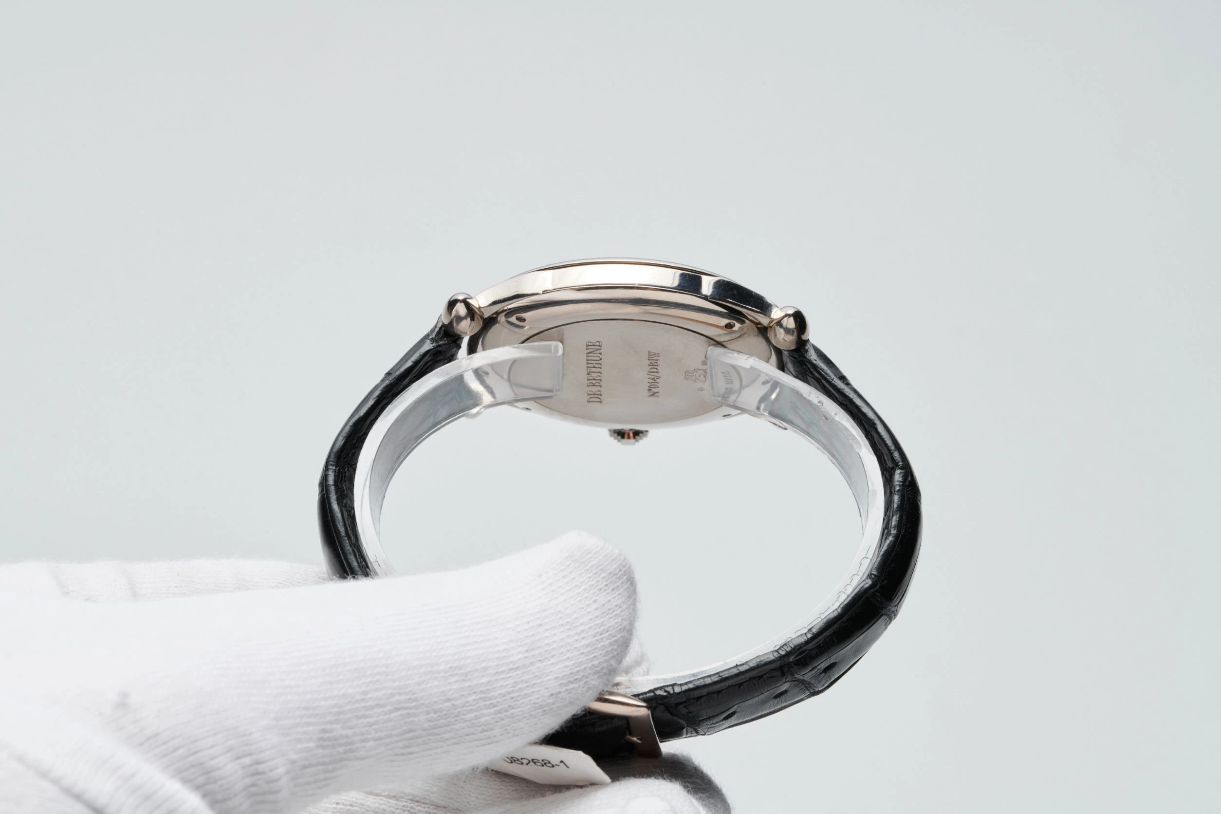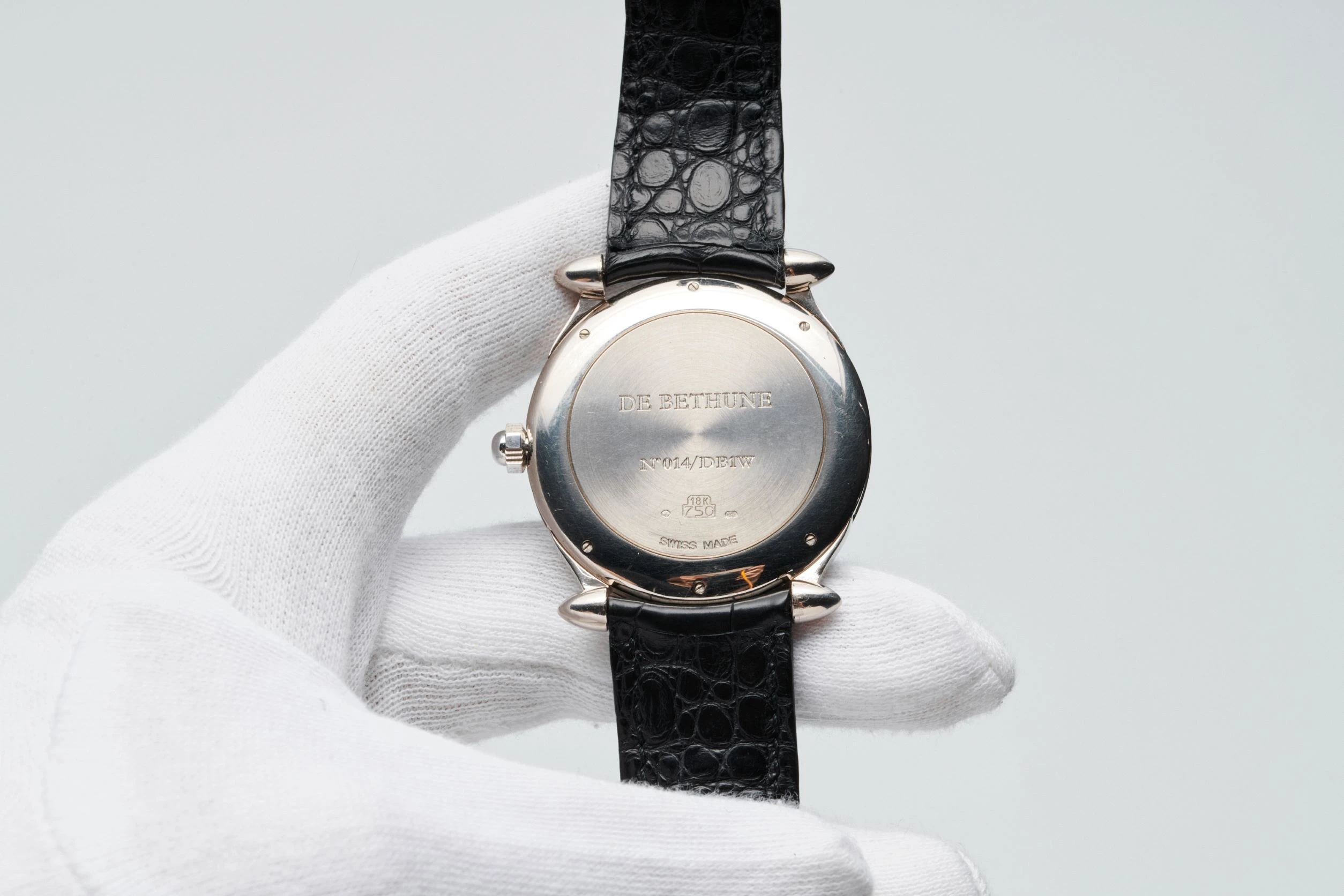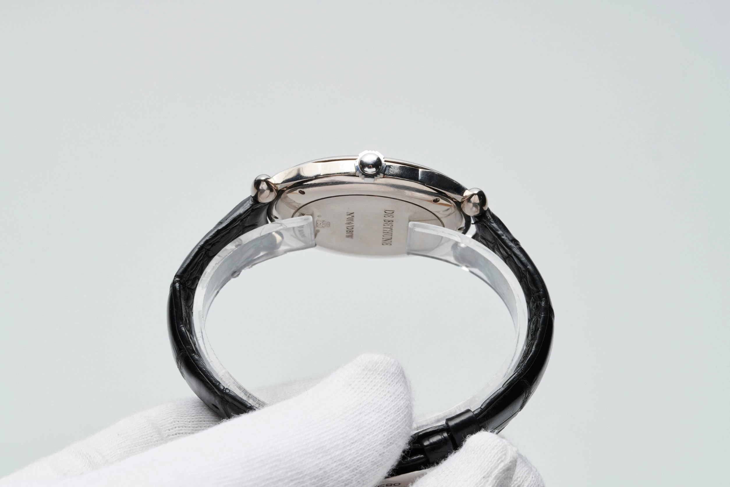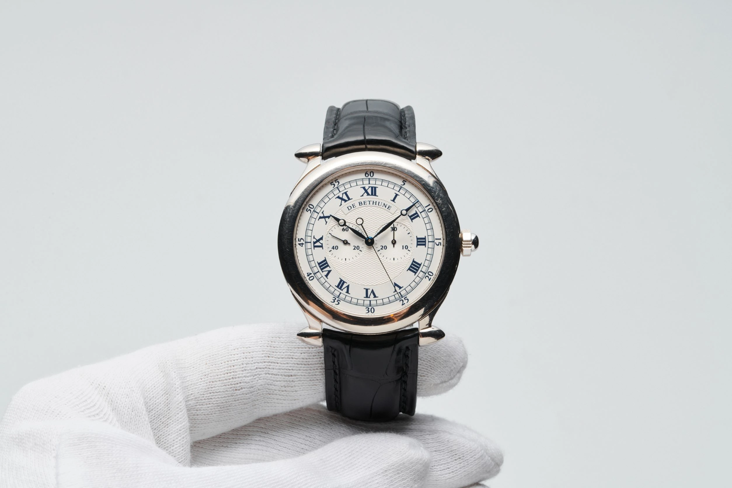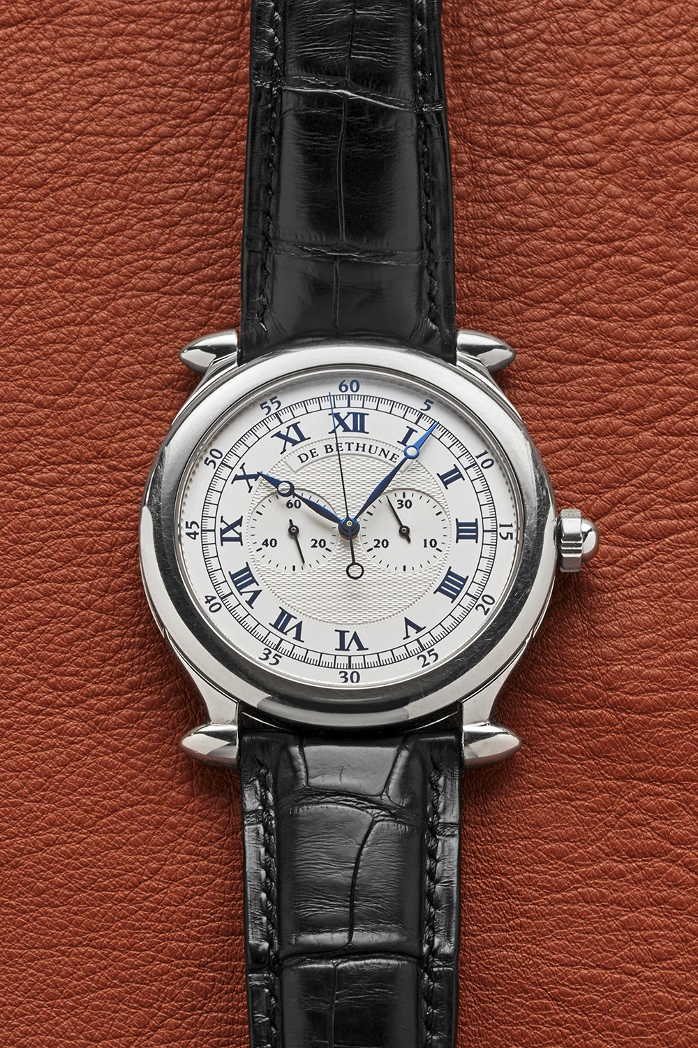 An extremely rare, collectible, charismatic and early white gold chronograph wristwatch from Swiss watch brand De Bethune, founded in 2002 by Italian vintage watch dealer David Zanetta and French watchmaker Denis Flageollet. The present reference was launched in 2002. Case in 18k white gold, diameter 42 mm, 8 mm thick, with ogival lugs, solid white gold caseback with engraved brand name, reference and serial number. Matte silvered solid gold dial with guilloché ‘Grain d'Orge’ motif in the center, slightly recessed sub-dials with fine concentric grooves, chapter ring with dark blue pad printed radial Roman numerals and blued steel ‘Pomme de Breguet’ hands. De Bethune caliber [DB]2002, manual winding, power reserve up to 36 hours. Functions – display of time in hours and minutes, small seconds at 9 o’clock, monopusher chronograph with central seconds hand and 30-minute counter at 3 o’clock. Black leather strap, De Bethune pin buckle in 18k white gold. Numbered edition. De Bethune states that only 28 pieces have been made since 2002.