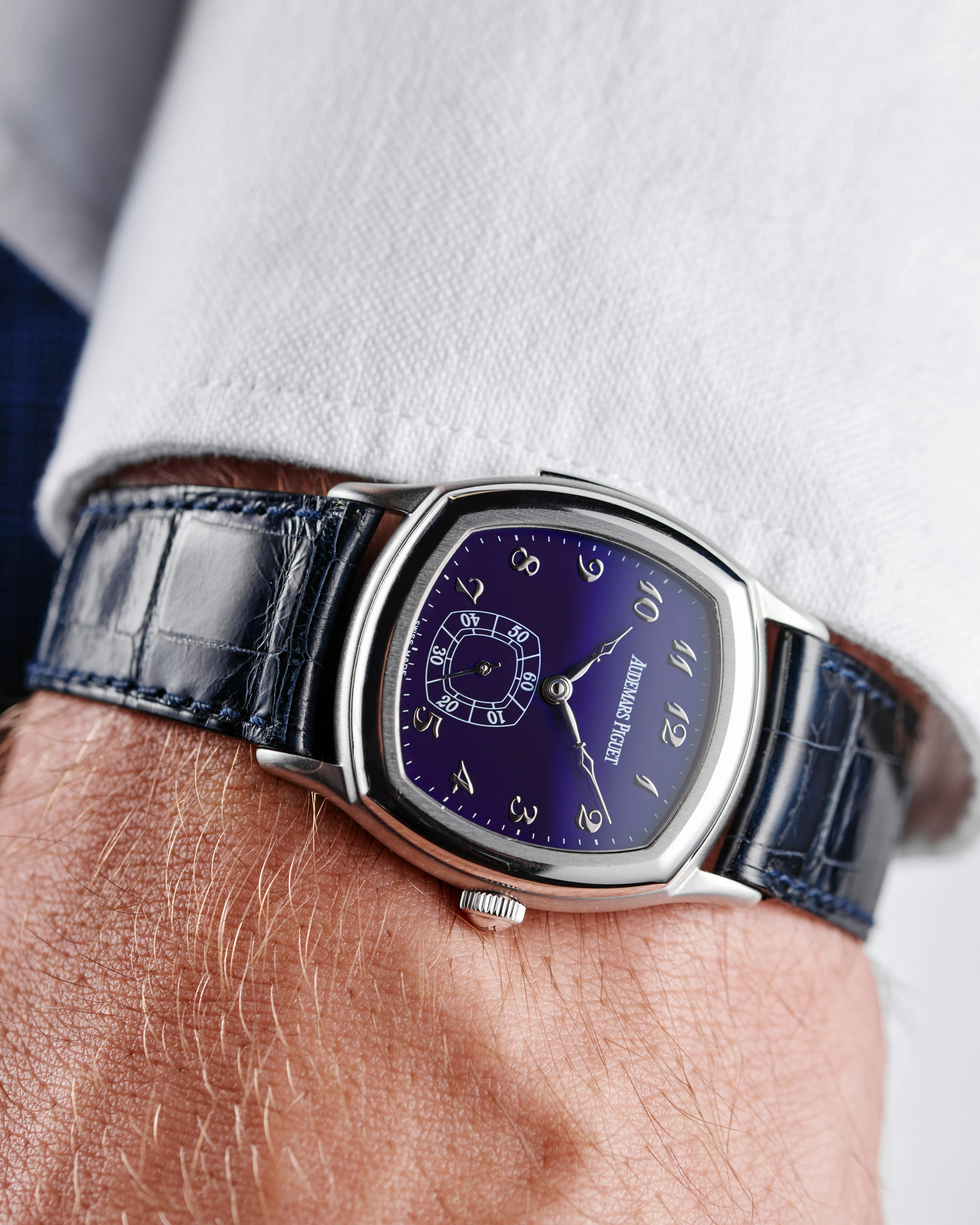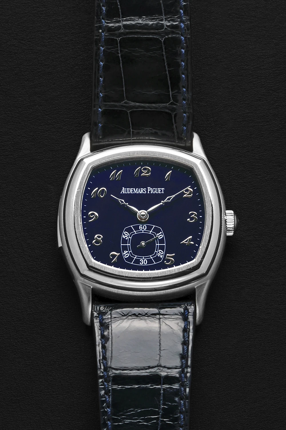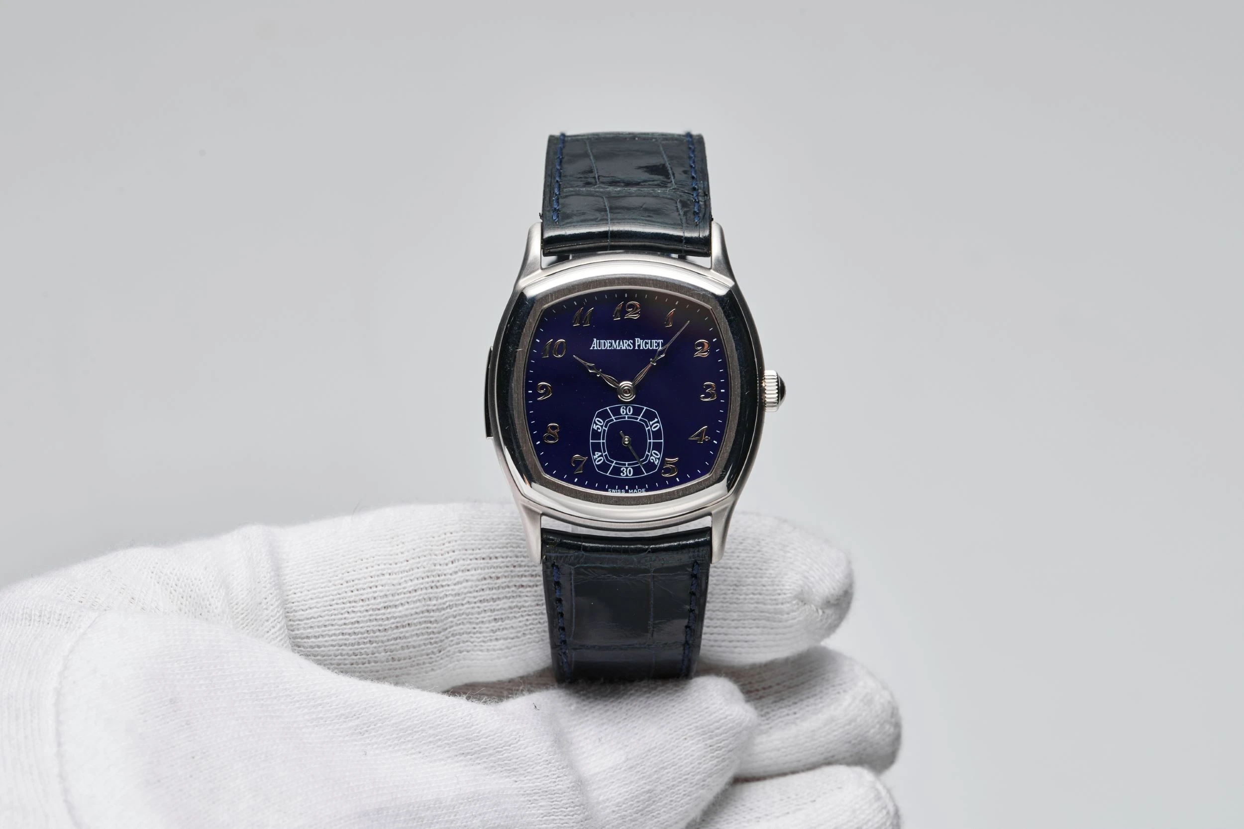 Minute repeaters are undoubtedly among the rarest Audemars Piguet watches. This Répétition Minutes John Schaeffer is for those who want to explore the extremely fascinating period of Audemars Piguet watchmaking in the second half of the 1990s. This history was brief, (lasting only about five years), and during that short period of time, many beautiful designs were created, including this Répétition Minutes John Schaeffer Ref. 25760PT in platinum with an attractive dark blue dial with “cathedral” hour and minute hands and applied Arabic Breguet numerals. The undisputed advantage of this watch is the combination of the outstanding caliber 2866, one of the smallest and finest repeater movements of all time, with the outstanding aesthetics of its historically rooted Art Deco watch design.