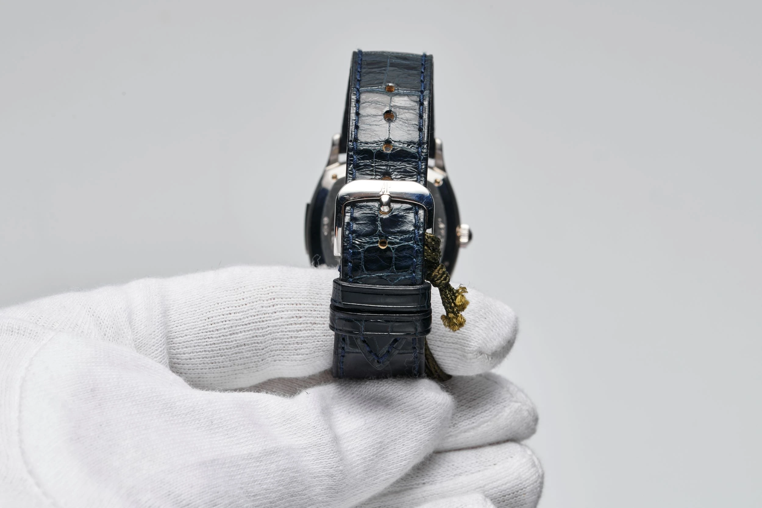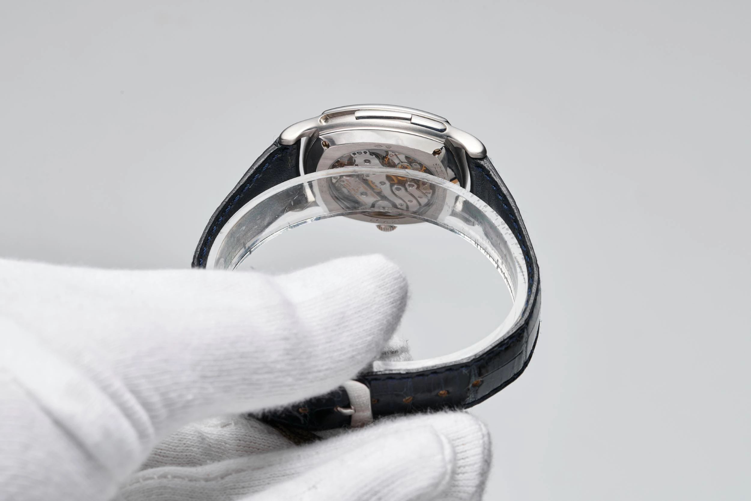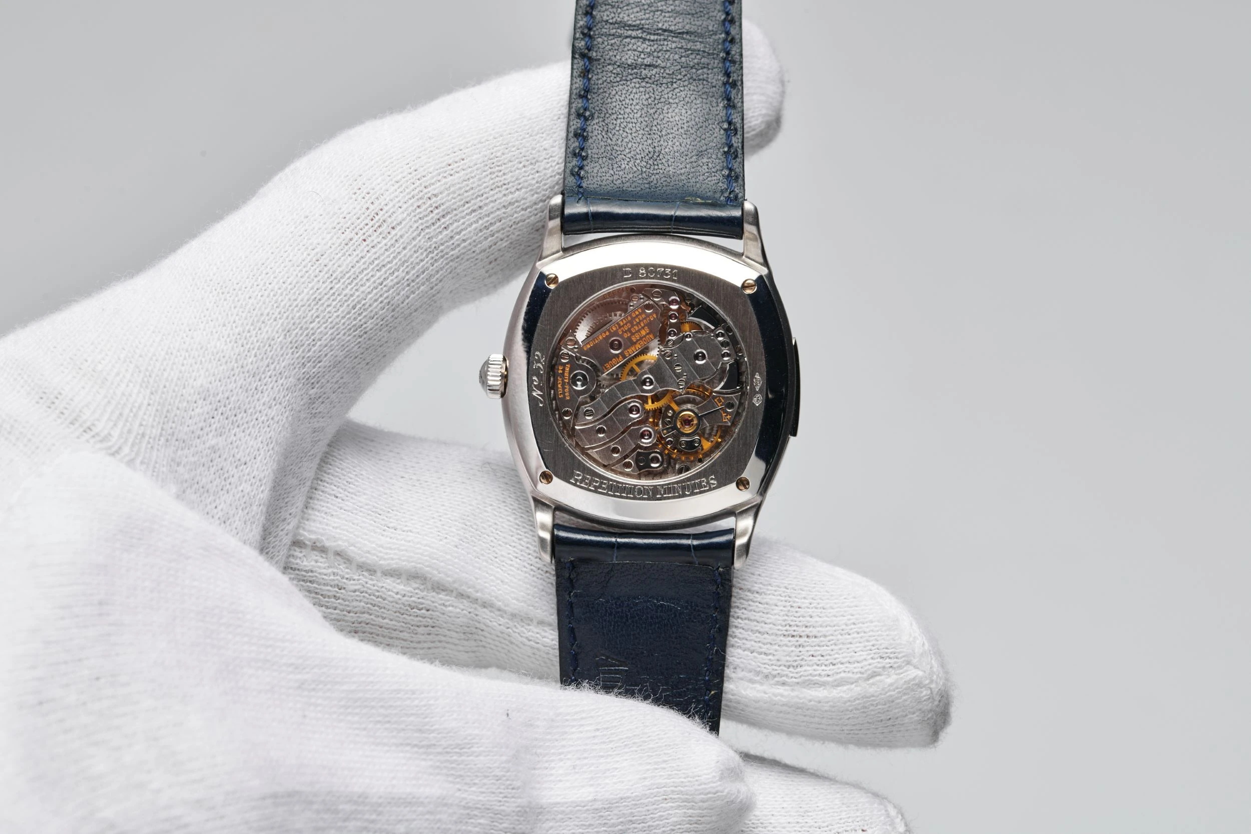 We consider this watch to be a great classic from the renowned watch brand and one of its most beautiful designs. The dark blue dial is paired with “cathedral” hour and minute hands and applied Arabic Breguet numerals, which form a harmonious combination with the cushion-shaped platinum case. The size of 34 x 34 mm is modest in today’s trend to increase the size of wristwatches to 40 mm and above, but such a case in precious solid platinum is a fitting testament to the skill of Audemars Piguet and its manufacturing partner Renaud et Papi in developing and assembling very compact minute repeaters, one of the marvels of modern watchmaking. It should also be mentioned that Audemars Piguet does not reject the use of platinum in repeater watches, even if platinum as an acoustic material in a watch case results in a loss of sound volume. The brand does not see this as a disadvantage, but rather regards the platinum case as a kind of acoustic filter that blocks out parts of the acoustic spectrum, leaving those that produce the most pleasant sound for the human ear.