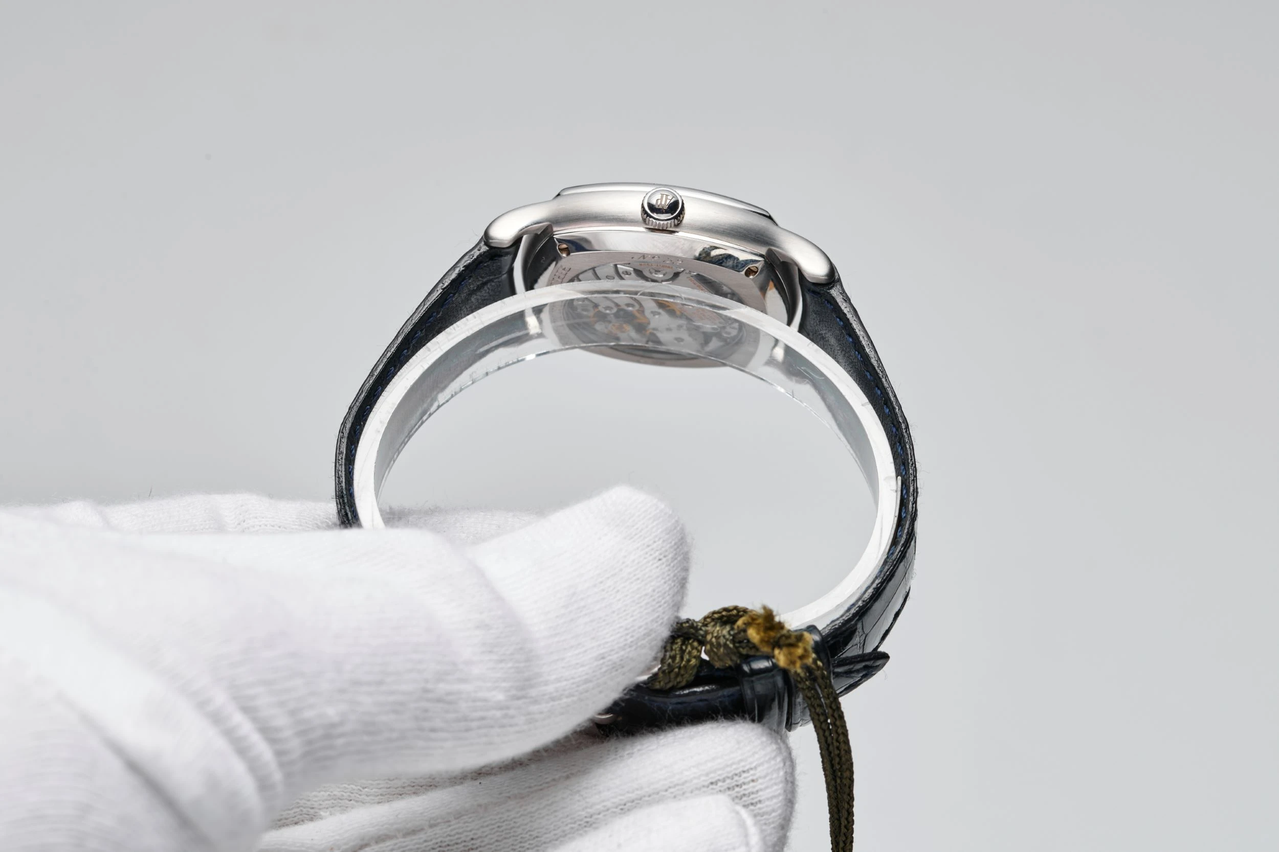 The minute repeater is an incredibly complicated movement, one of the pinnacles of traditional watchmaking. Audemars Piguet belongs to the small circle of watchmakers who produce shaped wristwatches with a minute repeater, cushion-shaped or rectangular, while most brands prefer watches with a round case. The workings of this highly complicated mechanism can be observed through the sapphire crystal caseback, while at the same time the owner of the watch can enjoy the view of the caliber of the traditional layout with excellent artisanal finishing of all parts. The final touch that completes the picture is the hand-engraved inscriptions on the edge of the platinum caseback.