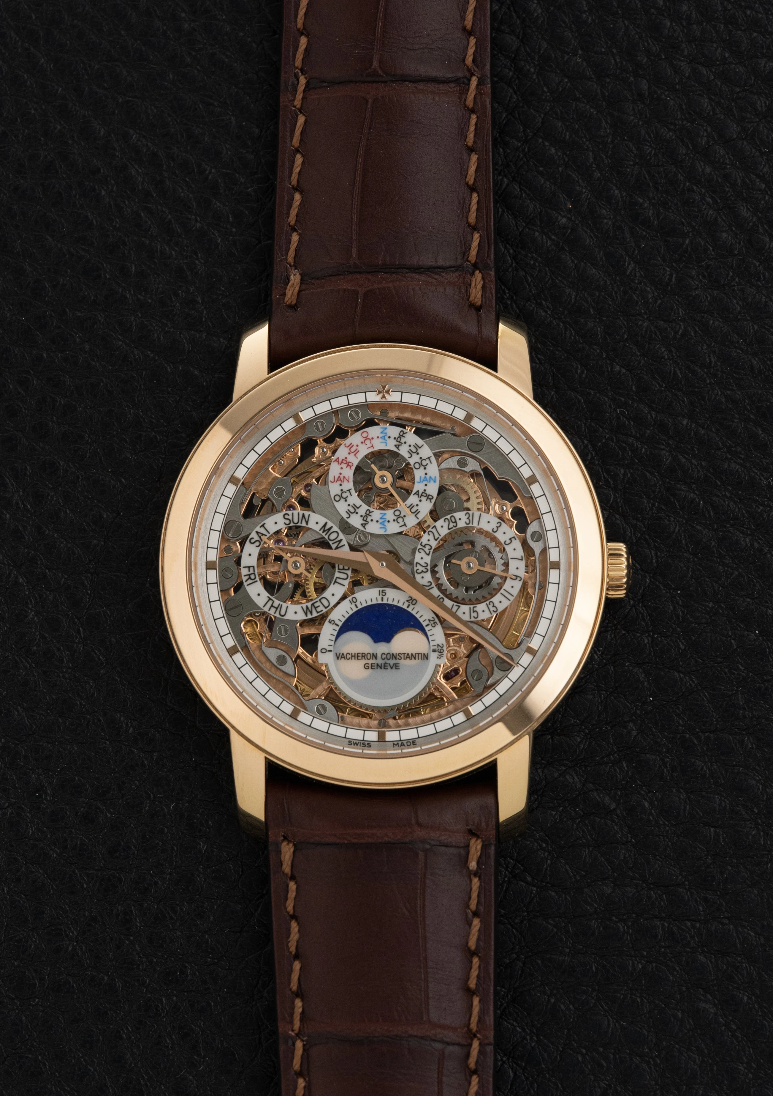 A very rare, elegant and attractive highly complicated and ultra-thin rose gold wristwatch of the famous Swiss watch brand Vacheron Constantin, founded in 1755. Production period: 2007–2021, purchase year: 2022. Case made of 18k rose gold, diameter 39mm, 8.82mm thick, crown with embossed Maltese cross brand emblem, sapphire caseback with brand logo, reference and case numbers engraved on the rim, perpetual calendar correctors at 1, 4, 8 and 10 o’clock. Skeleton dial, rose gold hands, rose gold hour markers and Maltese cross on the outer rim. Self-winding caliber 1120 QP SQ, central rotor with a 21k gold segment, power reserve up to 40 hours. Watch and caliber marked by the prestigious Poinçon de Genève. Functions – indication of time in hours and minutes, perpetual calendar with indicators for the date at 3 o’clock, the day of the week at 9 o’clock, the 48-month indication with leap years at 12 o’clock, and the moonphase display at 6 o’clock. Vacheron Constantin dark-brown leather strap, Vacheron Constantin half Maltese cross-shaped 18k rose gold pin buckle.