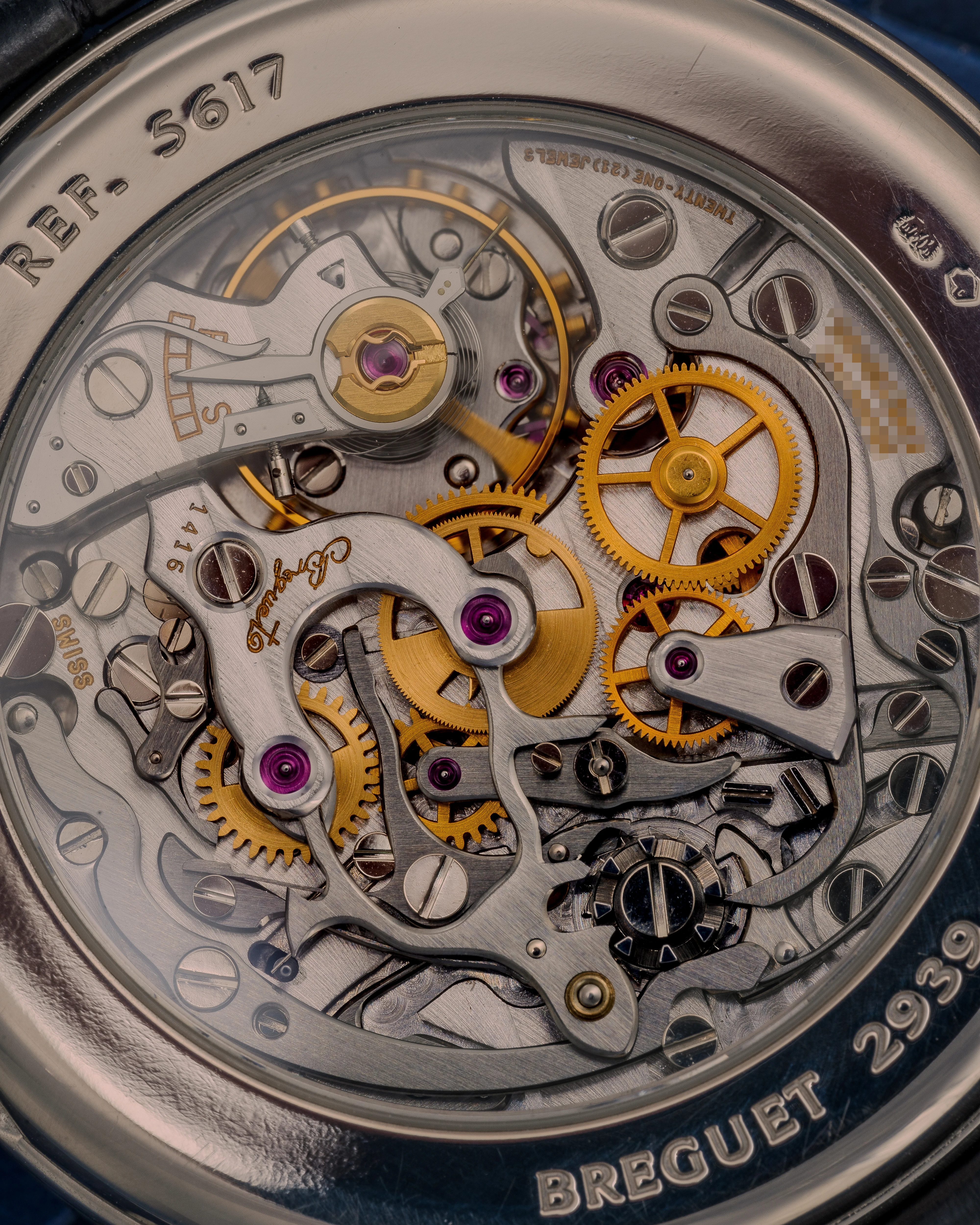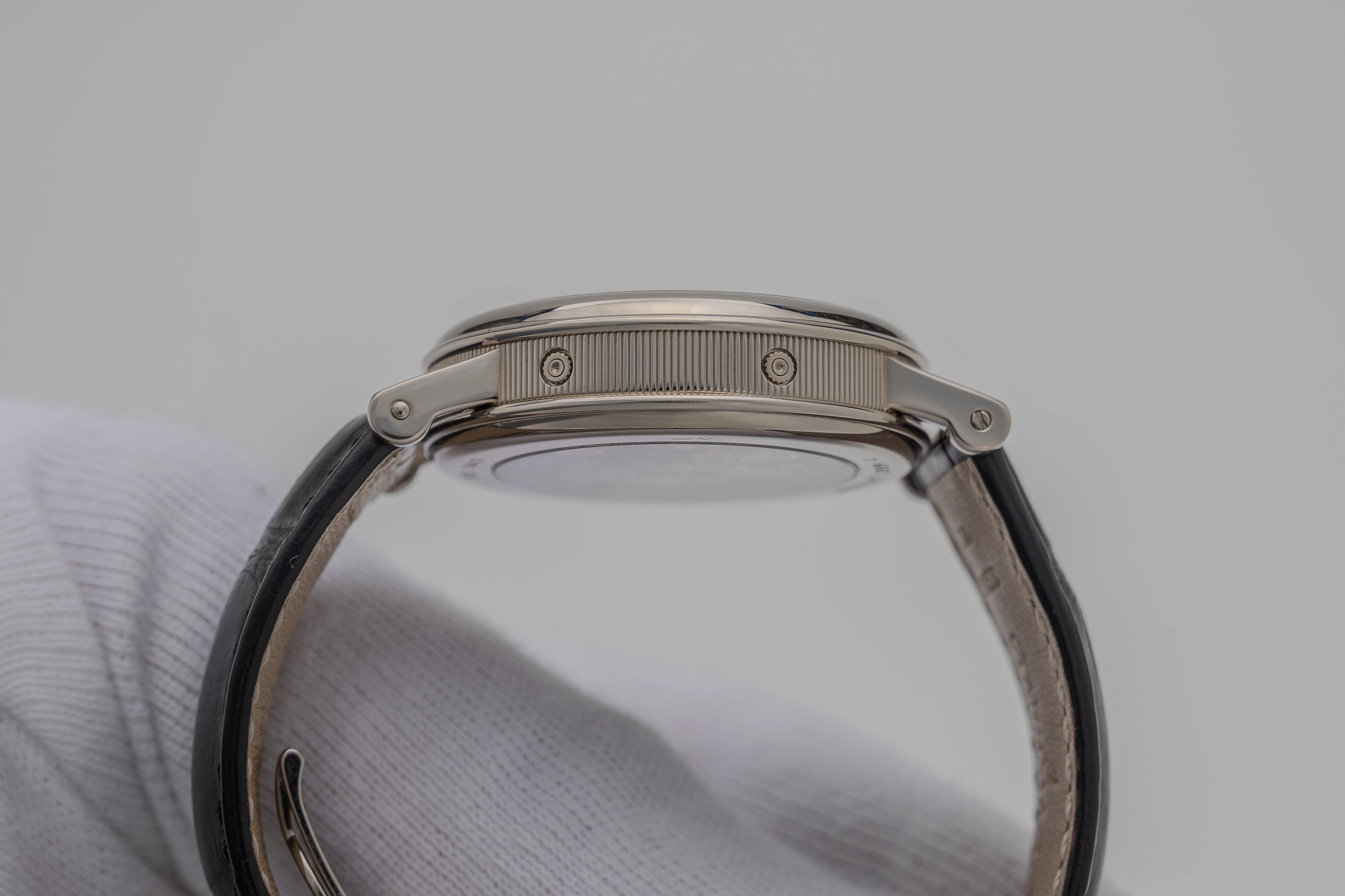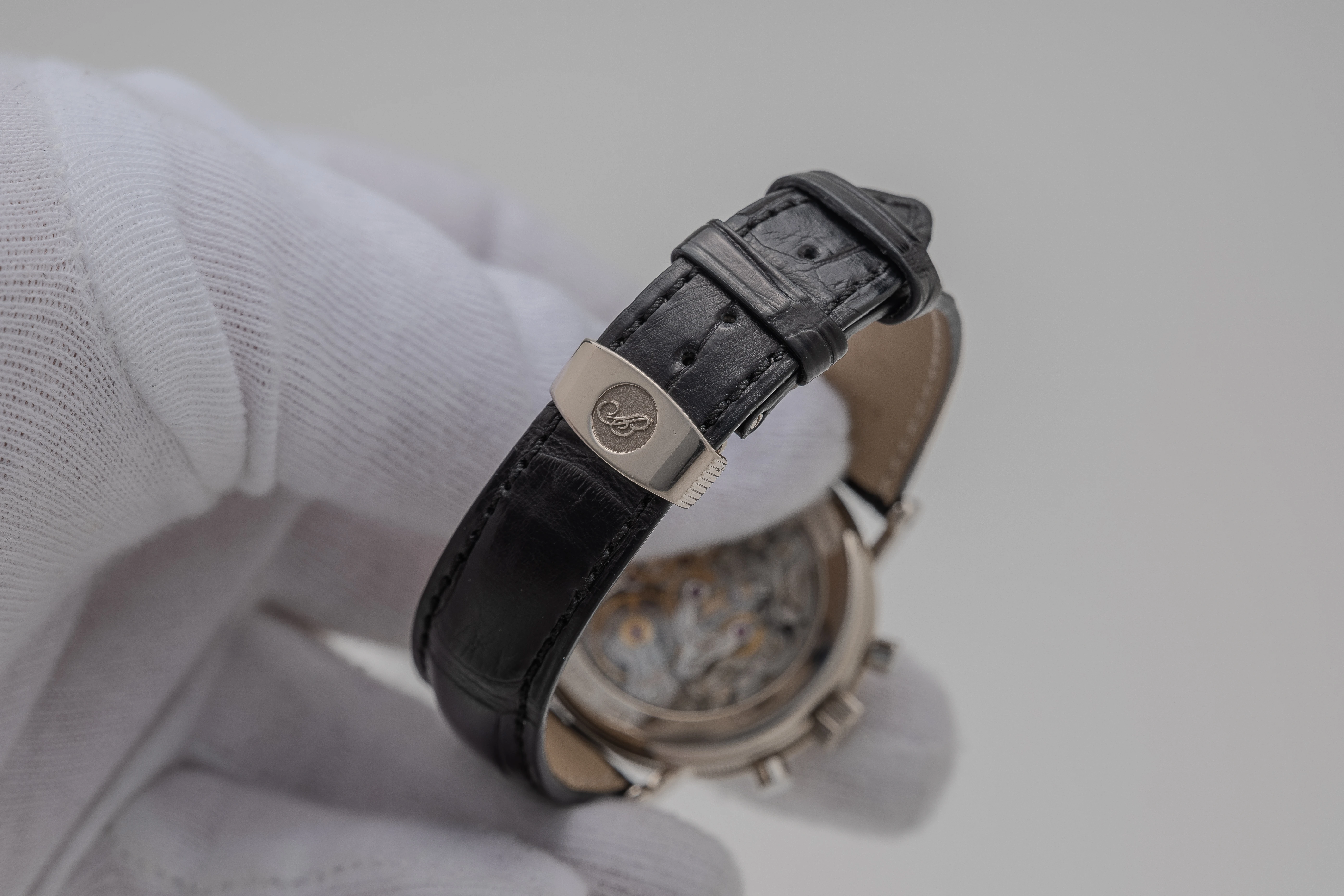 The changeover to the new reference 5617 most probably took place in 1998. The overall design remained unchanged, the watch received a new, slightly thicker winding crown with an embossed “B” logo instead of the previous “flat” crown, a moon face for the moon moonphase display and an option for a caseback secured with seven screws was also introduced. As our research shows, the last option is not mandatory, as some examples of the 5617 have a snap-on caseback, including the watch offered here. It should therefore be noted that the overall picture is approximate, as it is quite possible that these modifications were introduced around the same time as the change to the new reference. To get a definitive picture, more information is certainly required than is currently available. The presence of a later winding crown with a “B” logo on some examples of Ref. 3617 could also be explained by a replacement of the crown during servicing. Production of the Ref. 5617, Breguet’s last Chrono-Perpetual, ended in 2001 or 2002, but the examples produced could of course have been sold much later.