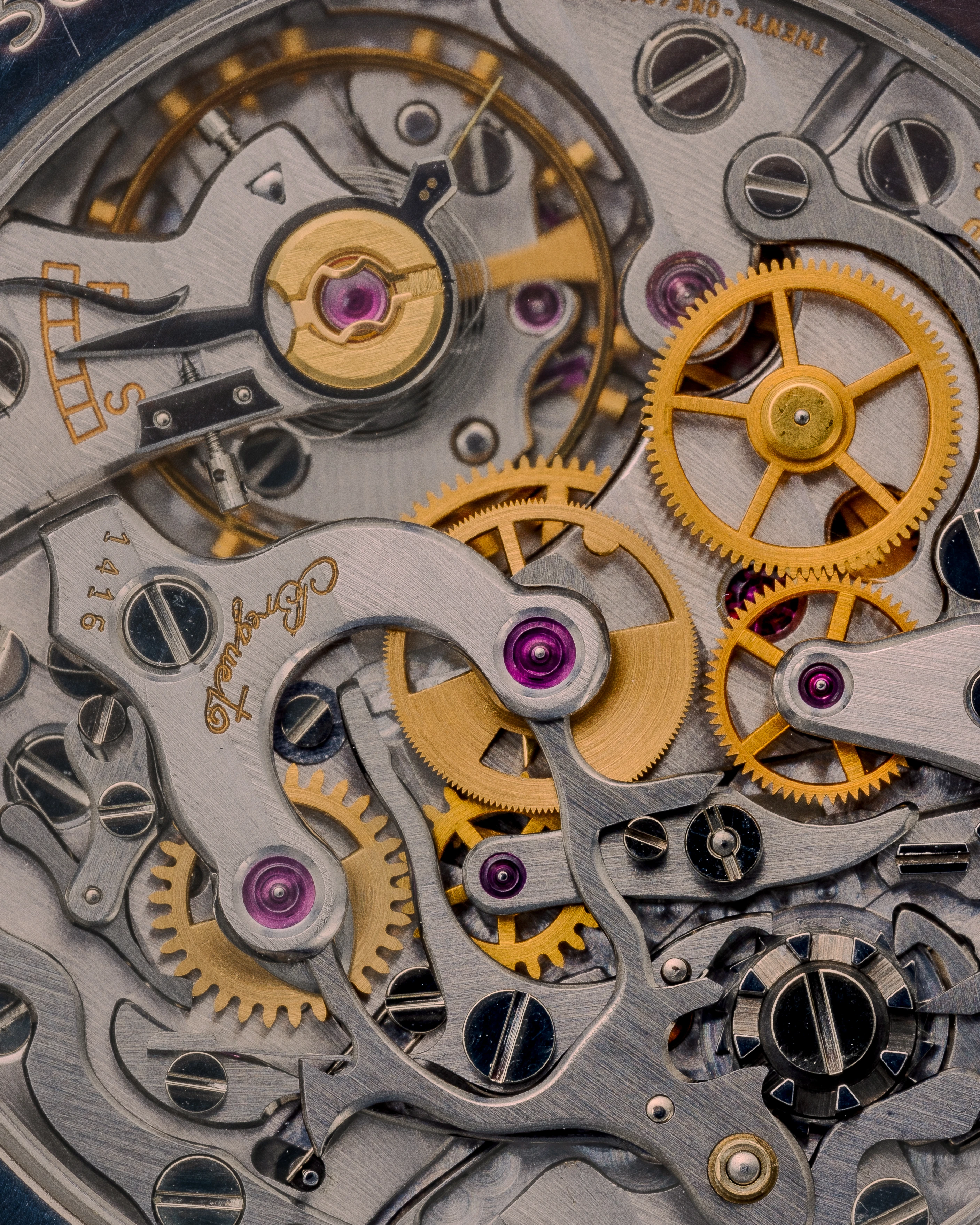 So what we see is a picture that is anything but boring, which we think is a good spice for a collector’s watch. The main course of the Breguet Chrono-Perpetual is the magnificent 533QP, a top-of-the-line mechanical caliber characterized by superb design and artful finishing. It is Breguet’s 21-jewel version of the legendary Nouvelle Lémania 2310 movement, which was also used by Patek Philippe (e.g. in the Ref. 5070), Vacheron Constantin (e.g. in the Ref. 47111) and Roger Dubuis (Ref. S37 and H37) and has been upgraded here with, among other things, an index regulator, a swan-neck flat spring and a hairspring with Breguet overcoil. This watch also features a typical round Breguet Empire case with straight lugs, a polished bezel and caseback, a caseband with sharp vertical knurling reminiscent of a metal coin, a guilloché, solid gold and silver-plated dial with blued steel “Pomme de Breguet” hands and Roman numerals.