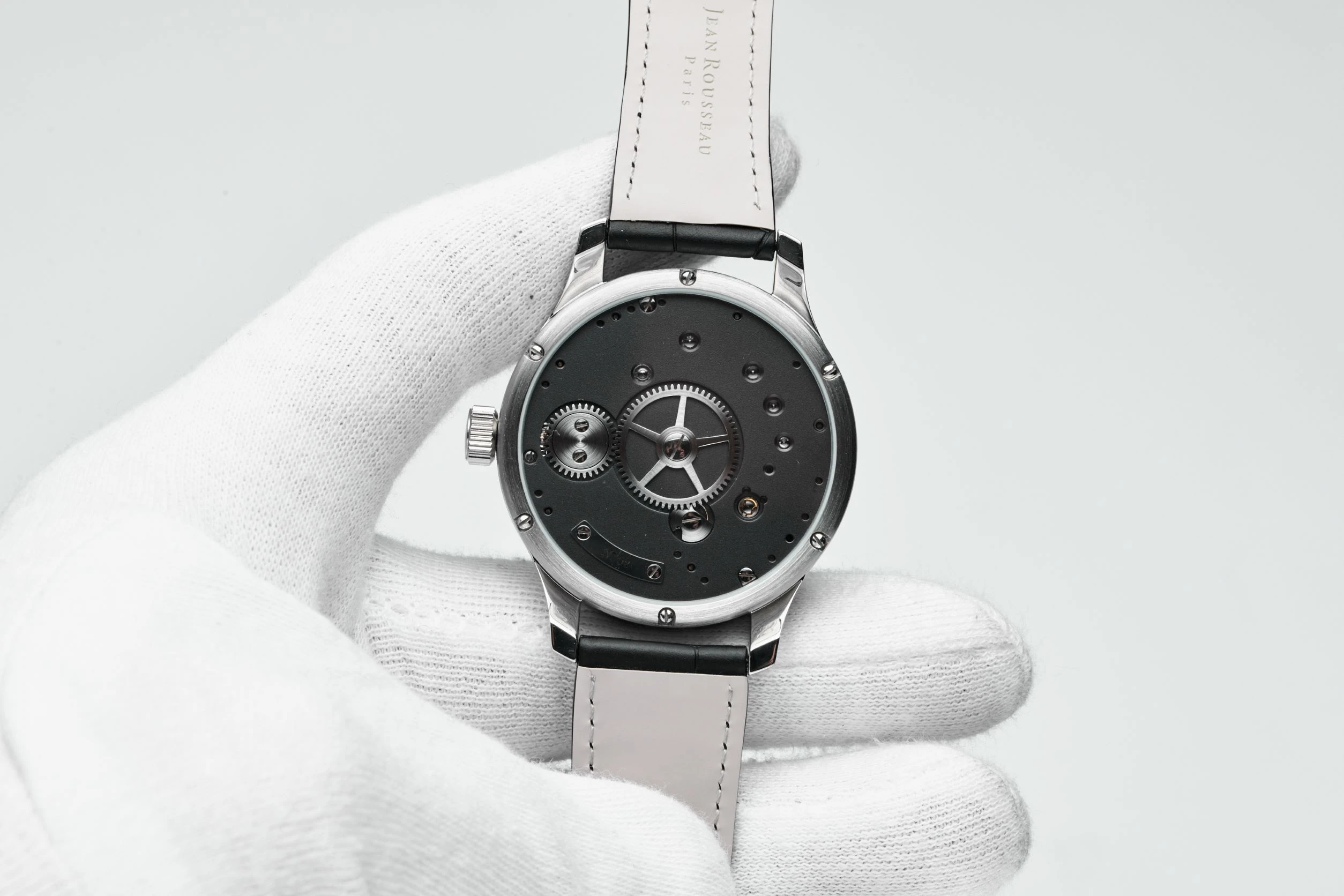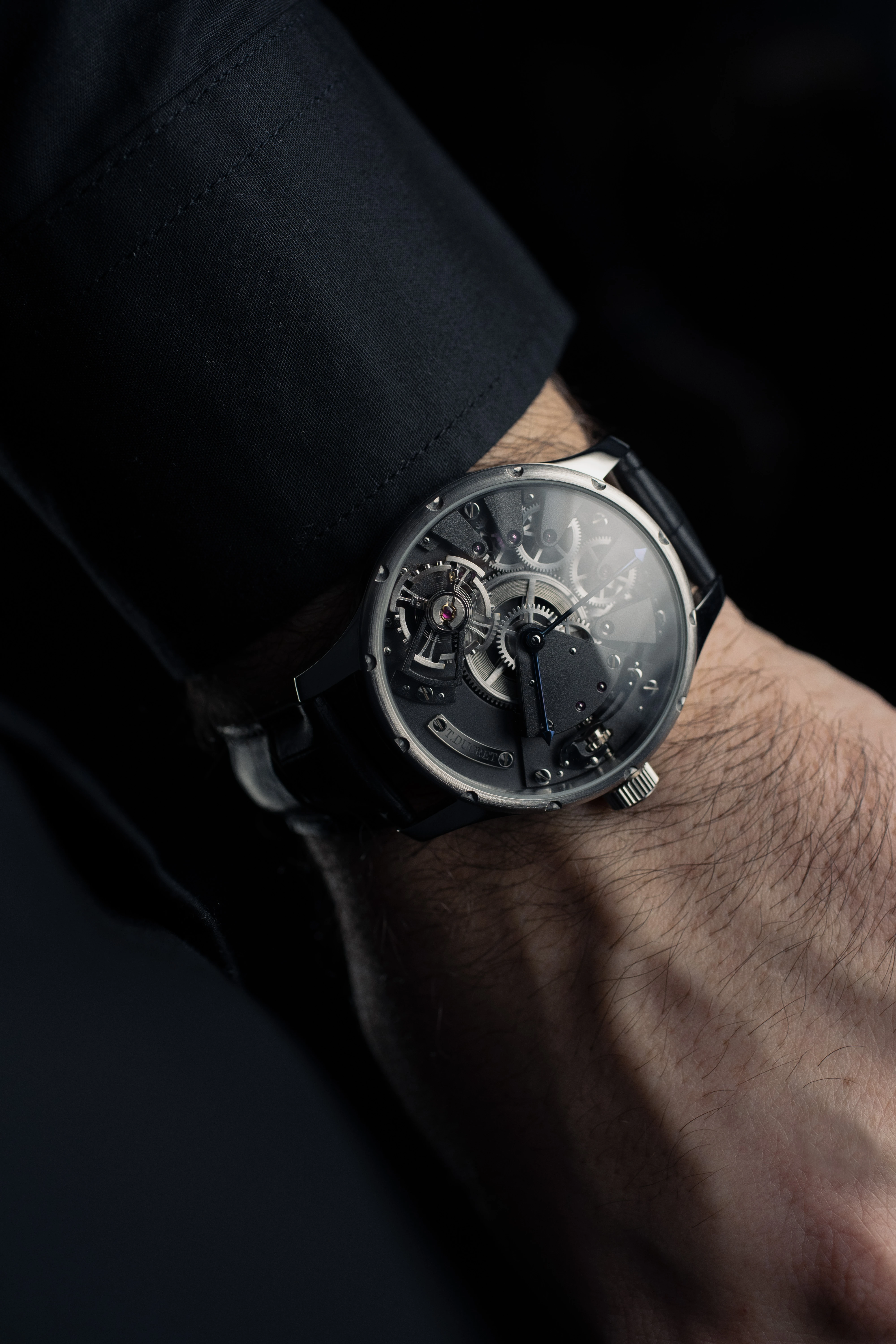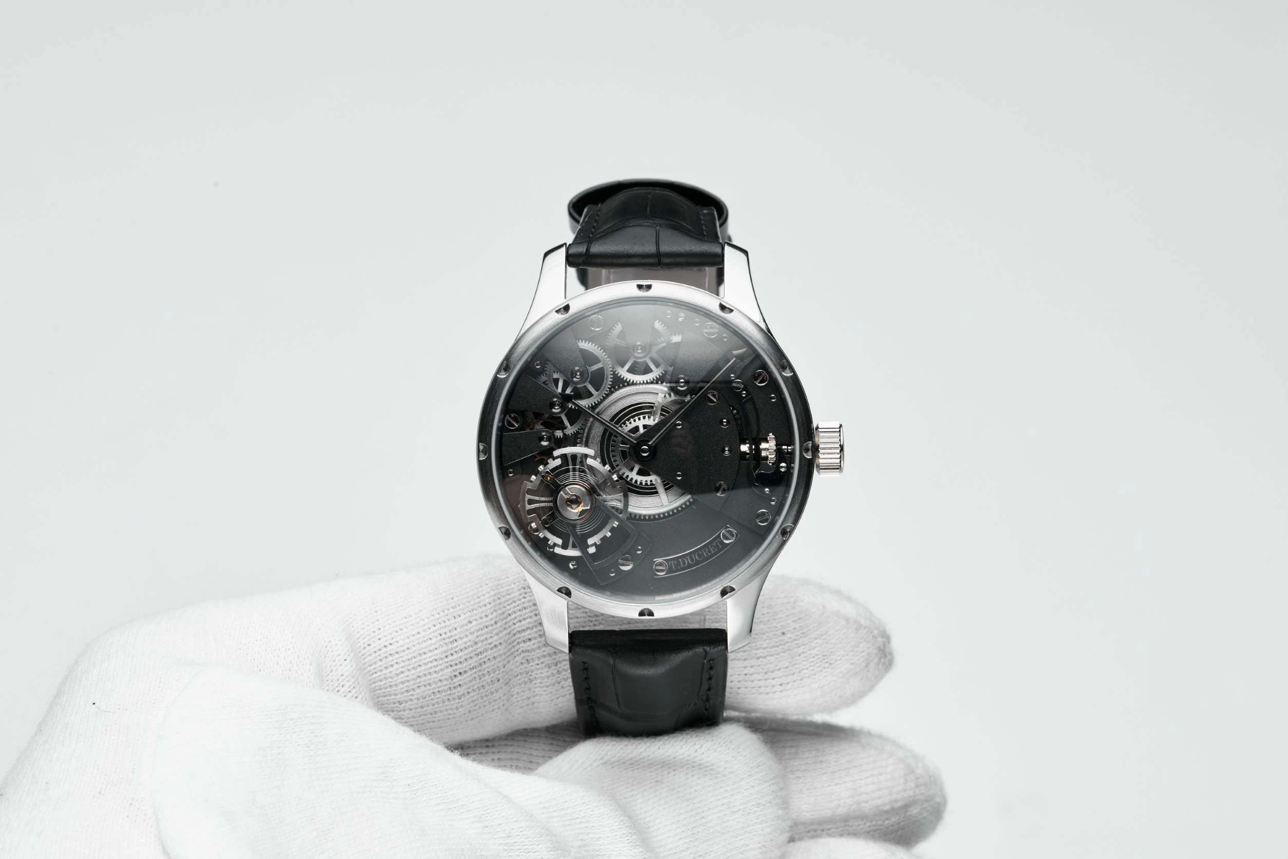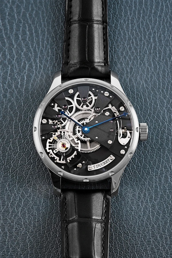 An extremely rare, unusual and spectacular time-only stainless-steel wristwatch from Thierry Ducret, a French independent watchmaker. Made in 2022–2023. Case in stainless steel, diameter 42 mm, mineral glass crystal and mineral glass caseback. Open-worked dial, with “T. Ducret” engraved on a screwed plate. Manual winding movement with central barrel, visible balance wheel and the gear, power reserve up to 45 hours. Functions – display of time in hours and minutes. Black leather strap with stainless-steel pin buckle. Unique piece.