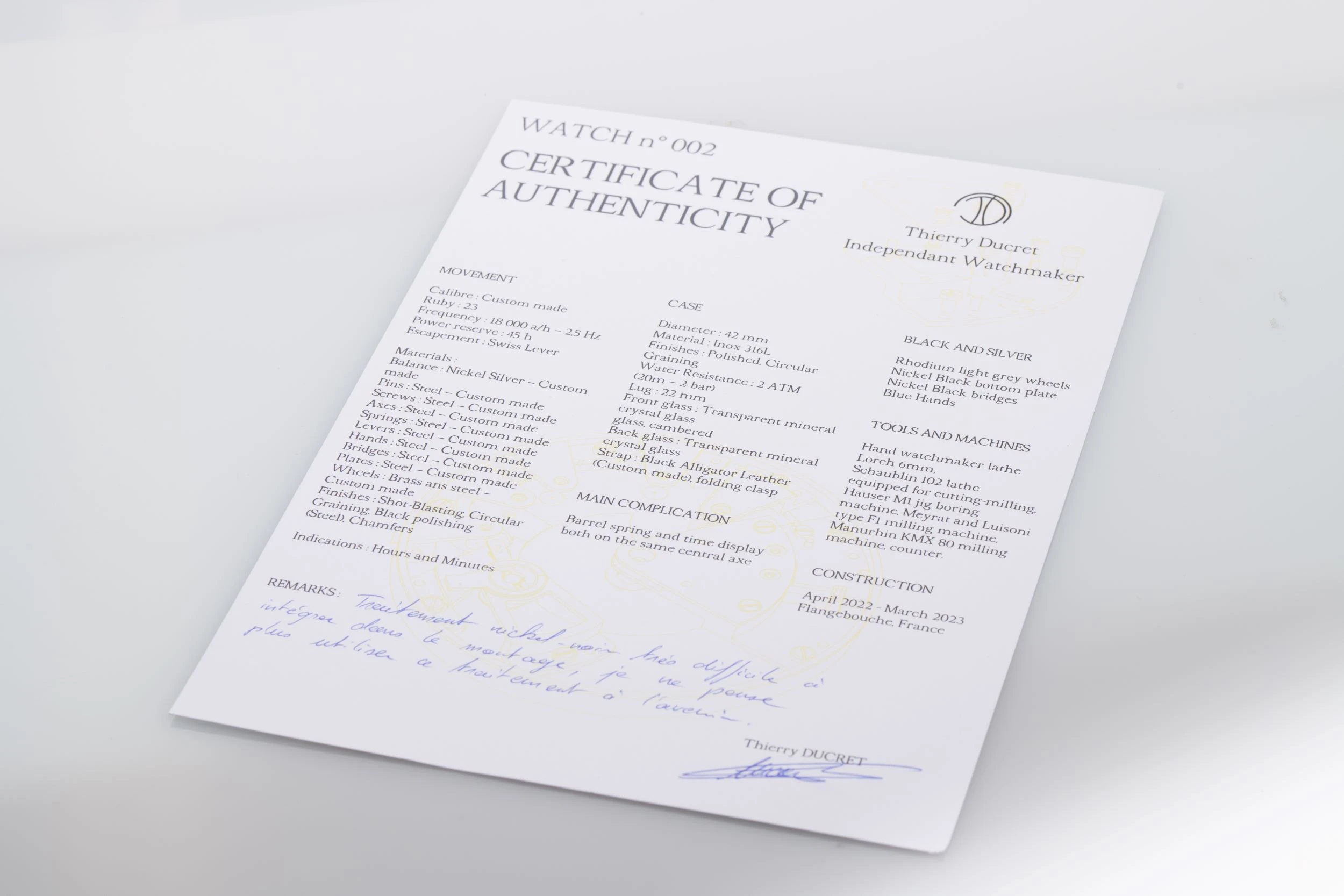 The number 02 engraved on a screwed plate on the back of the movement announces that this is the second wristwatch ever made by Thierry Ducret, confirming its extreme rarity and making it a very valuable collector's item.
