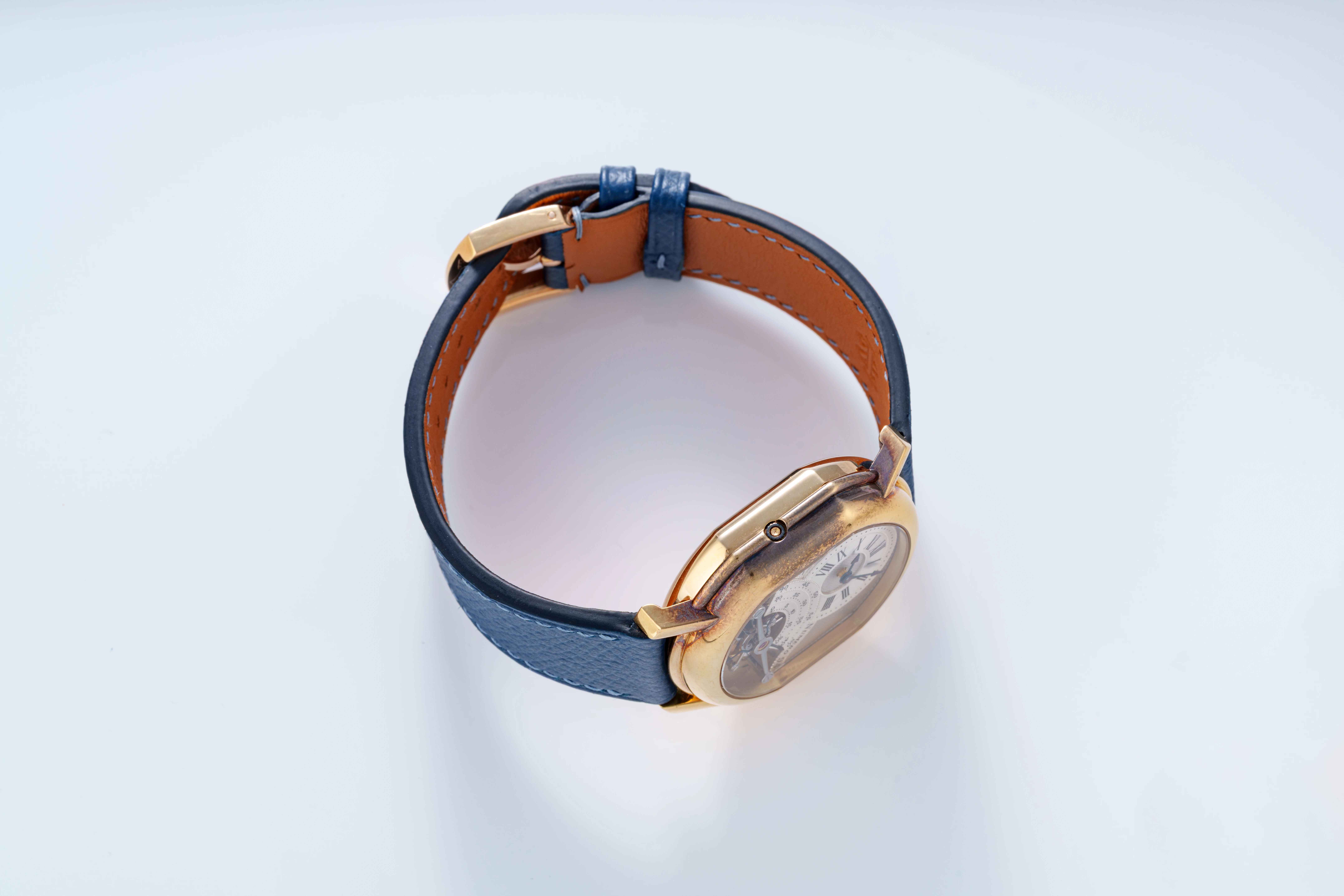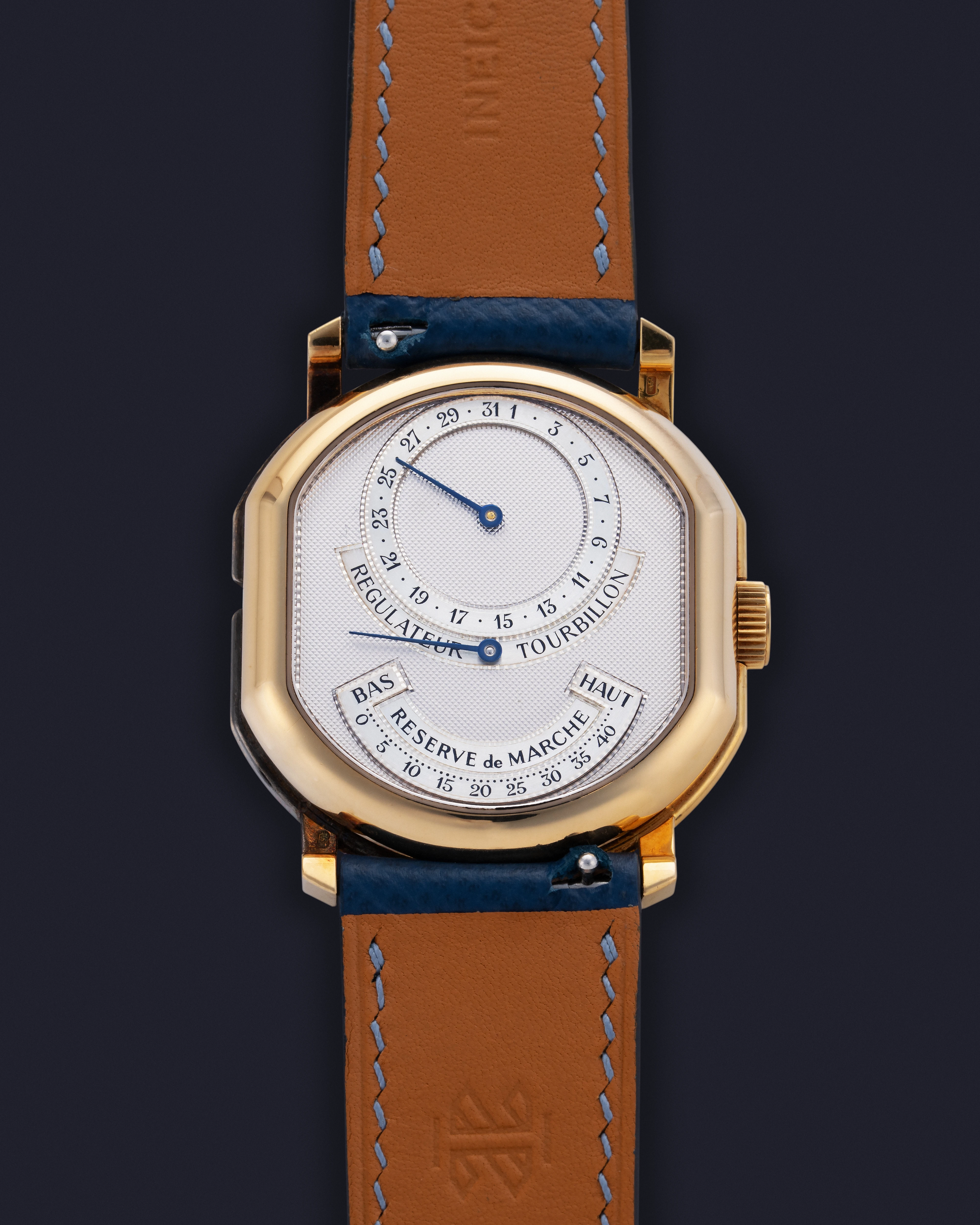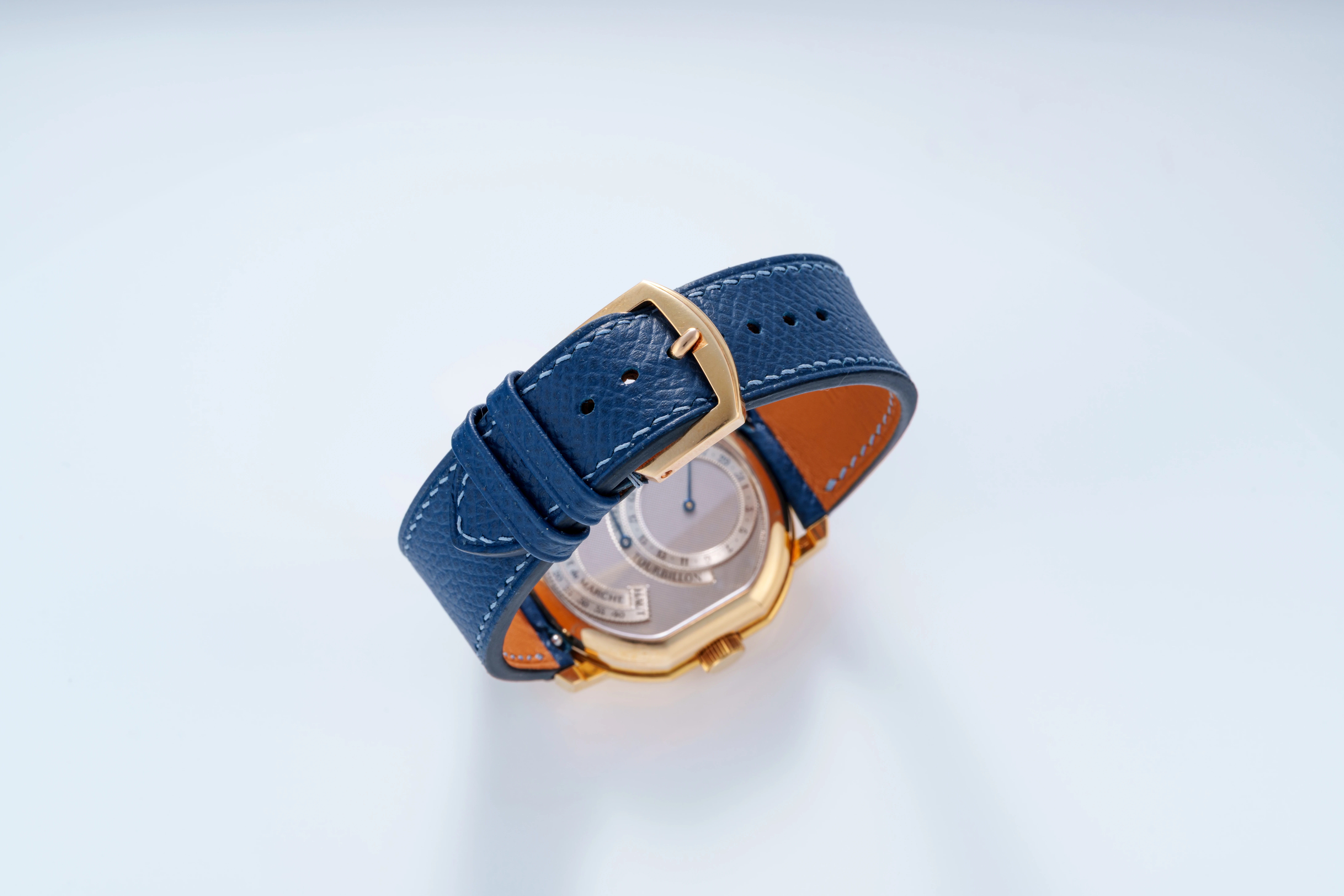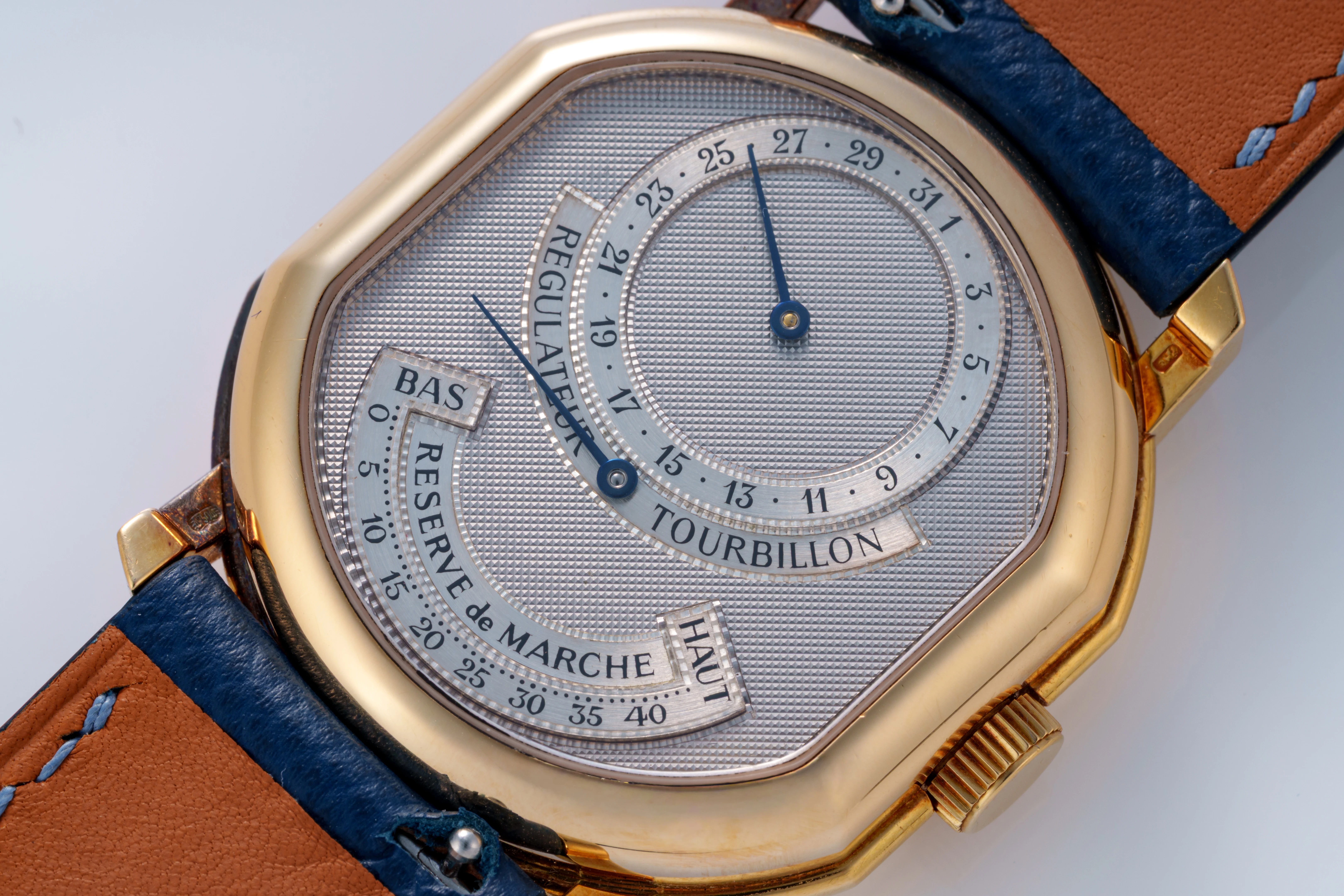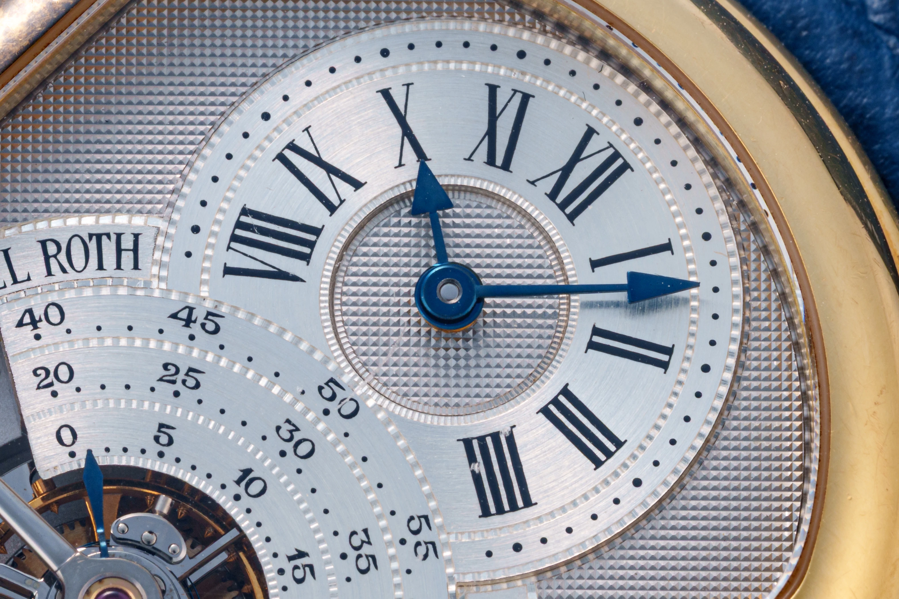 The Régulateur Tourbillon Ref. 2187 (C187) “Ripe Banana” from the early days of Daniel Roth is, in our opinion, the brand’s most charismatic design. The watches from the early period, from 1988 to 1995, are currently the most sought-after, especially the rare examples, which certainly include this Régulateur Tourbillon Ref. 2187 (C187) with the rarest Clous de Paris guilloche pattern dials. One of the most important options is the type of guilloché on the dial. Most commonly, the watches have the dial with the vertical lines ‘Ligné’ guilloche pattern, but there are also some examples with the ‘Clous de Paris’ guilloché. These are very rare, presumably, Daniel Roth produced few watches with this design because the watch with the ‘Clous de Paris’ guilloché dial is too similar to the Breguet Tourbillon Ref. 3350/3357, which has the same guilloché pattern. The dial of the present watch is typical of early Régulateur Tourbillon with the rare ‘Clous de Paris’ guilloché dial, the same guilloché pattern being applied to the second dial of the watch on its back