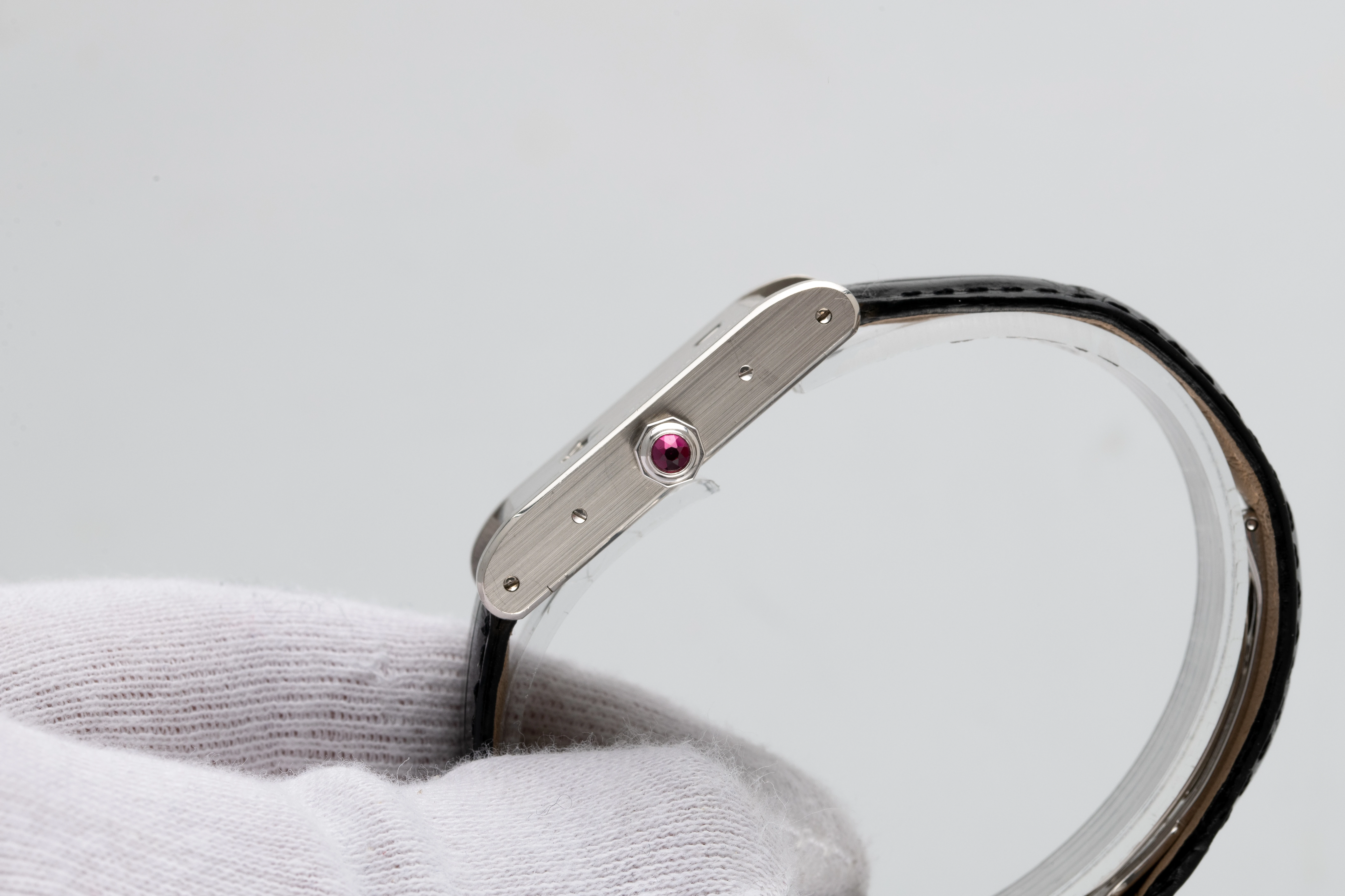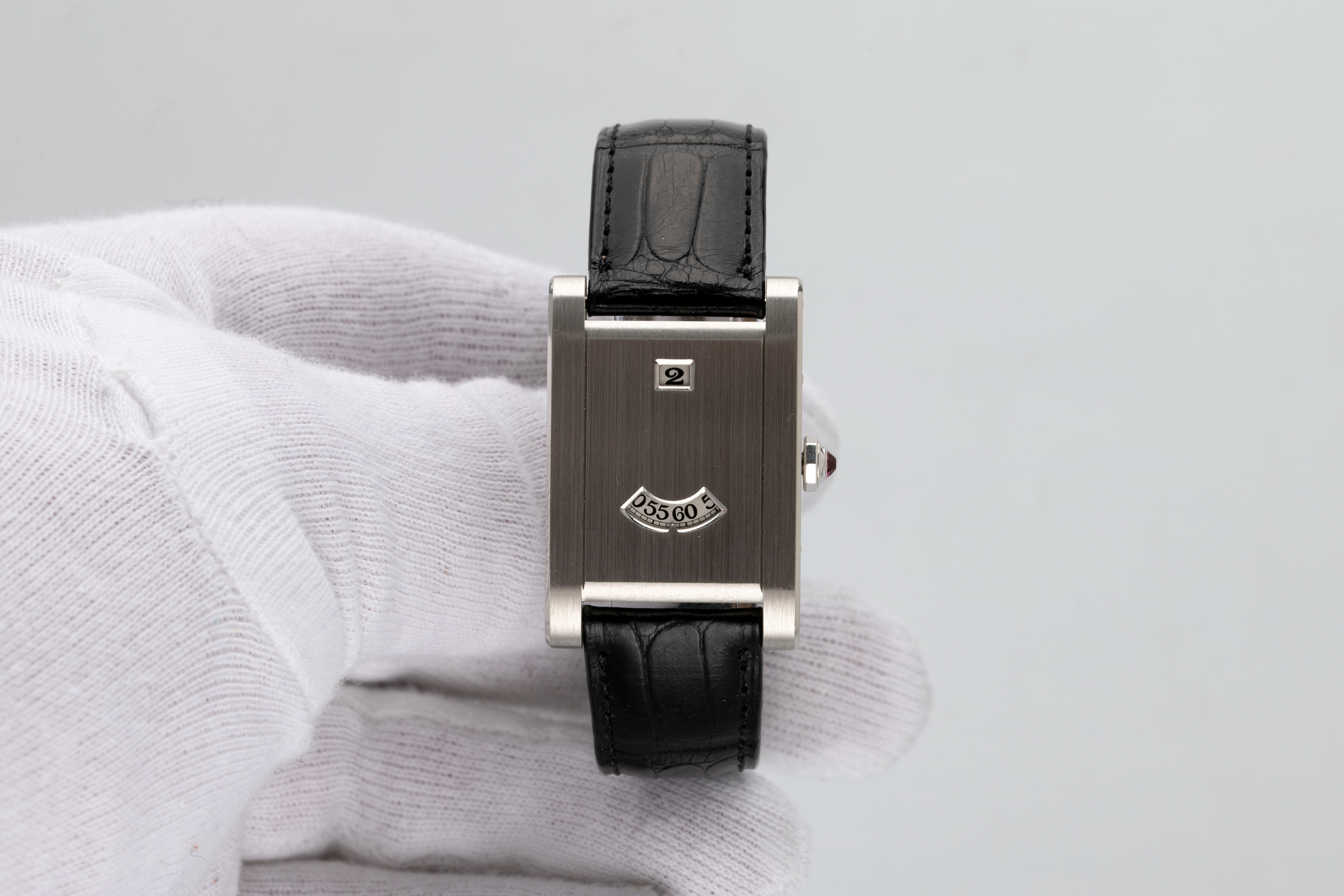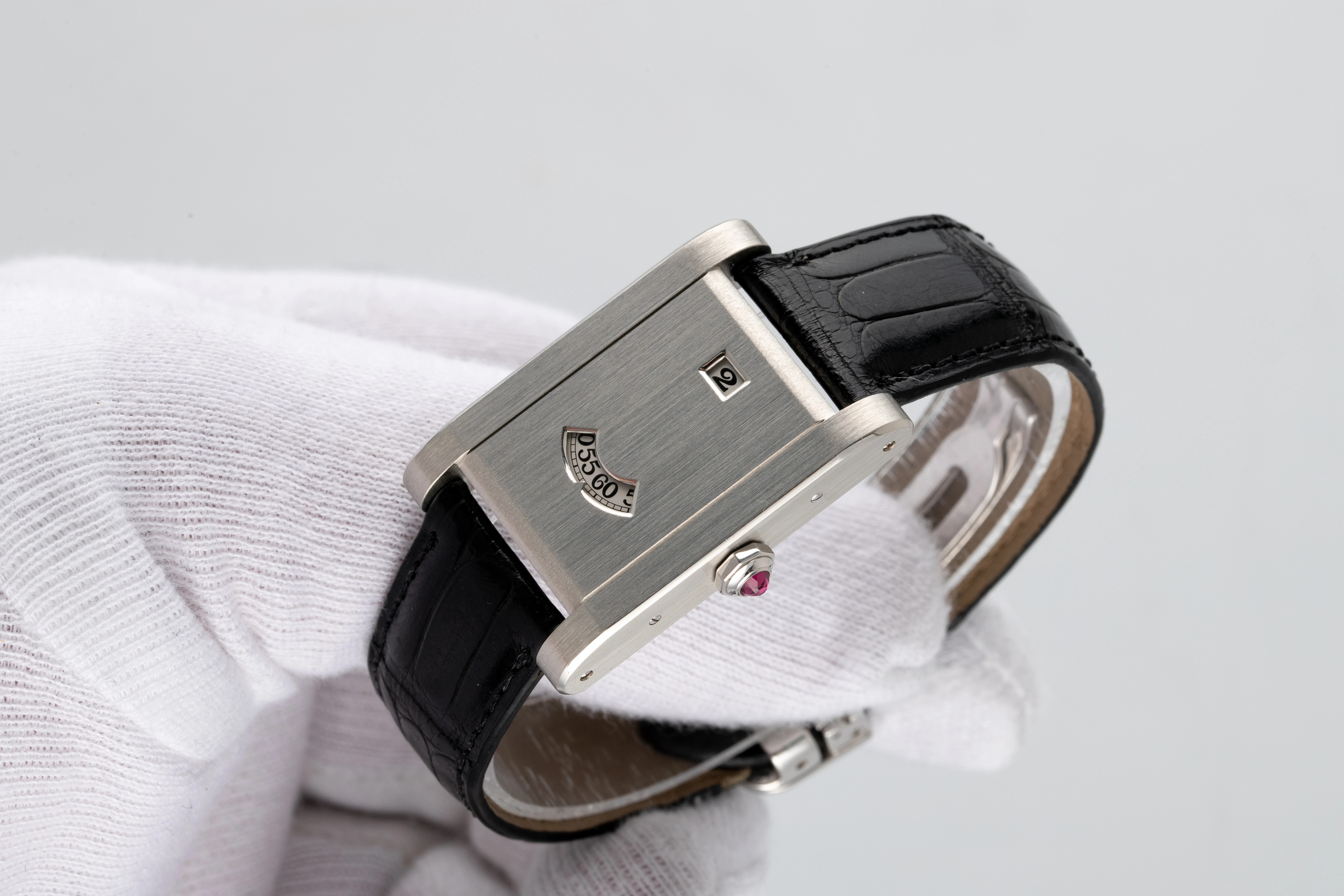 The Tank à Guichet 150th Anniversary Limited Edition in platinum is part of the exclusive series of Cartier Tank à Guichet watches, probably the rarest of all Cartier Tanks. This design is a modern reinterpretation of the famous idea of the Art Deco watch with closed dial, jumping hours and wandering minutes developed by Cartier in 1928. The unmistakable look of this watch is emphasized by the rarest winding crown, which is adorned with a ruby instead of the classic sapphire. Therefore, the Cartier Tank à Guichet 150th Anniversary Limited Edition is an extremely attractive purchase for the collector who wishes to acquire an impressive, rare and important wristwatch, the rare Tank à Guichet edition in platinum. The ability to create watches with attractive and distinctive designs is one of Cartier’s strengths, and this watch is a clear confirmation of this achievement. It is a classic collectible, especially as the production of Tank à Guichet watches has been discontinued since 2004 and the number of pieces was very small, which undoubtedly contributes to the appeal of this watch.