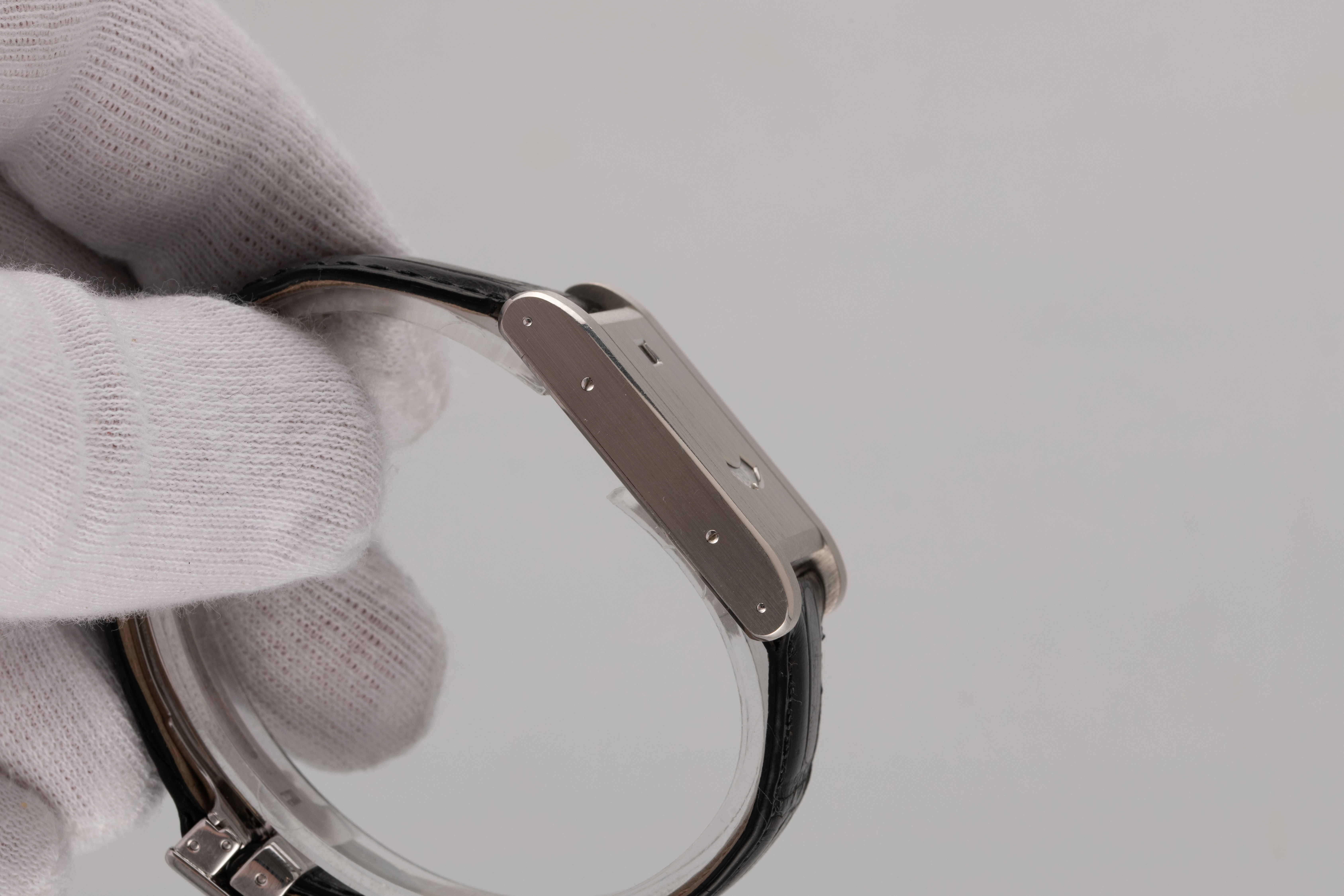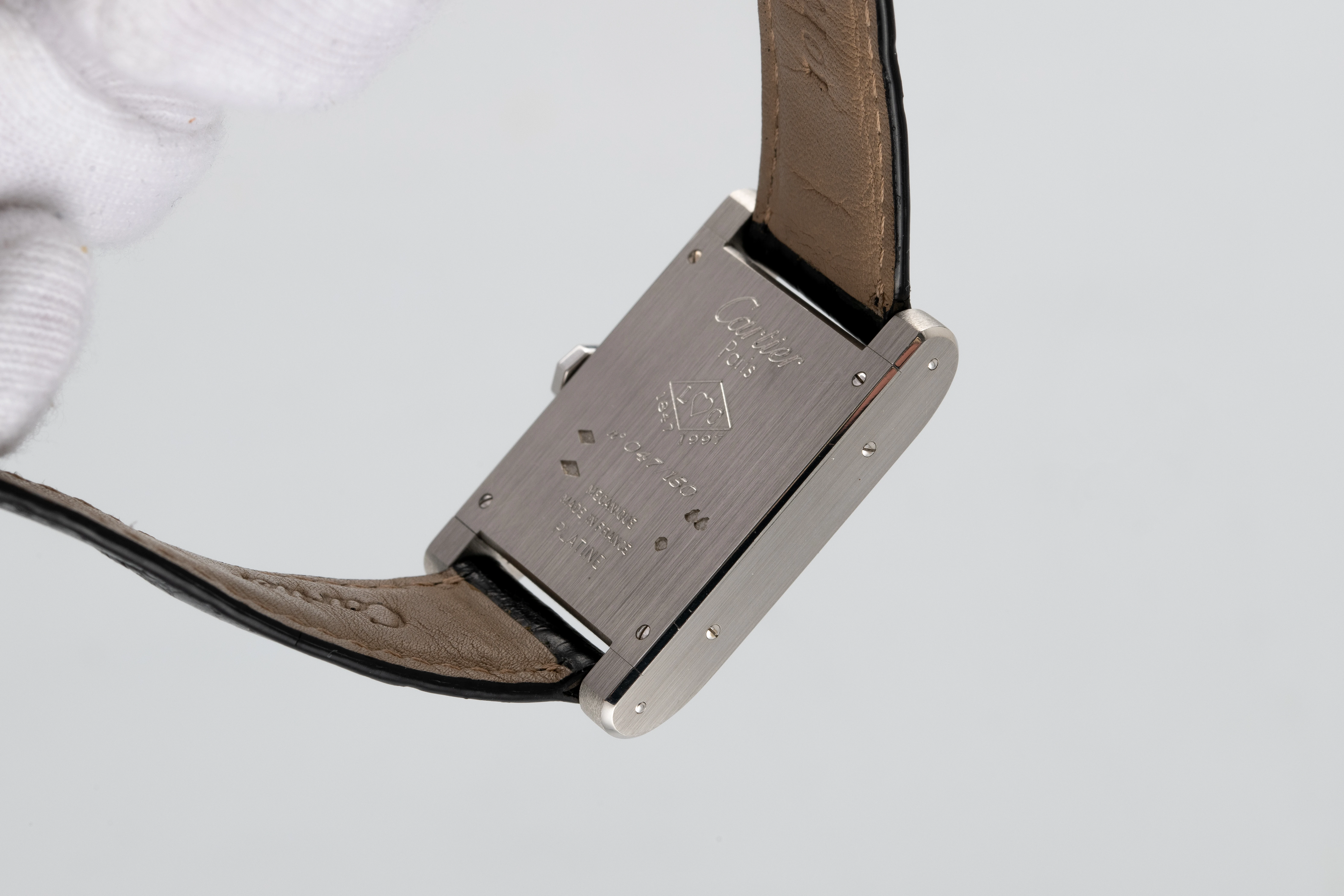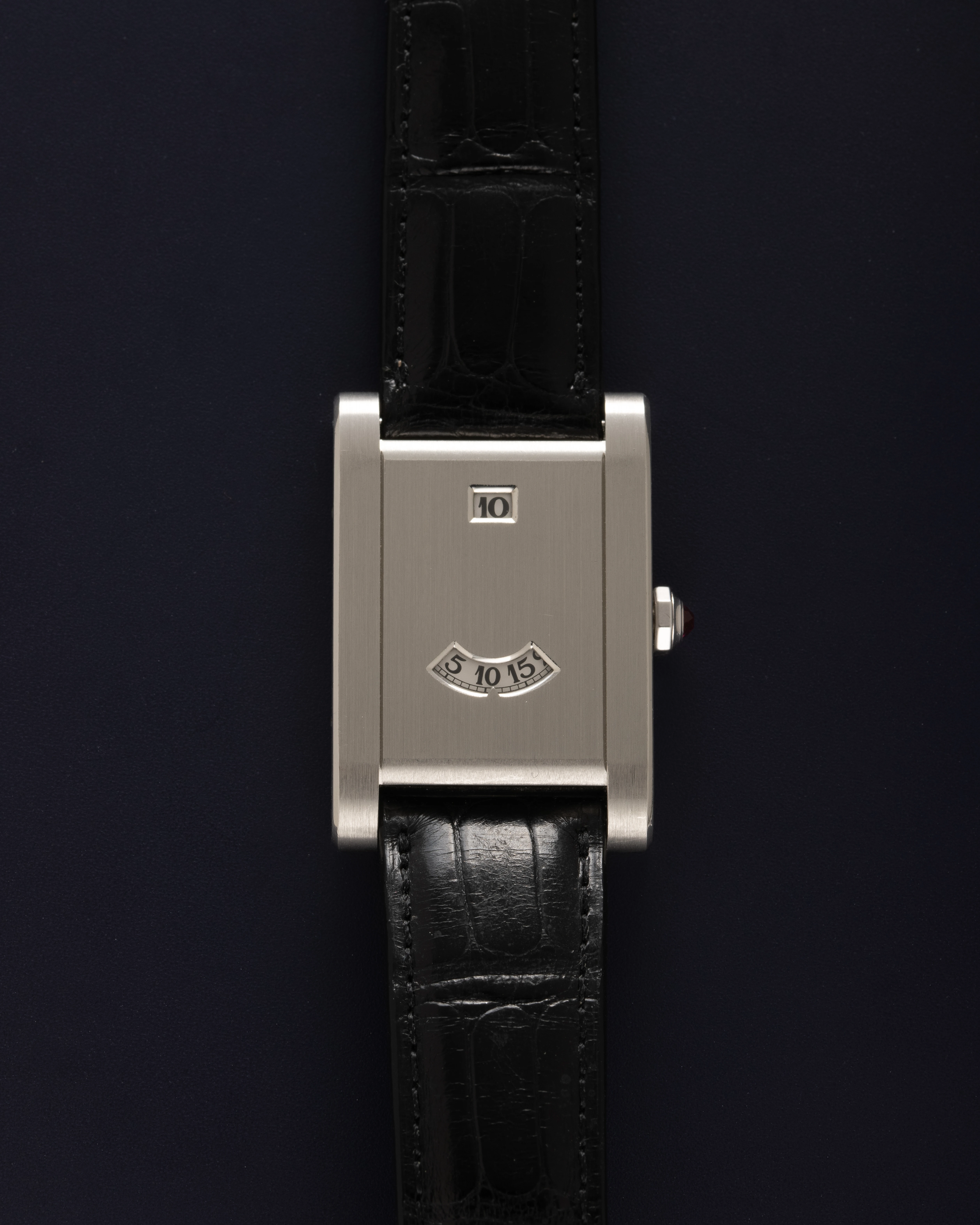 The Tank à Guichet is one of the most unusual and charismatic designs ever created by Cartier. Originally introduced in 1928, it was an Art Deco interpretation of the classic Tank model with an almost completely closed dial and only a jumping hour and wandering minute display. The technical and design minimalism made it possible to create a convincing, memorable image that was highly appreciated by people with excellent taste. From then on, Cartier produced the Tank à Guichet for several decades - probably until the 1960s, albeit in very small numbers. It is extremely rare and almost impossible to find one on the market. Nevertheless, the design has achieved the status of a Cartier style icon. in 1996, the Tank à Guichet reappeared, but in a very small special edition of three watches in platinum and three in yellow gold with a crown at 12 o'clock. Historically, there was another version with the crown at the classic 3 o'clock position. This design variant was used in the next limited edition in 1997, which was dedicated to the 150th anniversary of the brand, and this watch is part of that edition.