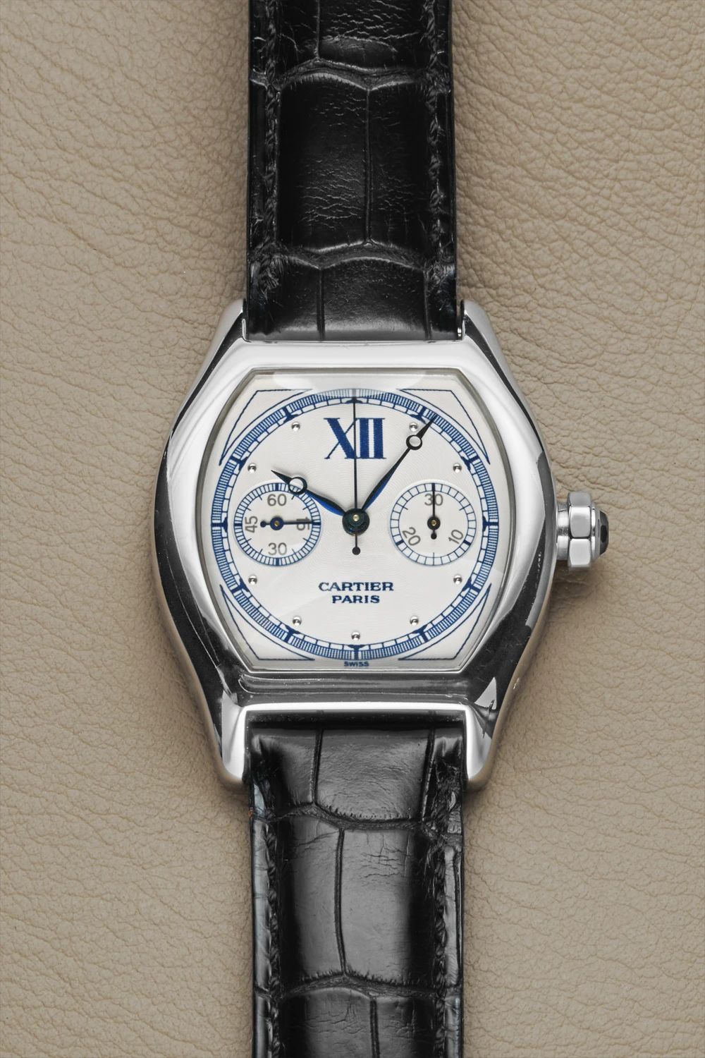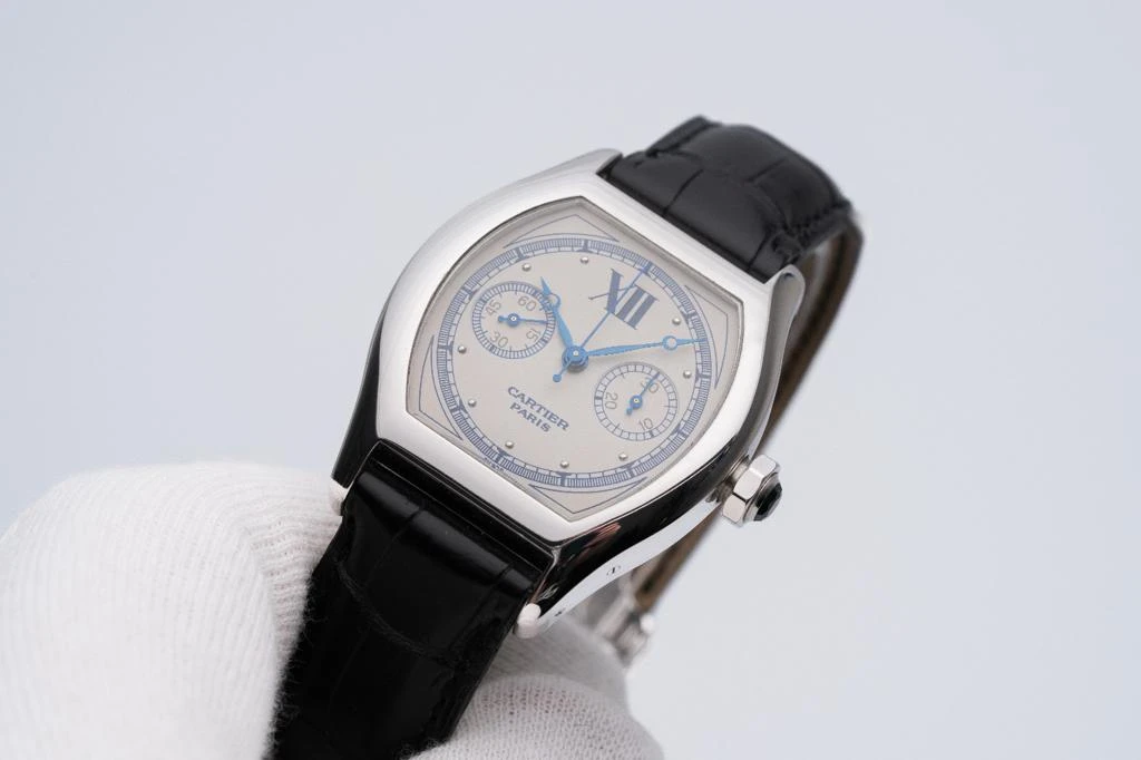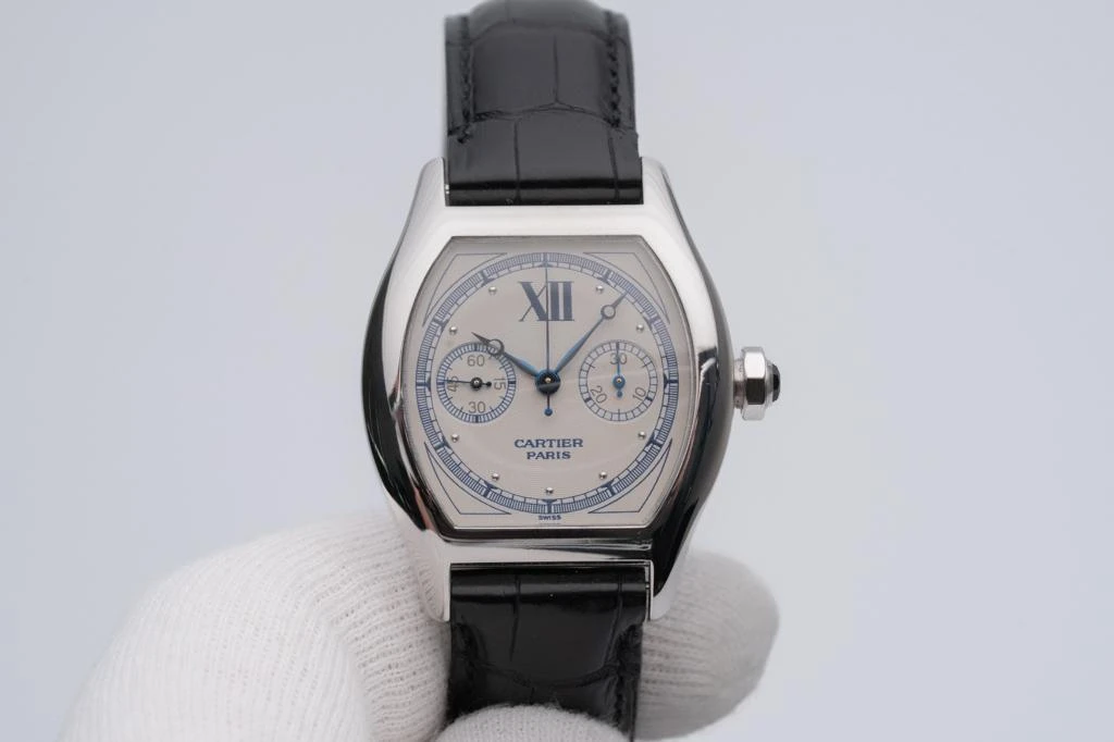 An extremely attractive and rare white gold mono-pusher chronograph wristwatch of the famous brand Cartier, founded in 1847. Estimated production period: 2000–2008. Case made of 18k white gold, dimensions 43x34mm (with lugs), thickness 10mm, octagonal crown serving to start, stop and reset the chronograph, sapphire caseback. Silvered dial with ‘lotus’ guilloche relief pattern, recessed (sunken) sub-dials with fine circular grooves, blued steel Breguet-style hour and minute hands. Hand-wound caliber 045 MC, power reserve up to 40 hours. Functions – indication of time in hours and minutes, small seconds hand, monopusher chronograph with central seconds hand and 30-minute counter. Cartier black leather strap, Cartier white gold double deployment clasp.